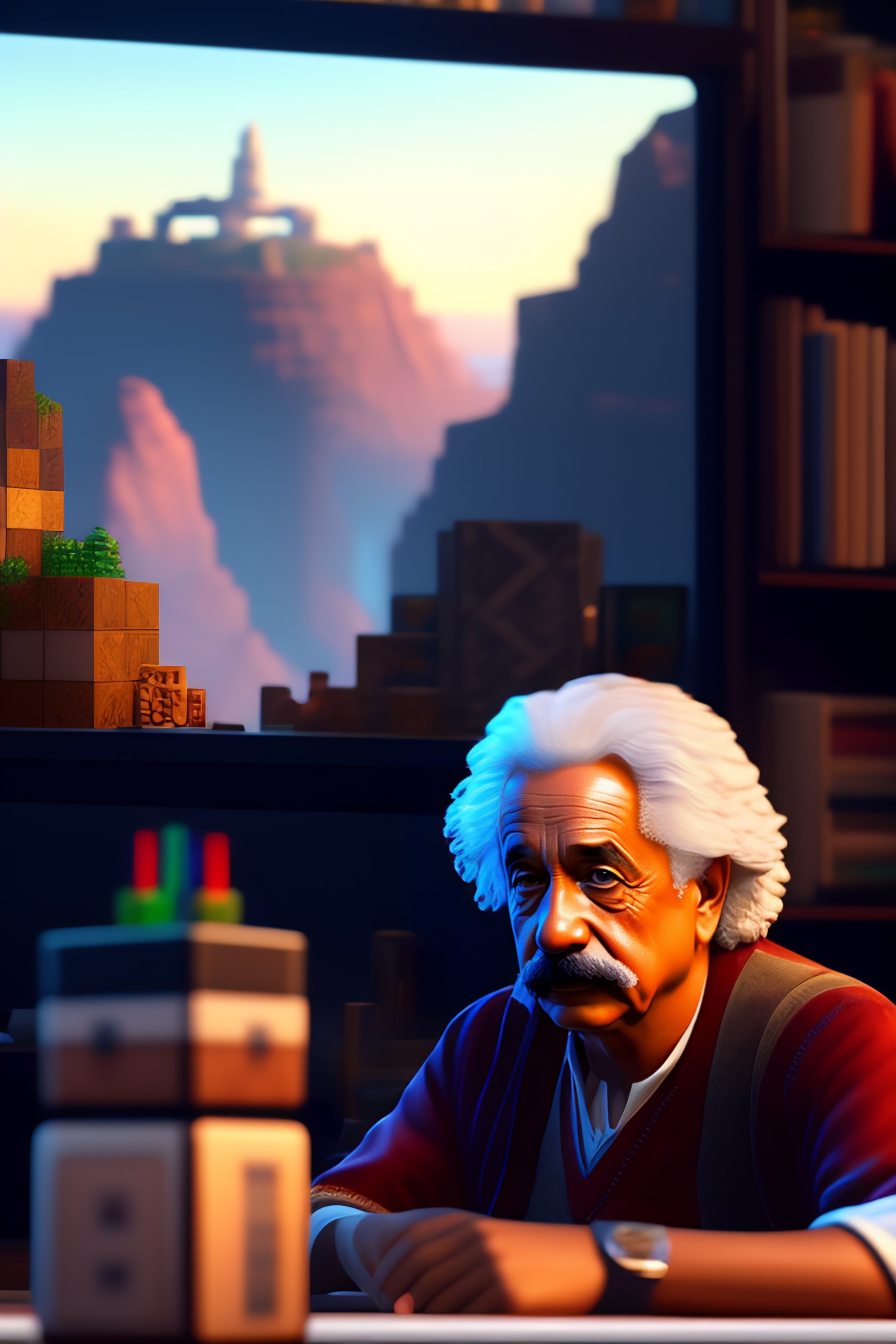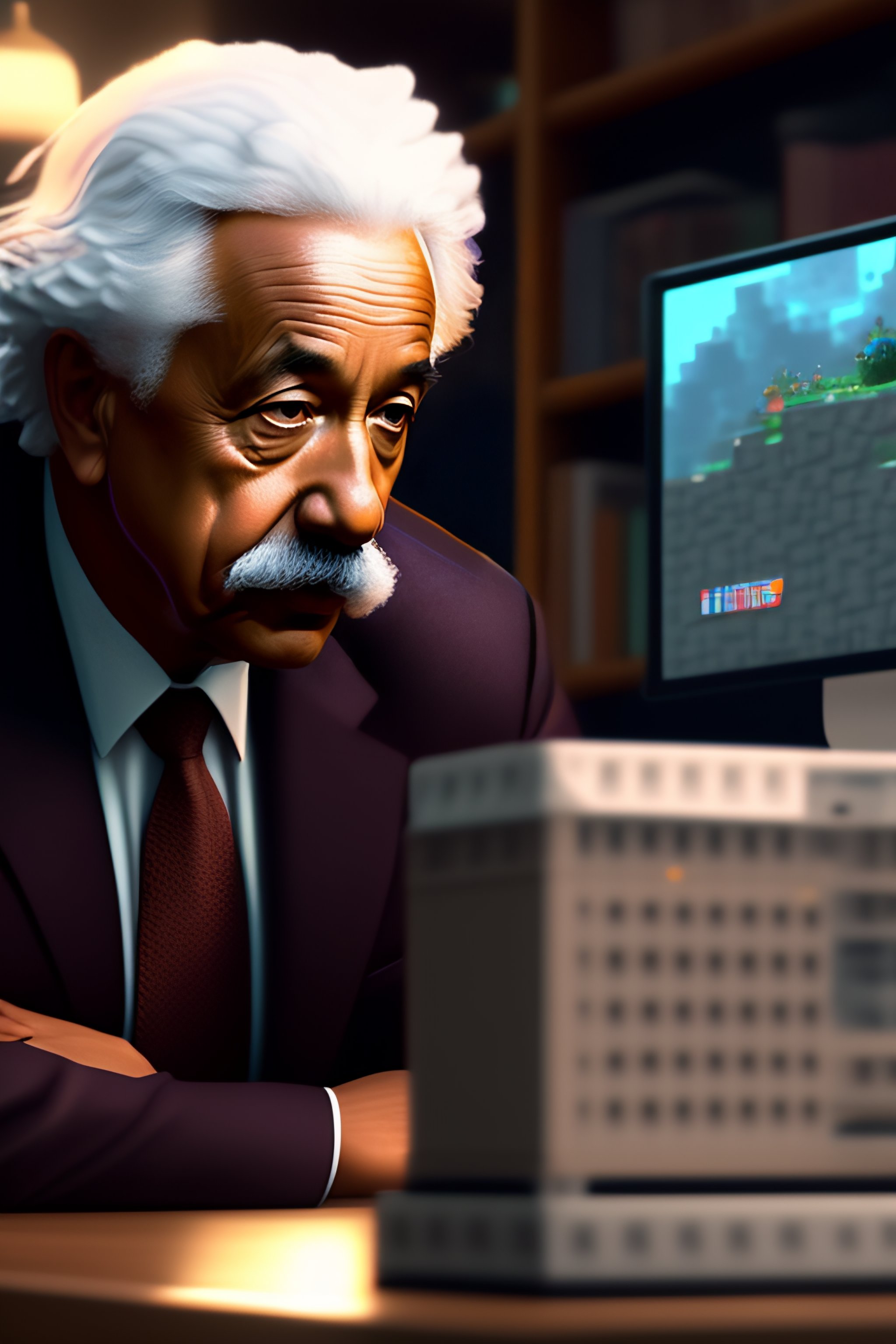 Highly detailed albert einstein playing minecraft, epic laboratory office, shelves with detailed items in background, ((long shot)), highly detailed realistic painting by grandmaster, unreal engine, octane render, 4k, by artgerm and drew struzan and krenz cushart, trending on artstation