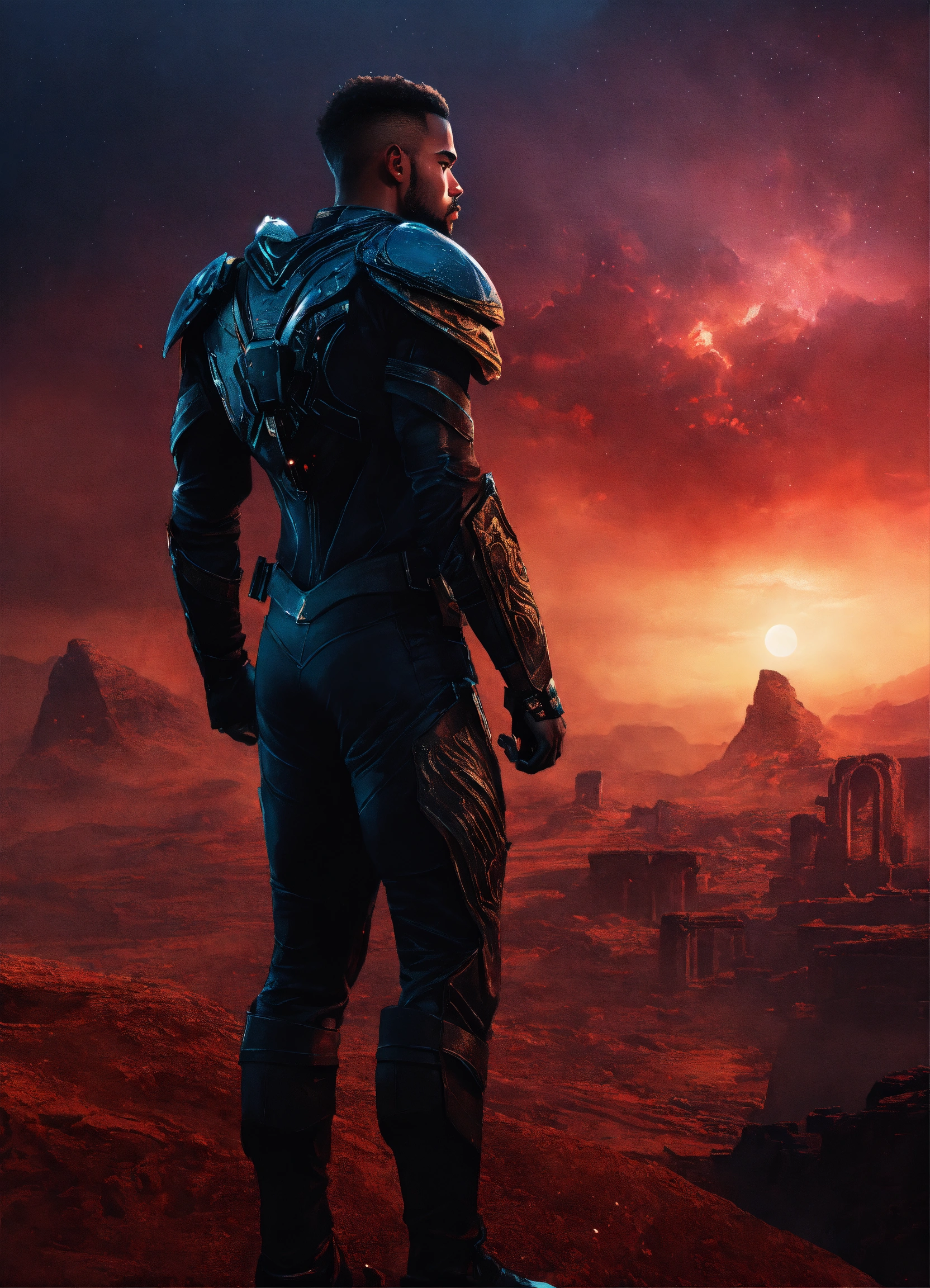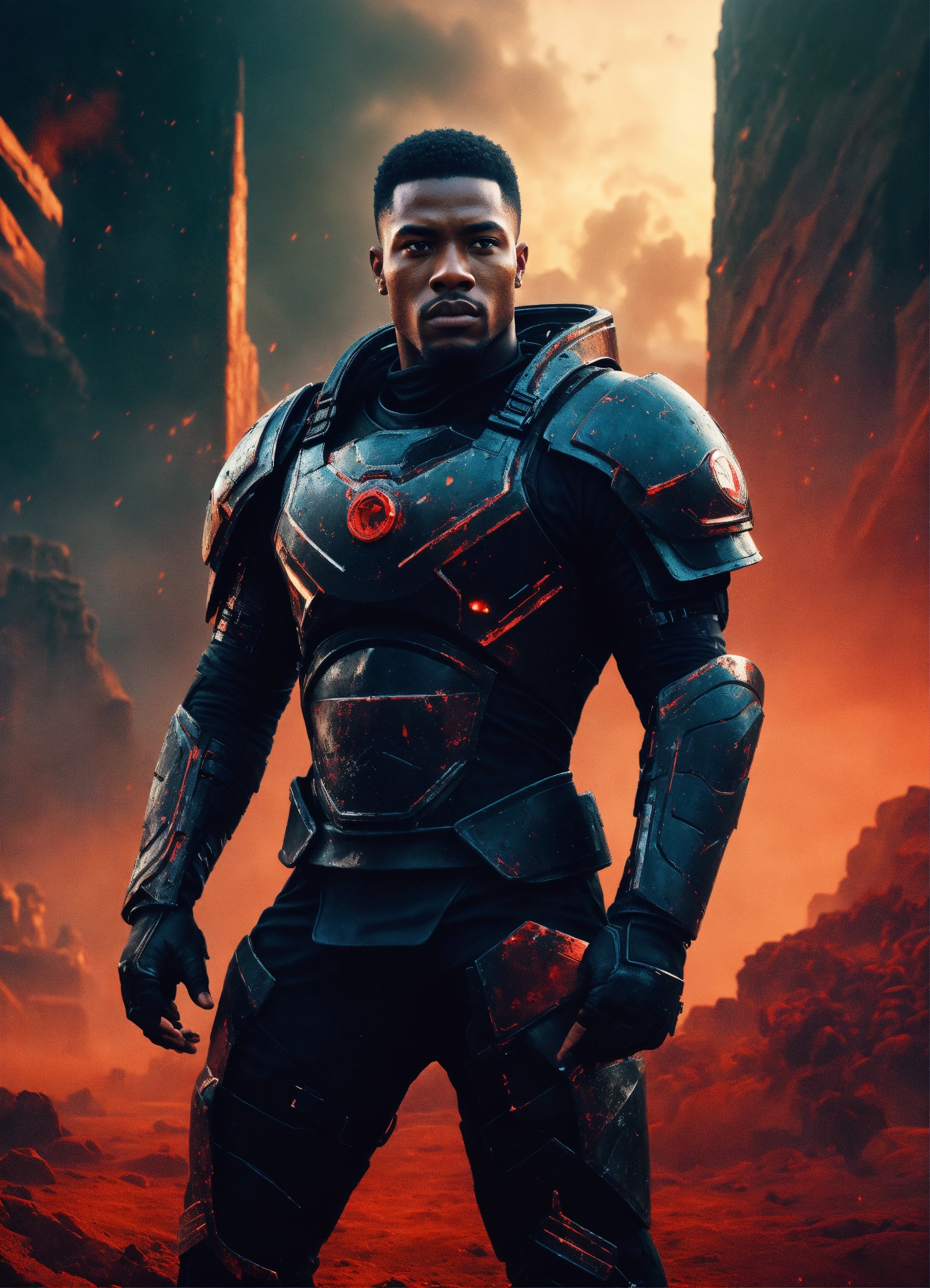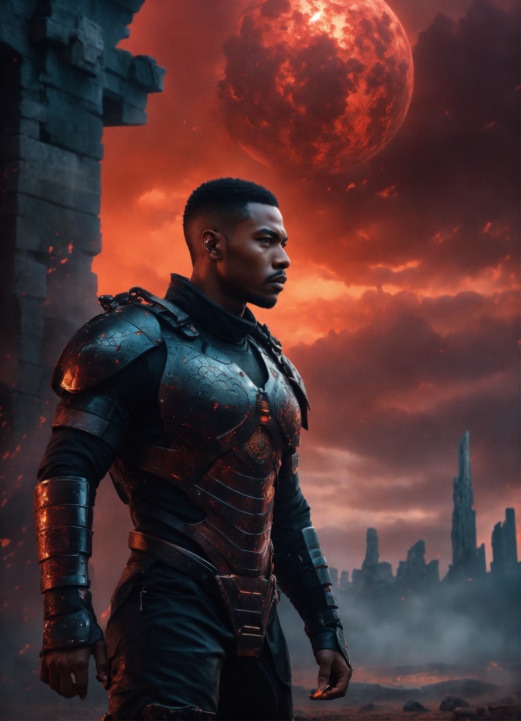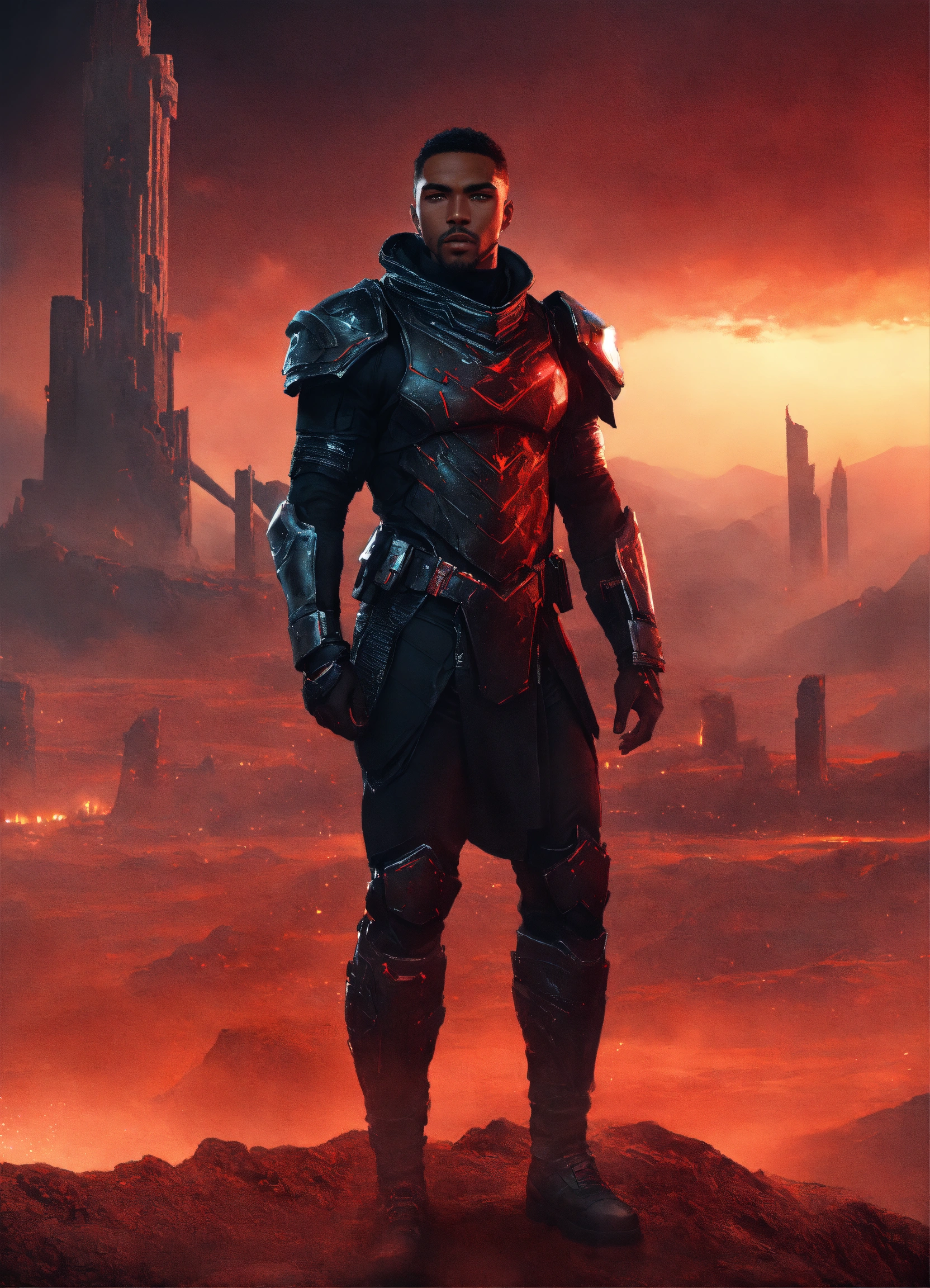 Young strong handsome black futuristic warrior, front facing in an arena, front facing strong handsome god with short hair wearing a black leather super spy stealth suit, muscular dark skinned black male god warrior, short hair handsome male god, front facing, on a distant planet with ruins of an ancient arena and a violent red sky behind him and warriors in the mist watching him, fantasy, high detail, realistic photo, high detail, digital painting, cinematic, stunning, hyper-realistic, sharp focus, high resolution 8k, insanely detailed