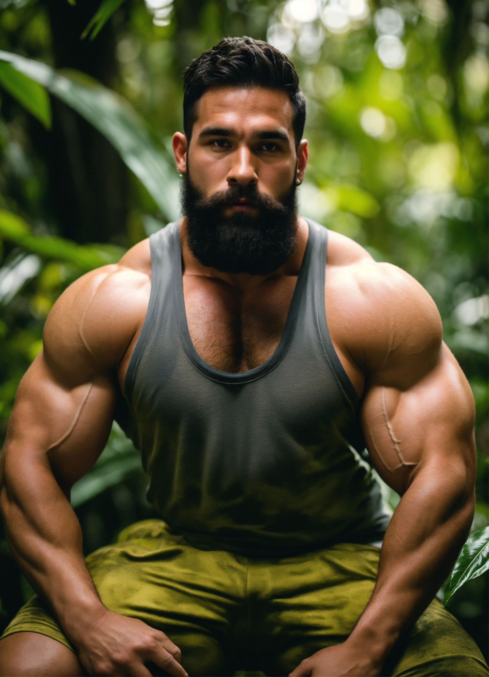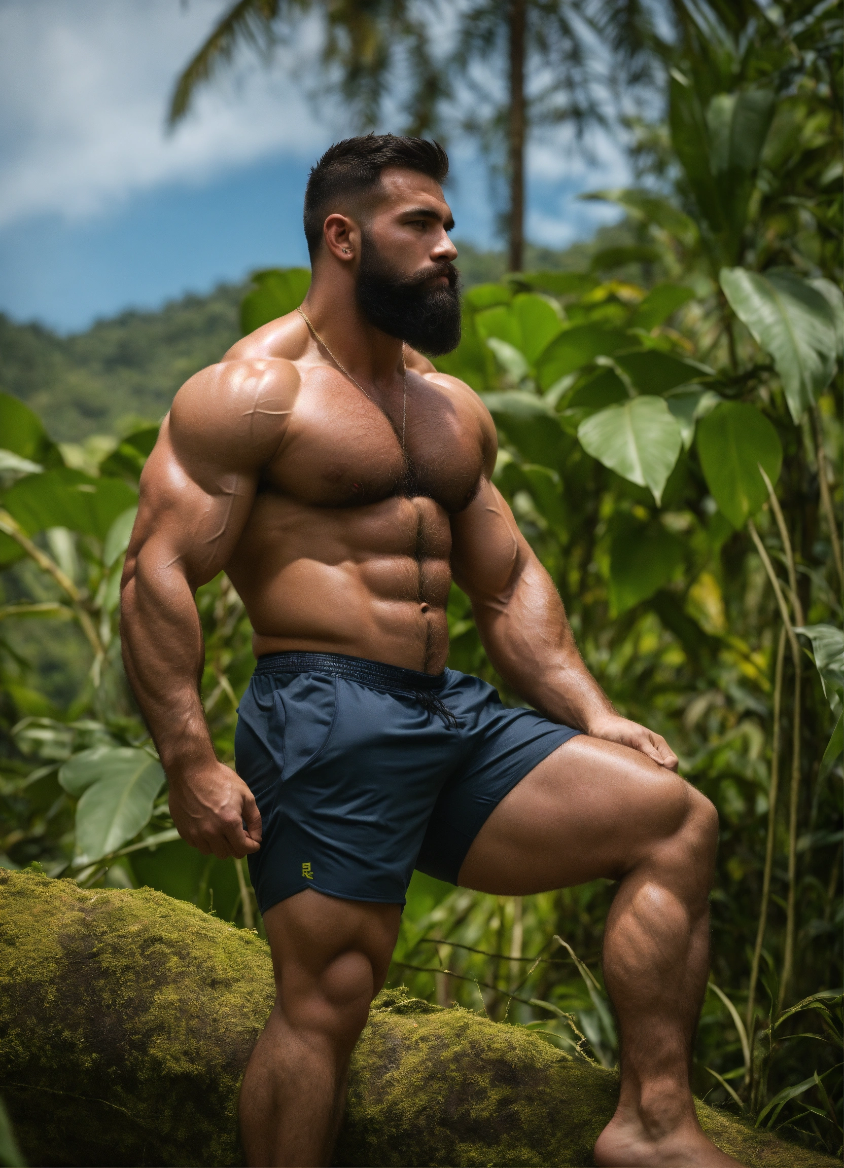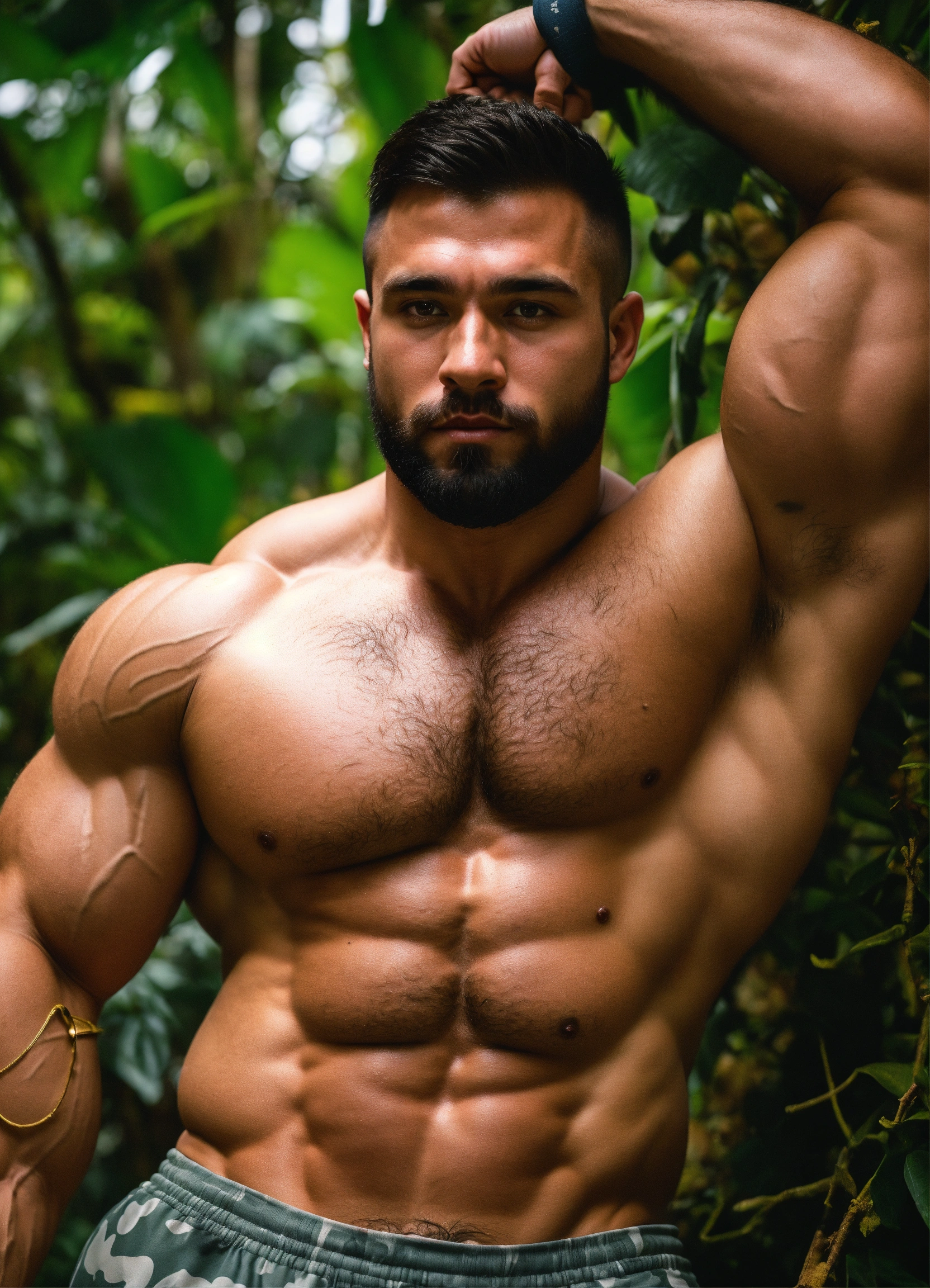 30-year-old man with big muscles, big bodybuilder, colombian, hairy torso, hairy arms, hairy legs, body like a wrestler, in a jungle
