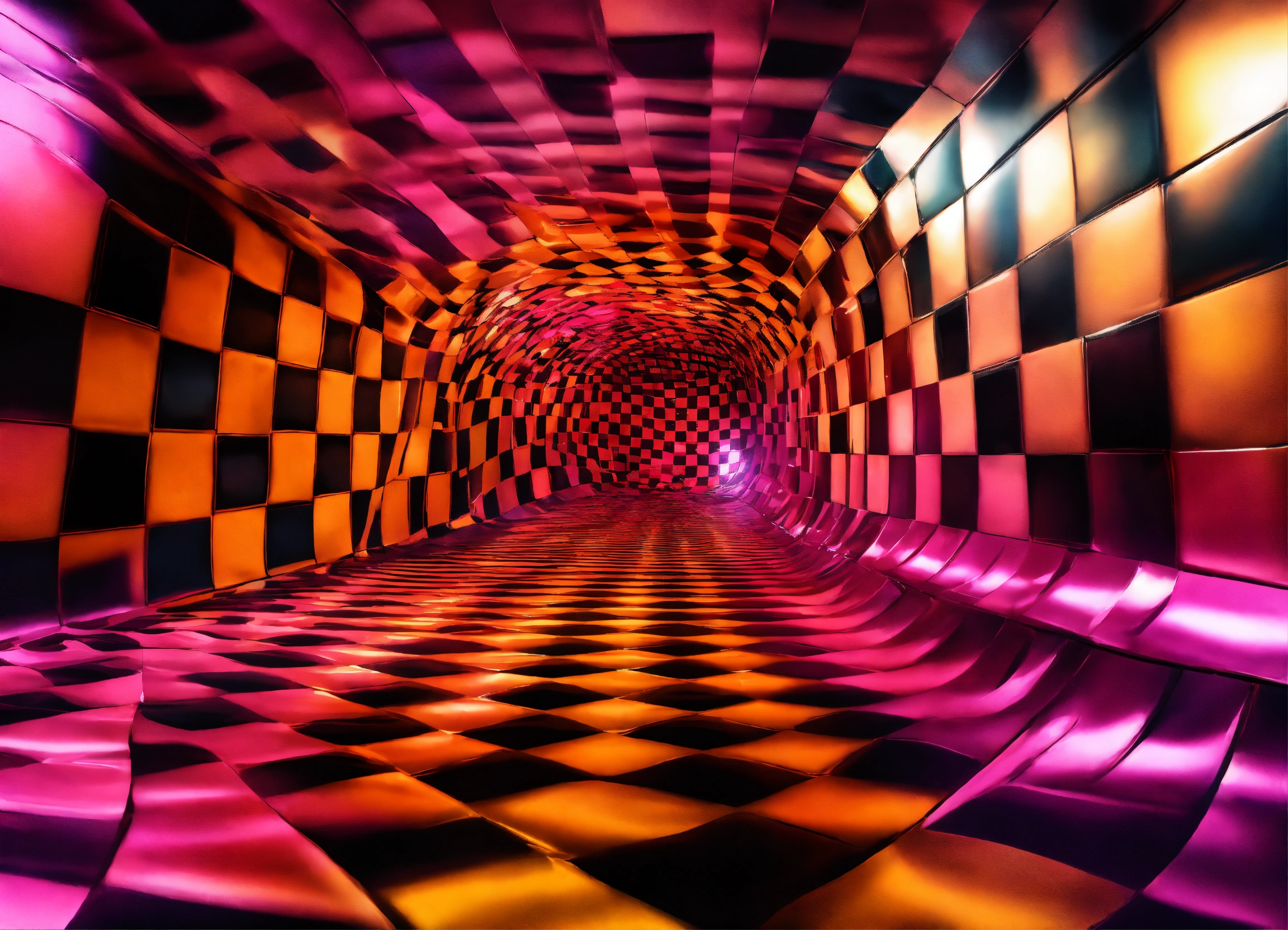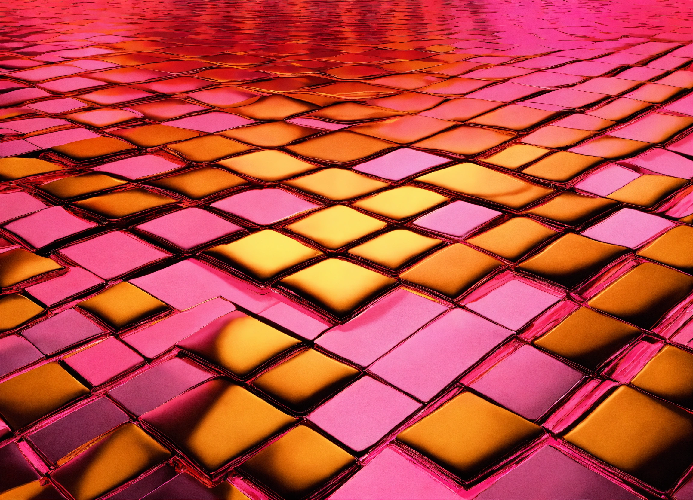 Shiny metallic pink and orange large checkerboard pattern background graphic, wavy distorted perspective, in the style of peter maxx