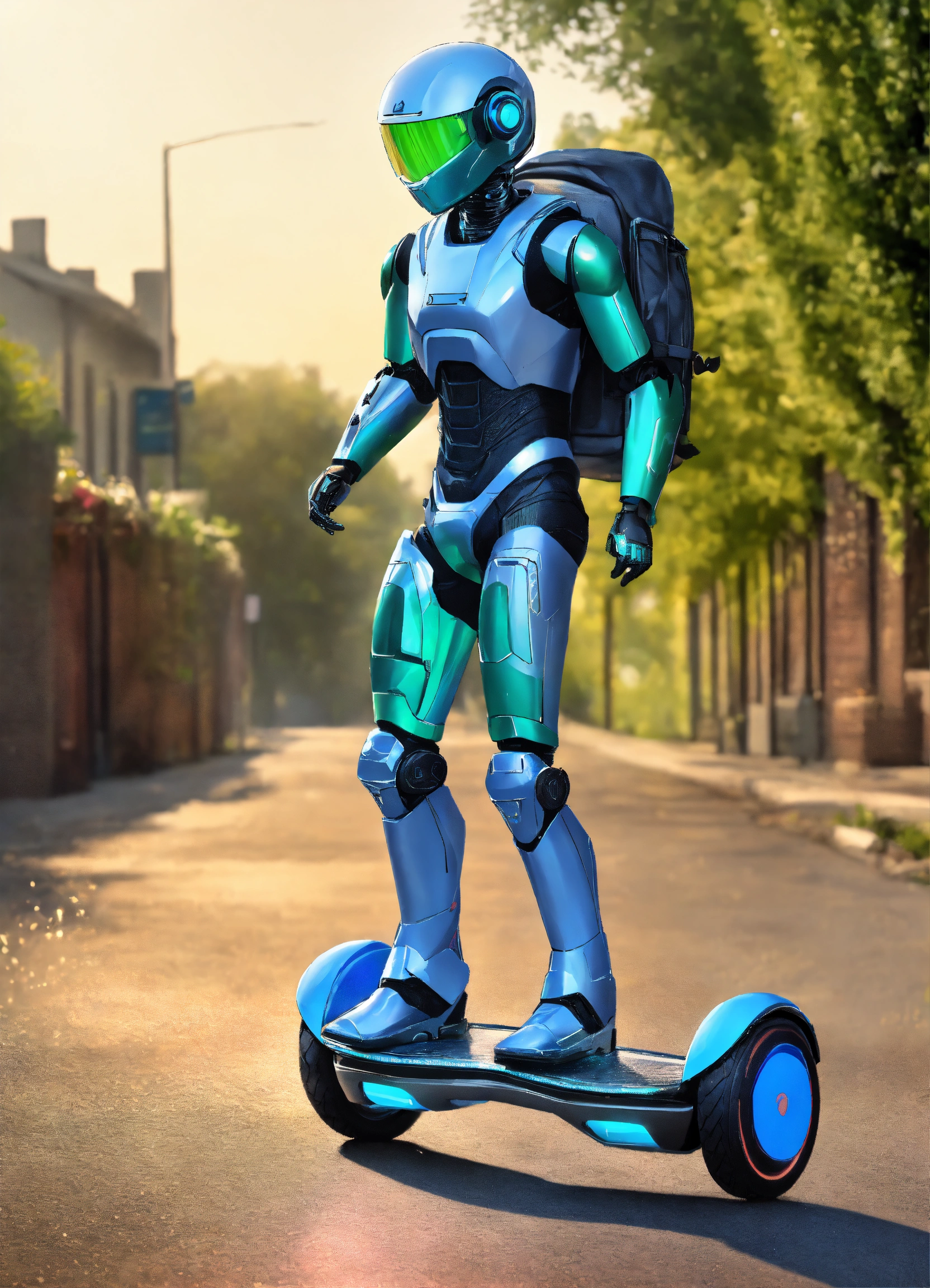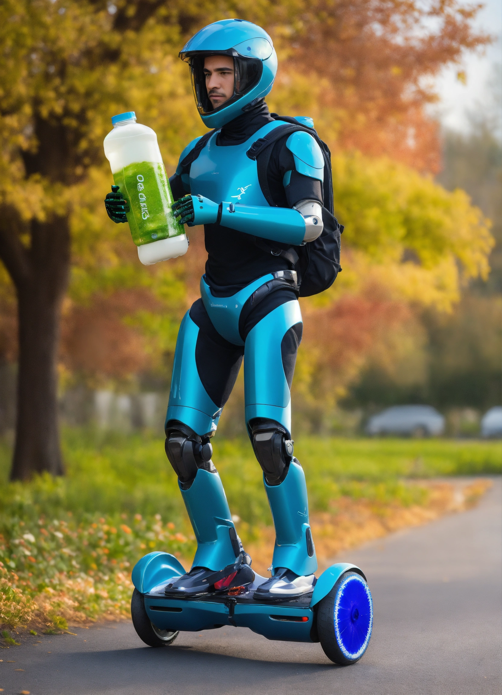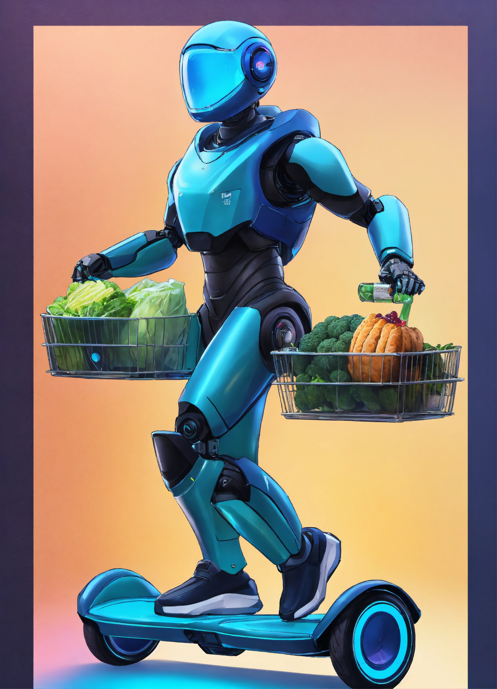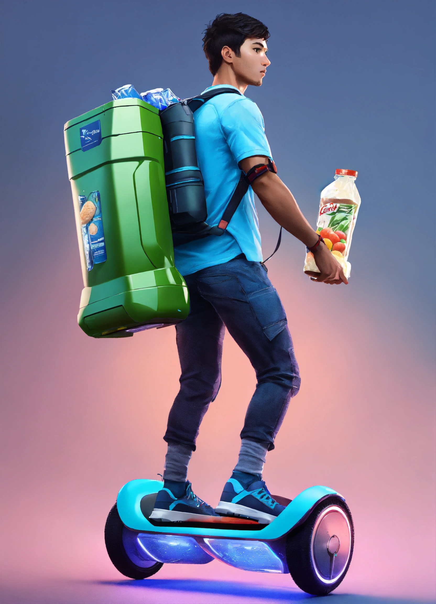 A passionate male robot riding on hoverboard, realistic man face, clear eyes, black hair, full appearance, delivering groceries, and some assorted vegetables, assorted milk bottle, bread pack, soft drink in basket on hands. sports backpack. transparent background, the predominant design colors are gradients of blue and green. no background images, background should be gradients of blue and green