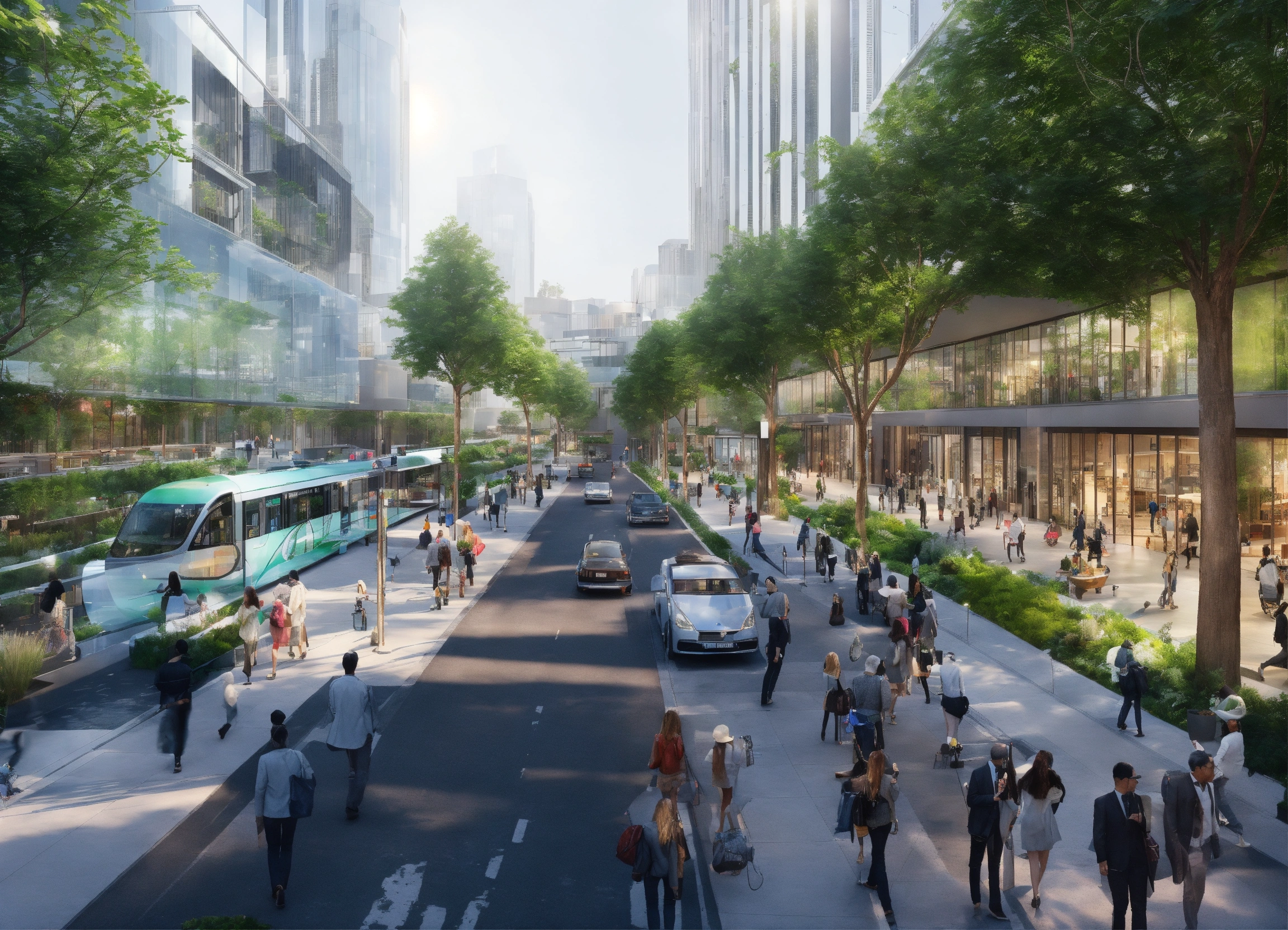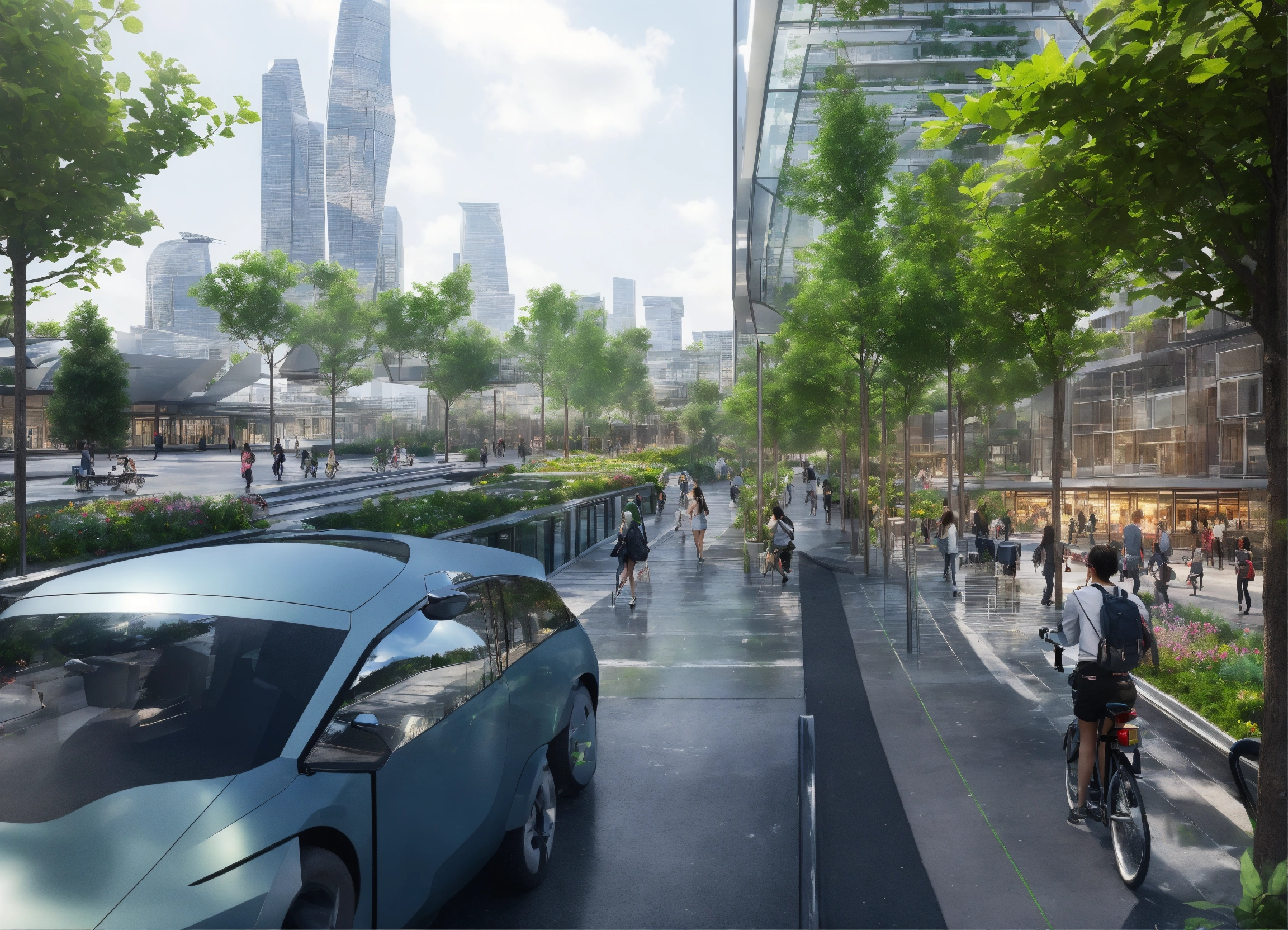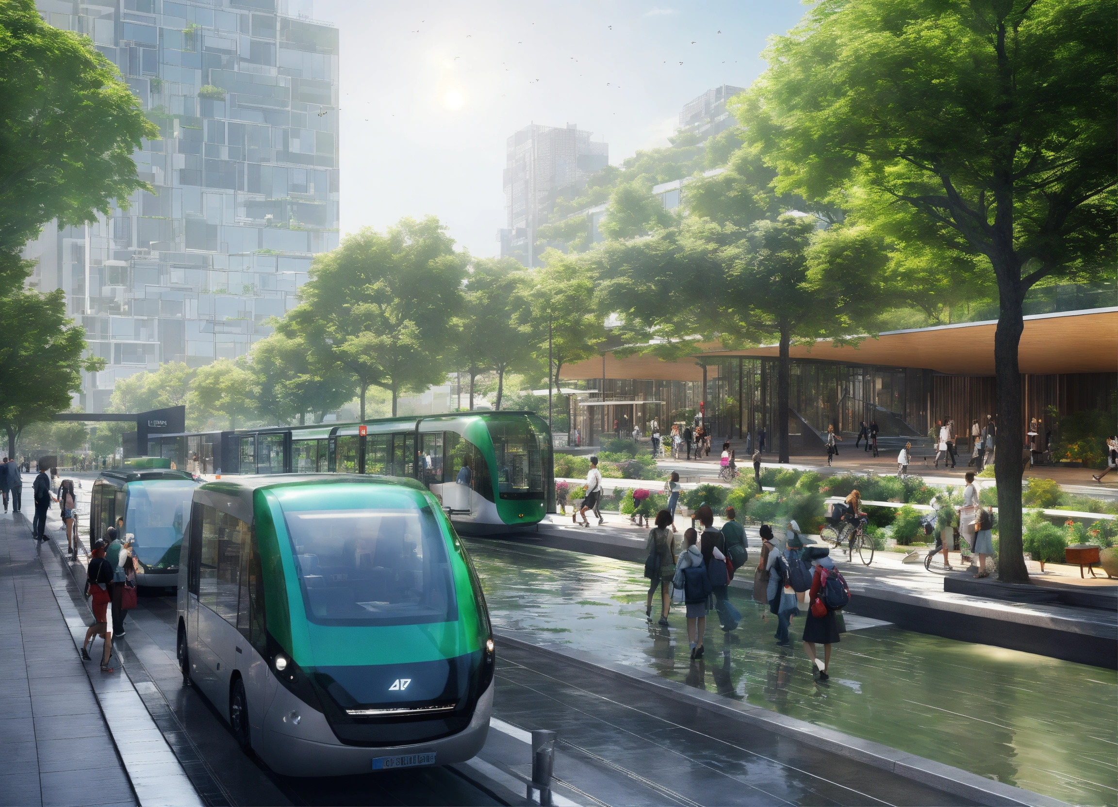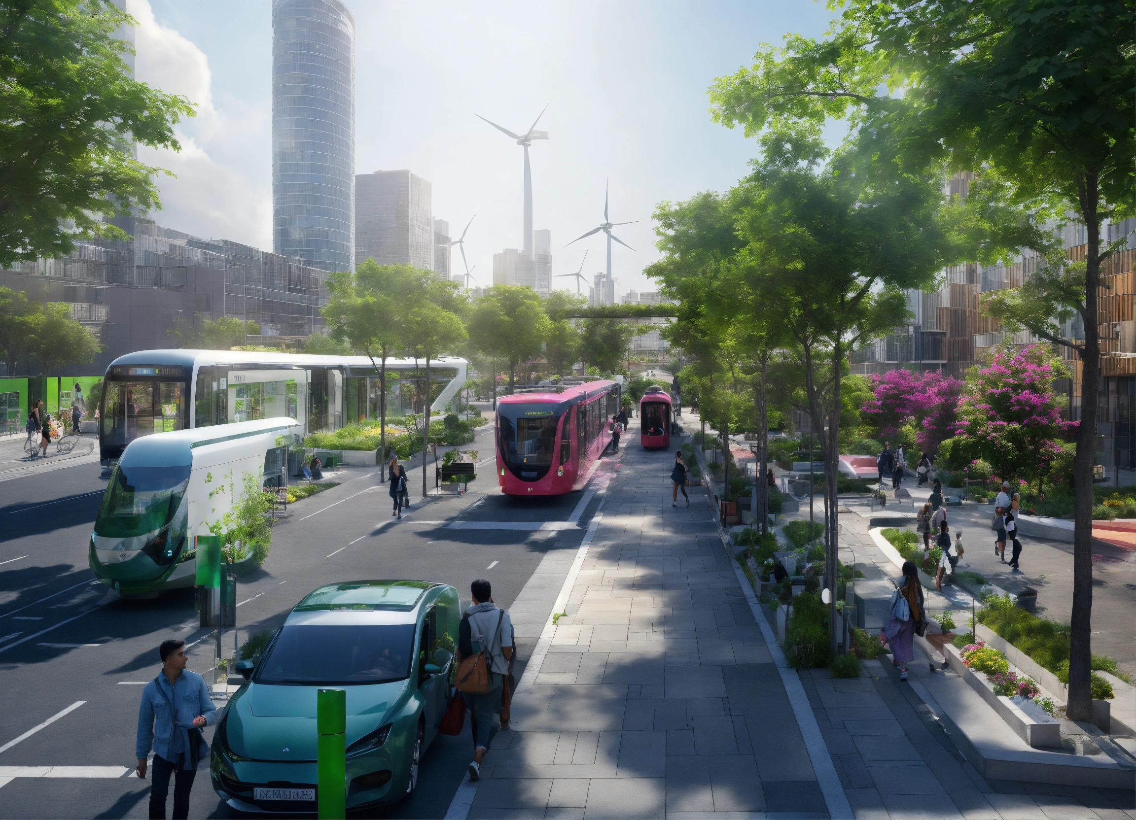 "create an image of a sustainable and modern cityscape that integrates green technology and eco-friendly architecture. include rooftop gardens, solar panels, wind turbines, and electric public transportation. the buildings should be modern with clean lines and glass facades to reflect a high-tech environment. there should be pedestrian-friendly spaces with people enjoying the outdoor green areas. the atmosphere should be vibrant and the sky clear to emphasize a pollution-free environment."