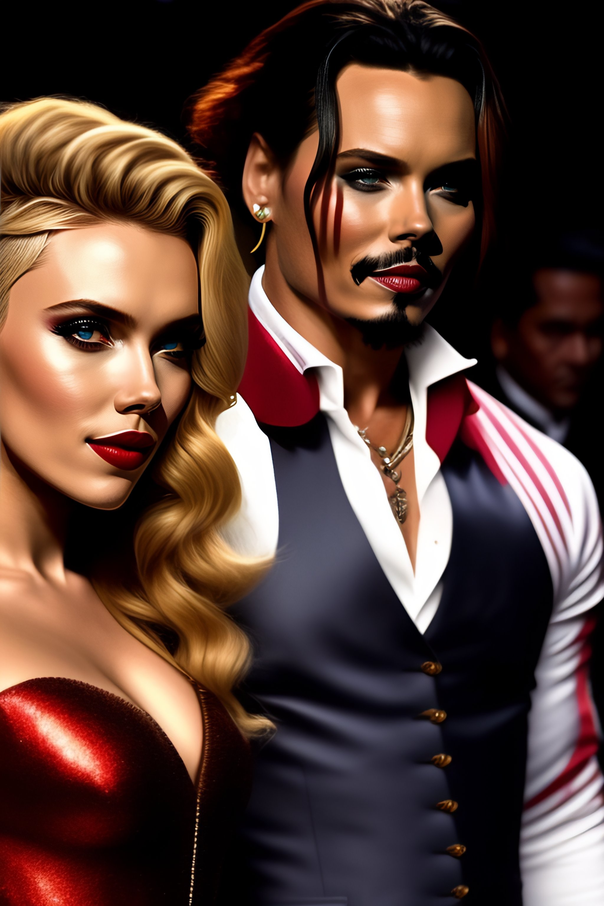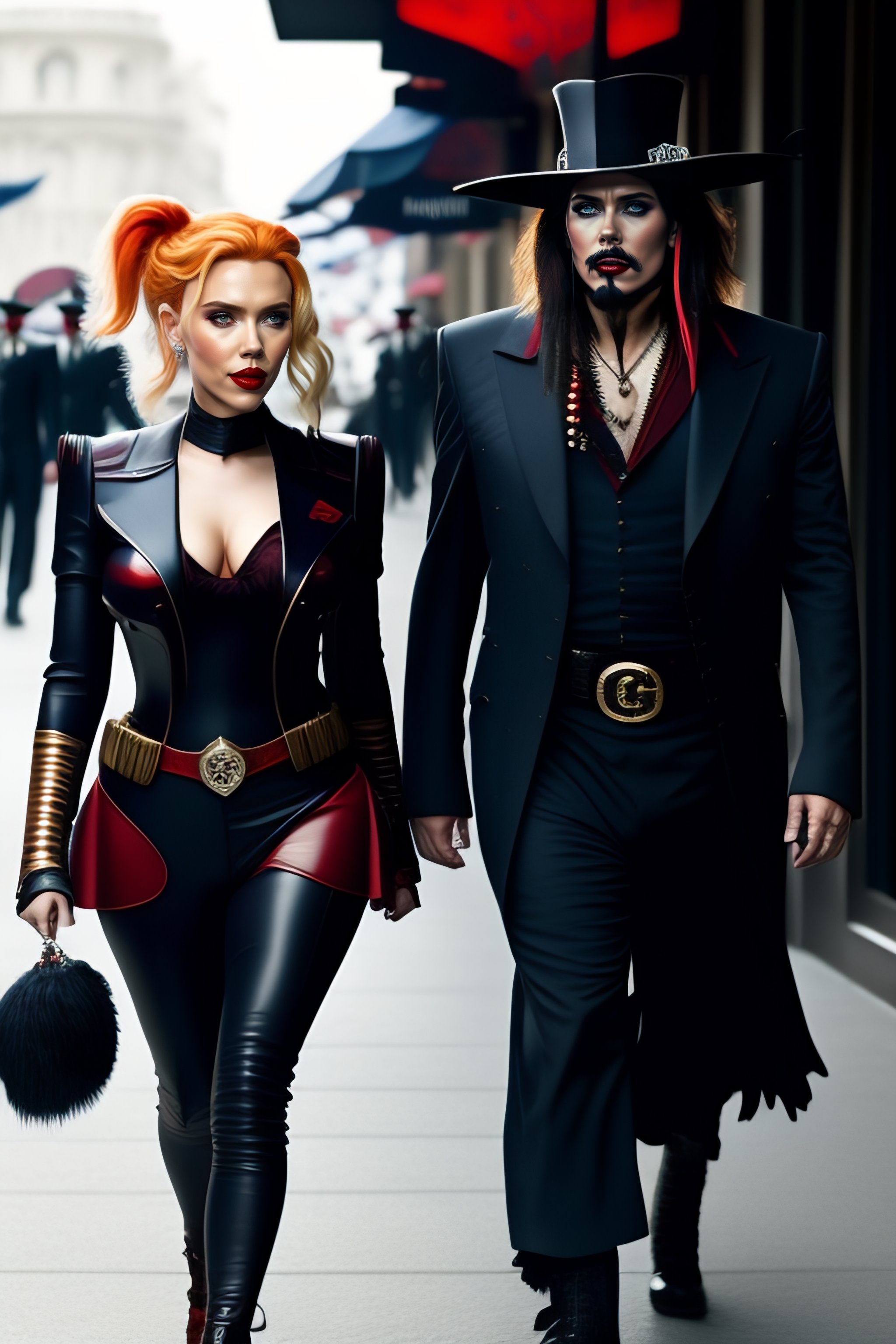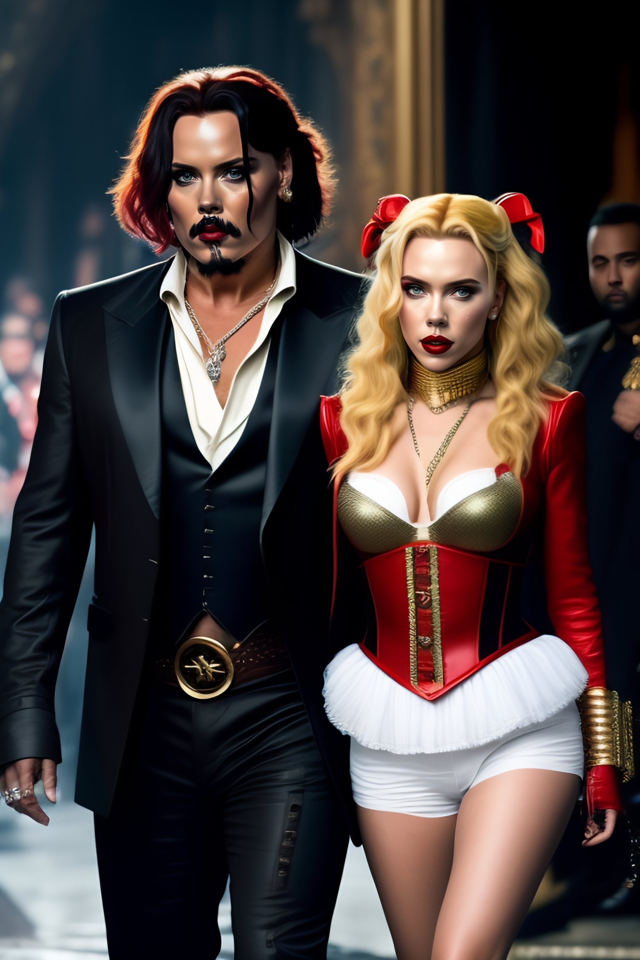 Scarlett johansson as harley quinn walking beside johnny depp jack sparrow