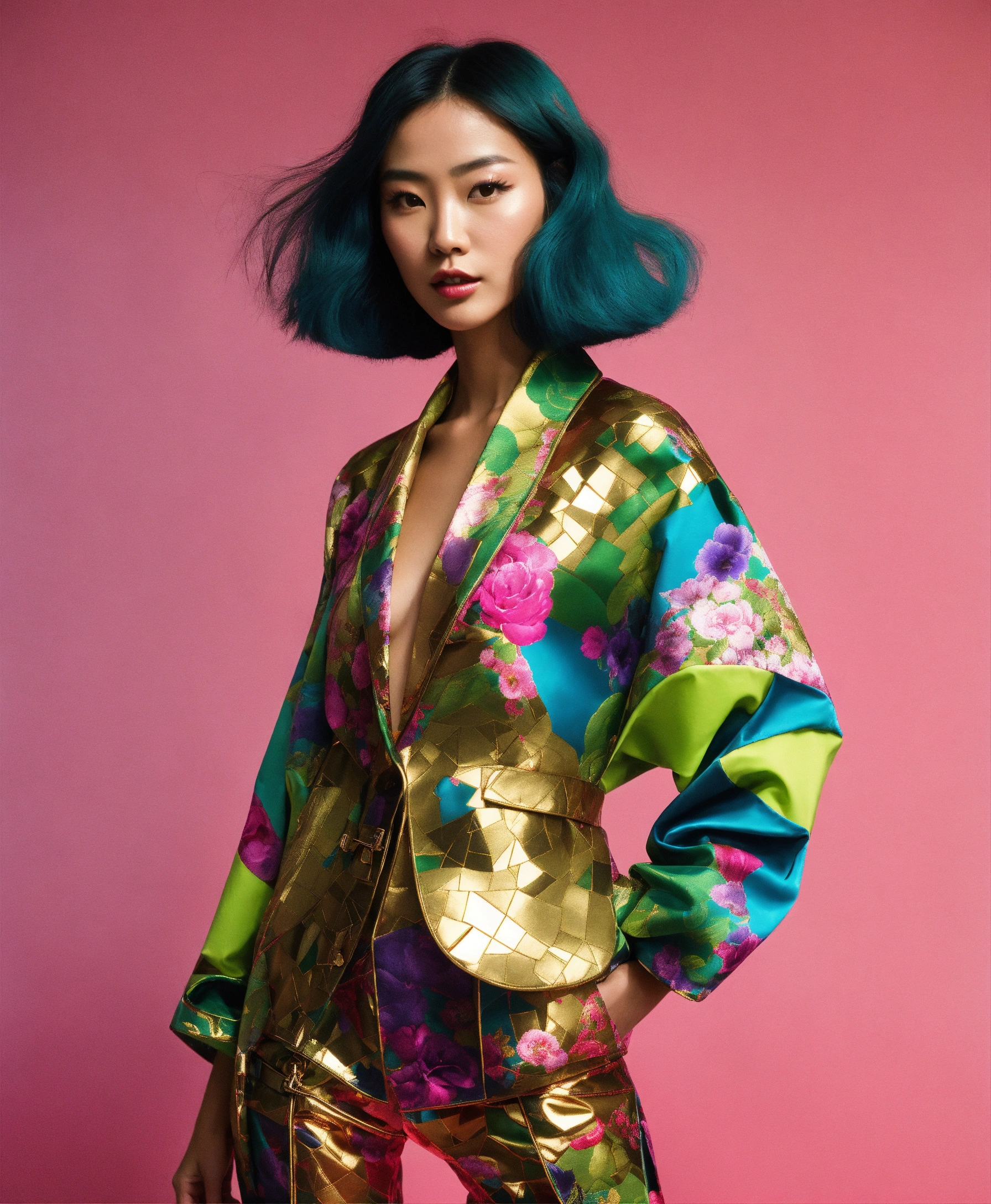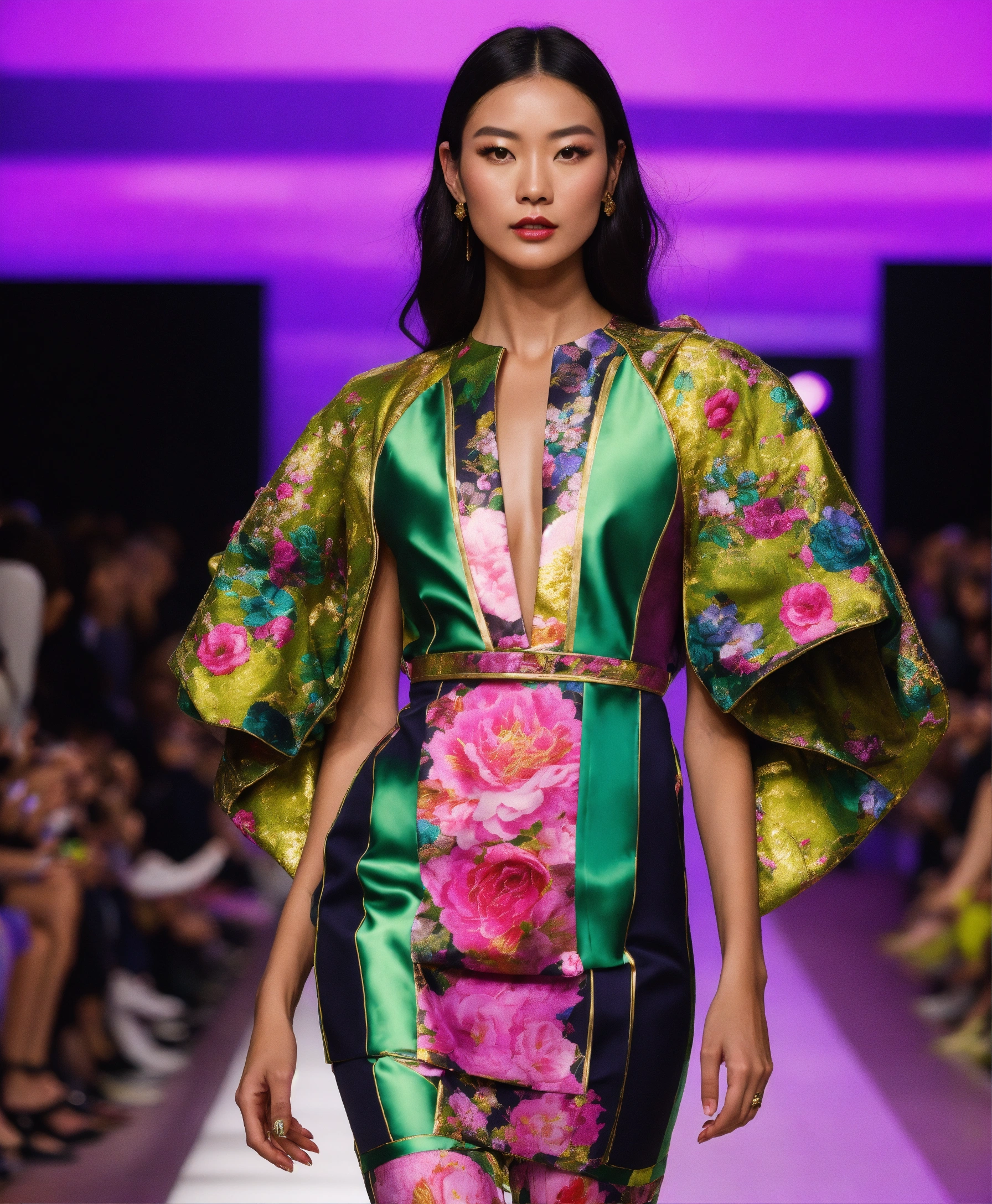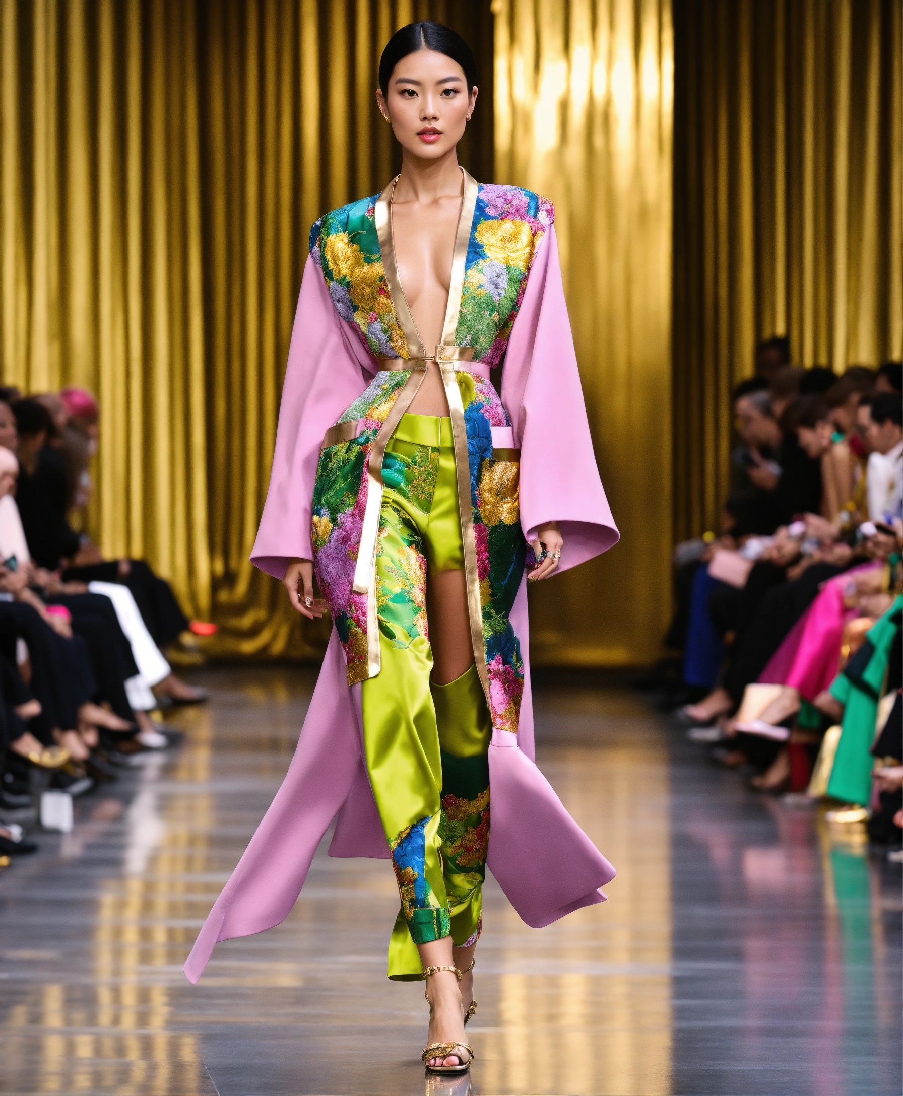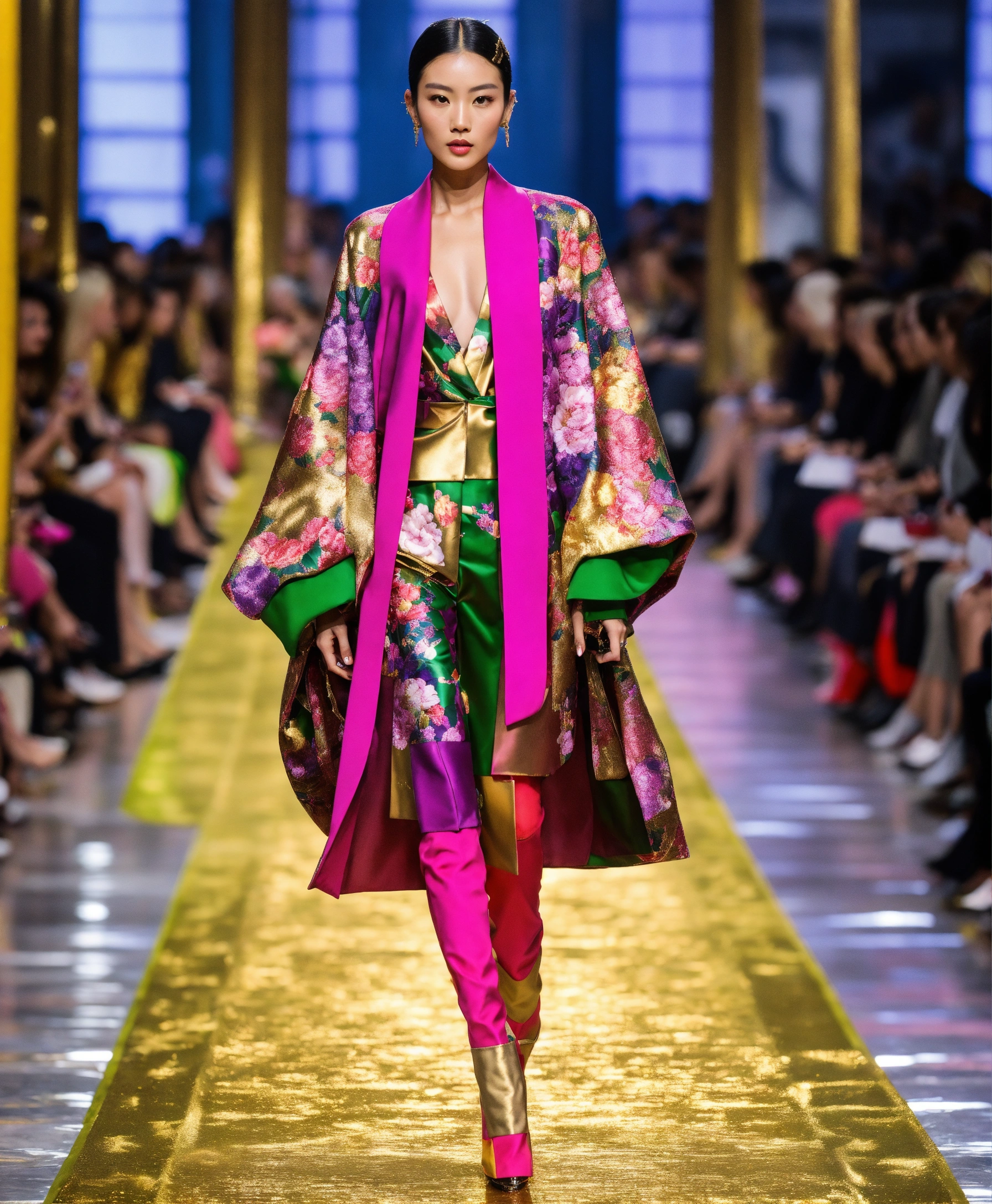 Ultra realistic full body photo of a stylish japanese model walking the runway modeling summer designer novelty interesting complex unusual street sporty classy modern dolman sleeve outfit brave, paris versailles details cutouts and and gold geometric pattern floral structured tailored jacket pink gold green lilac peridot silver magenta lime fuchsia yellow blue black gray copper mauve bronze haute couture ultimate elegance beautiful luxurious awesome wealthy resplendent magnificent sublime 12k