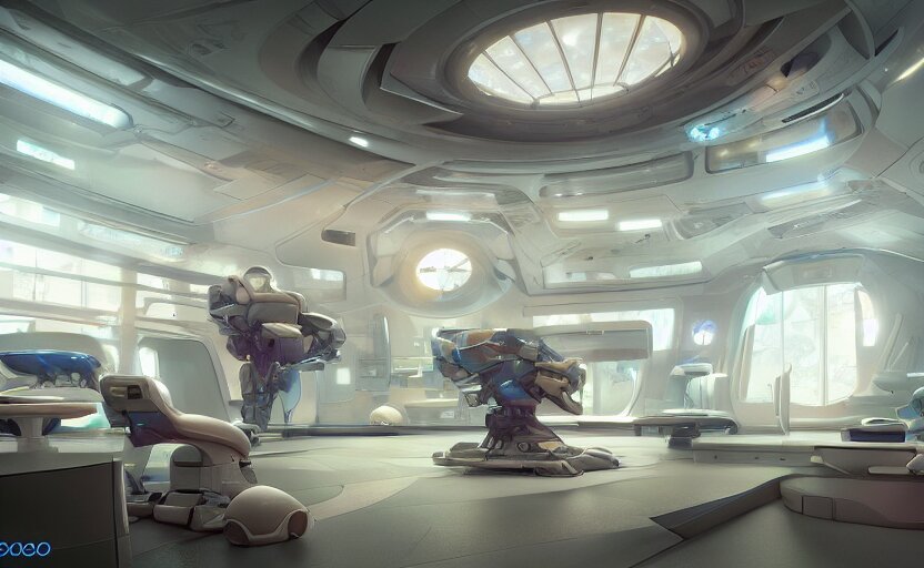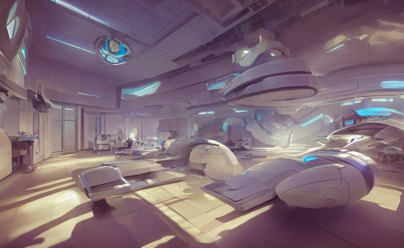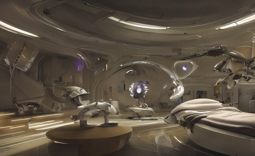 Futuristic hospital room beautiful and magical. by frank lloyd wright, concept art, inrincate, sharp focus, digital painting, unreal engine, cgsociety, neoclassical, mech, robot, fractal flame, cinematic, overwatch skin, highly detailded