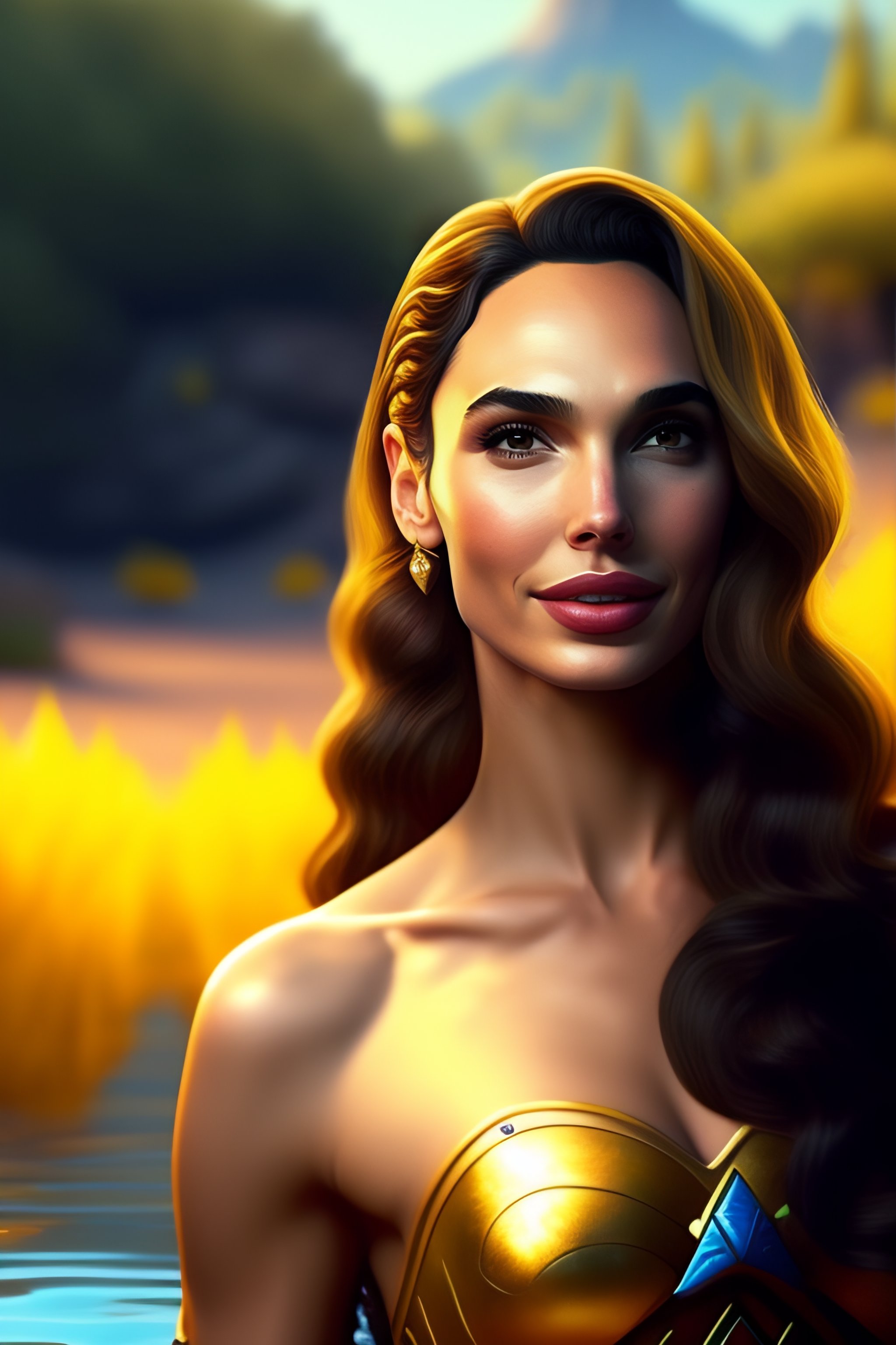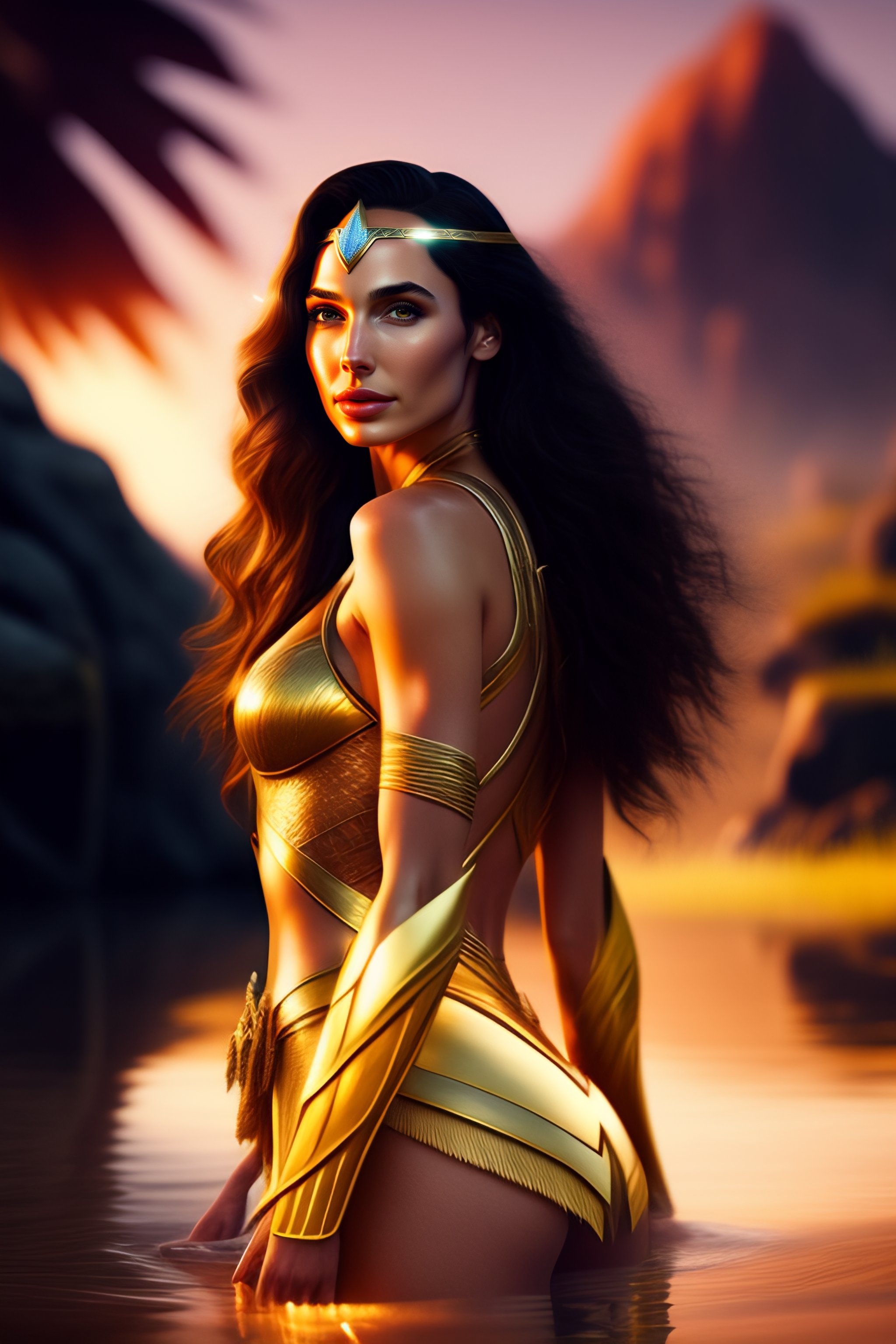 Gal gadot is a zelda princess, yellow trees in the background, walking in water, blonde hair, full-body view, sunset light, unreal engine