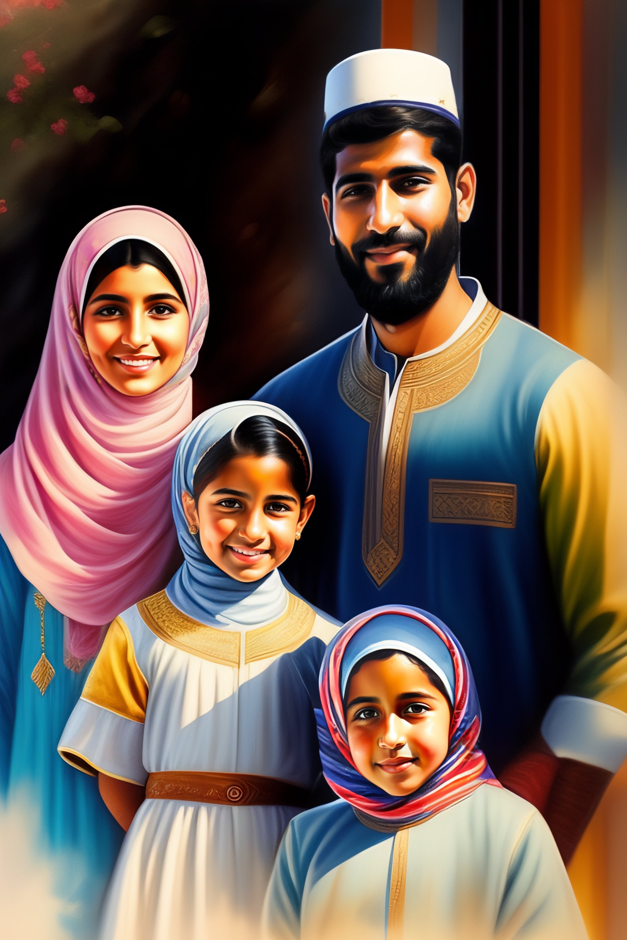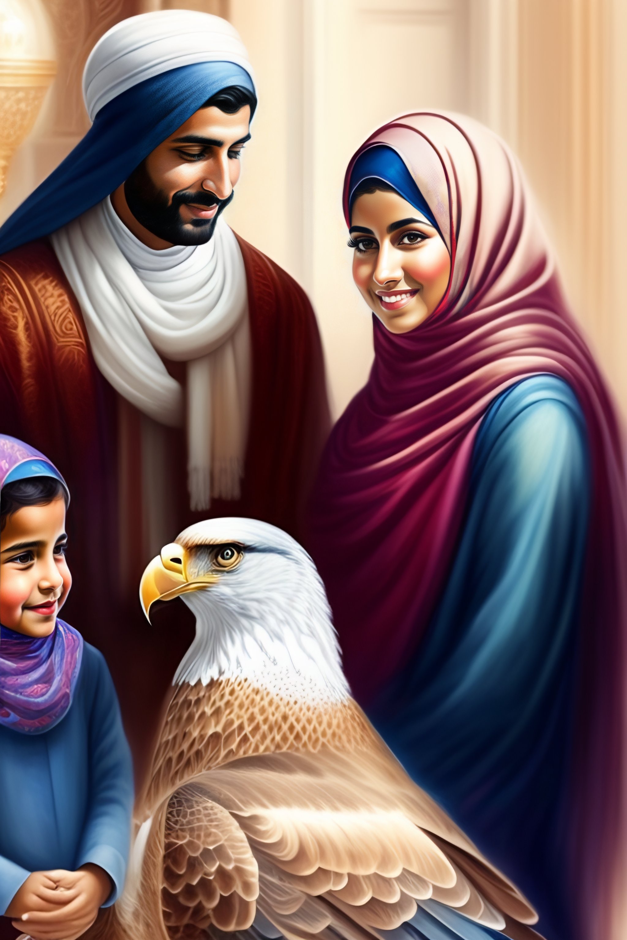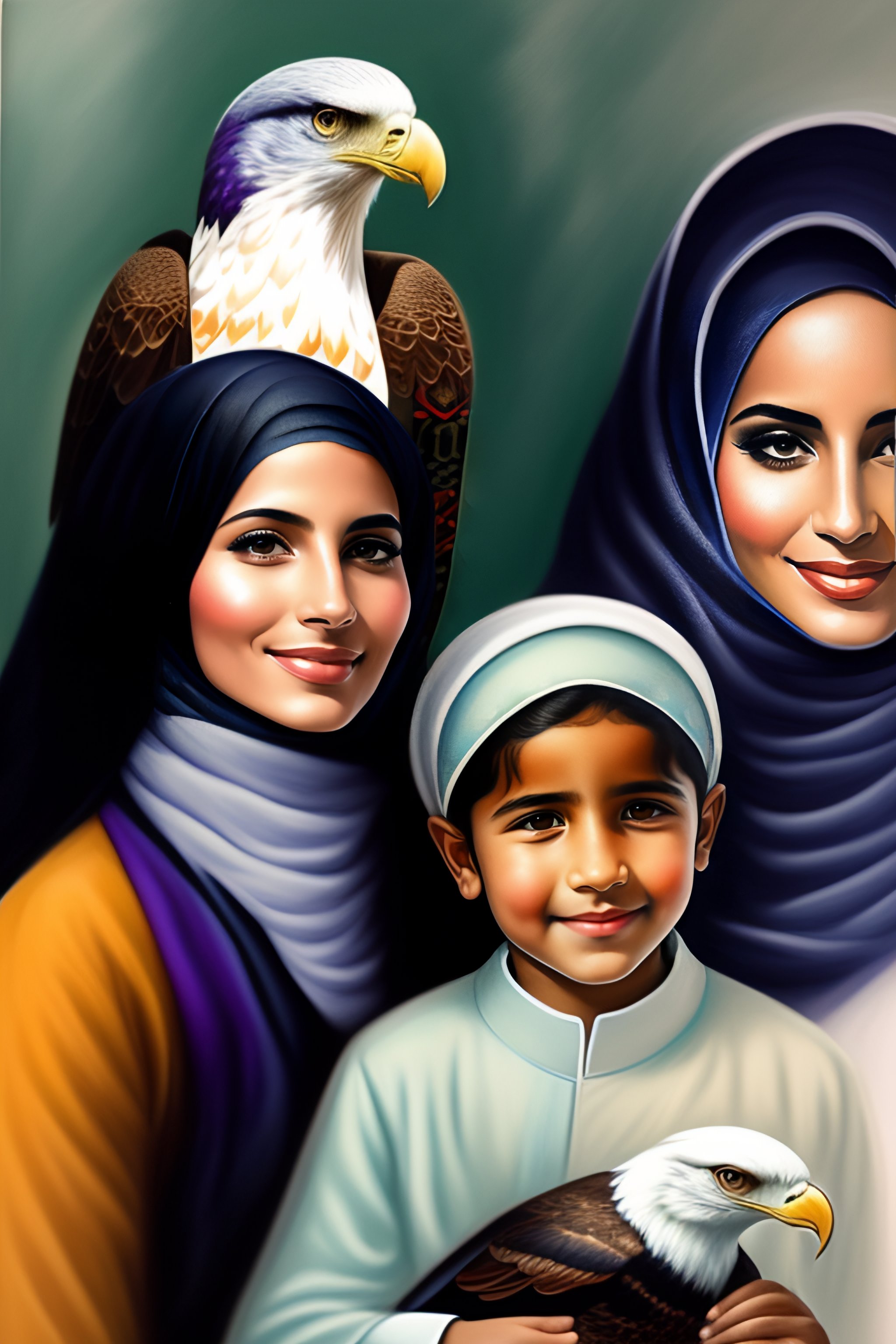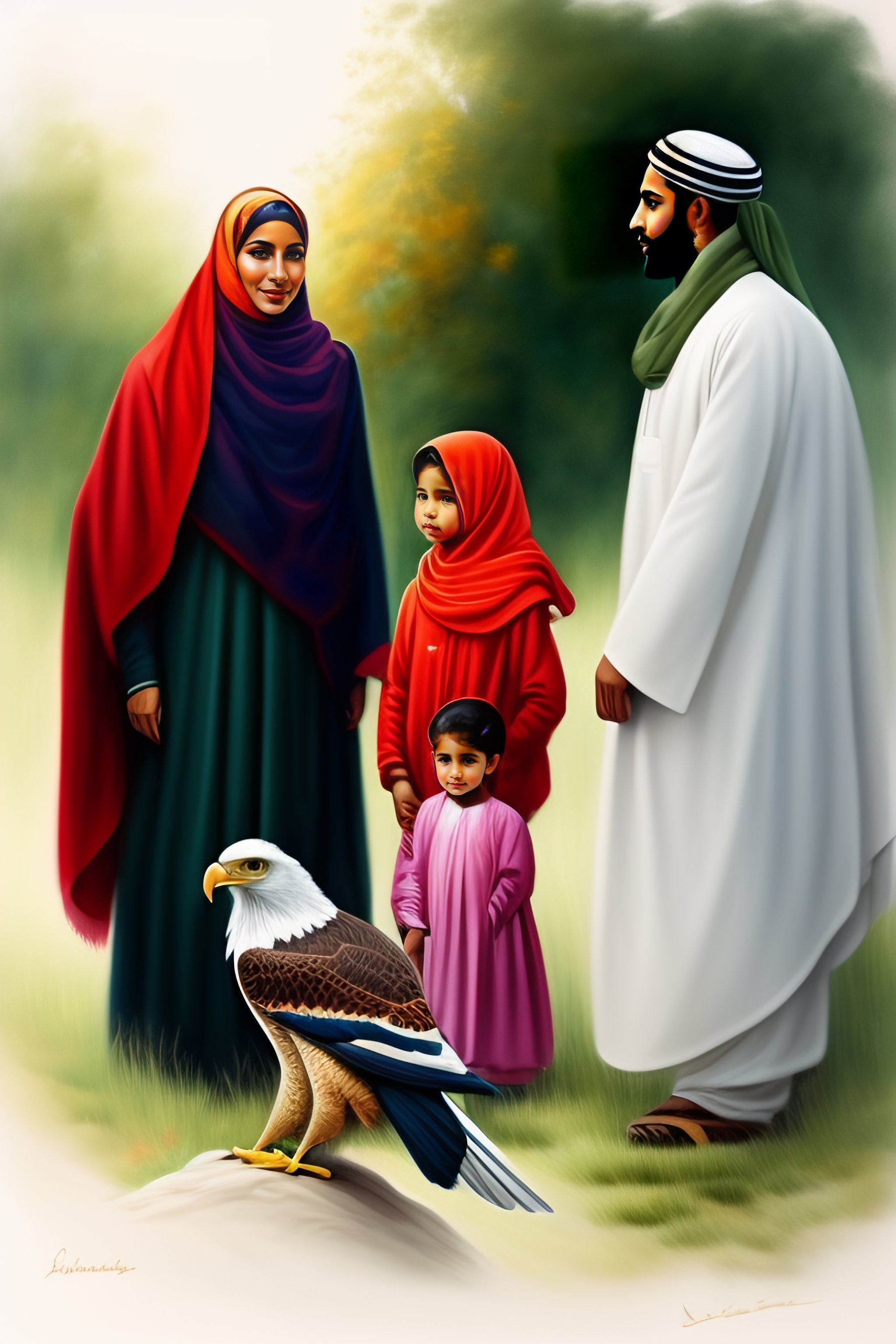 Sketch painting of a cousins group in a lovely islamic family showing an eagle in the background