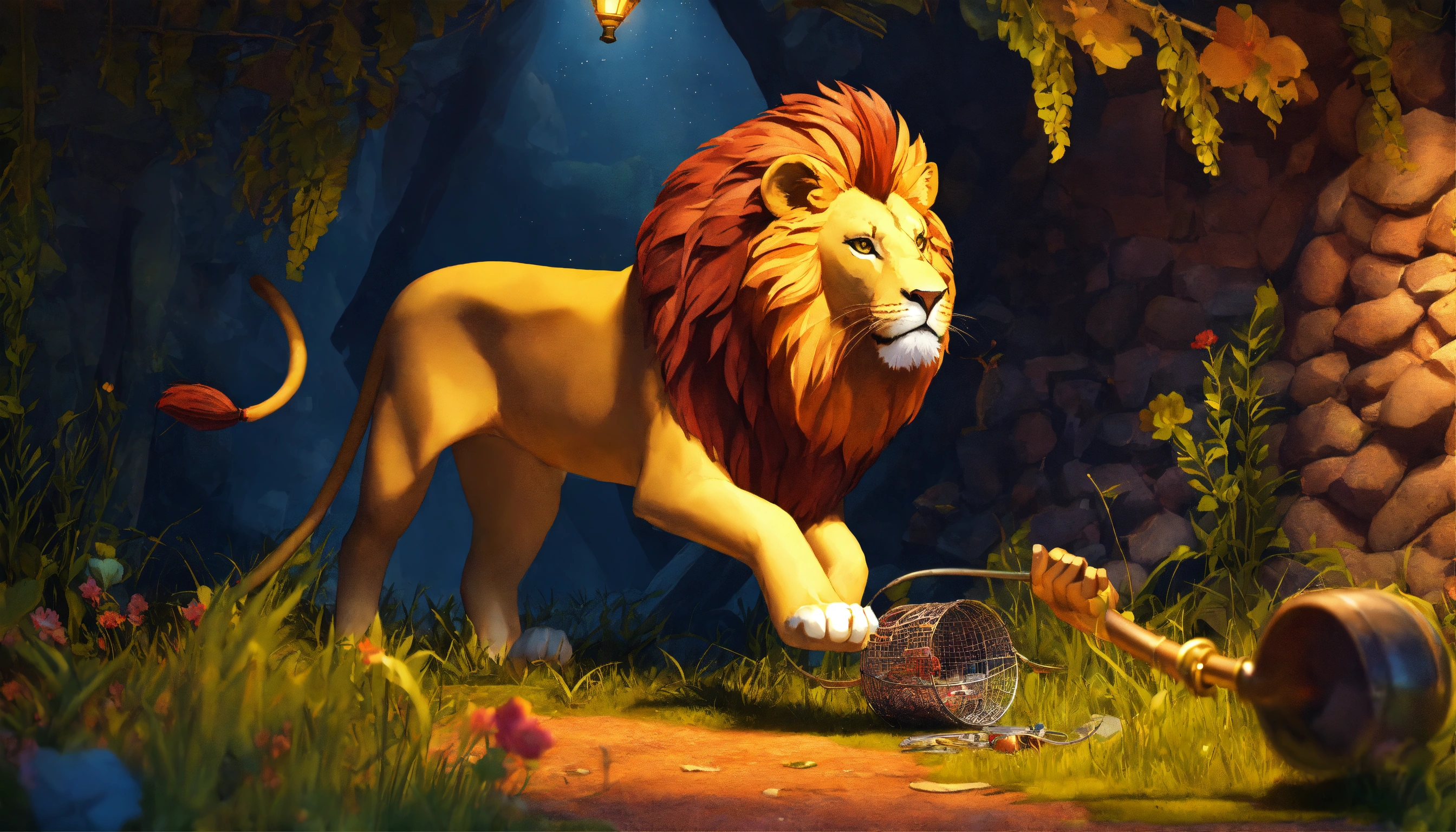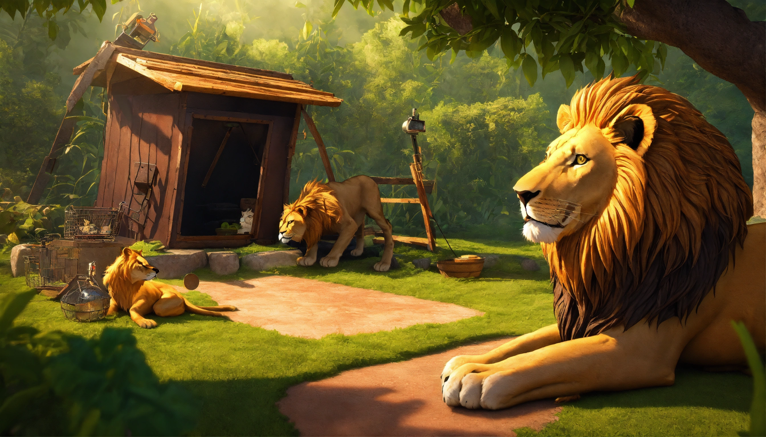 The lion got caught in the trap", 3d pictures, storybook illustration, digital art, professional, high quality, detailed.