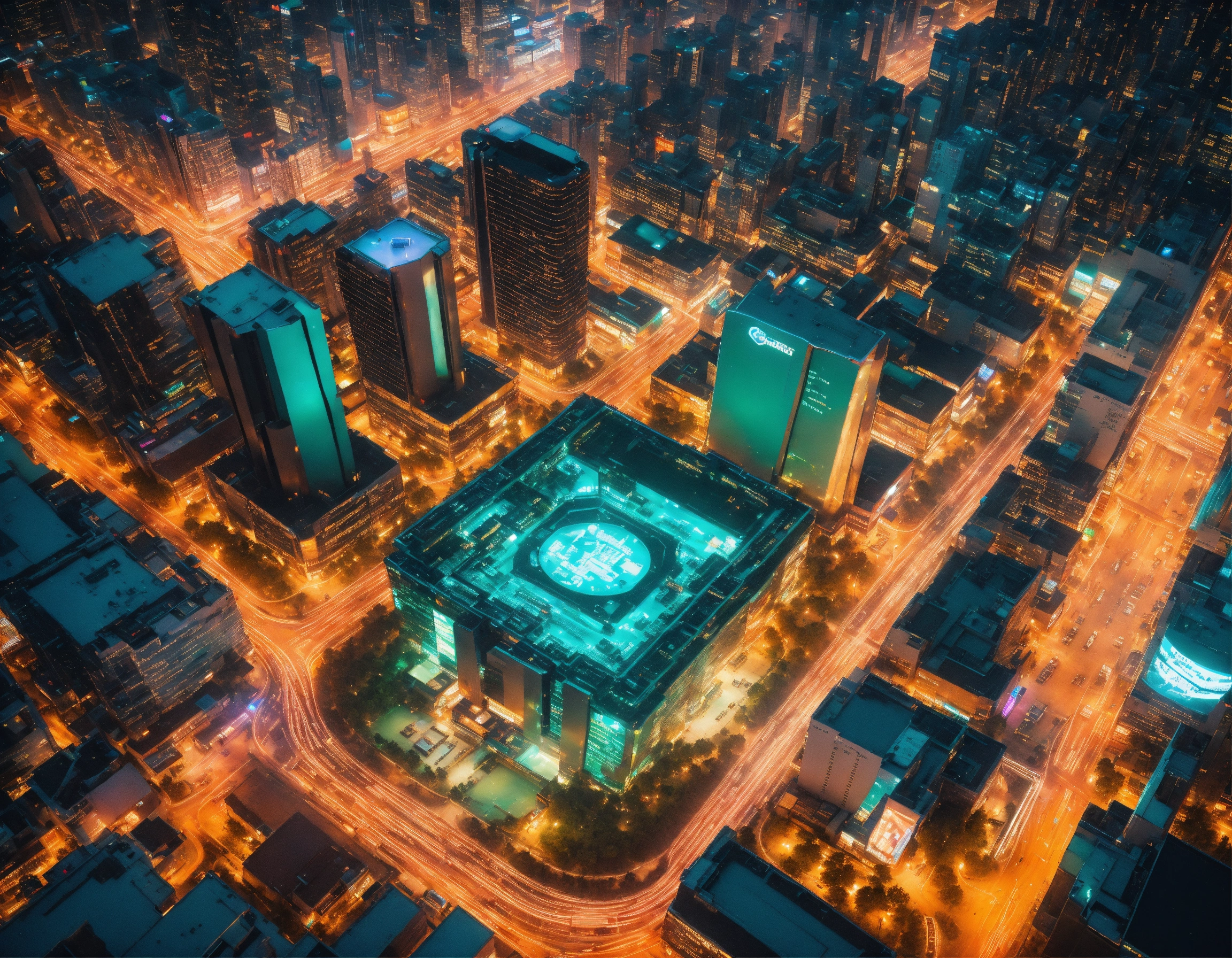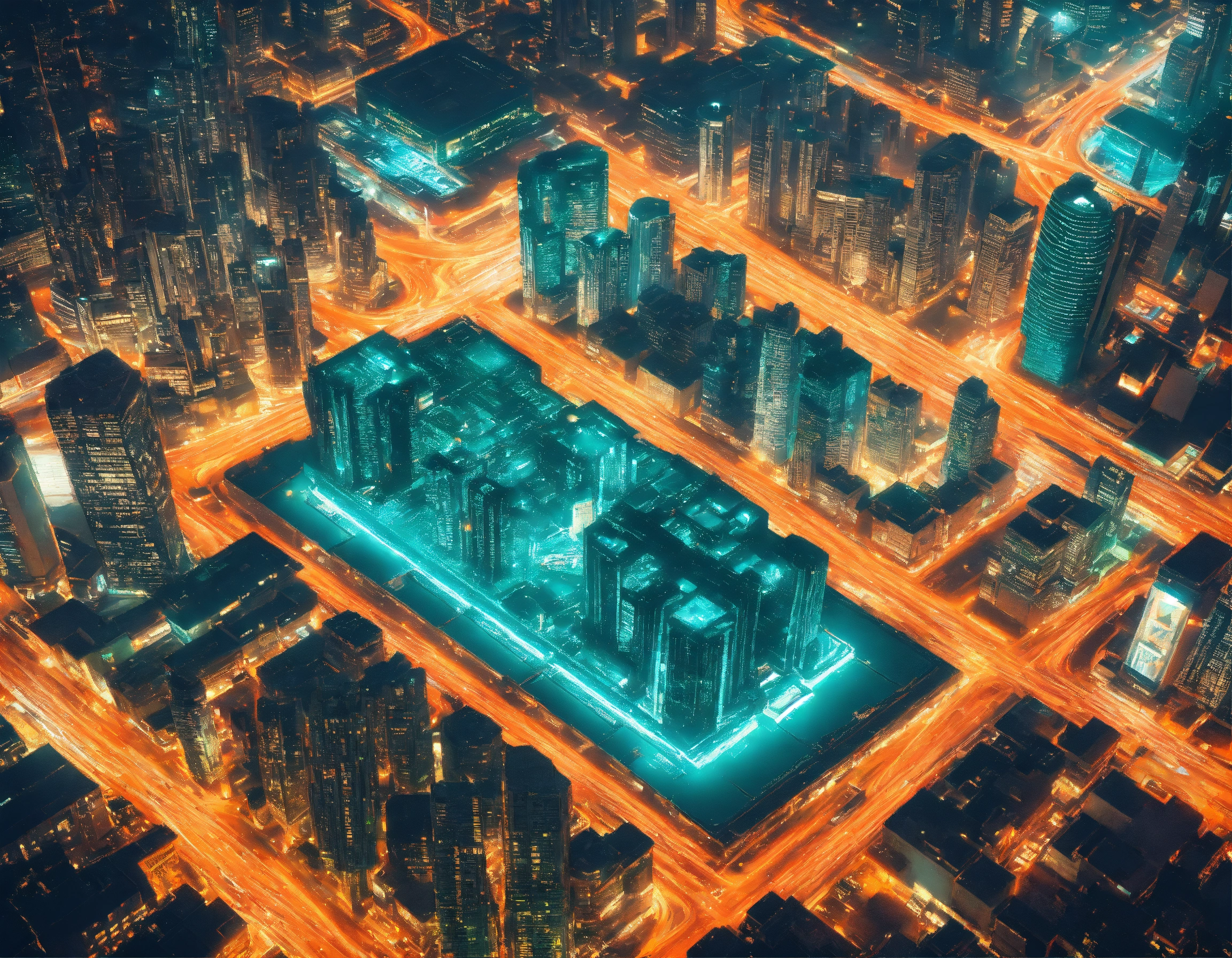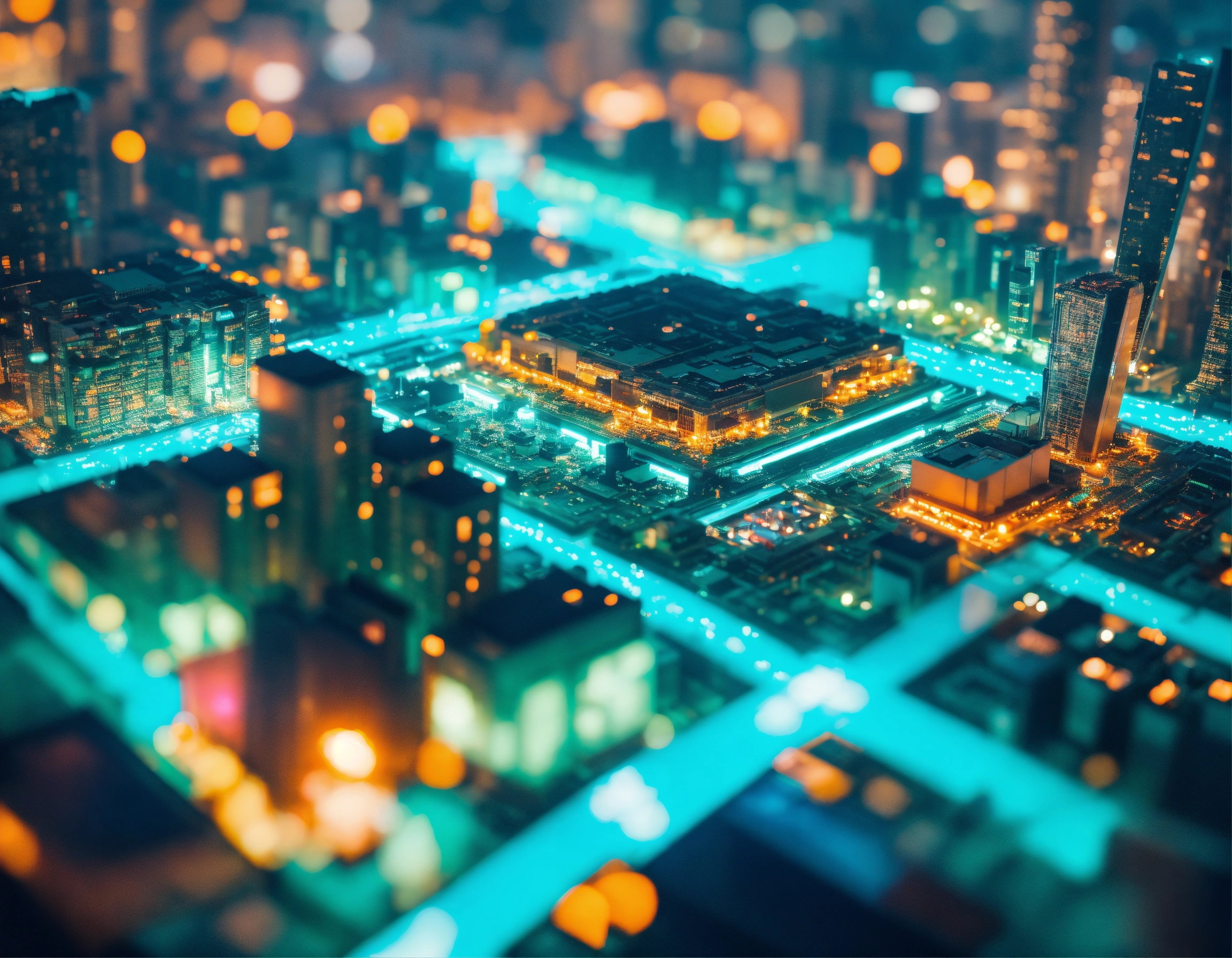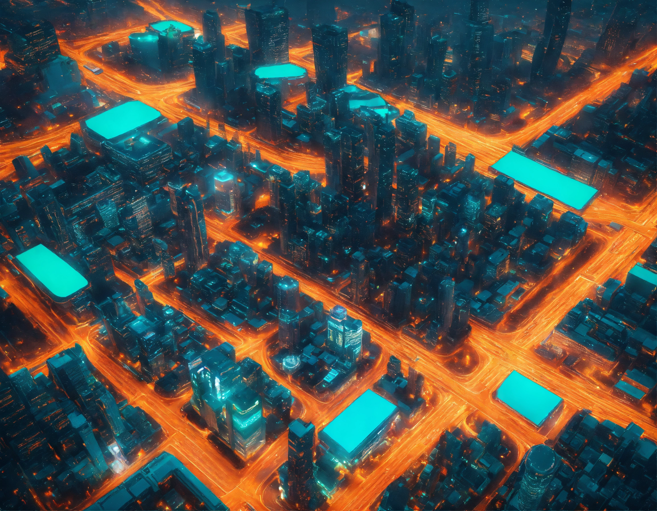 Ultra realistic straight down view of a computer motherboard from movie hackers looking like a teal colored megapolis downtown, streets lit with orange street light