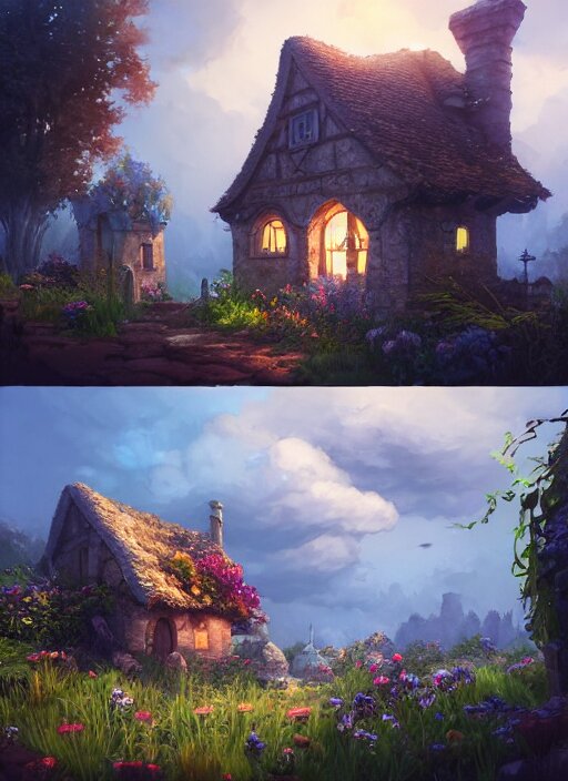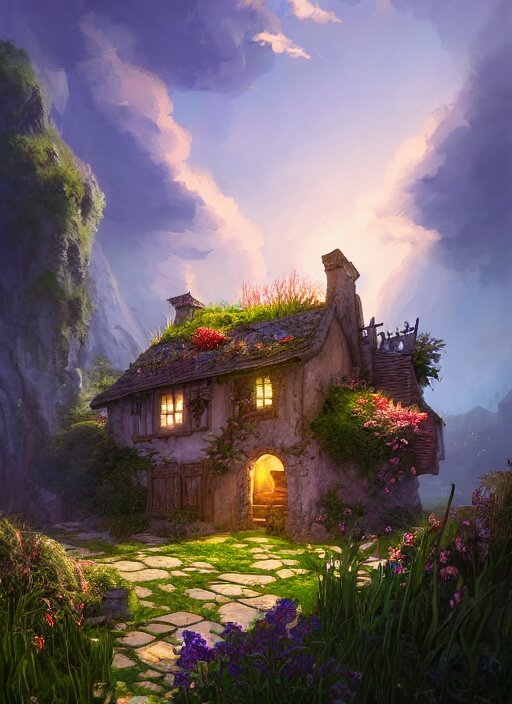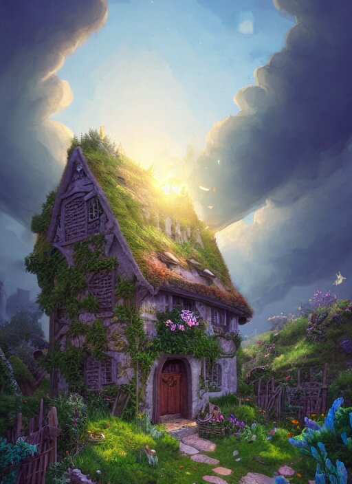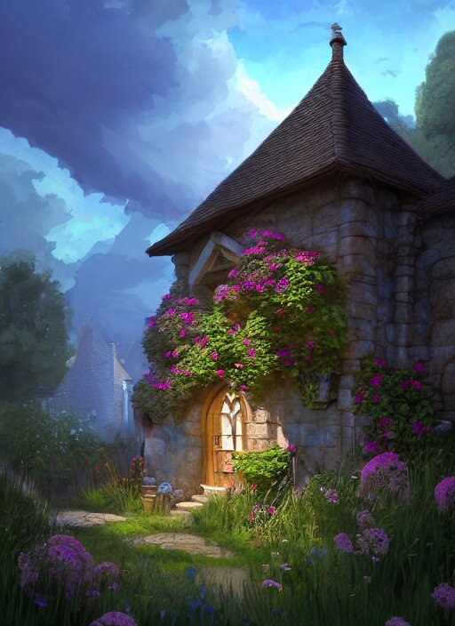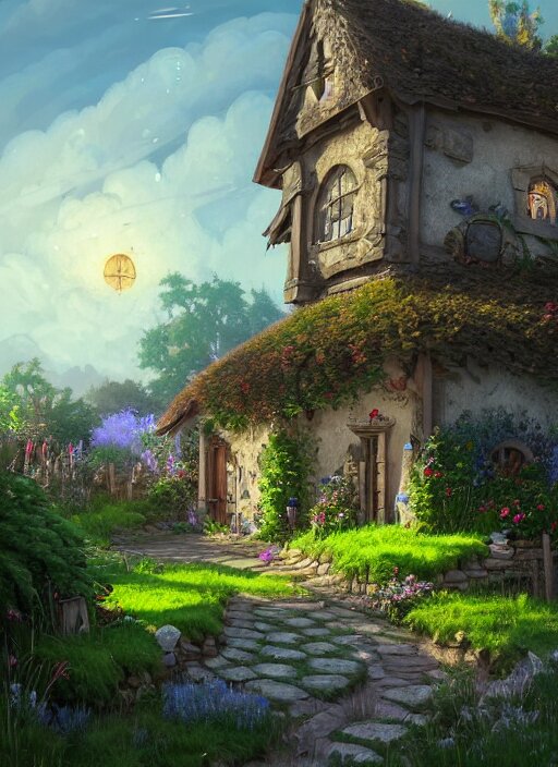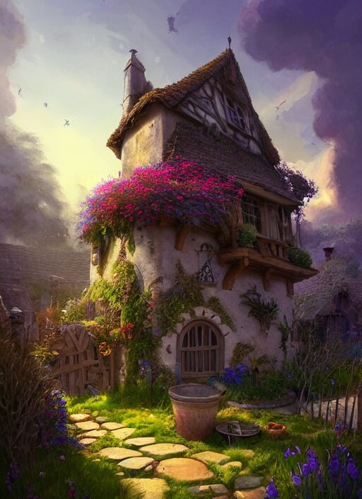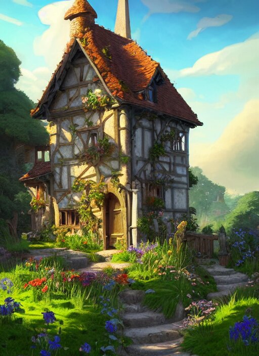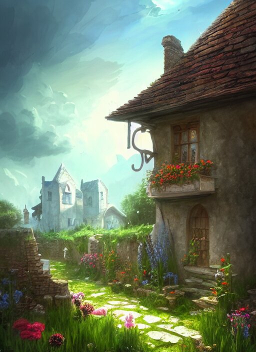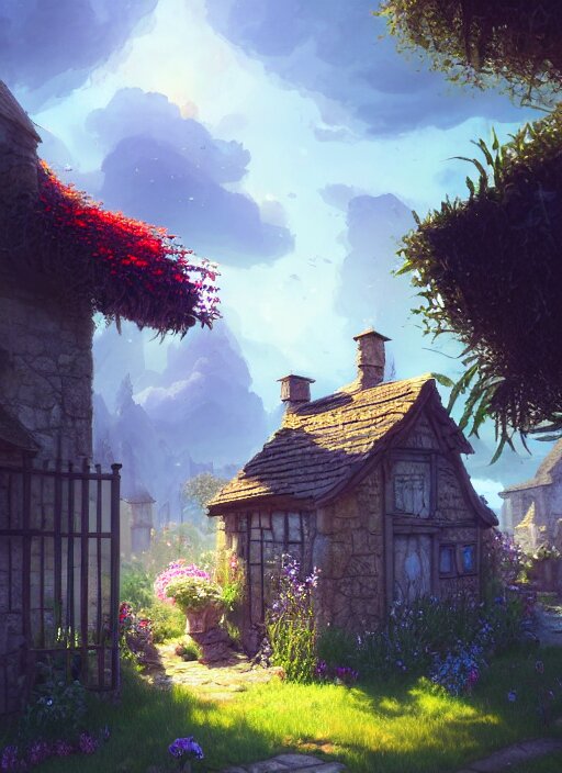 An illustration of the small medieval fantasy garden house in a town with many cute flower pots and beautiful blue sky scenery, cinematic view, epic sky, detailed, concept art, low angle, high detail, warm lighting, volumetric, godrays, vivid, beautiful, trending on artstation, by jordan grimmer, huge scene, grass, art greg rutkowski