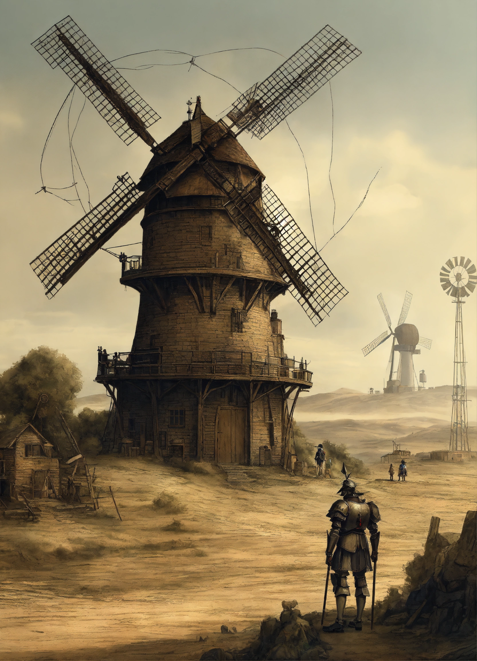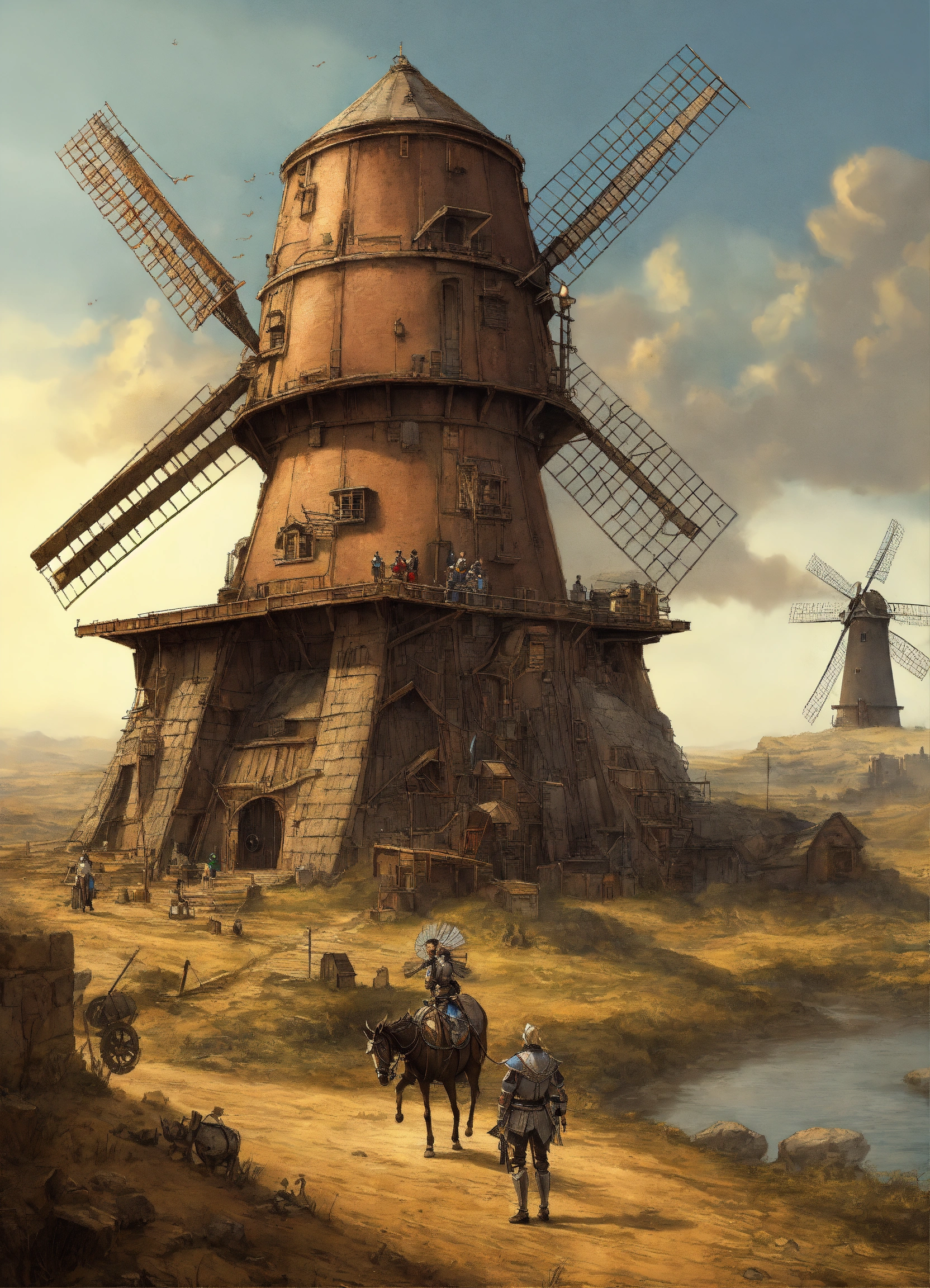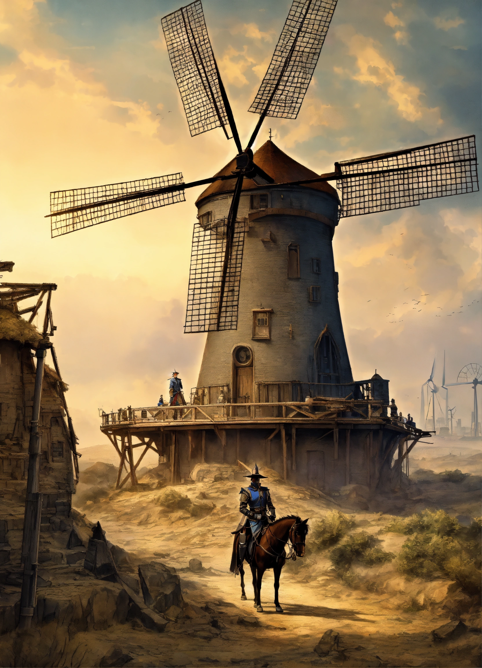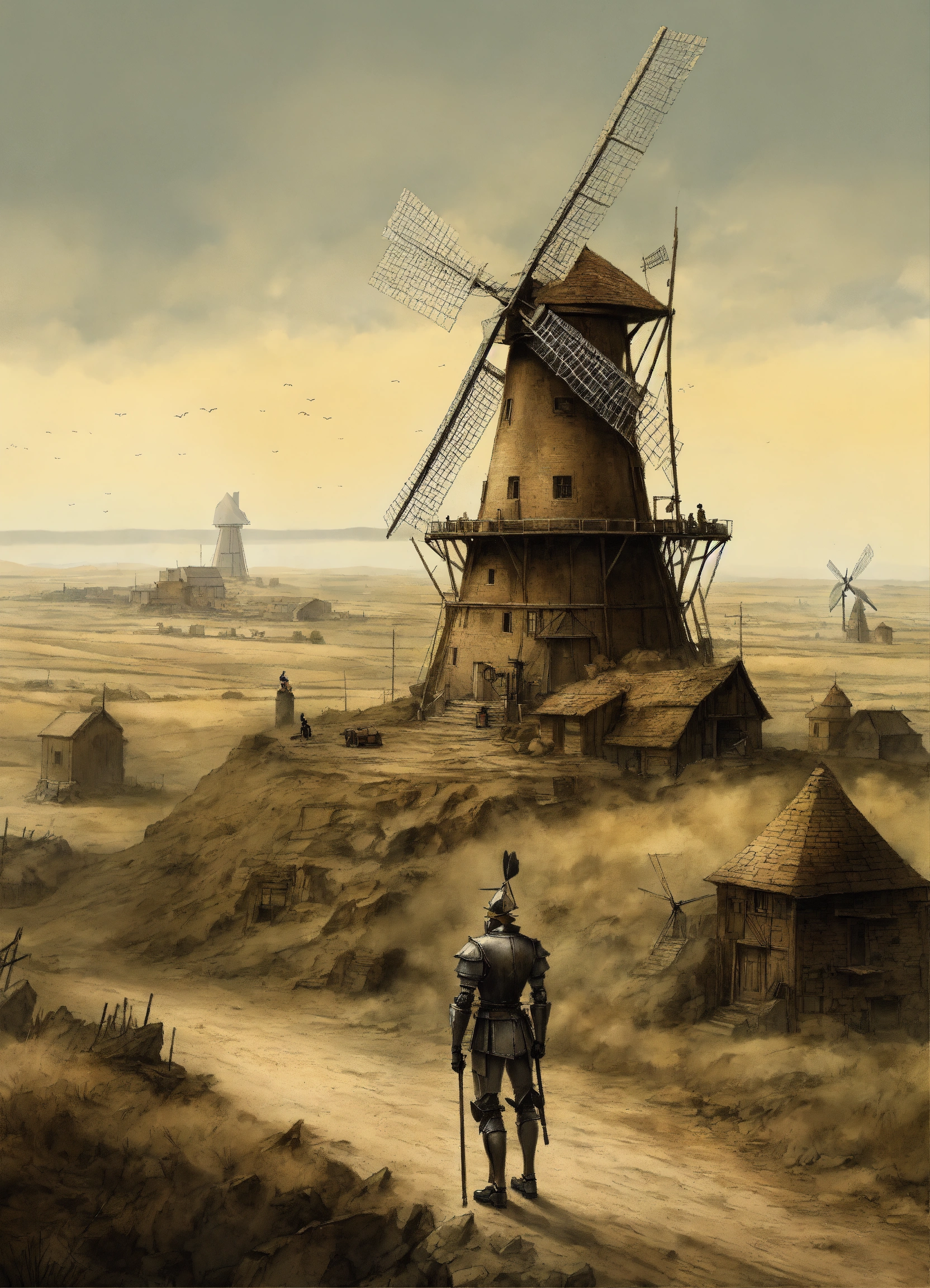 *a don quijote is standing next to an old robot futuristic windmill, in the style of detailed fantasy art, by gustave doré, pencil draw, b/nhigh resolution, dusty piles, busy landscapes--s 50