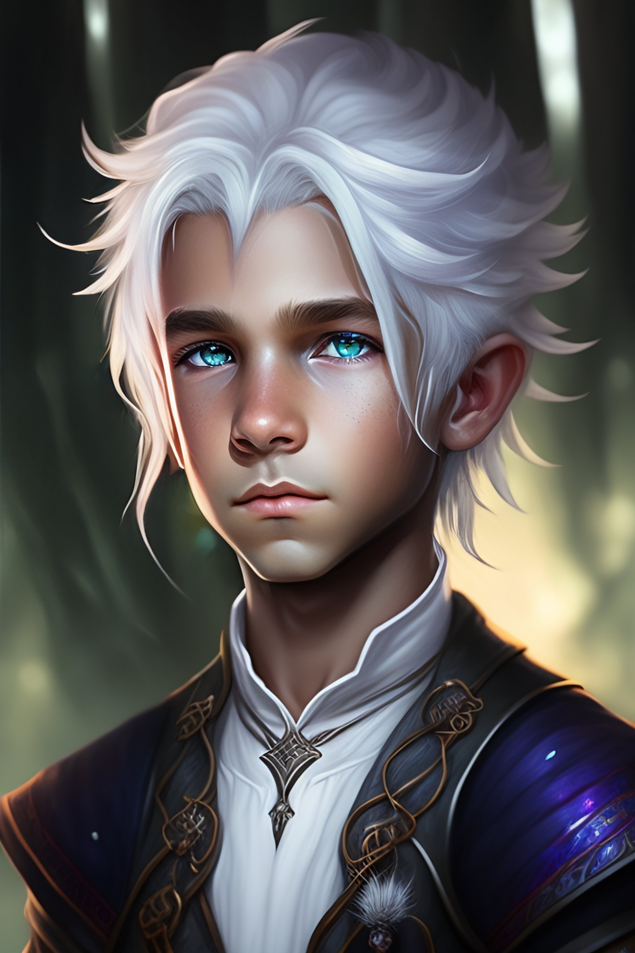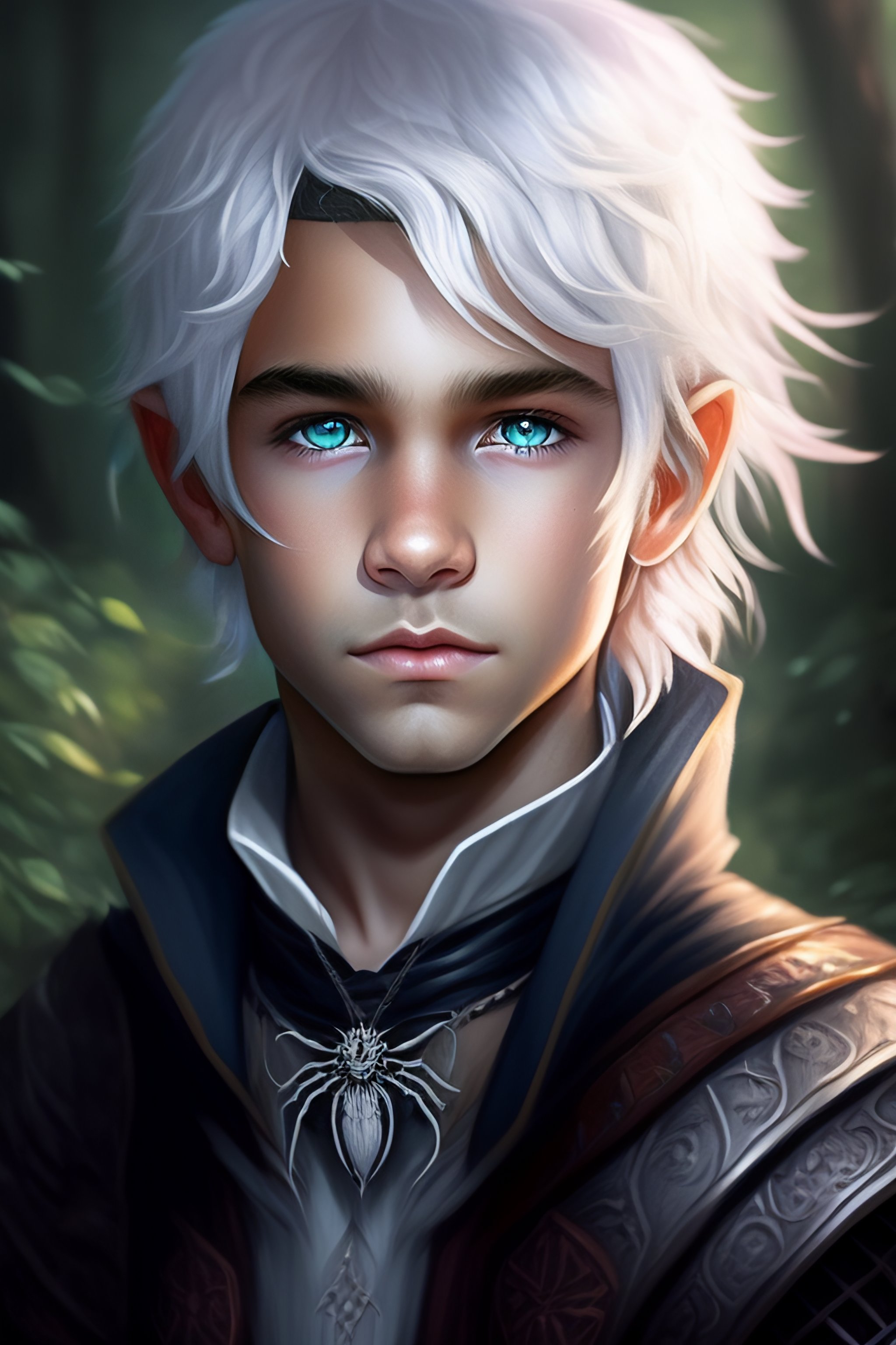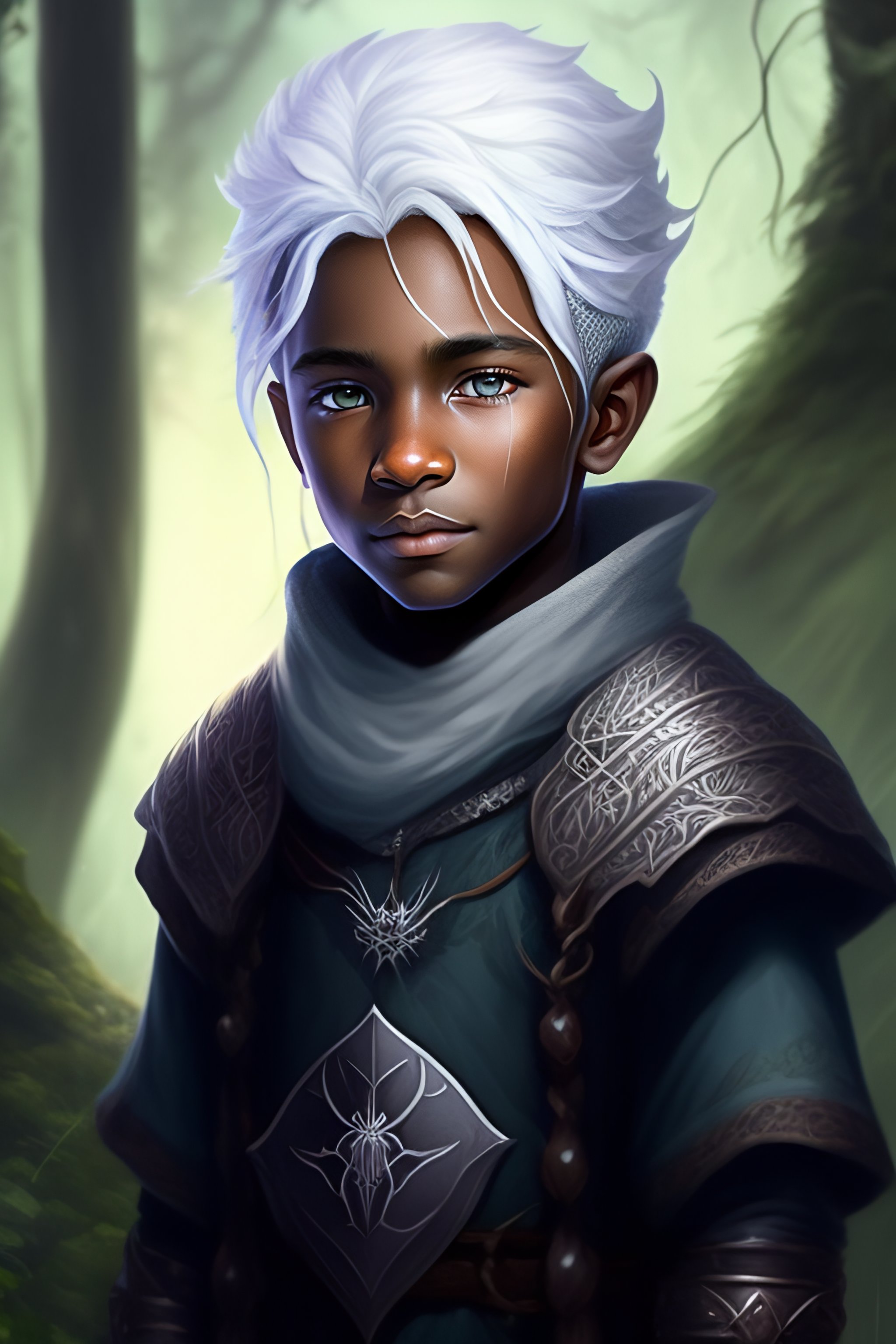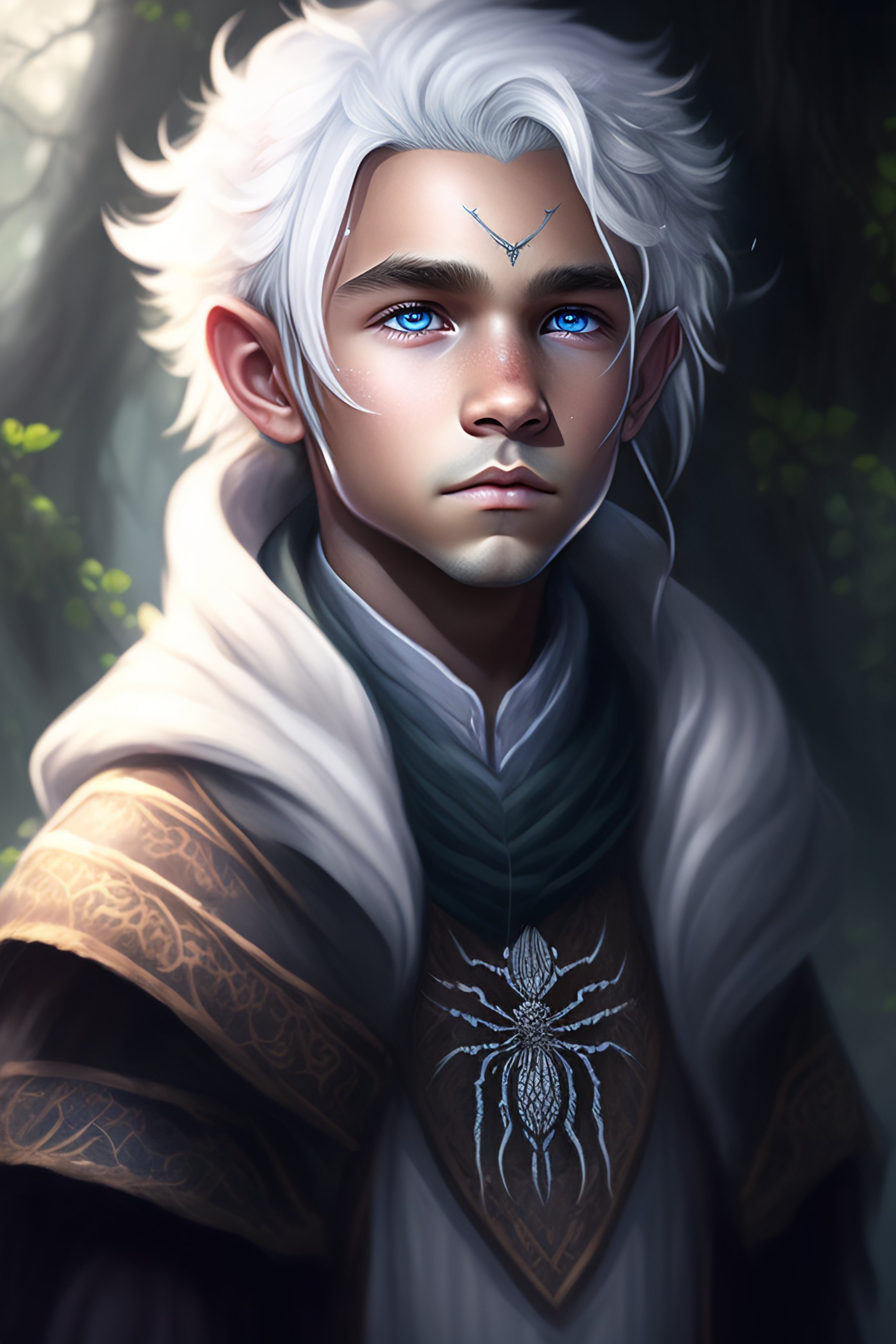 Dnd character art, young drow druid boy, spider themed, portrait, white hair, spiders, grey skin, child, spider webs, spider on his head