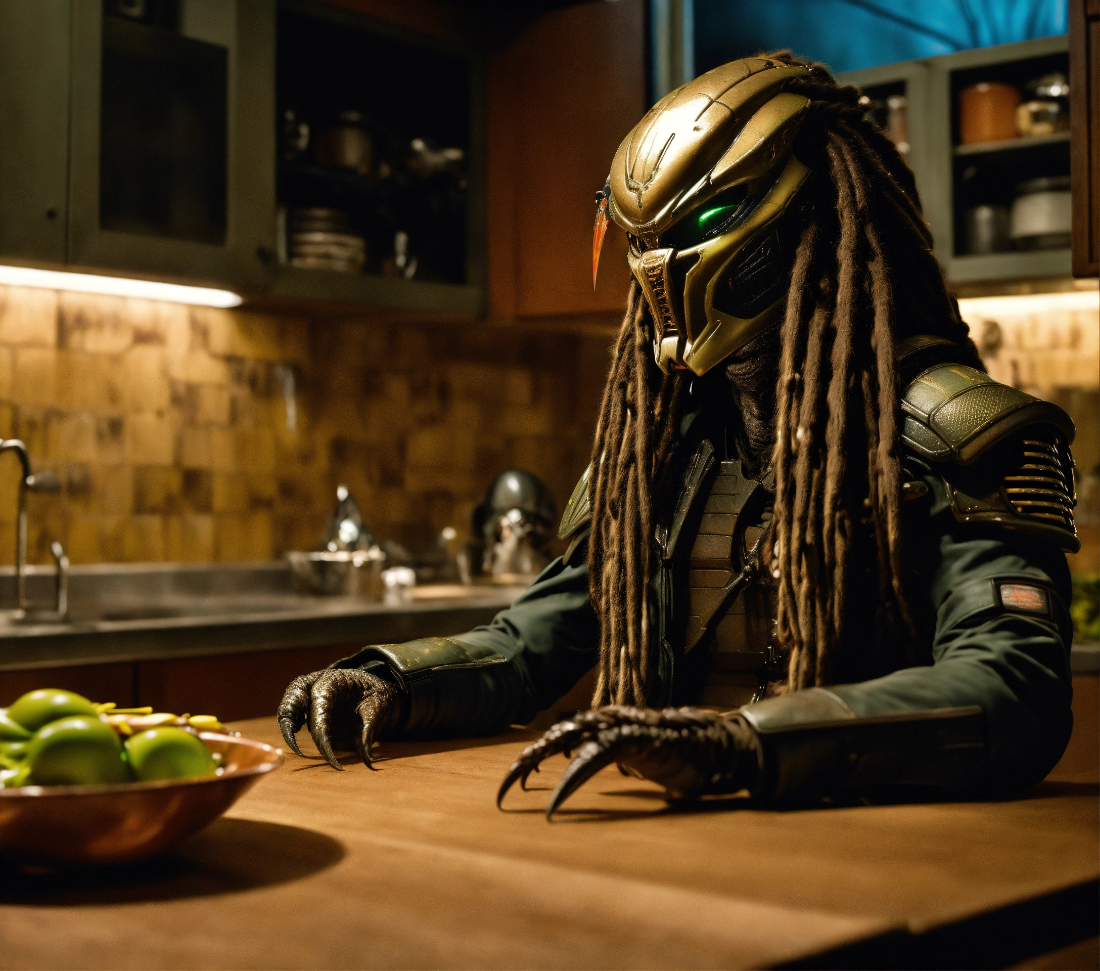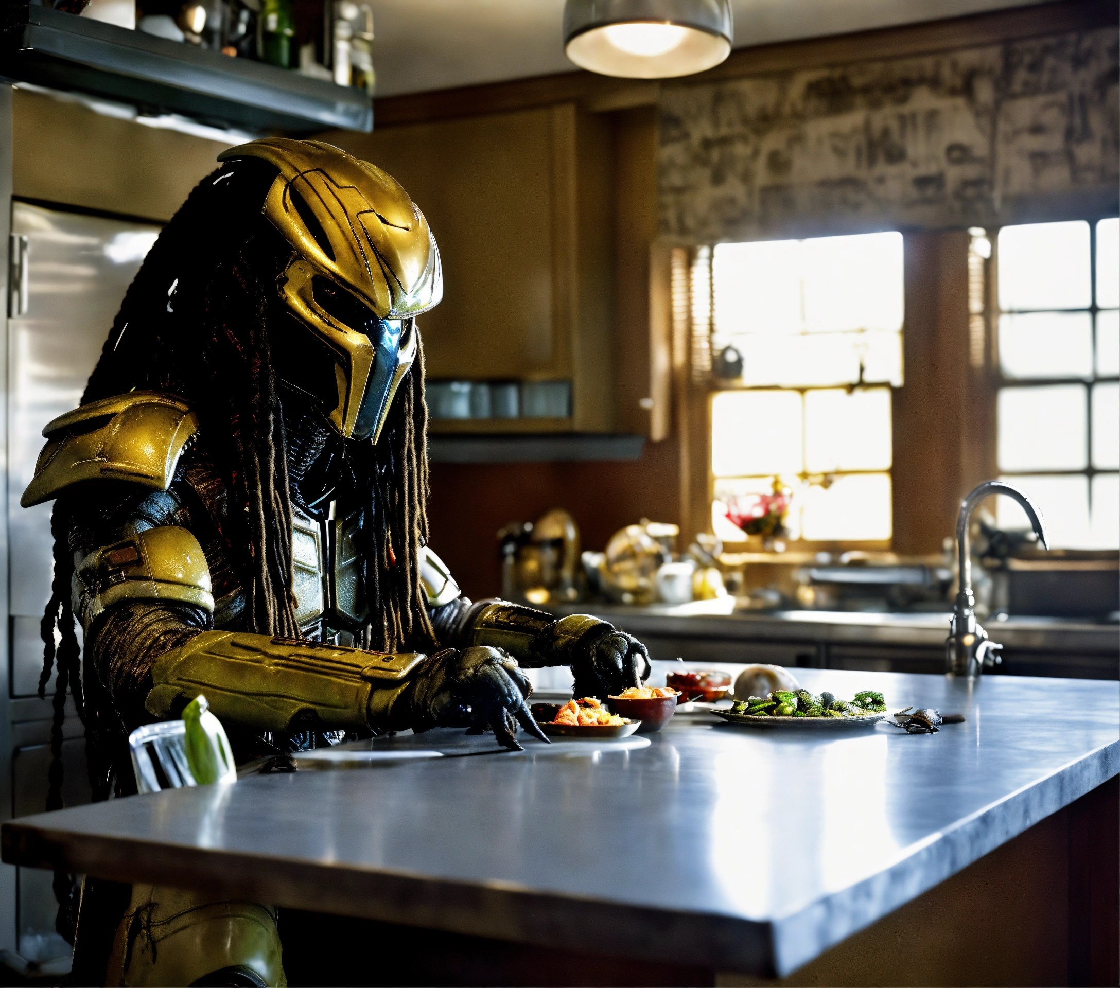 In a tense, awkward moment, ((chris hansen, host of "to catch a predator, ") sits across from the eponymous alien hunter from the predator films, in a kitchen.) chris questions the unmasked predator, also known as a "yatjua." (chris is in a suit.) (the predator is unmasked), in its classic alien hunting gear, ((without its helmet), leaving (its strange ugly alien face, beady eyes, long dreadlocks, & mandibles exposed.)) the tension is palpable. the scene is captured in high-resolution 8khd, ensuring clear, sharply defined expressions. anatomy is flawlessly rendered, showing intricate details. lines are precise & clear, highlighting the golden ratio, contributing to a well-drawn, stylized composition. lighting casts long shadows, for eerie ambiance. ((the predator’s expression reflects fear & unease), while (chris maintains a stern, focused expression).) the atmosphere is tense. (ensure that (both chris & the predator are within the image).)
