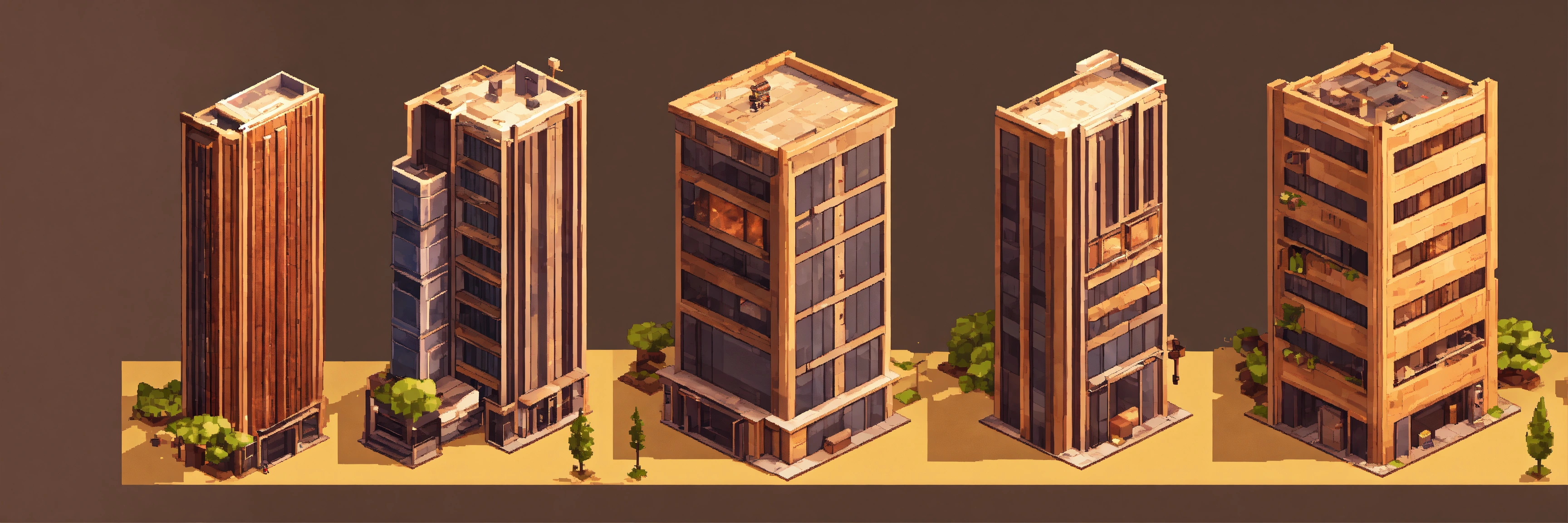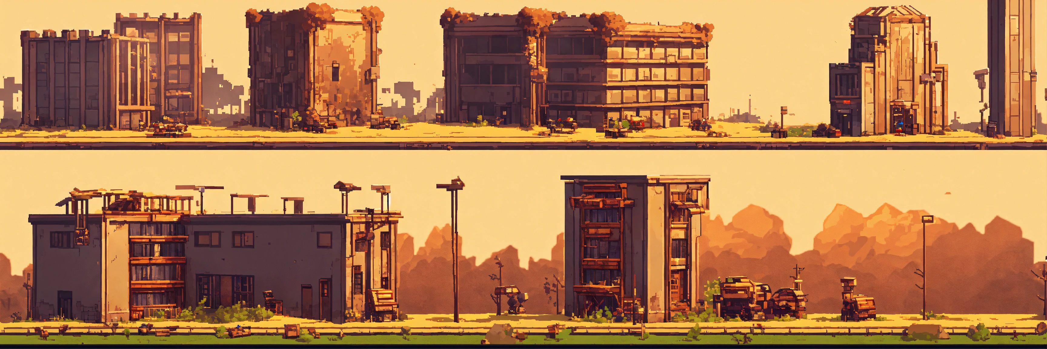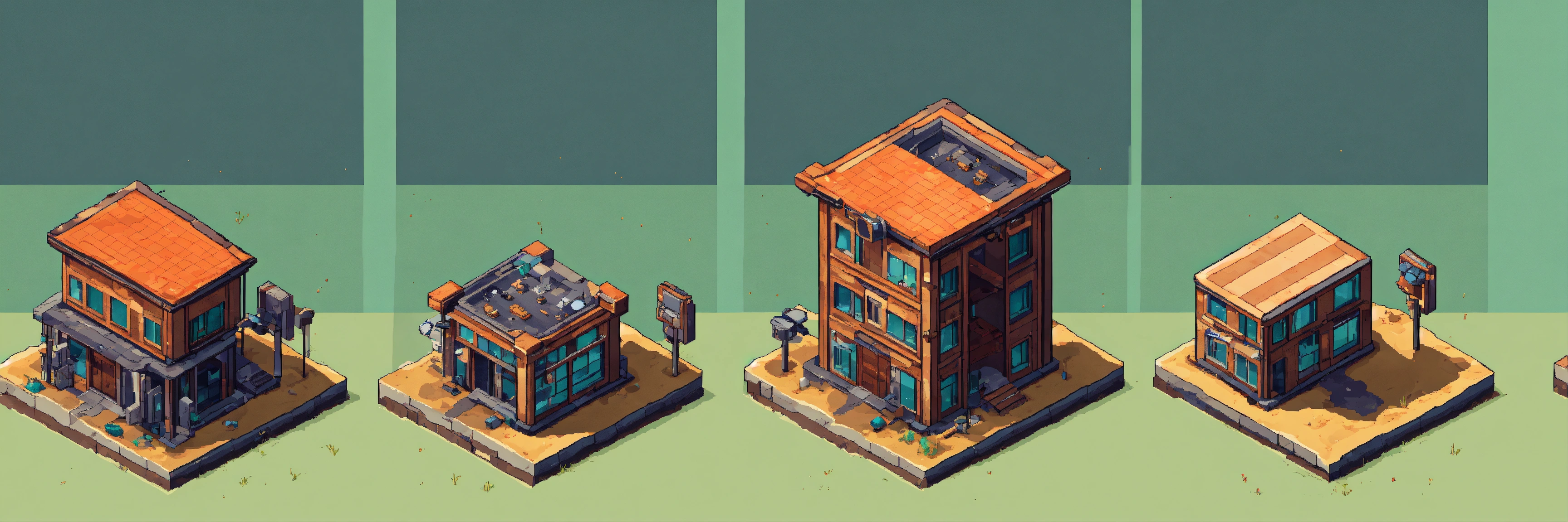 Isometric. short to tall upgrade evolution progression of a post-apocalyptic single defense building after apocalypse. isolated, plain background. top down isometric mobile game extremely simplistic pixel art. low res blocky.