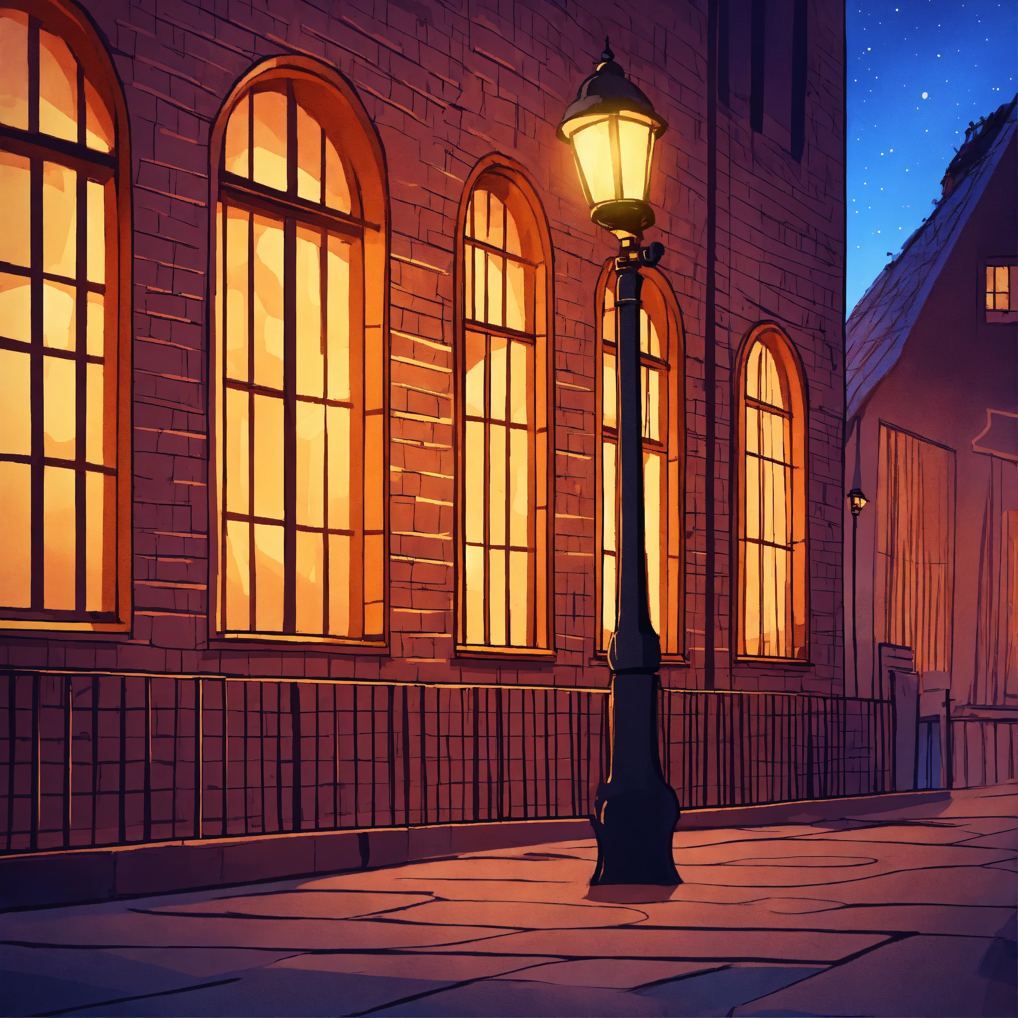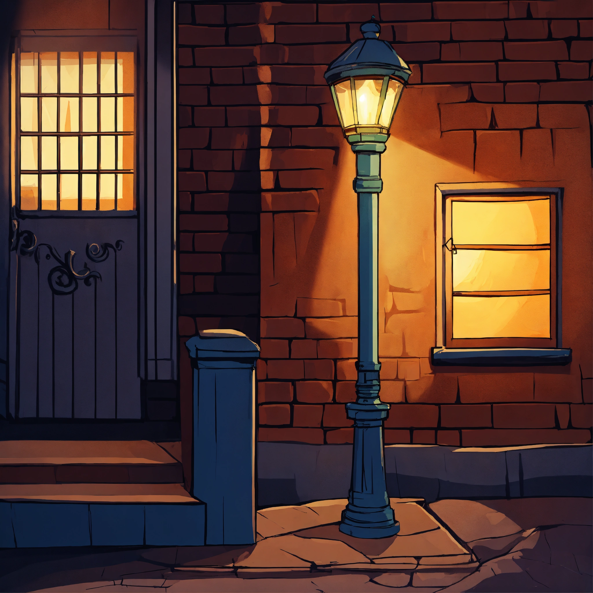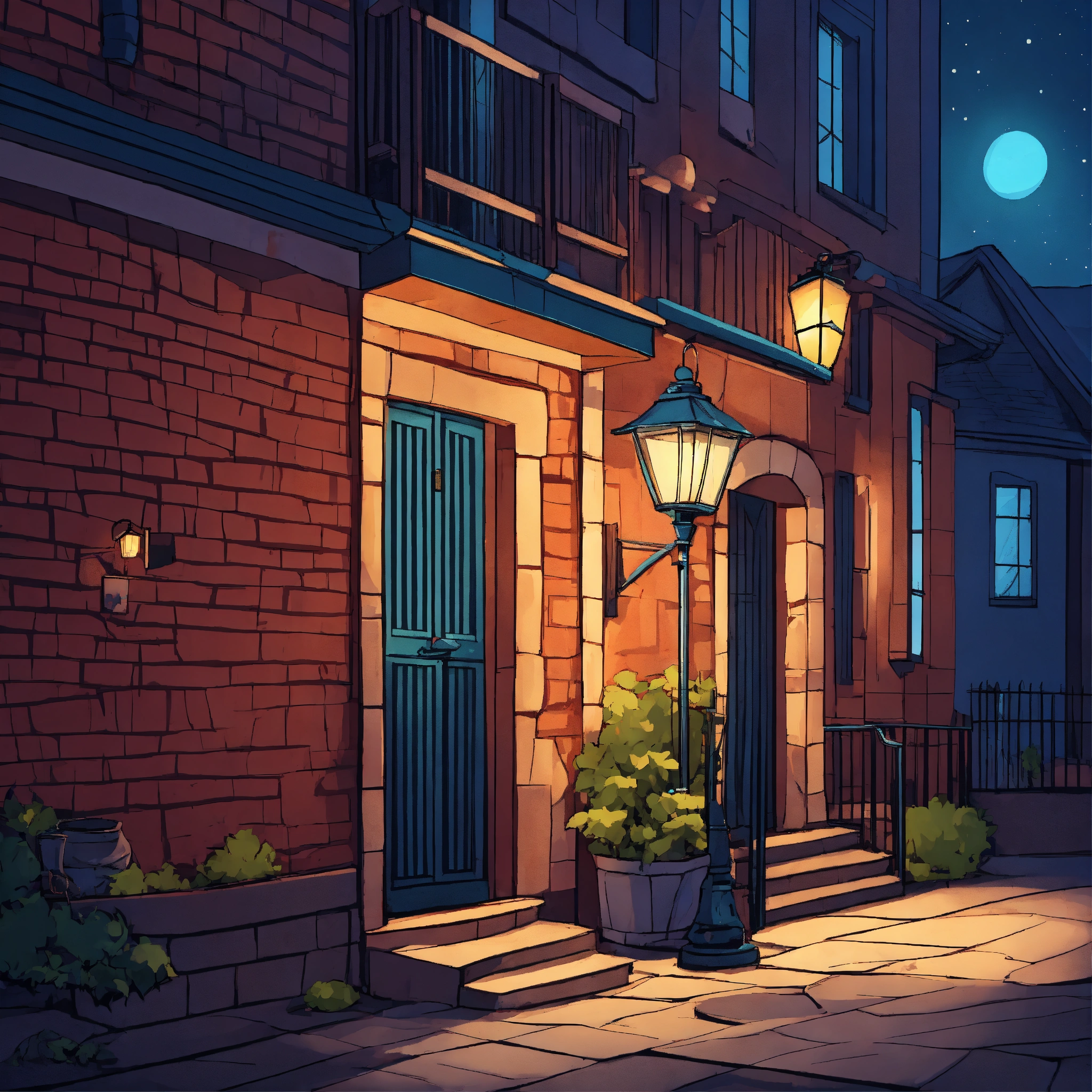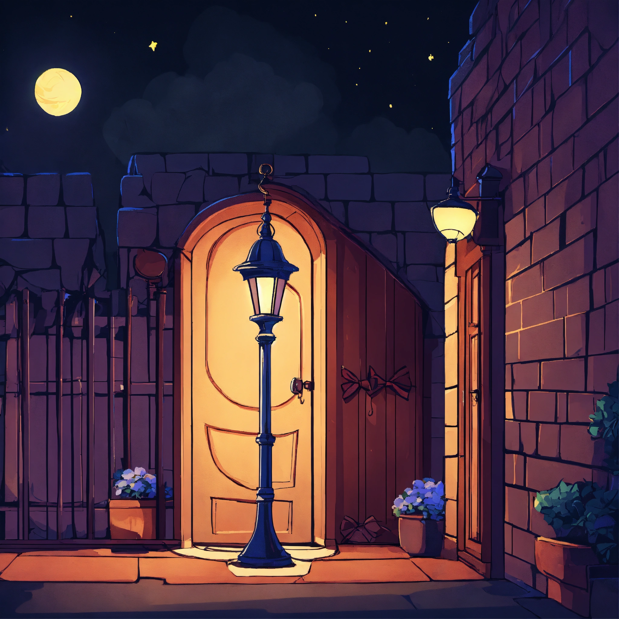 Mur avec du lière sous un lampadaire de nuit cartoon style