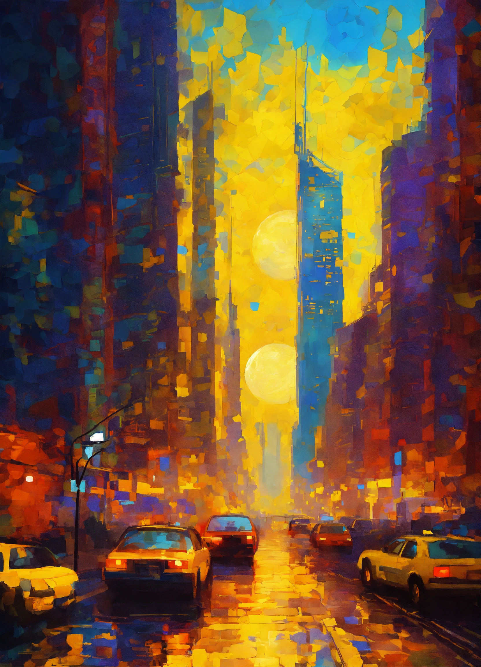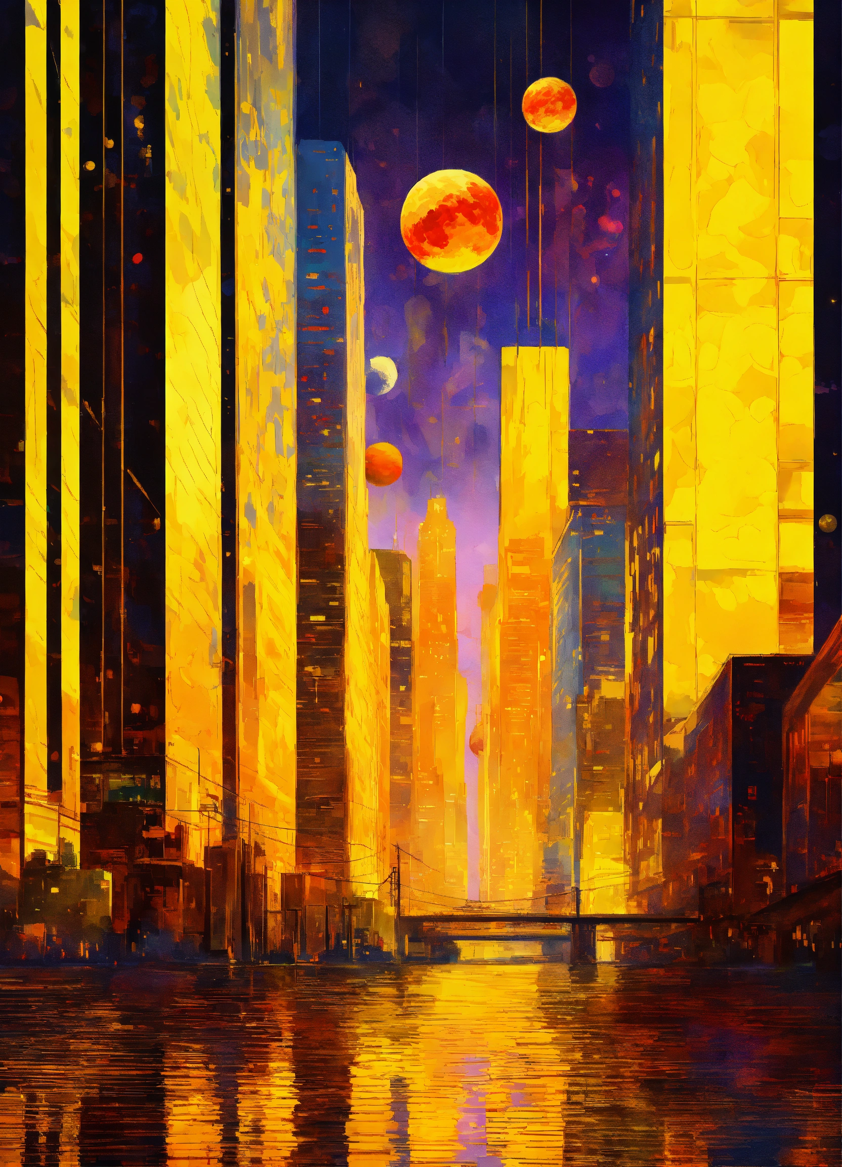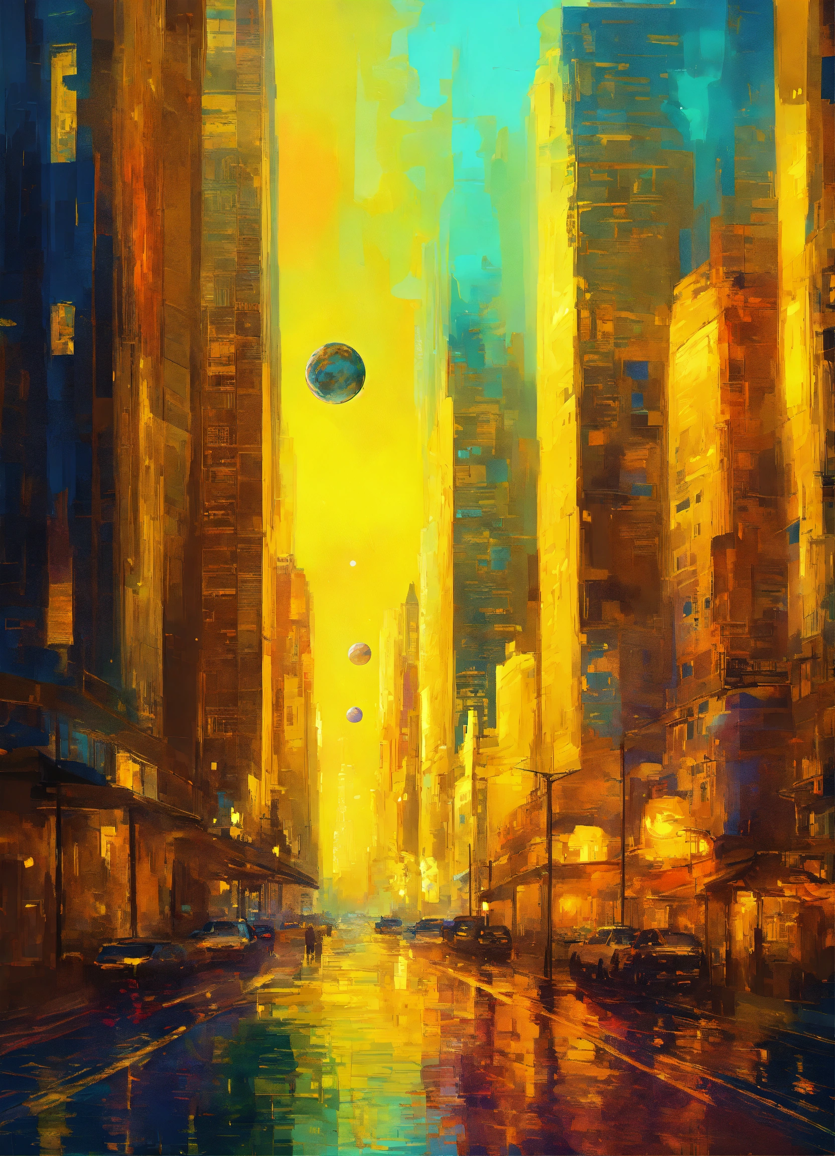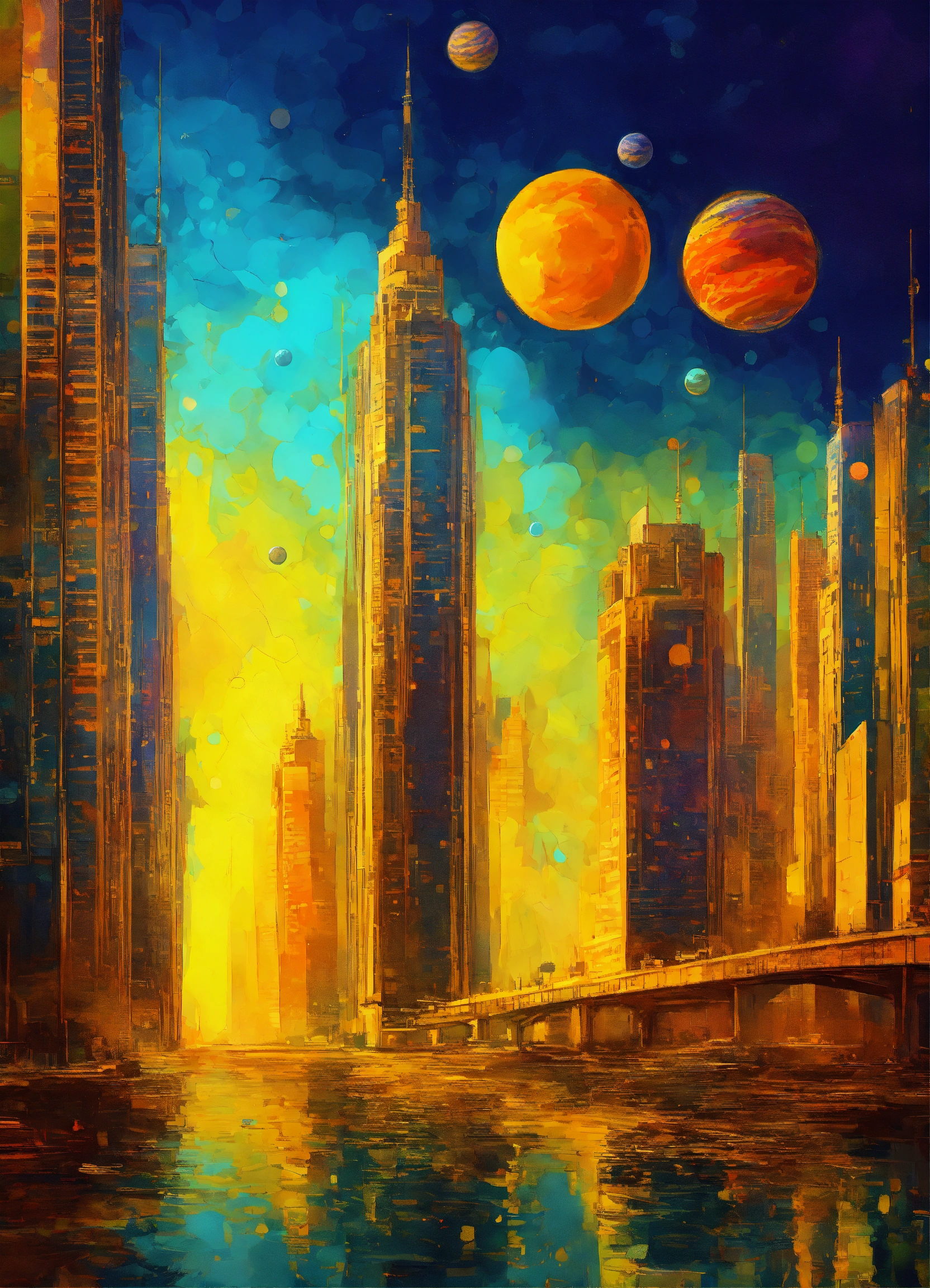 Skyscrapers in the style of impressionism, digital art, planets, colors are vibrant yellows, mysterious, intricate details.