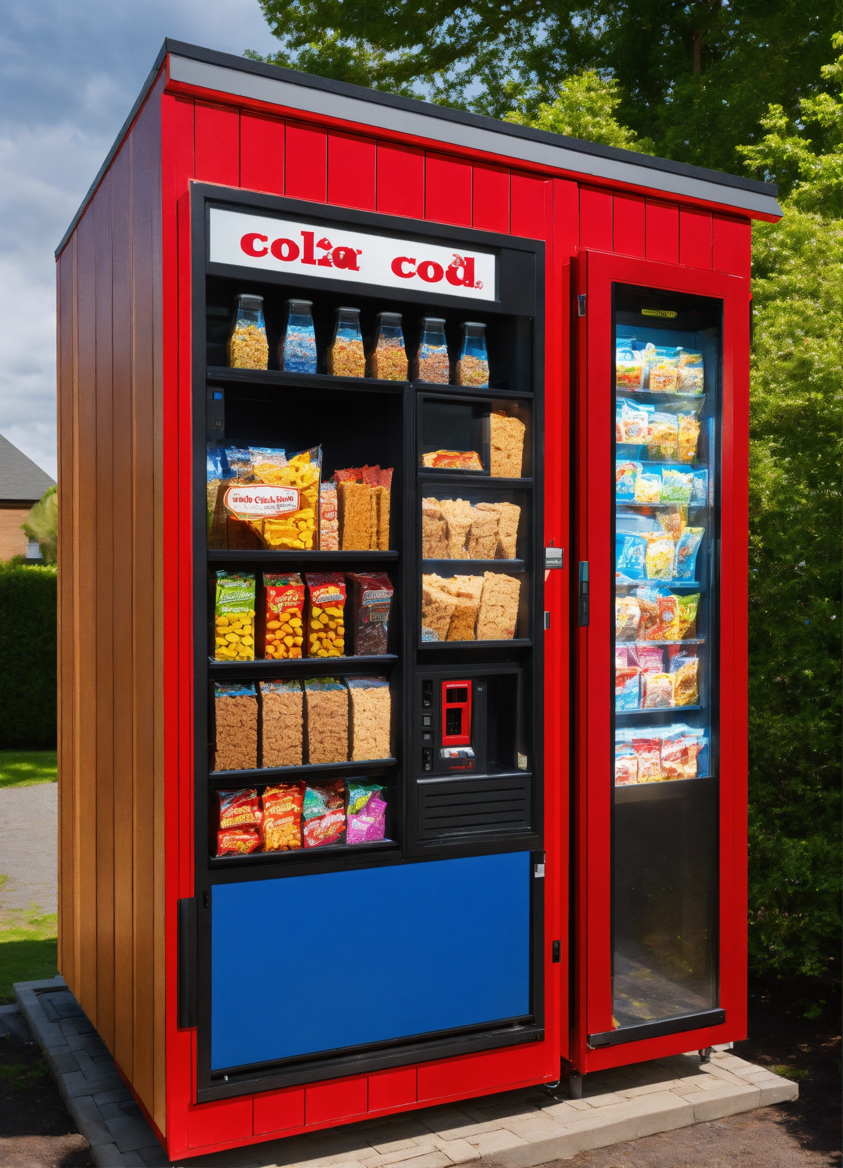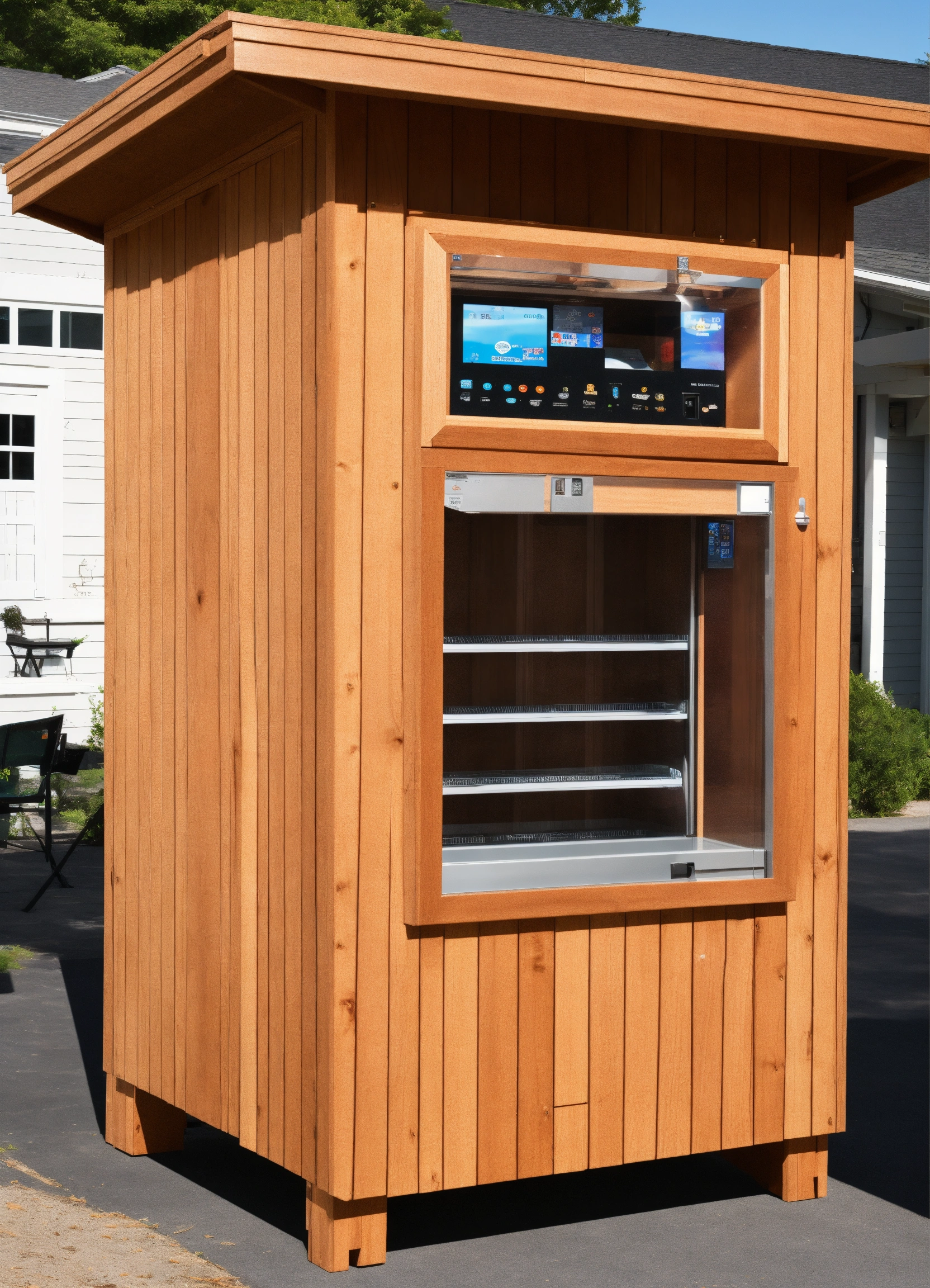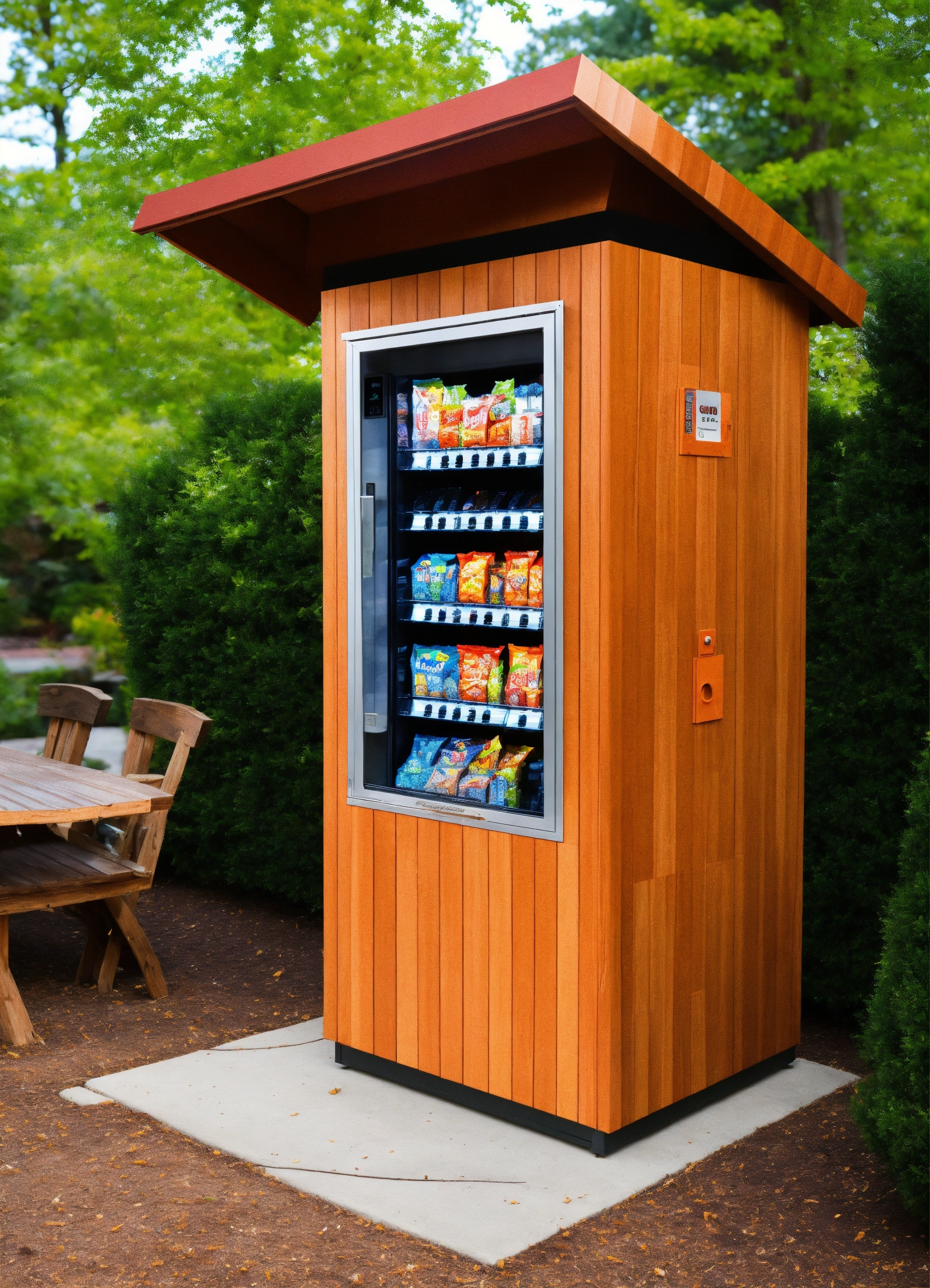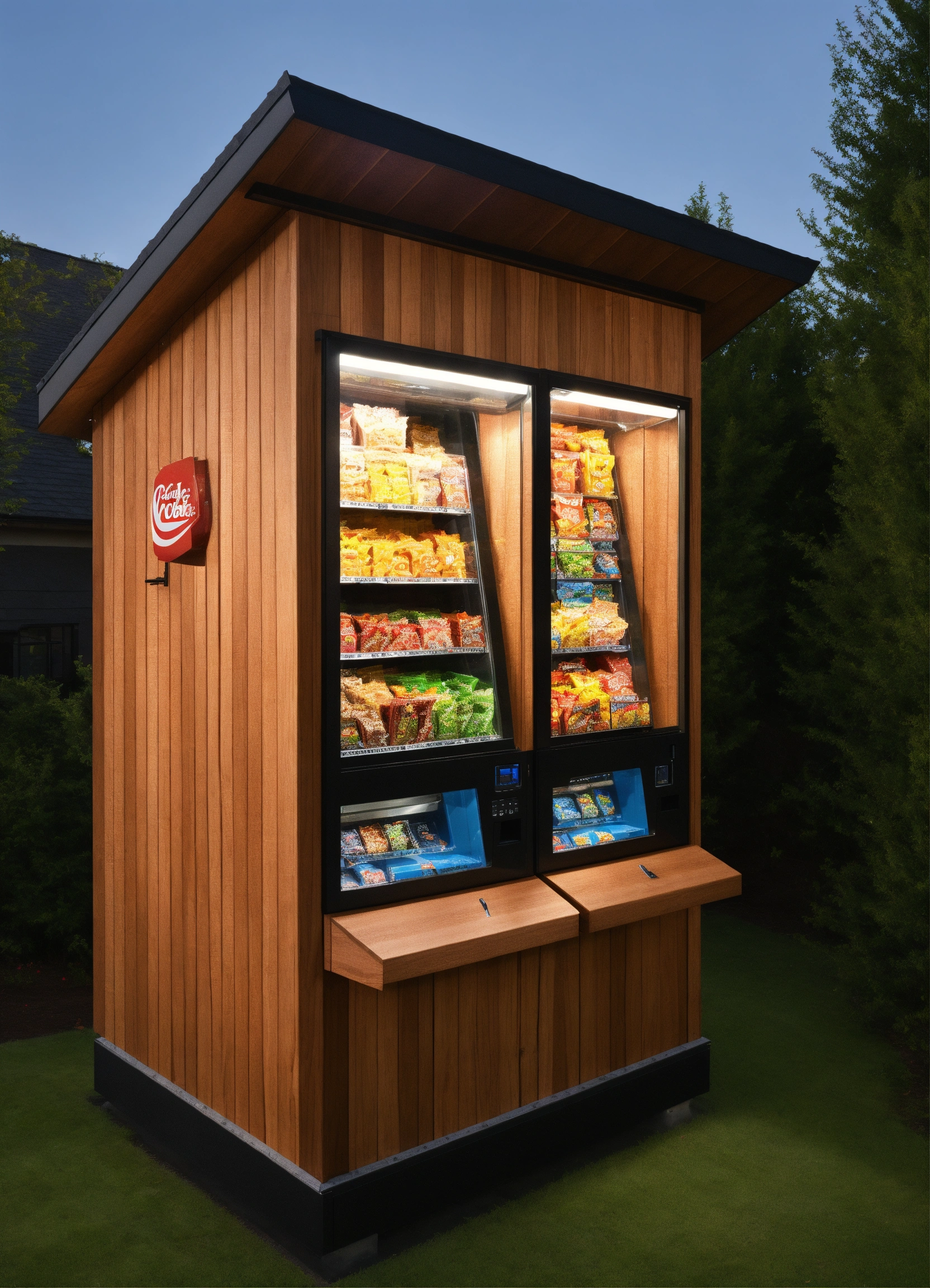 A red cedar shingle enclosure for one snack vending machine and one cold food vending machine with glass french doors and a flat slanted roof with