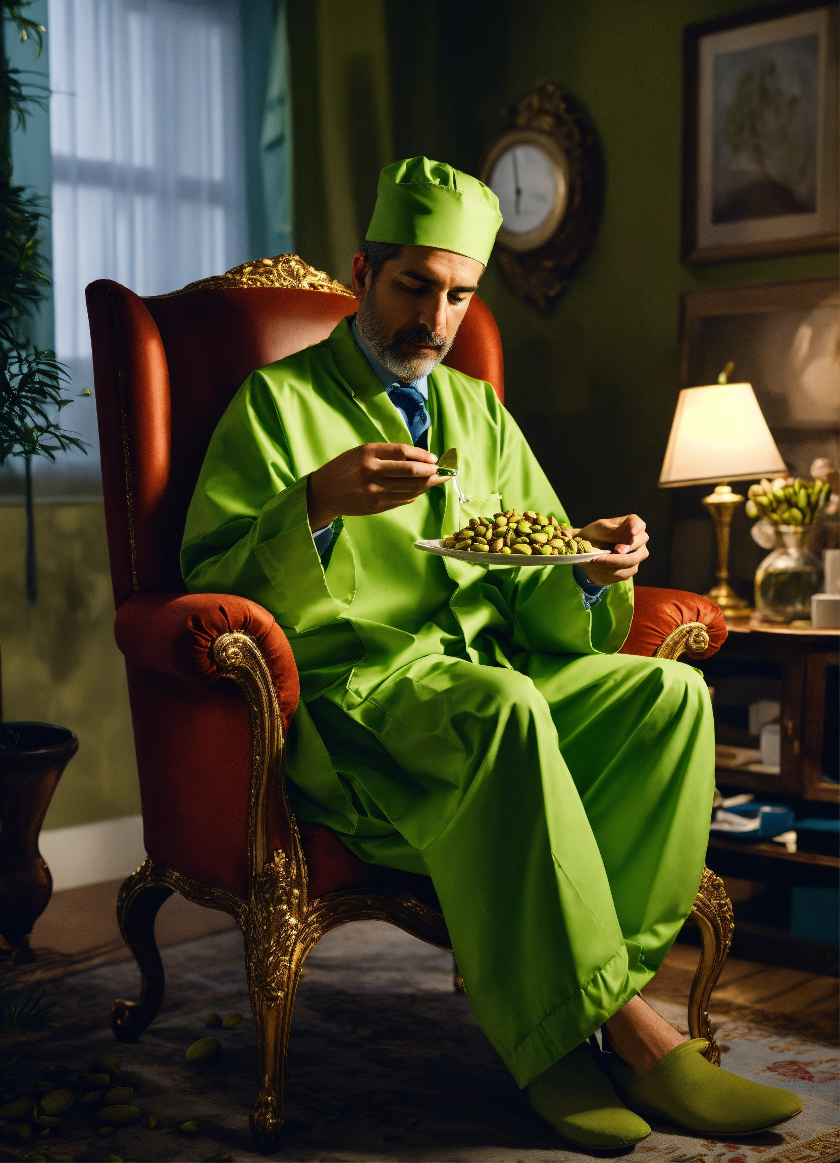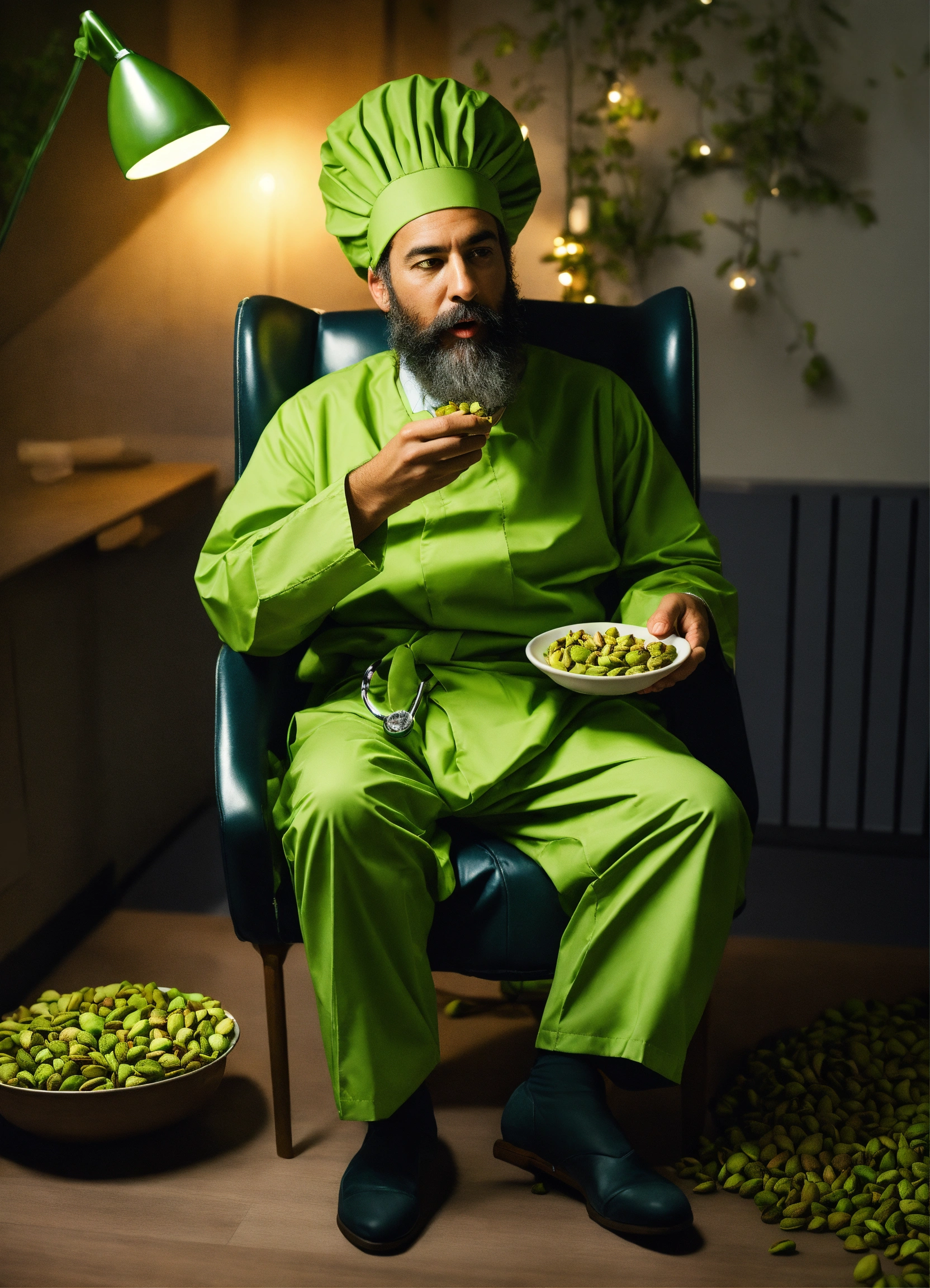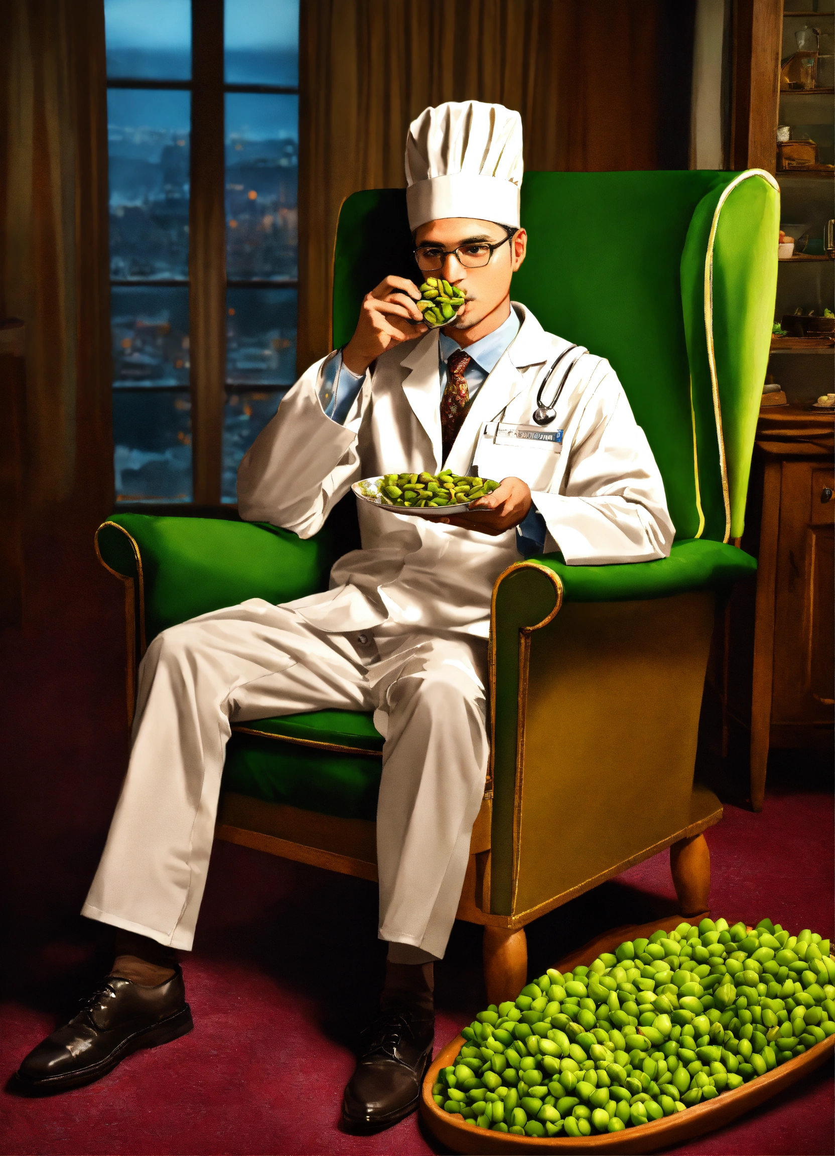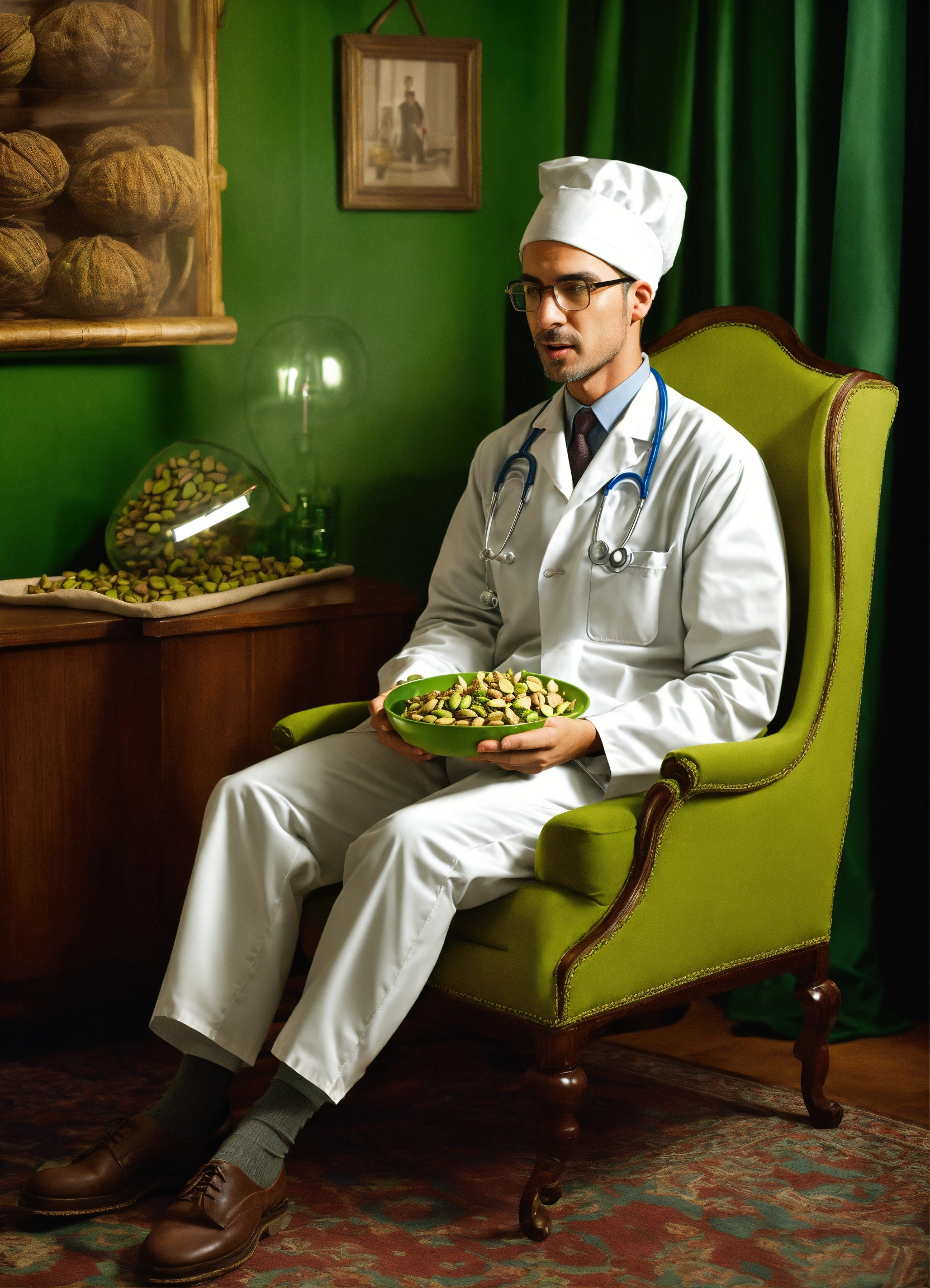 A photo realistic image of a doctor in a nightcap garment eating pistachios while sitting a pistachio shaped chair