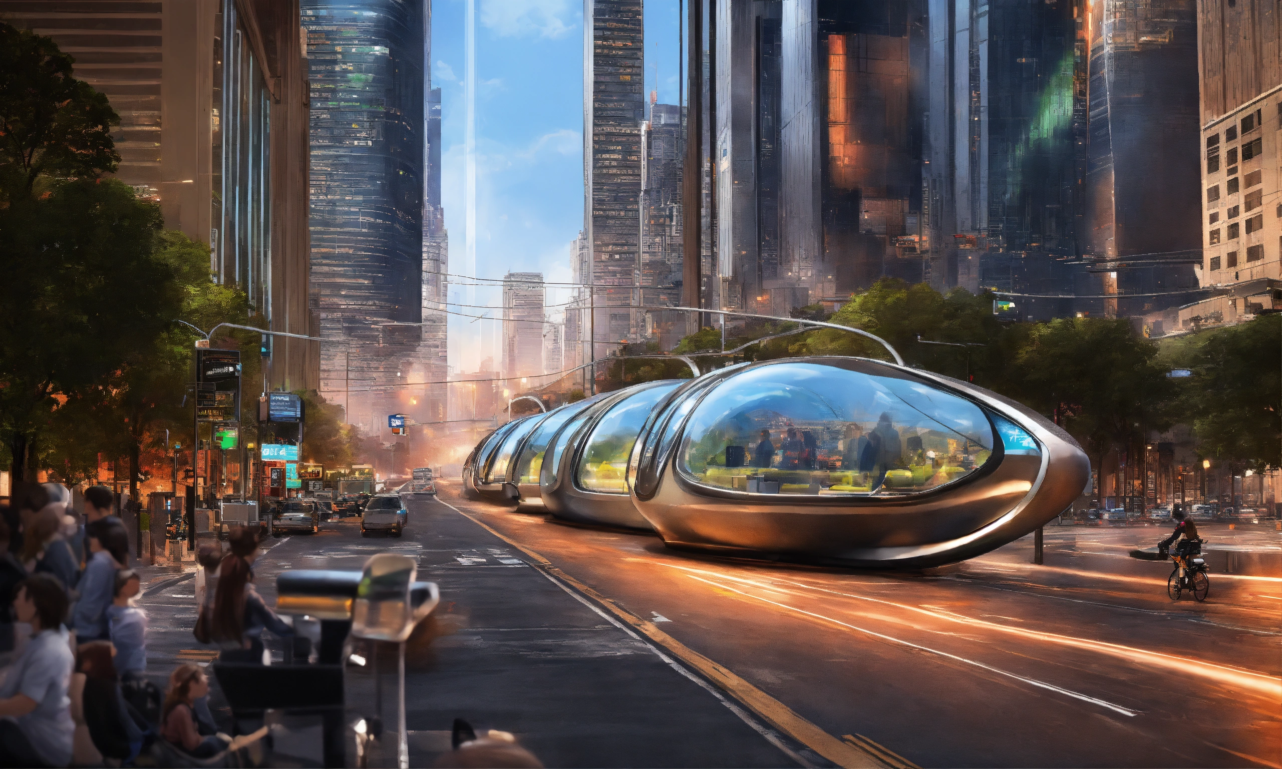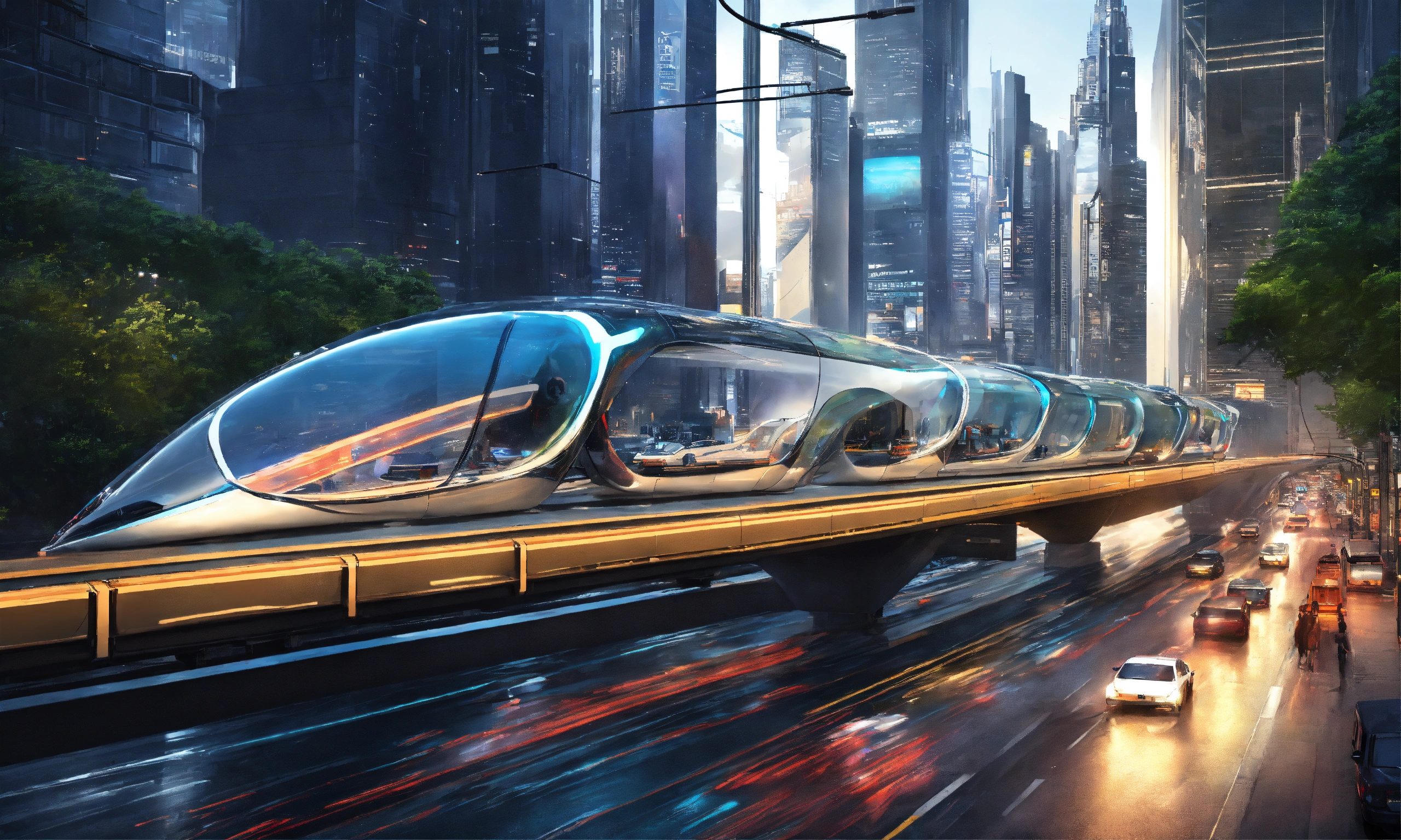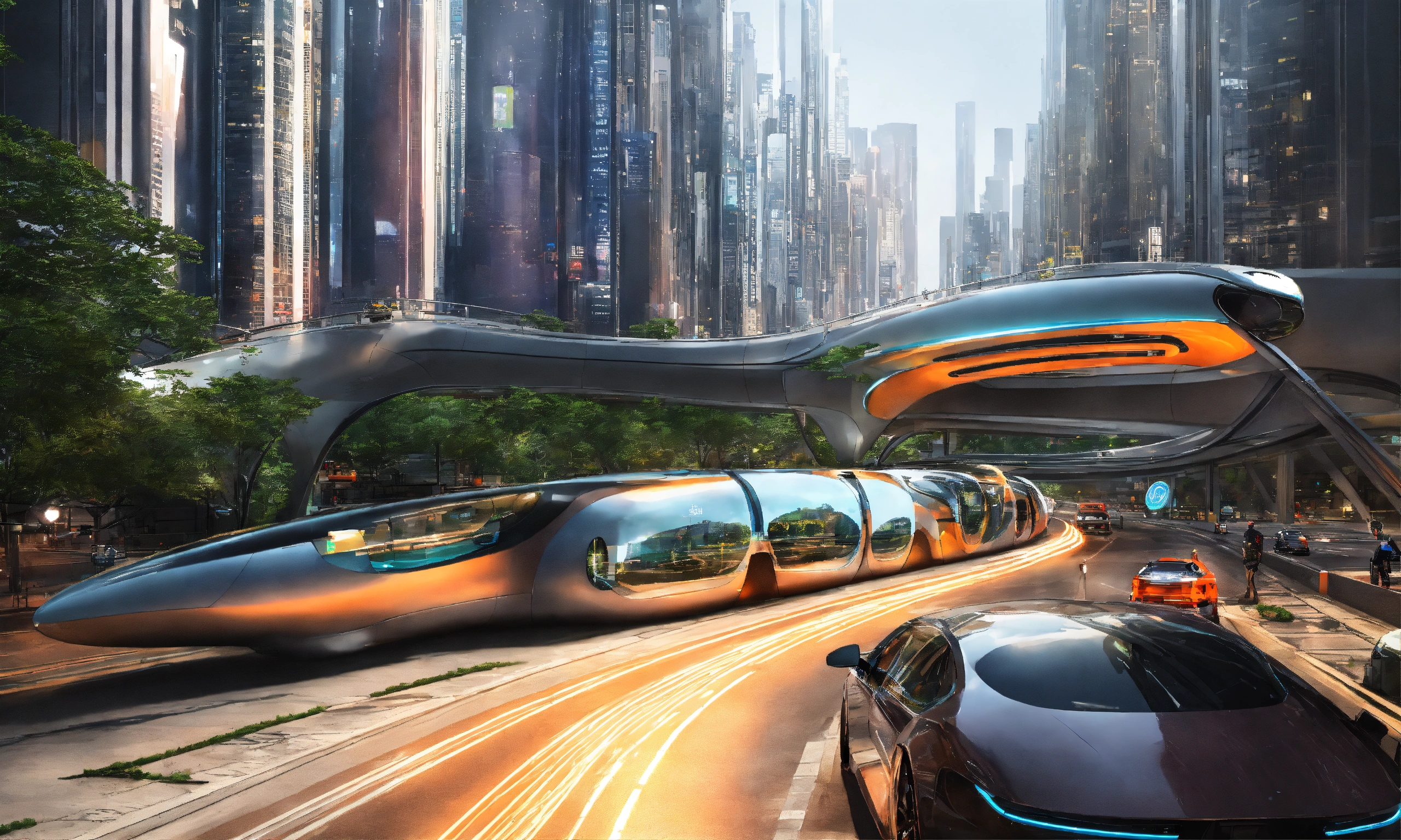 A futuristic transportation system using vacuum and magnet powered plexiglass tubing and personal sized transportation pods spanning city highways and streets traffic packed highway ultra complex