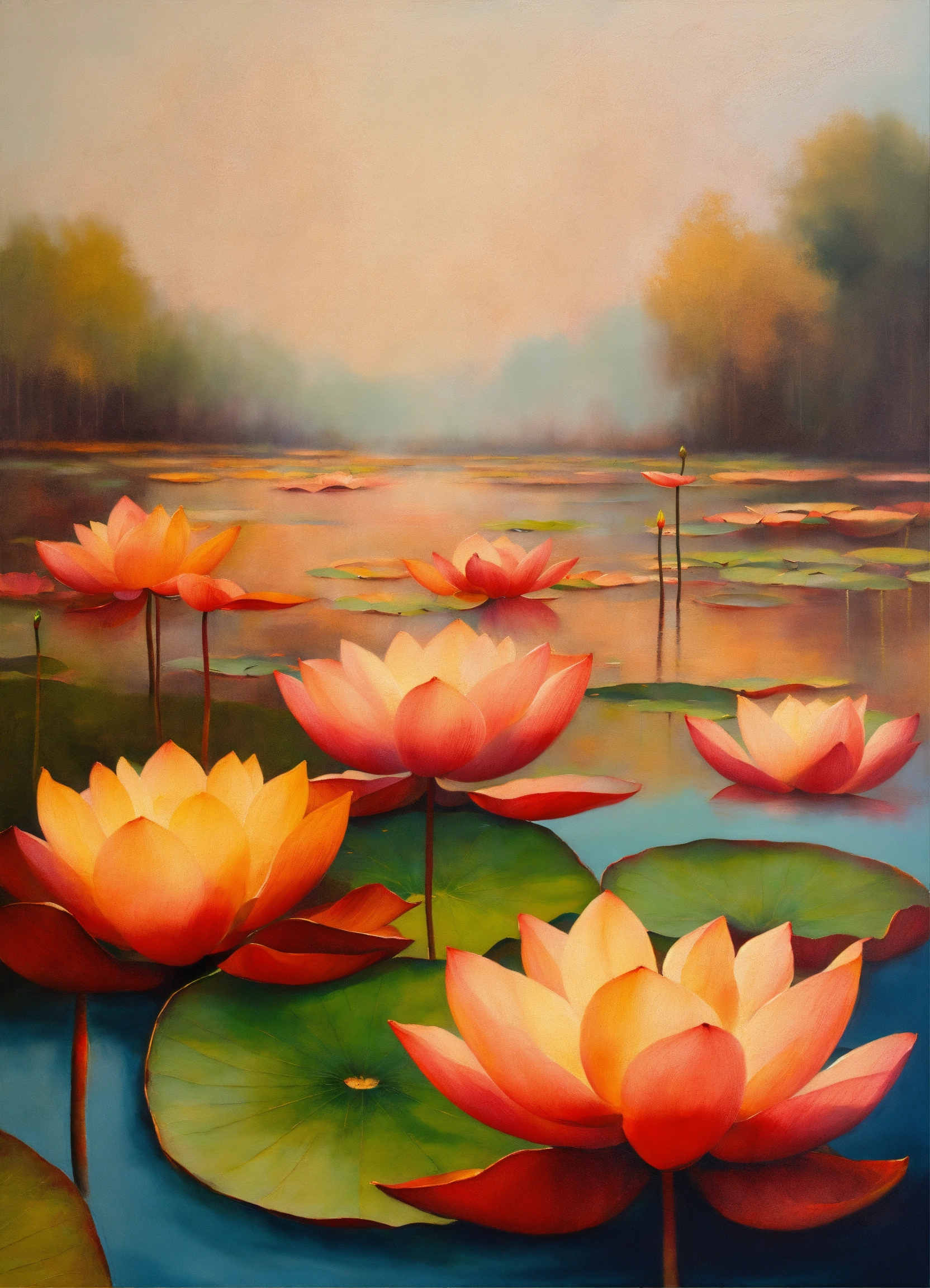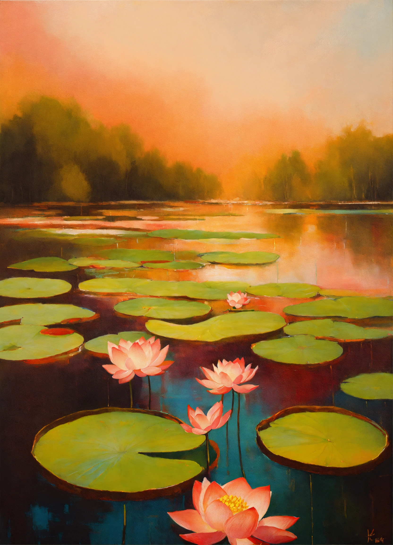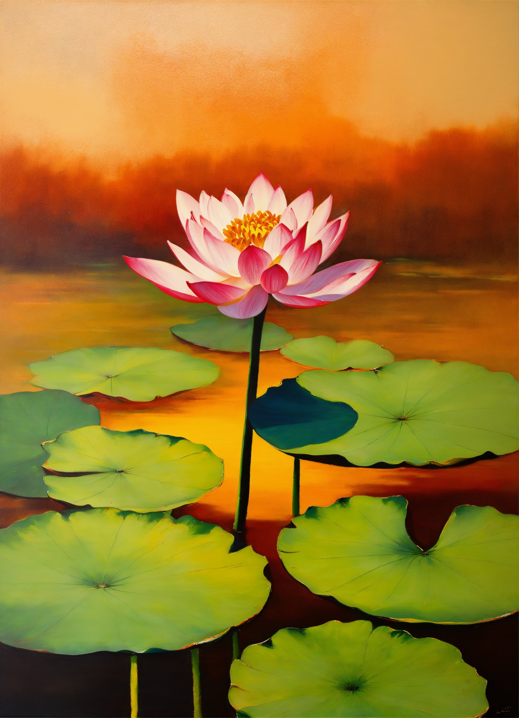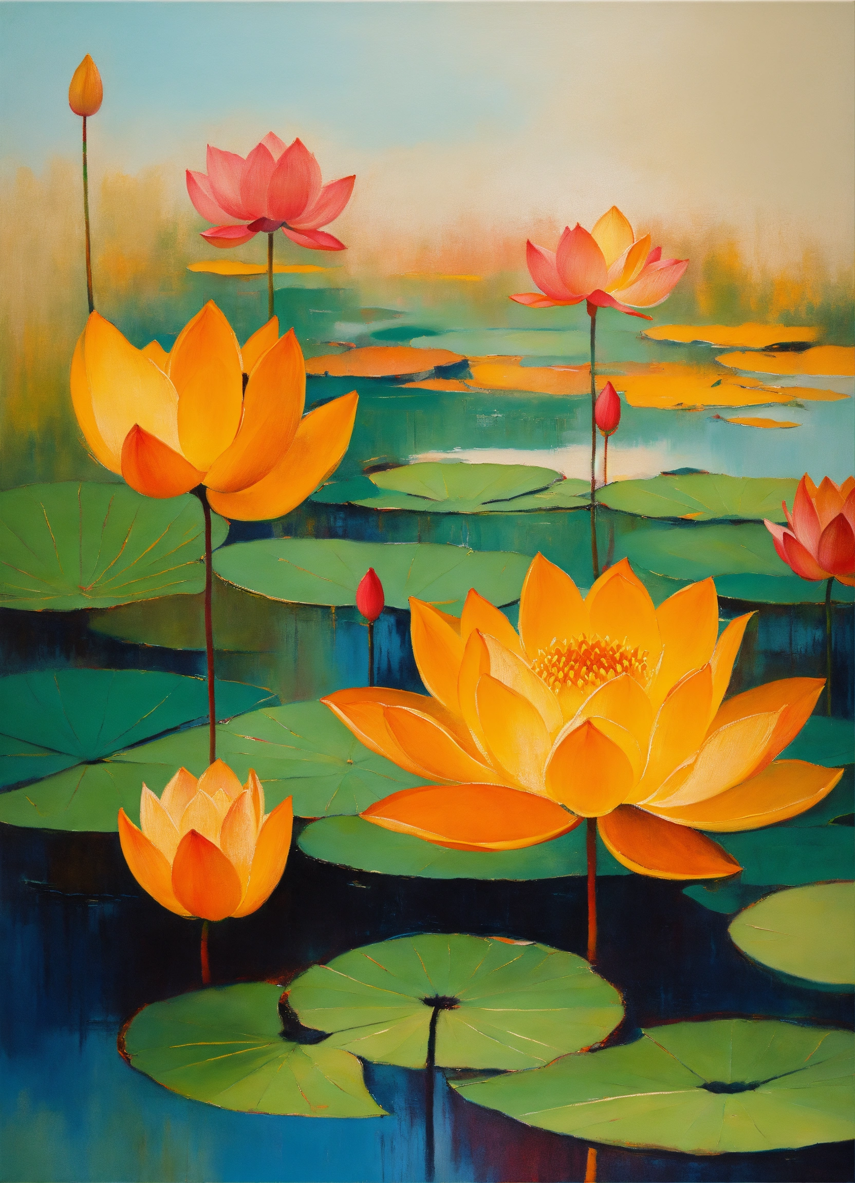 abstract and oil painting of lotus pond in warm colours and high resolution.
