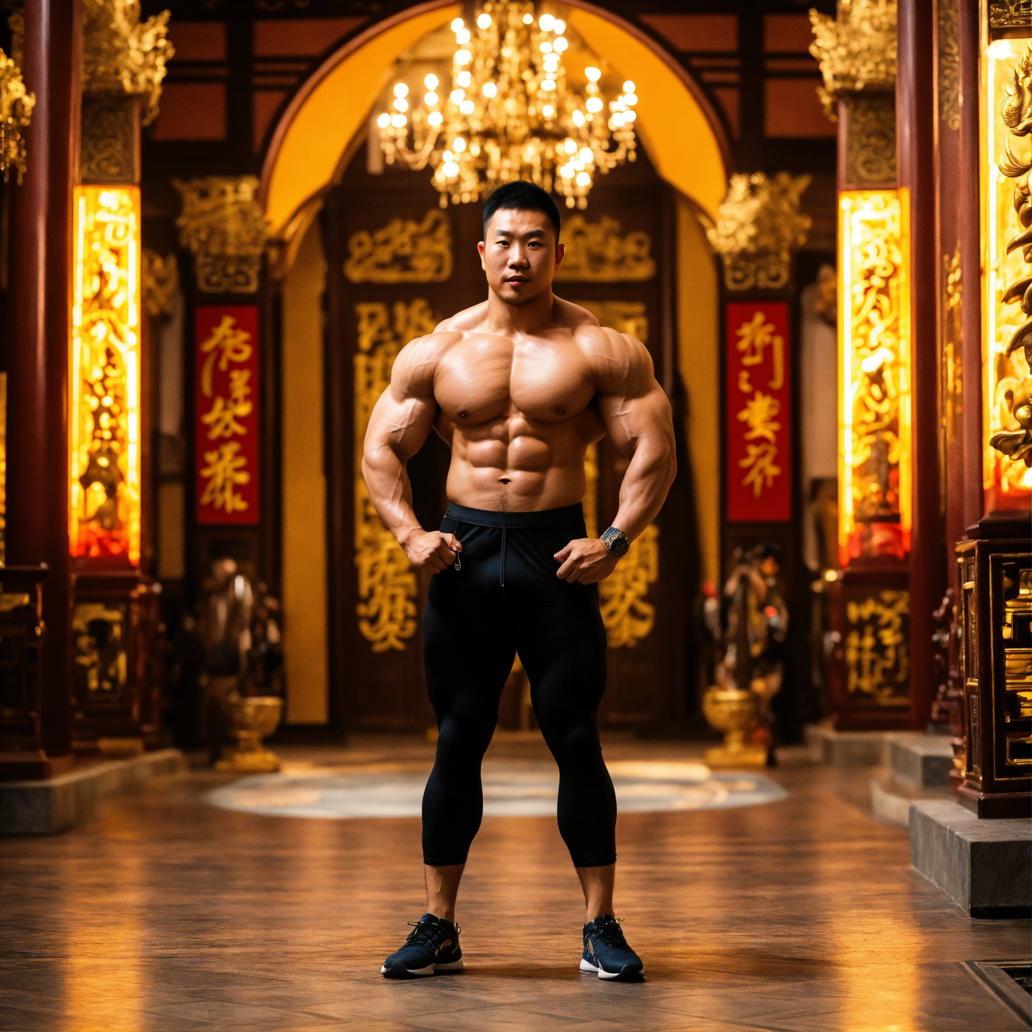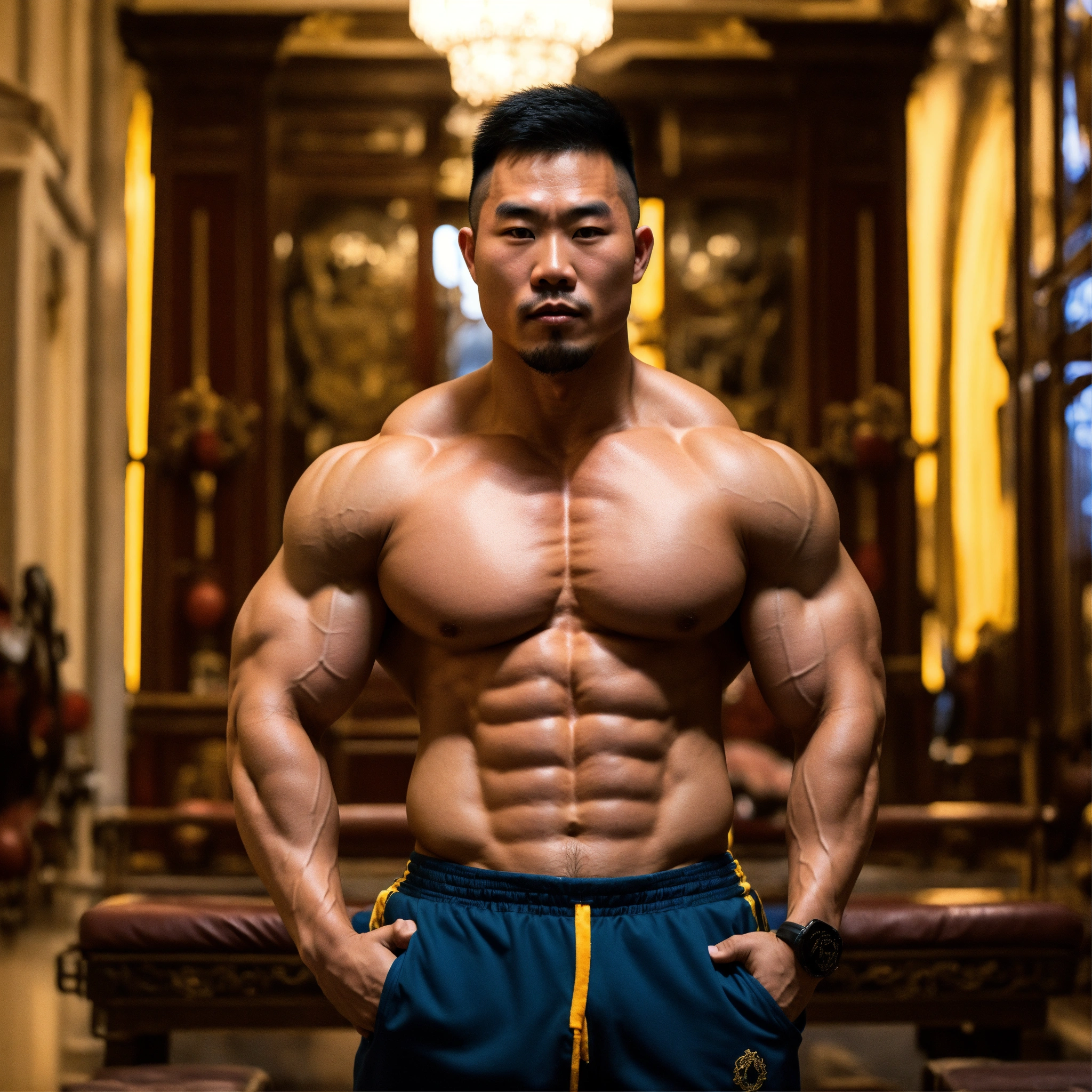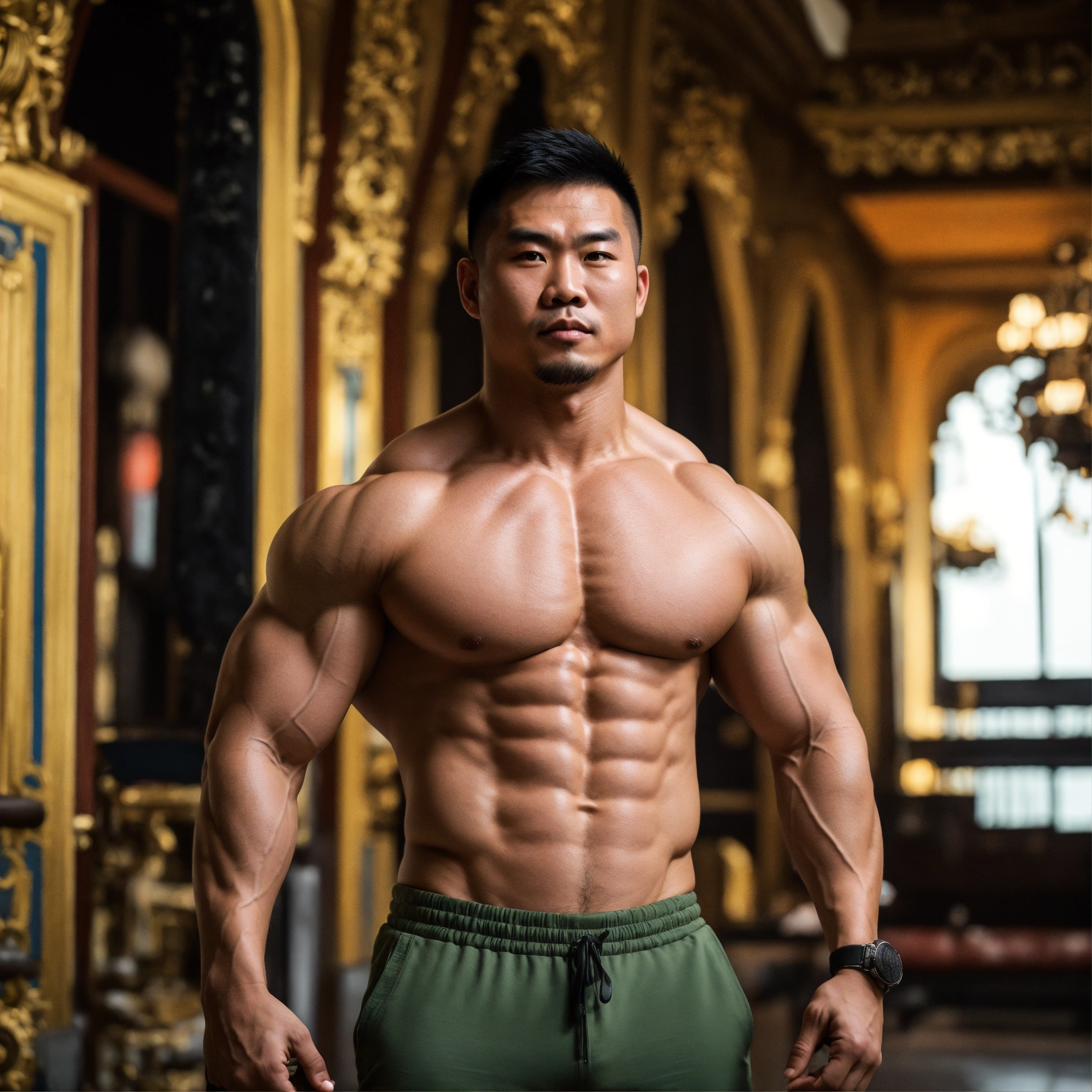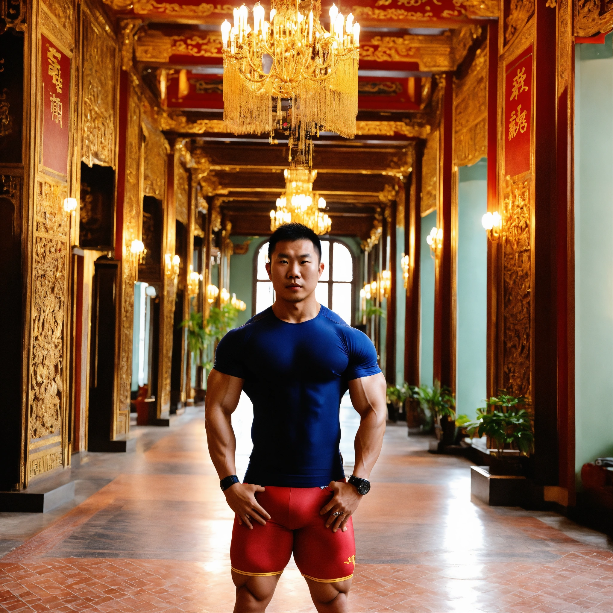 30-year-old hairy chinese man with big muscles, big bodybuilder, body like a wrestler, in a beautiful palace