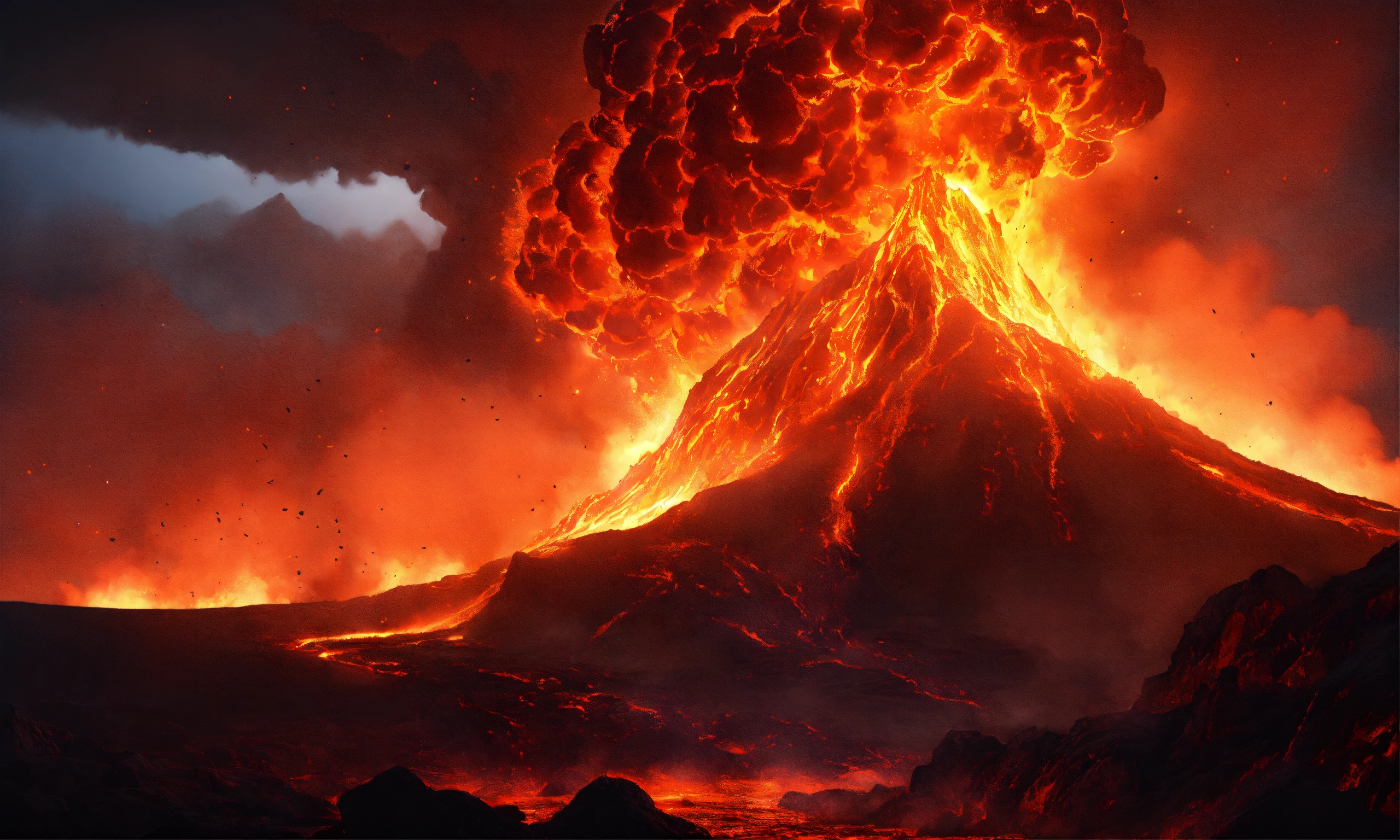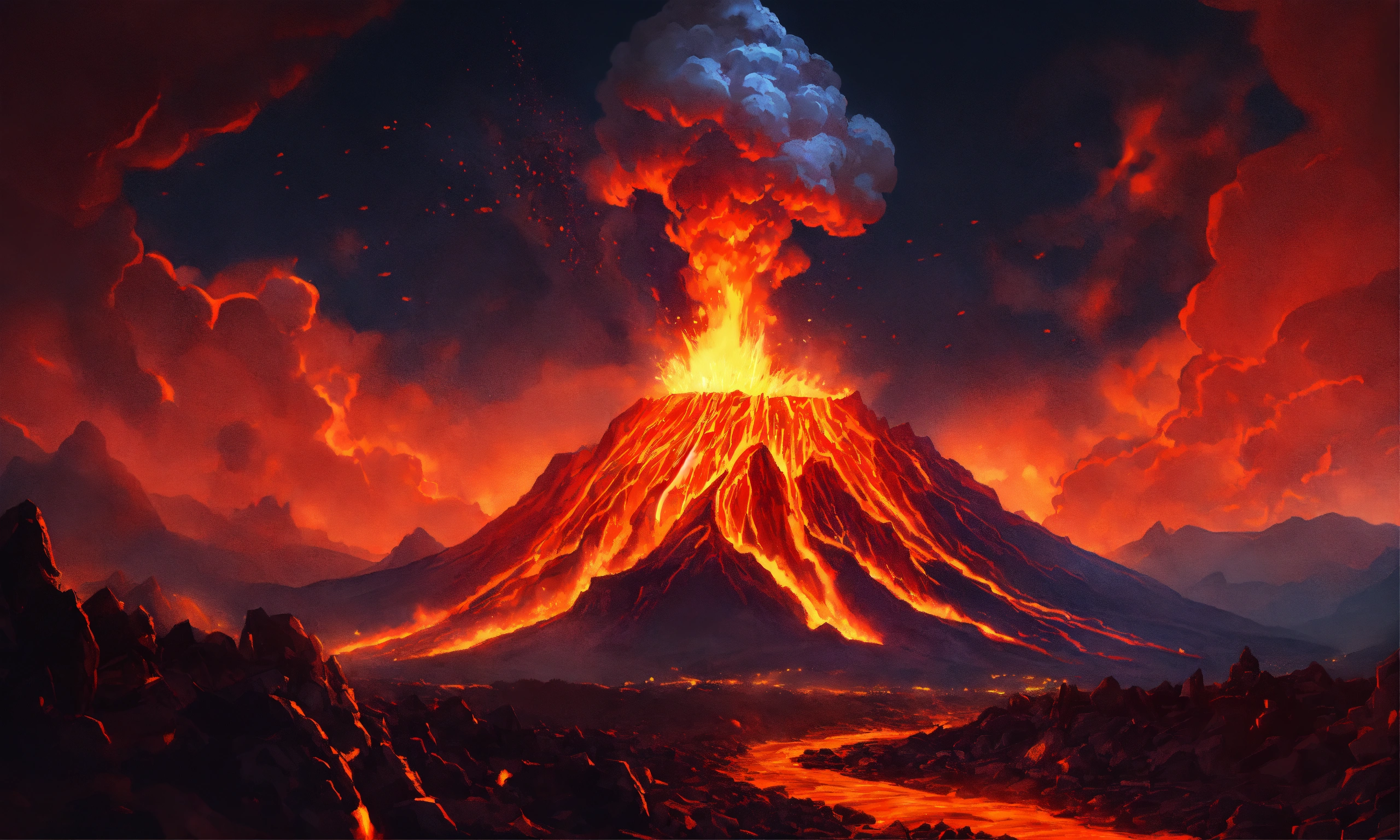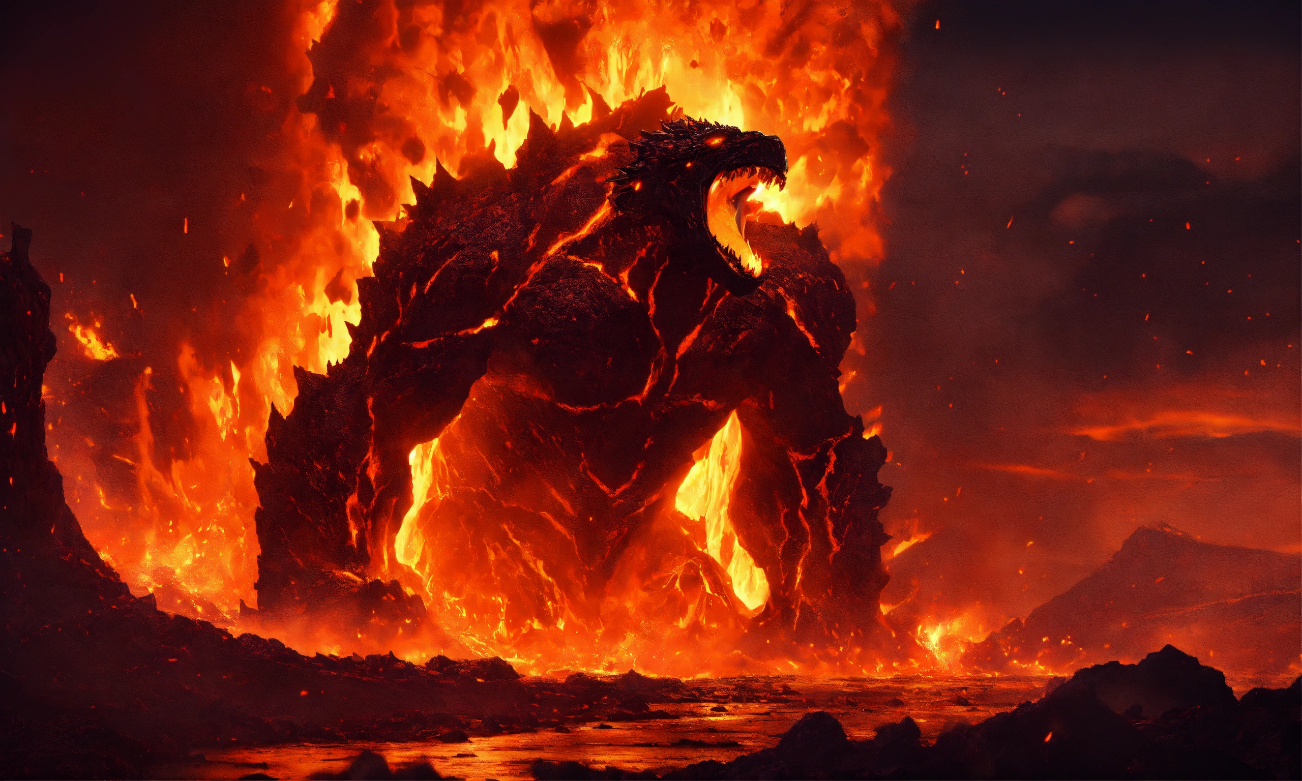 Massive lava monster destroying the landscape, coming out of a volcano, screaming, hurling molten rocks, at night time