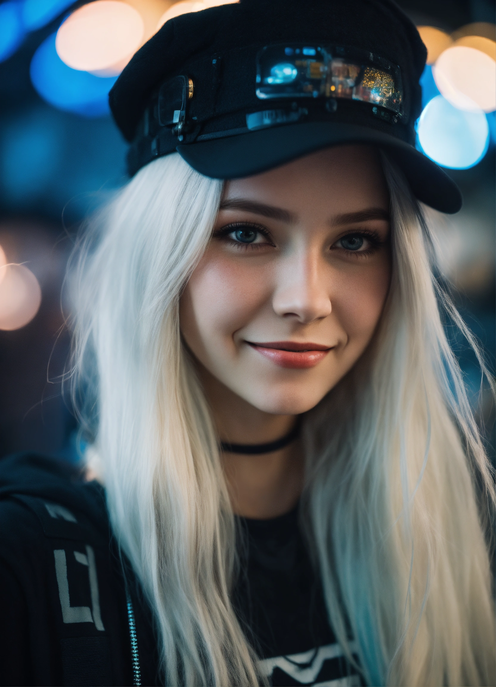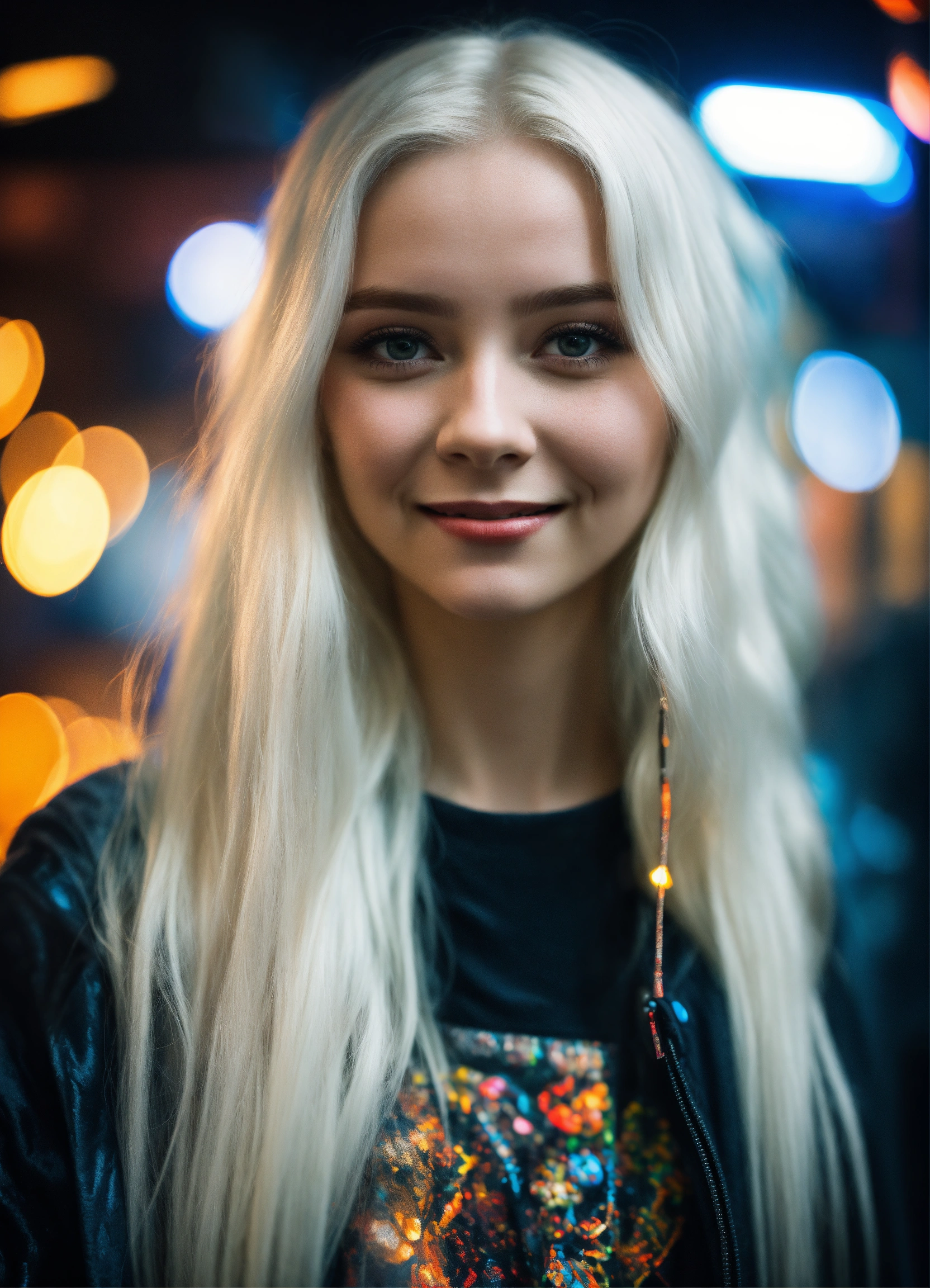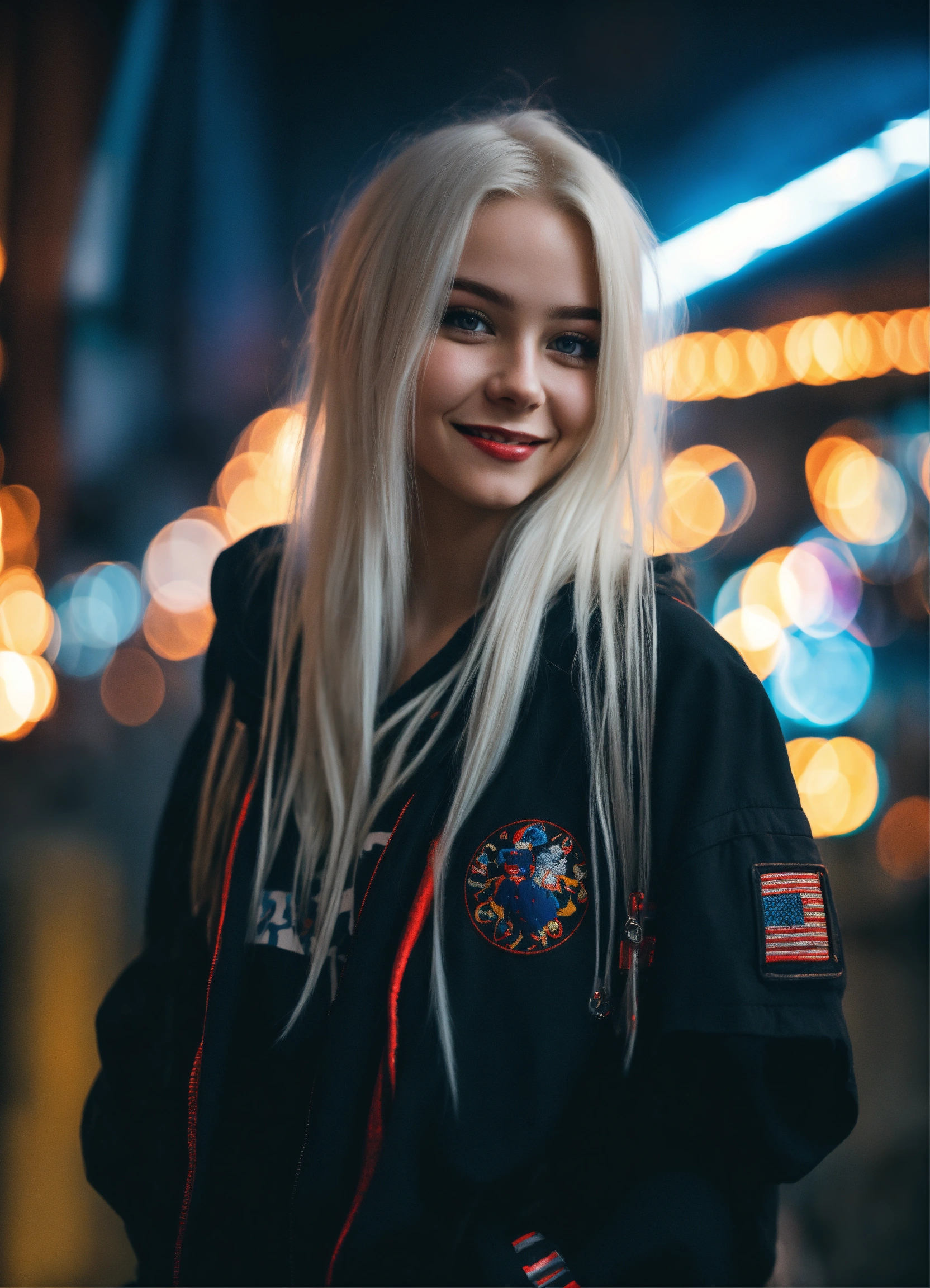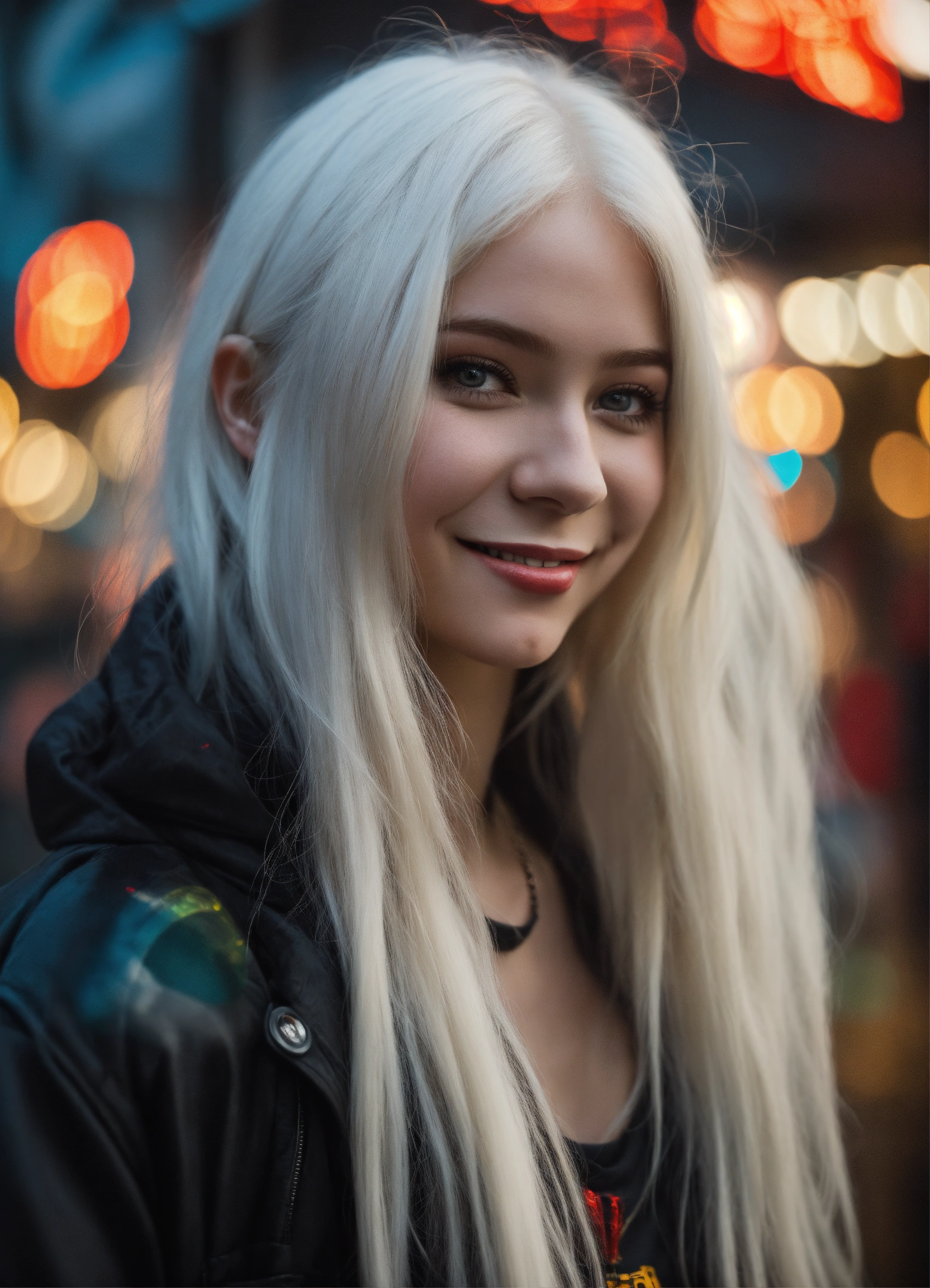 Highly detailed portrait of russian young woman 16 years old, long white hair, smile, black stweetwear, cyberpunk, cartoon realism, black, grunge aesthetic!!! bokeh