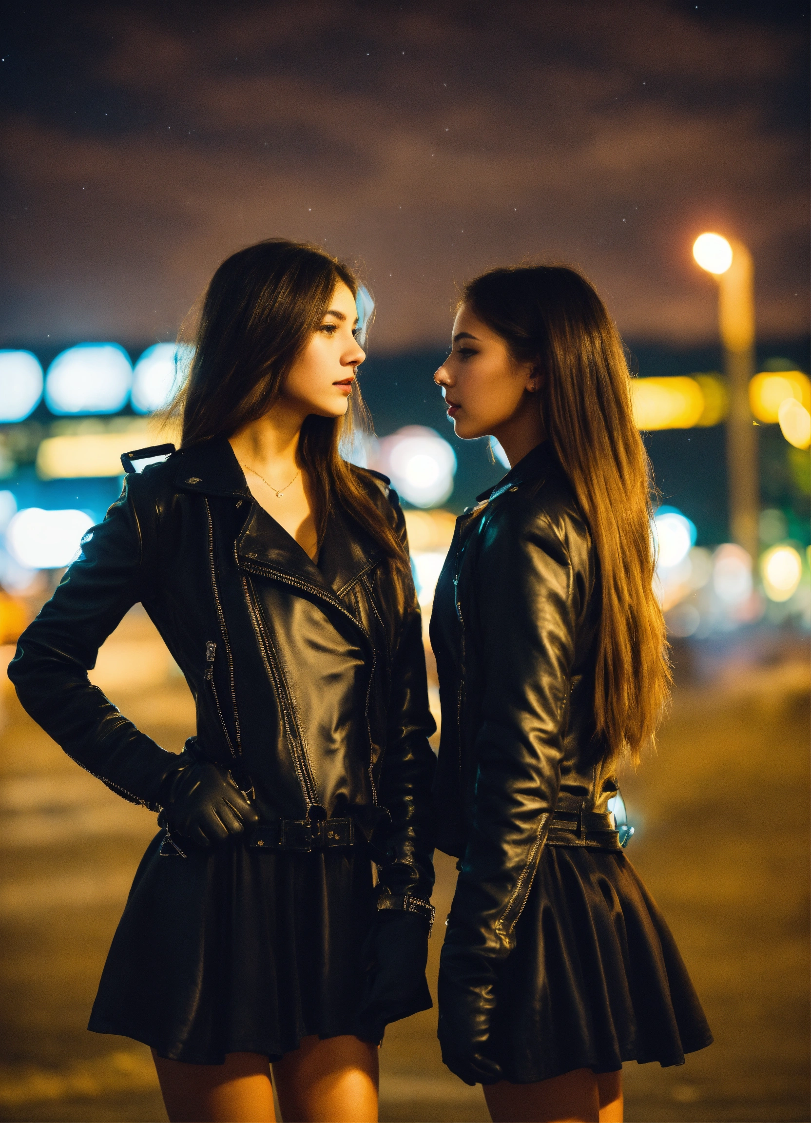A real photo of two 25 year old girls, with very long hair, wearing a short satin dress and black leather jacket and gloves. urban background in the sky we see the stars. full body
