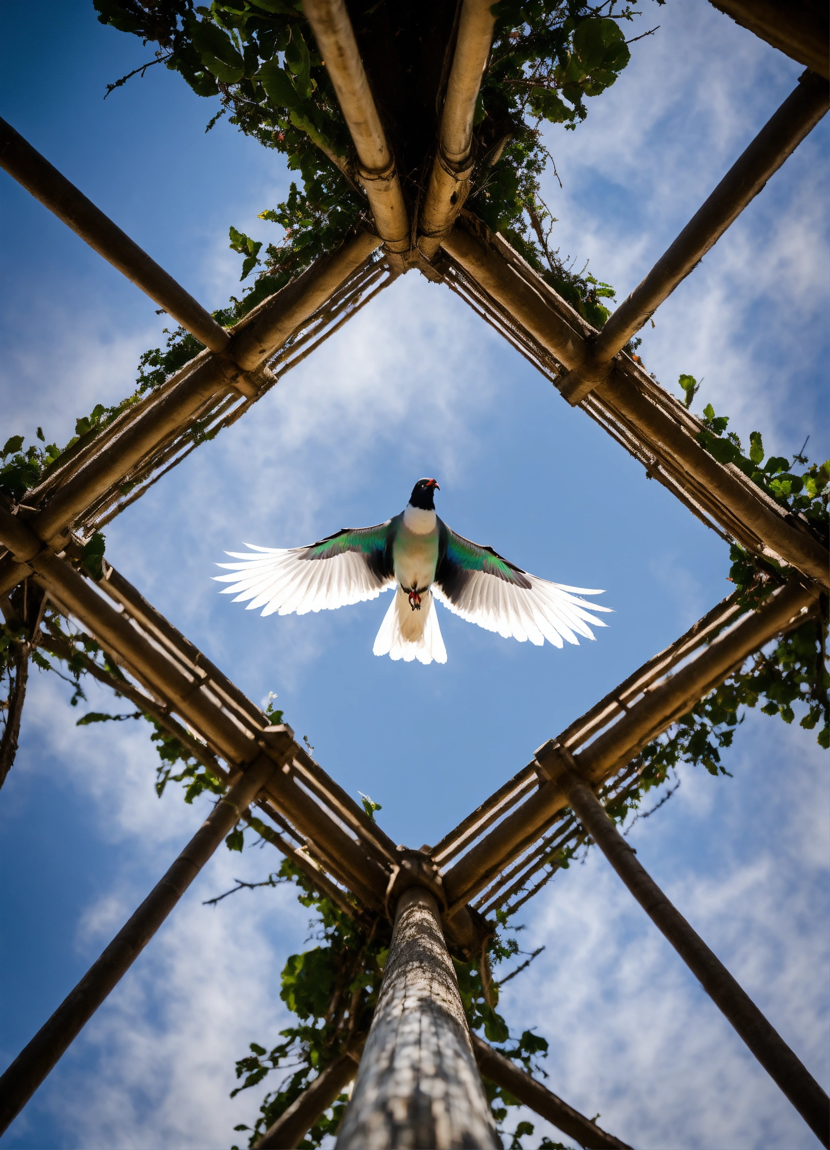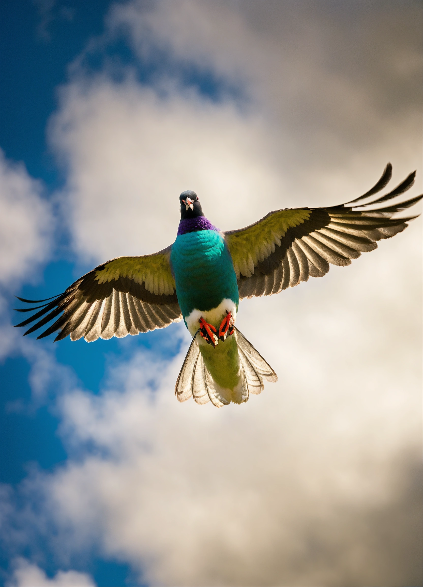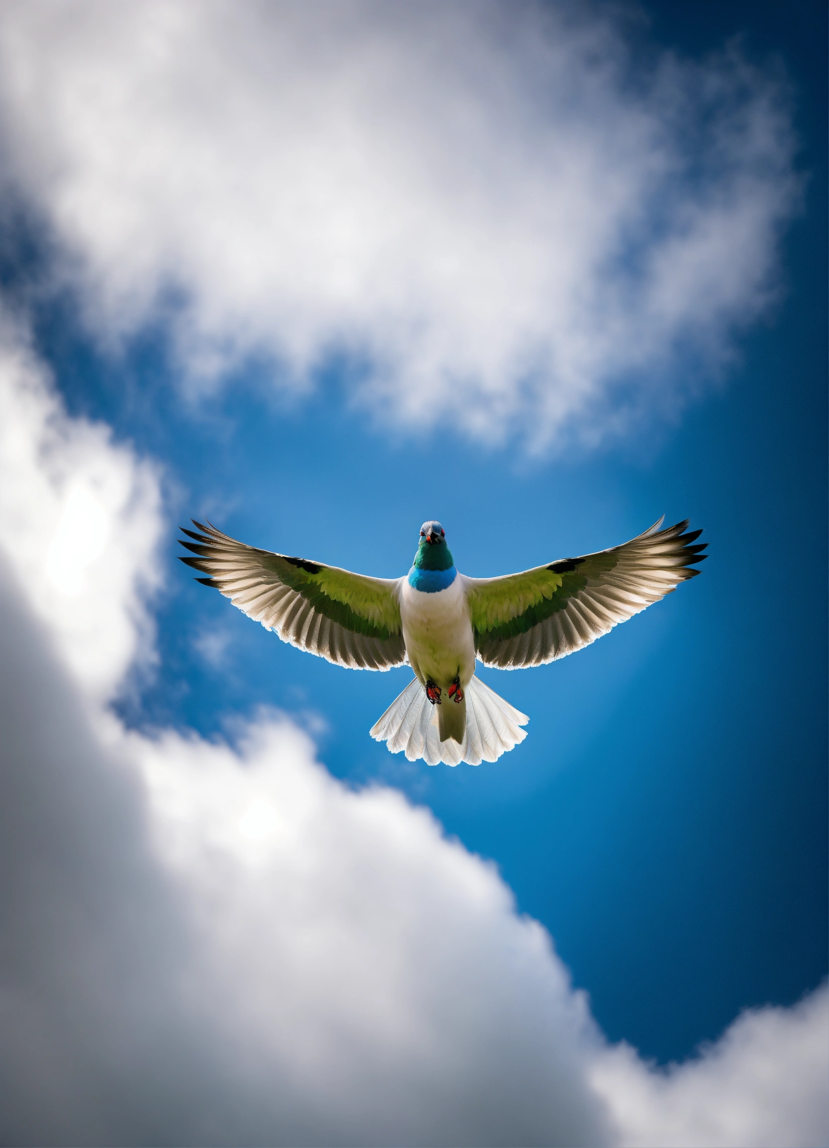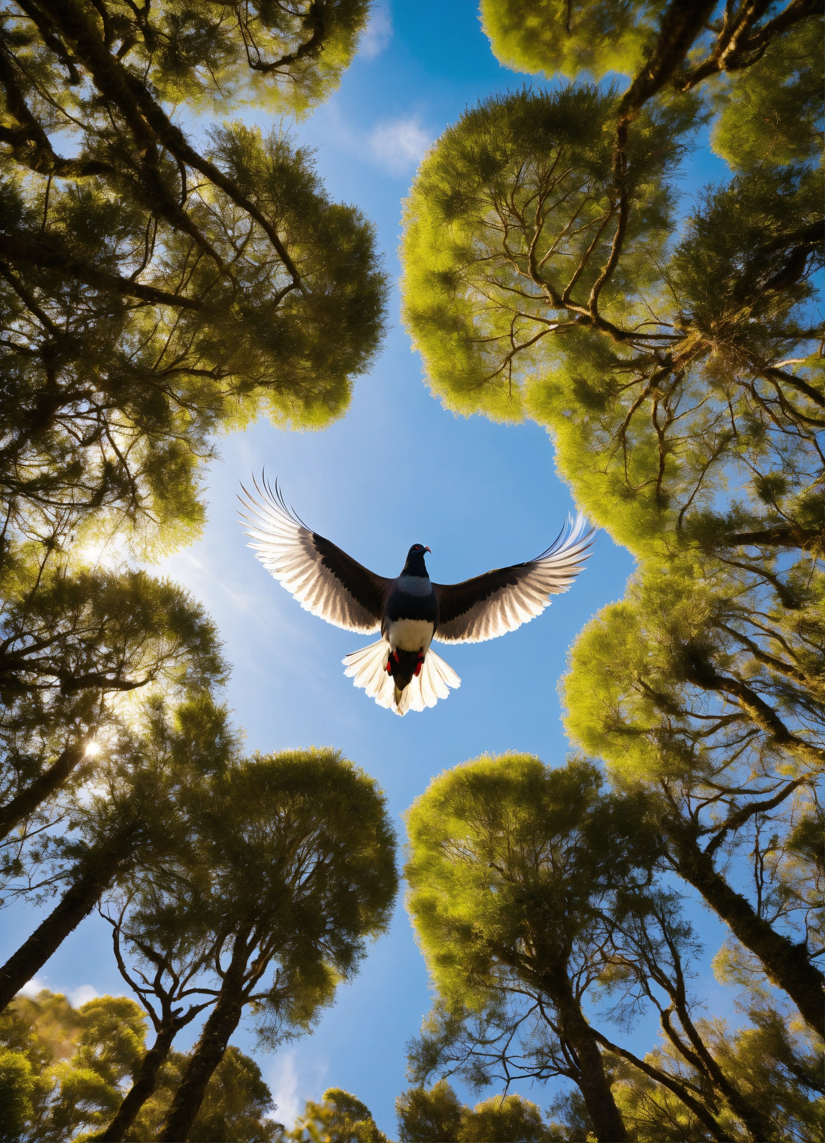 Underside of kereru nz bird flying photo symmetrical sky from below