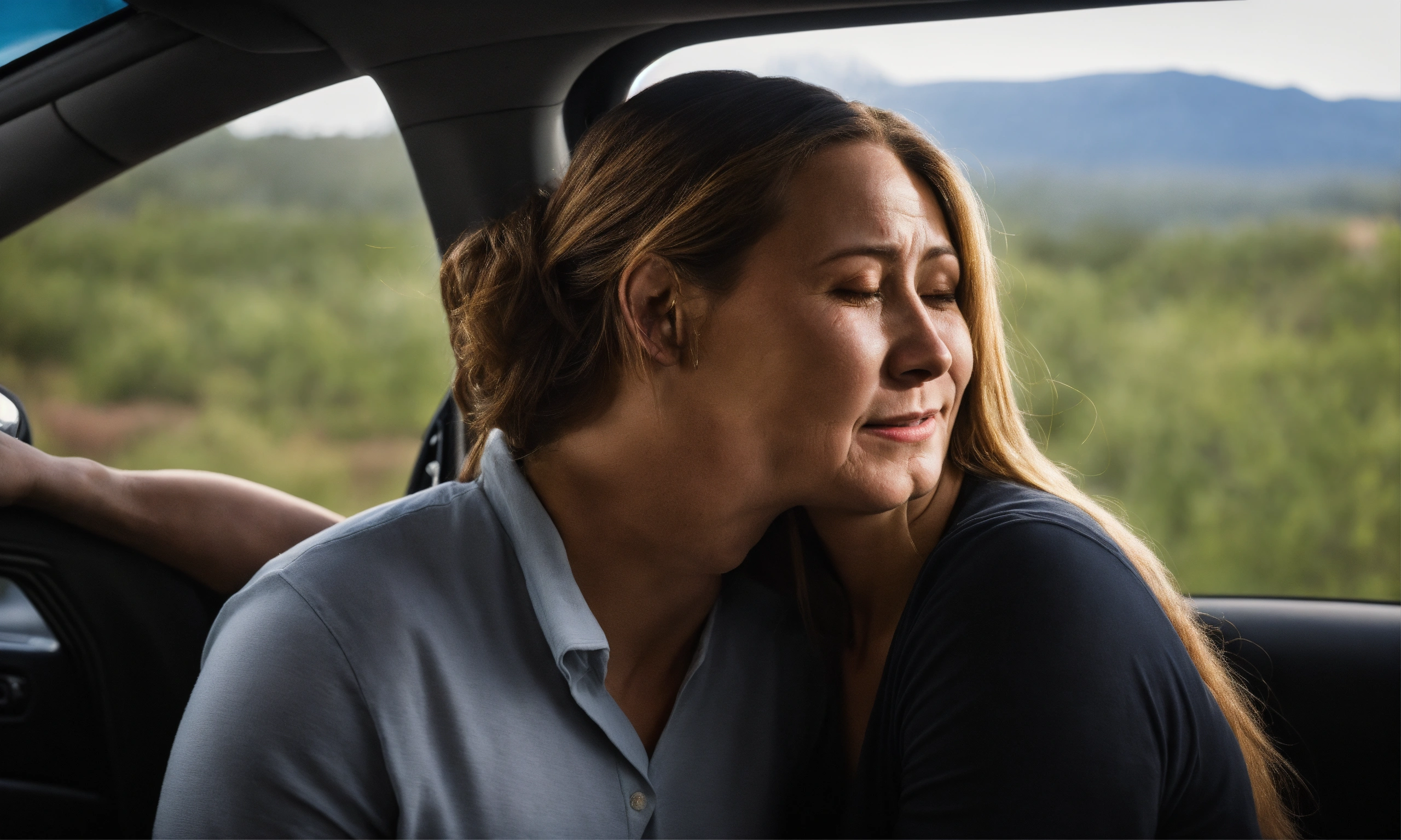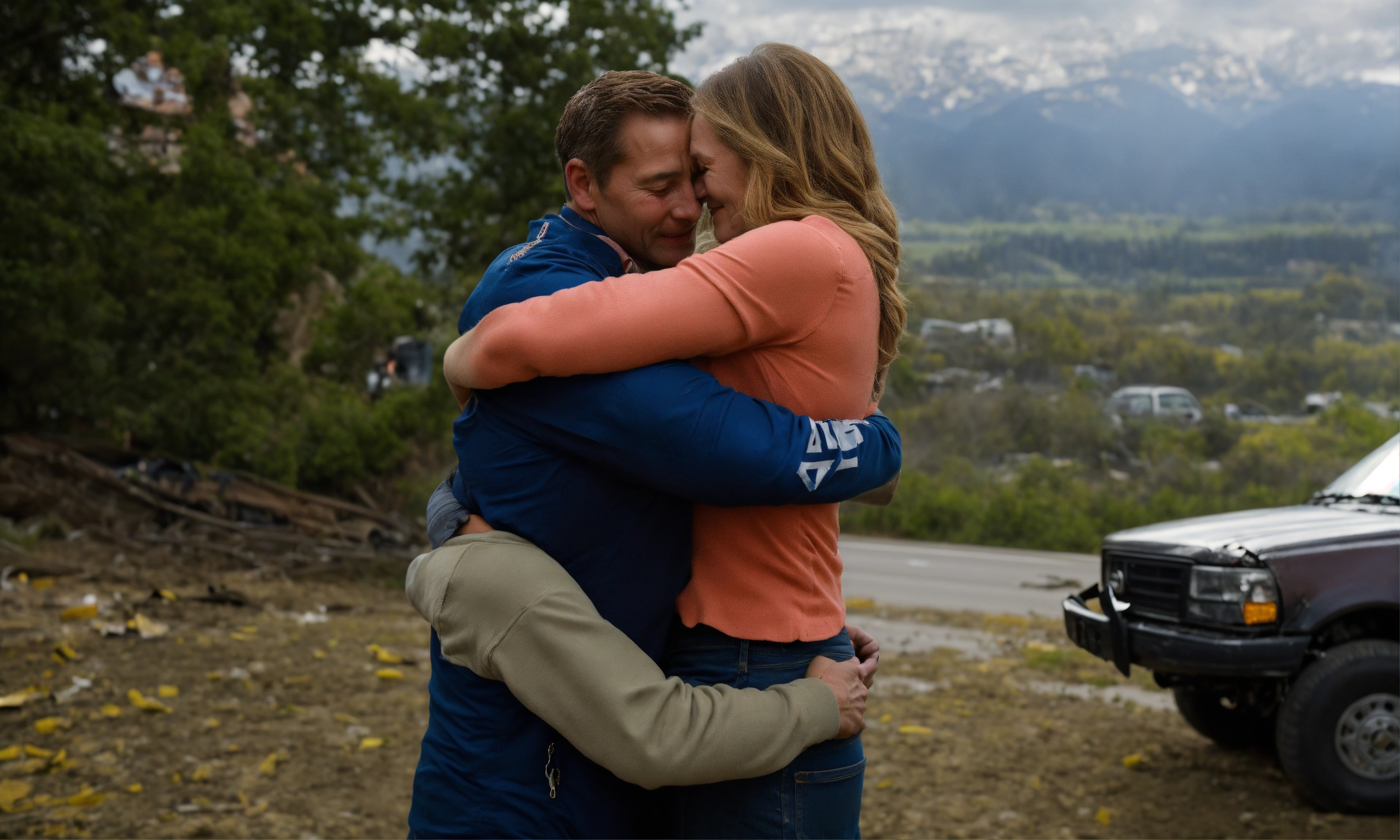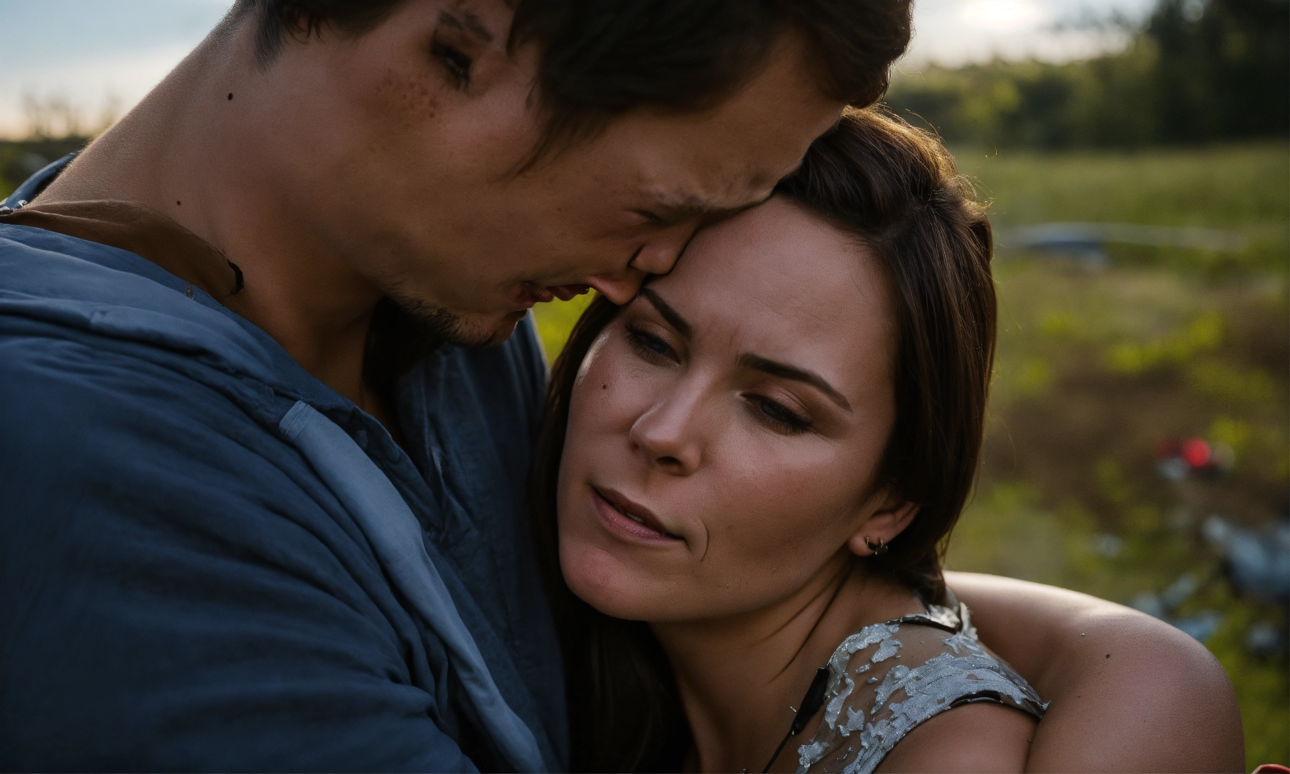 A powerful photo captures the moment when the woman, her face filled with gratitude, embraces david, her rescuer (27 year old handsome). their eyes reflect the intensity of the car accident scene, showing the profound connection forged through his heroic actions. it's an image of gratitude and the bond formed in the face of adversity.