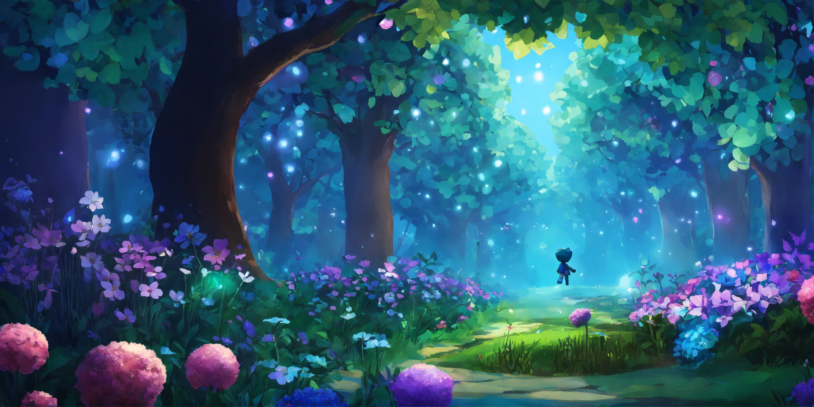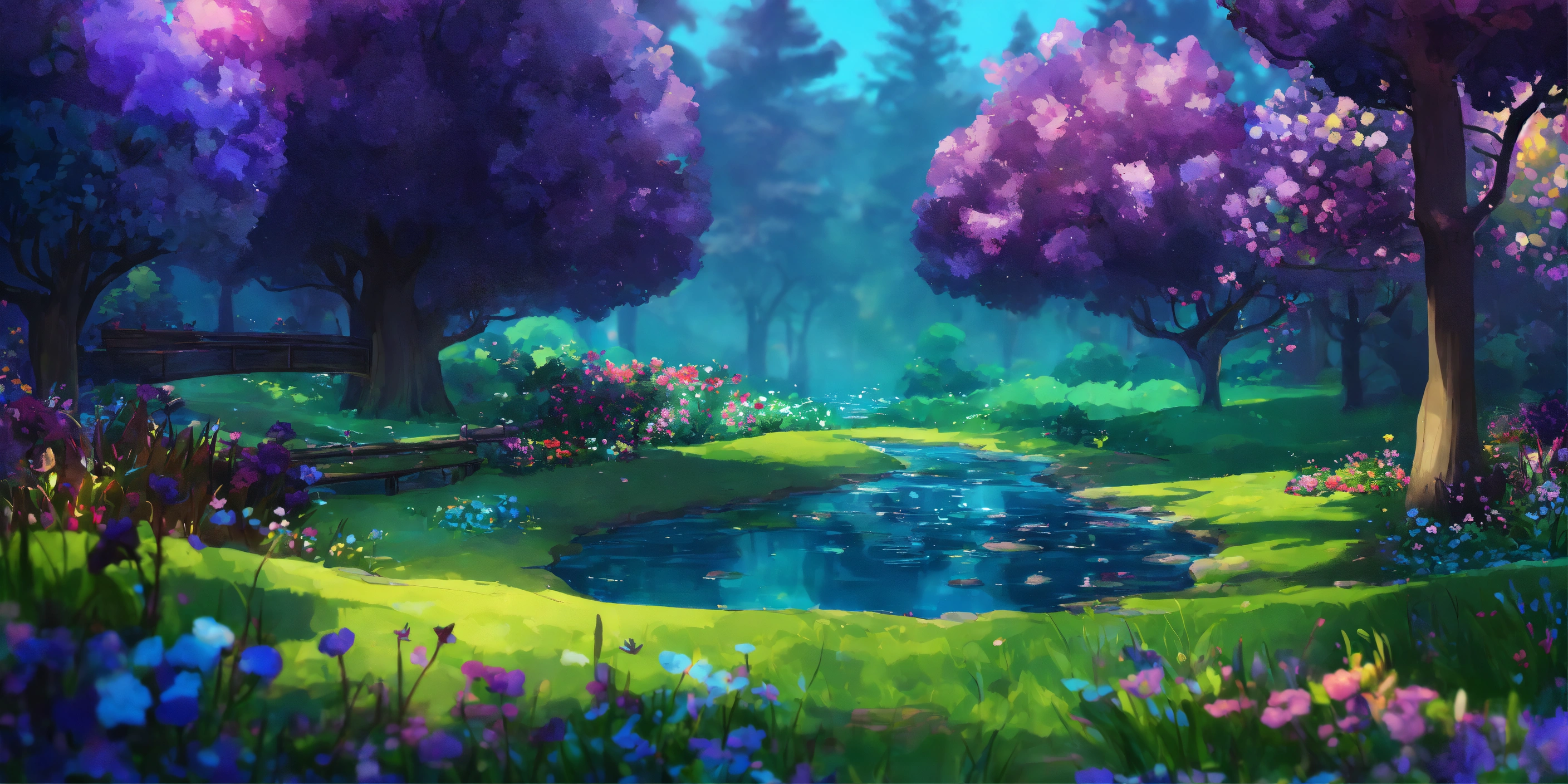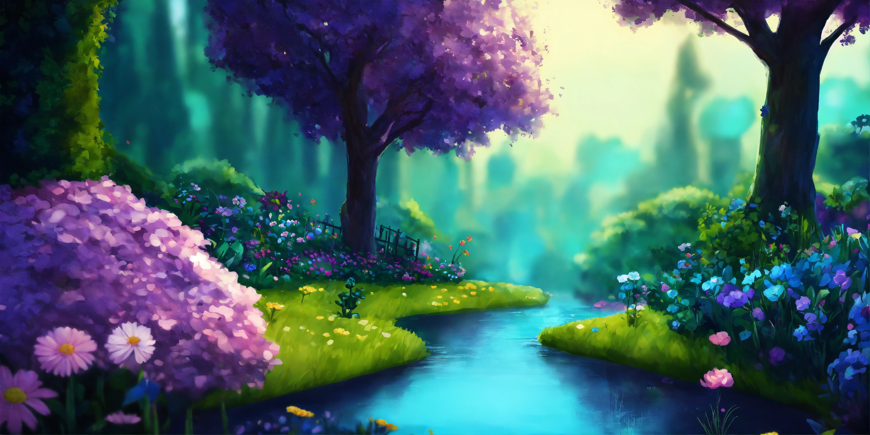 A garden, beautiful with trees, two rivers running through it, trees, flowers, blue, purple, very dark shimmering greens, children's art, clean edges, 12k, sackboy style art.