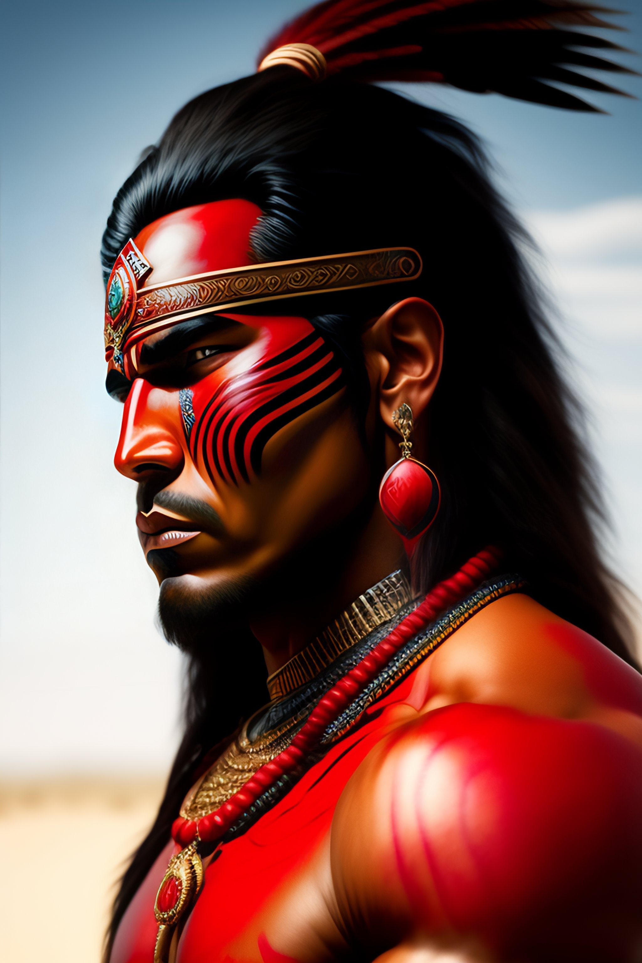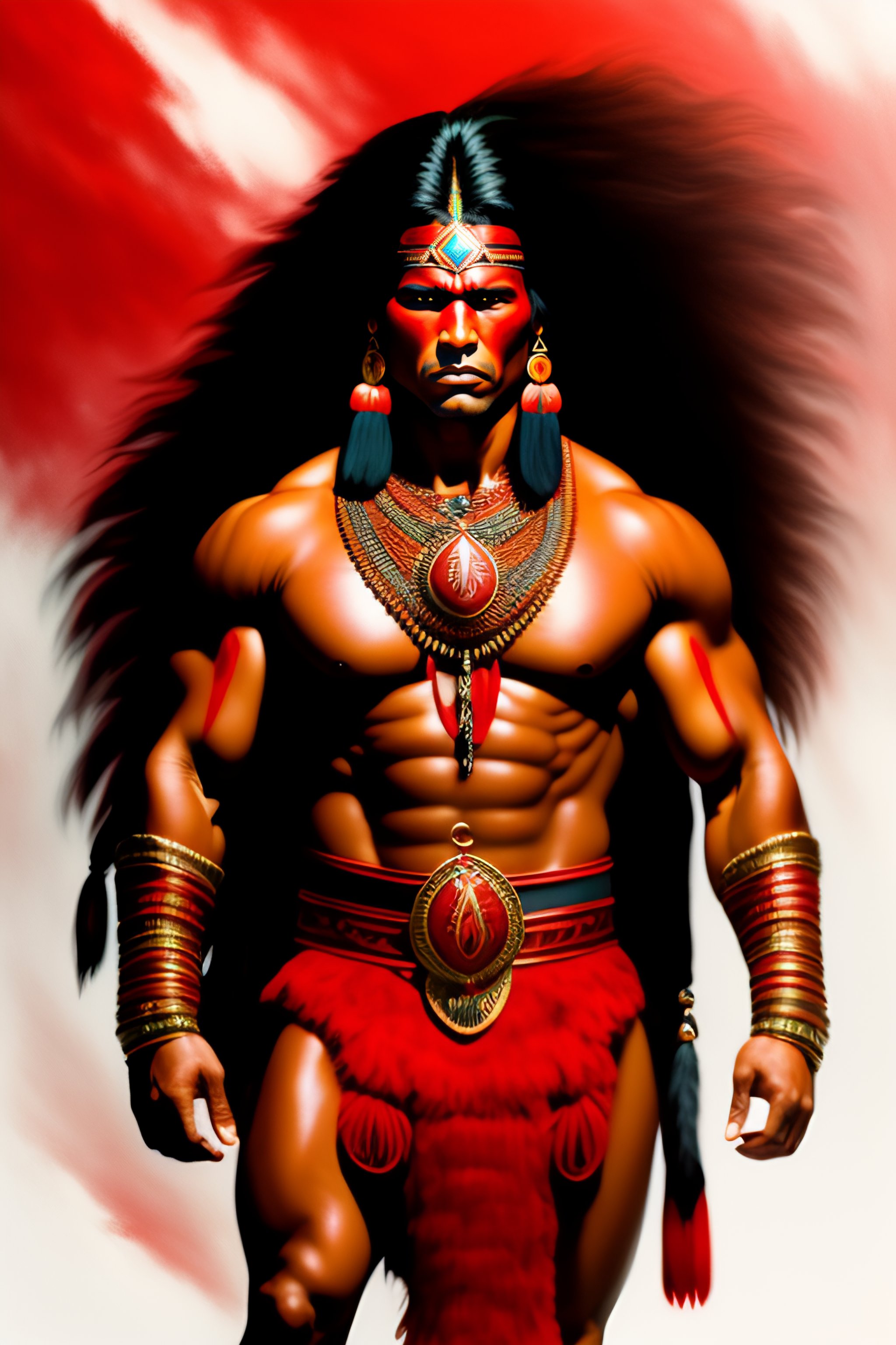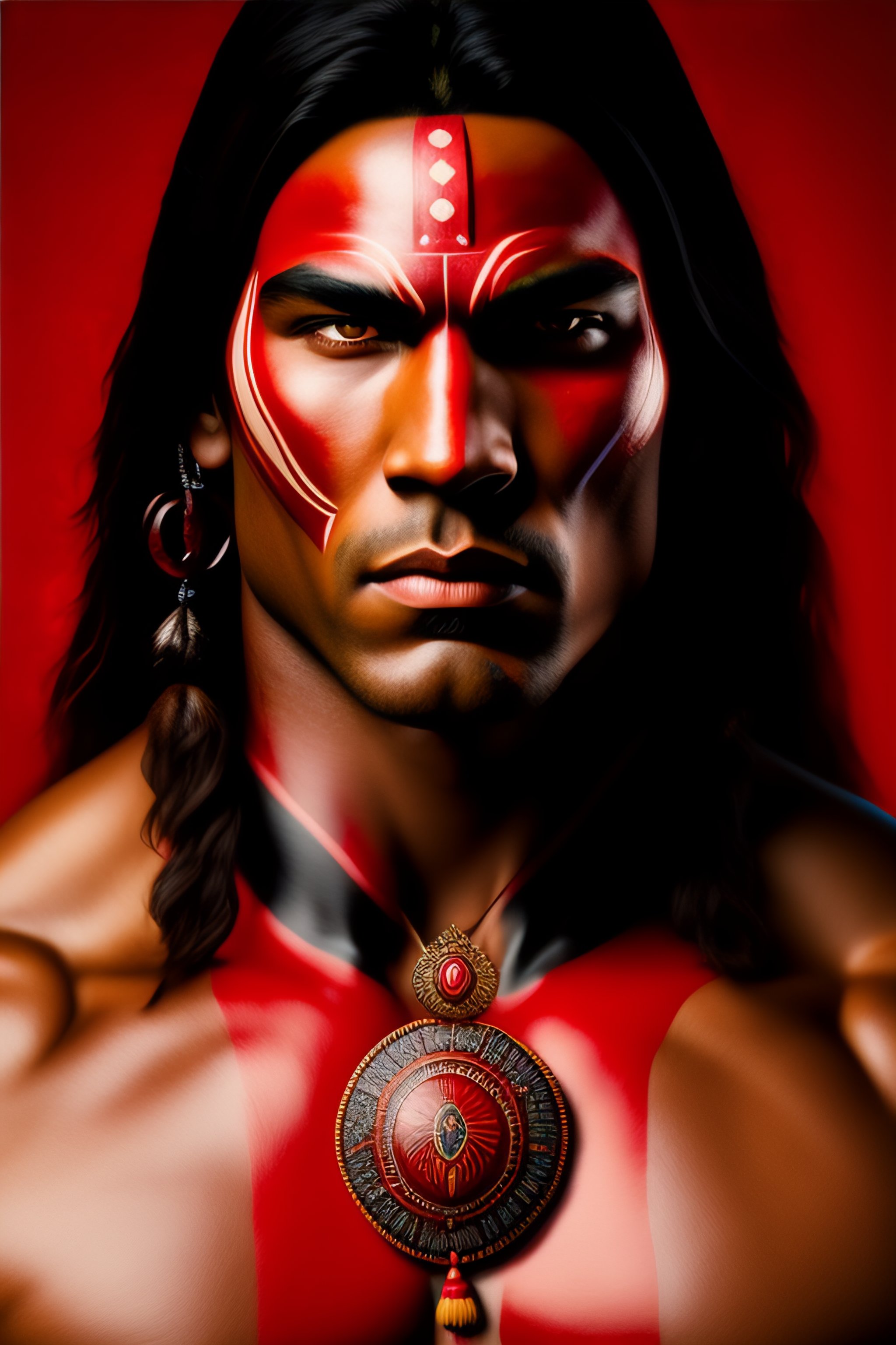 Enormous muscular native american warrior painted in red body paint with an eye shaped amulet in his nech, highly detailed, digital painting, splash art.