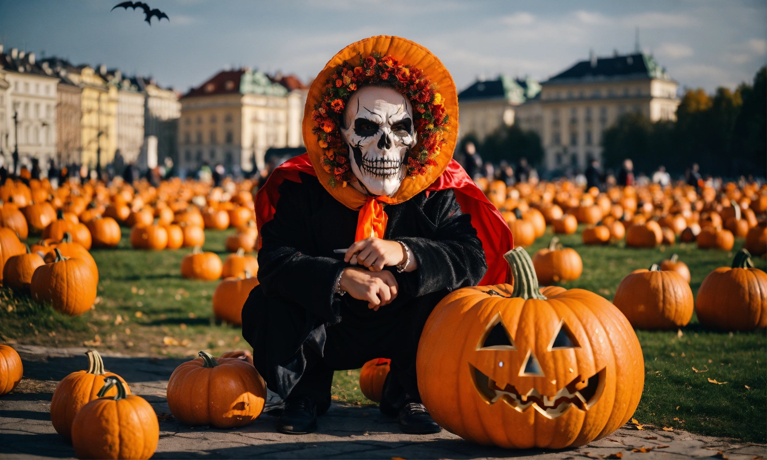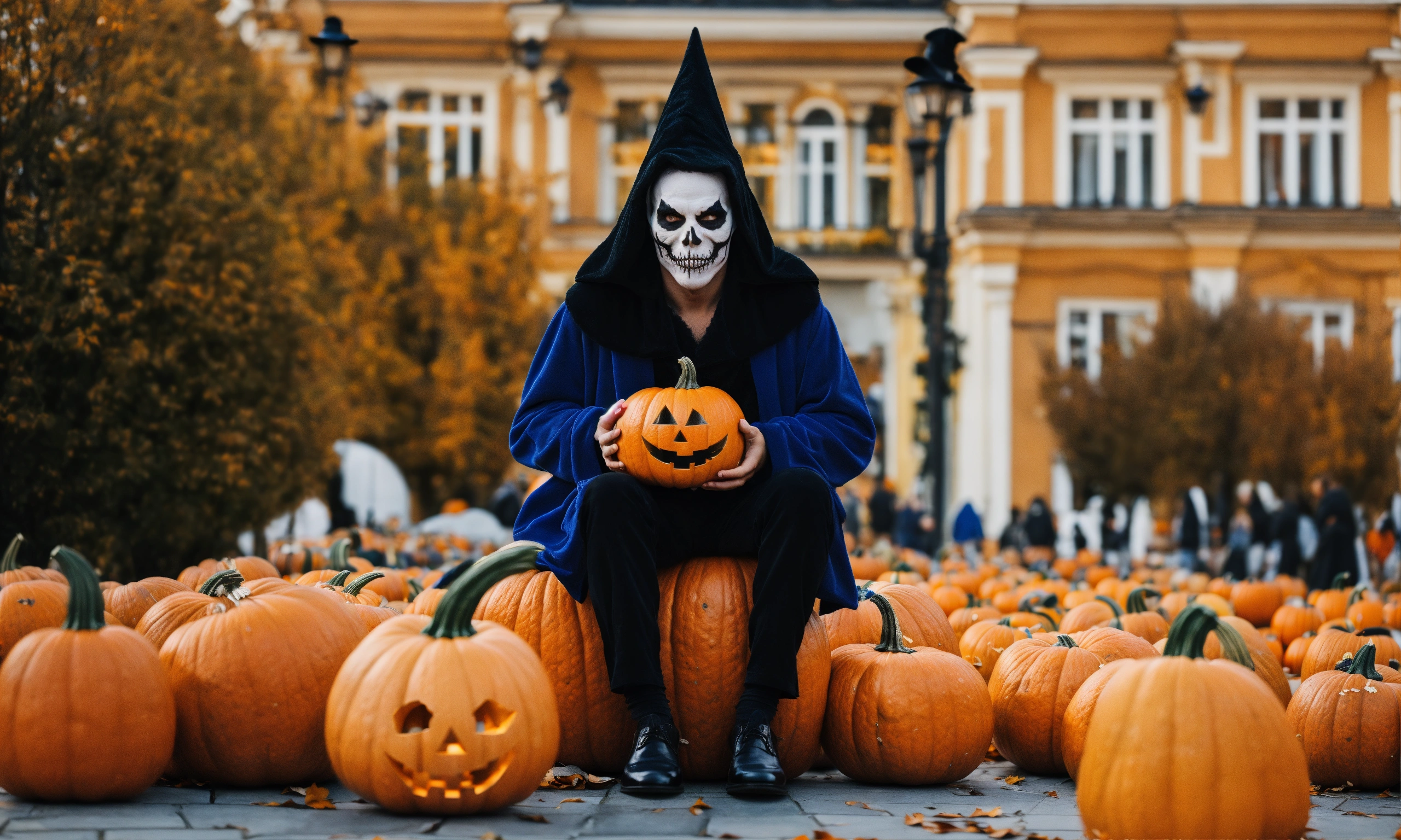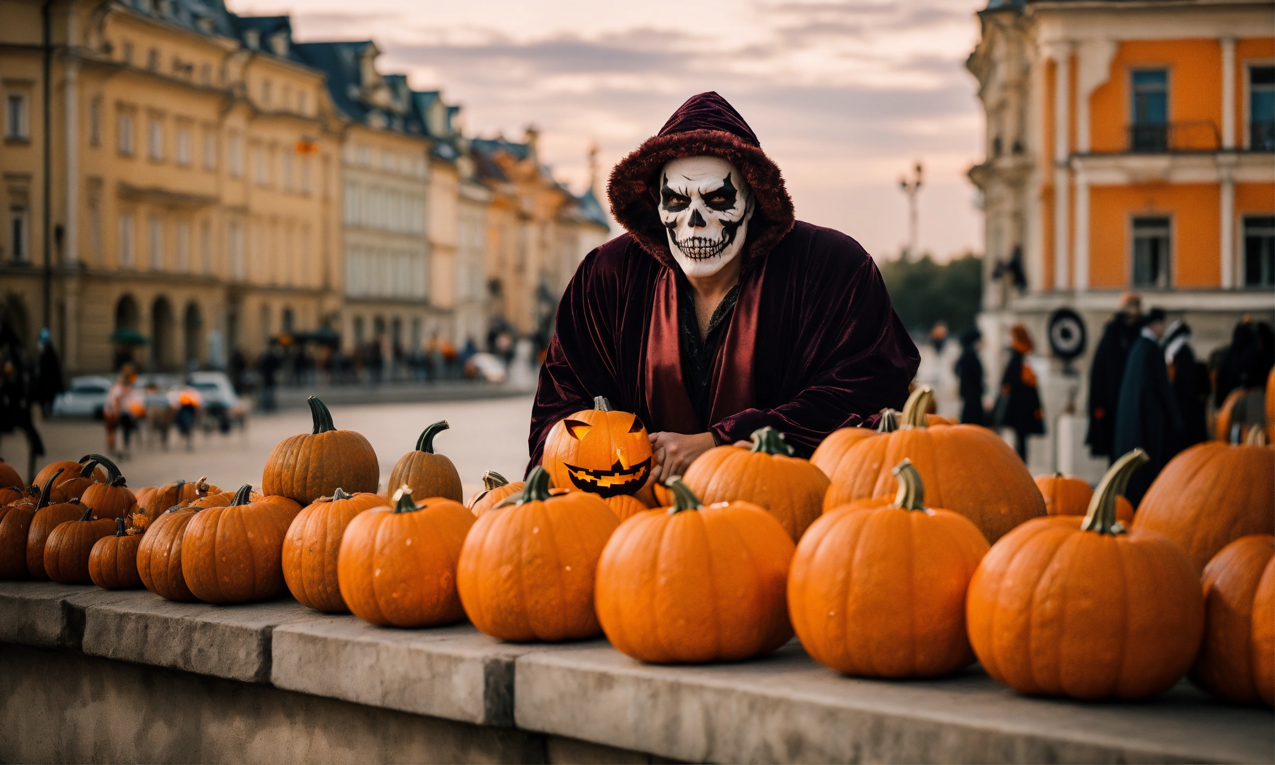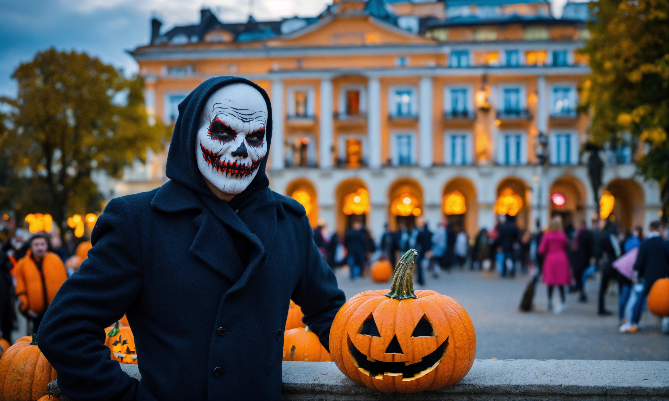 Halloween style, warsaw, poland. cute buatiful, big jaw man dressed in halloween costume at the top of the riviera looking at the camera at half height, focus on the face, halloween style, pumpkins, an ordinary face without a mask or makeup