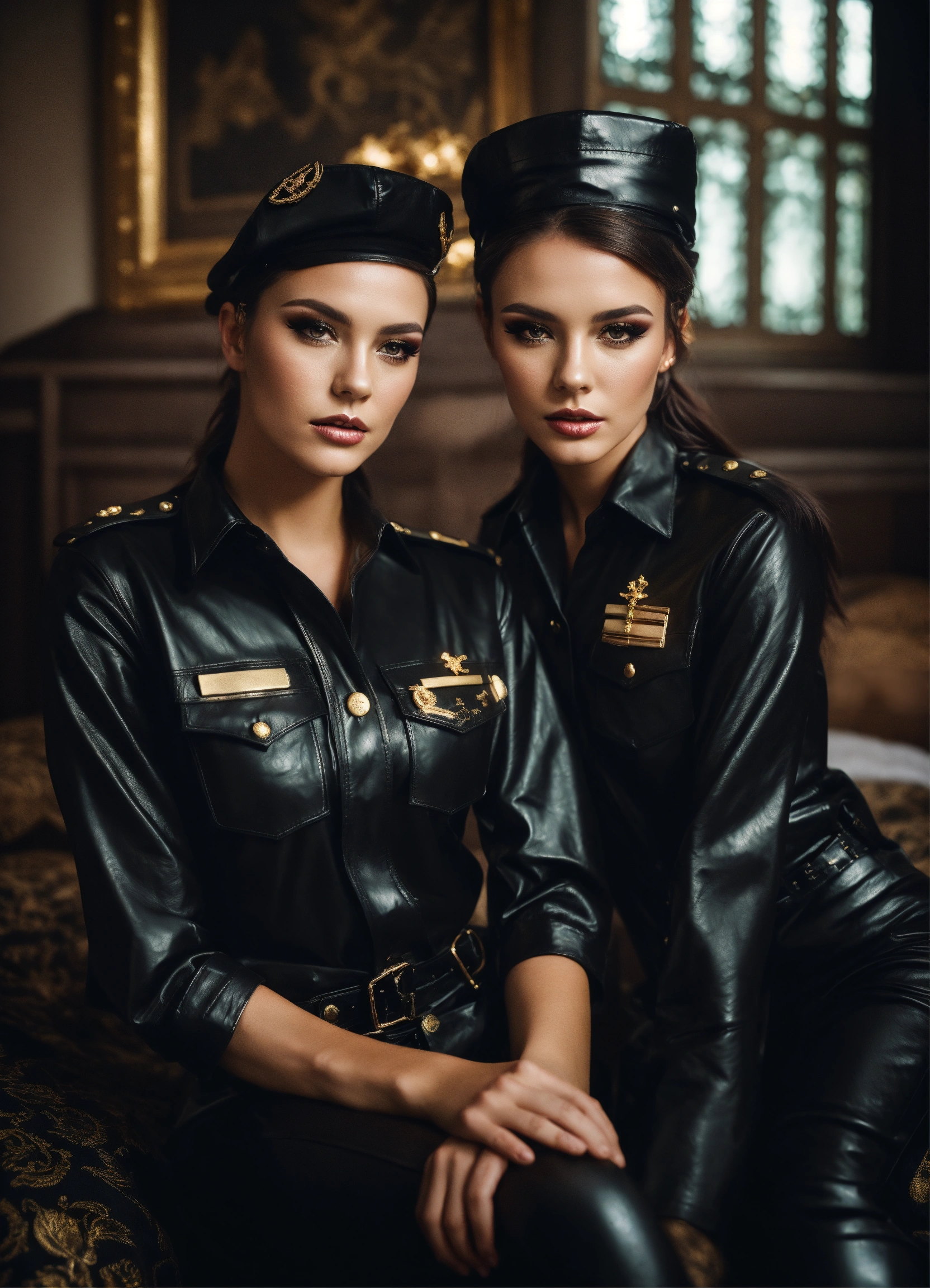 Brightly light photo, two stunning european women model, smoky eys makeup, brunette straight ponytail hair, strict black uniform shiny leather shirt with pockts and golden buttons short sleeves, black smooth shiny leather military cap, castle bedroom, leather bed linen