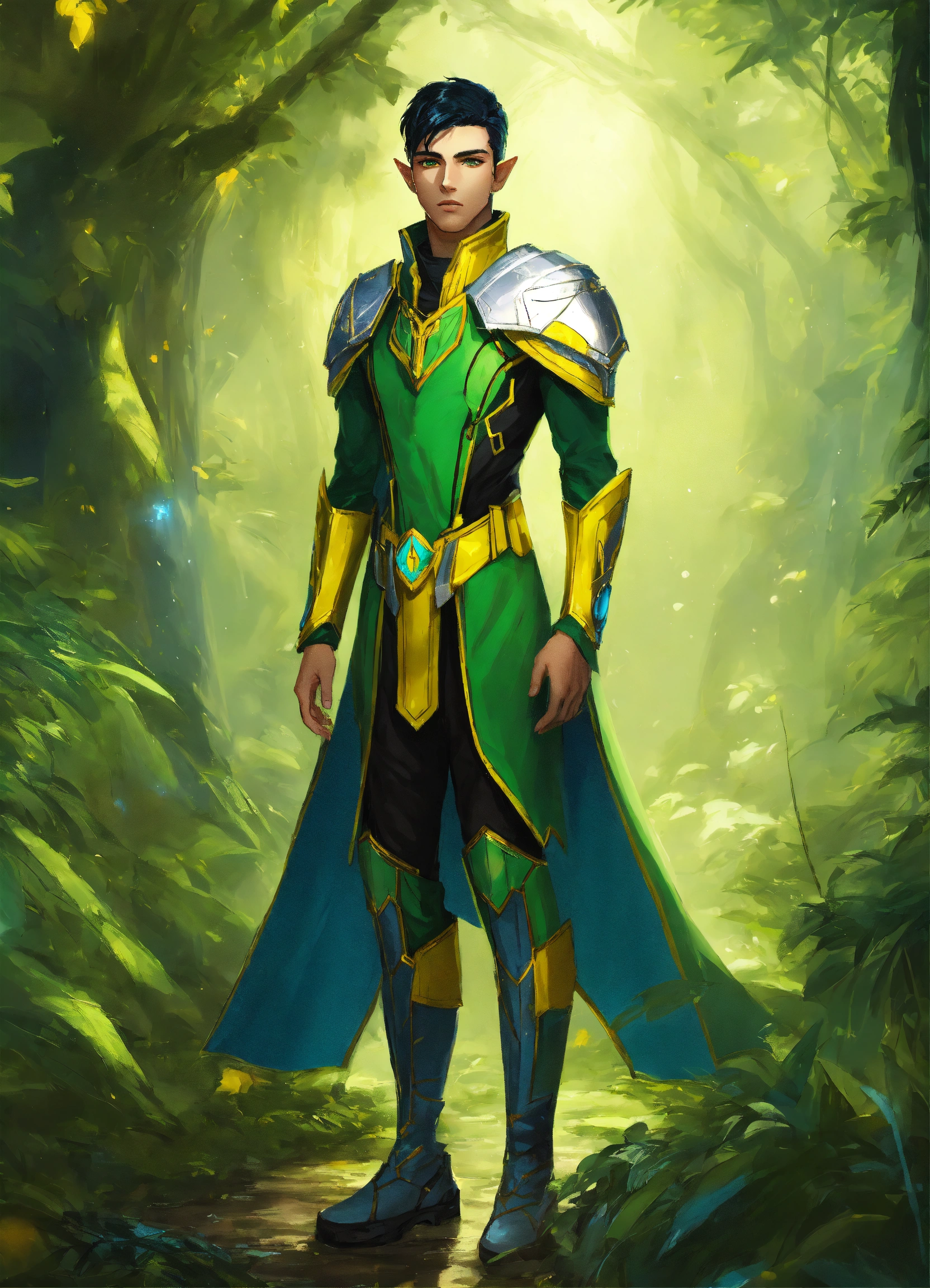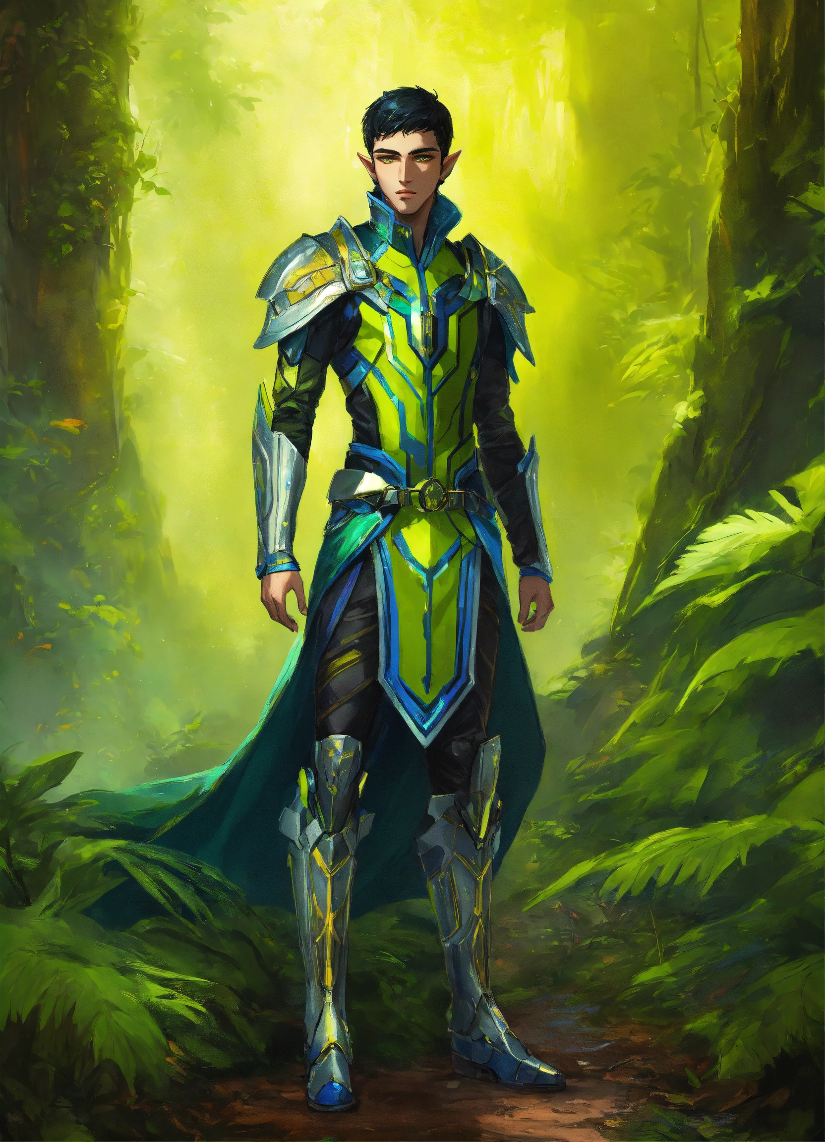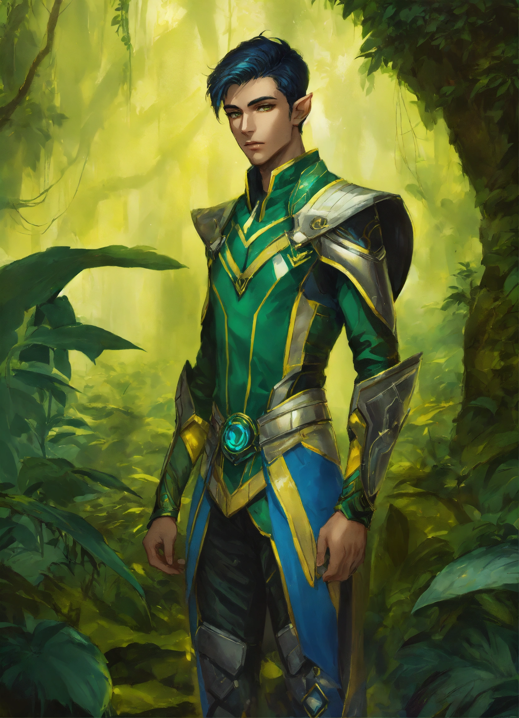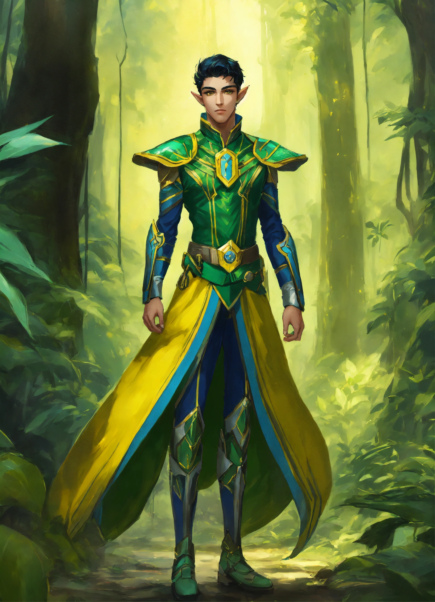 Full body drawing of a sci fi high elf, royalty, futuristic, green cybernetic royal outfit with blue and yellow trim, short black hair, fair skinned, amber eyes, elf, male, handsome, stoic, 21 years old, clean shaven, standing in a lush rainforest