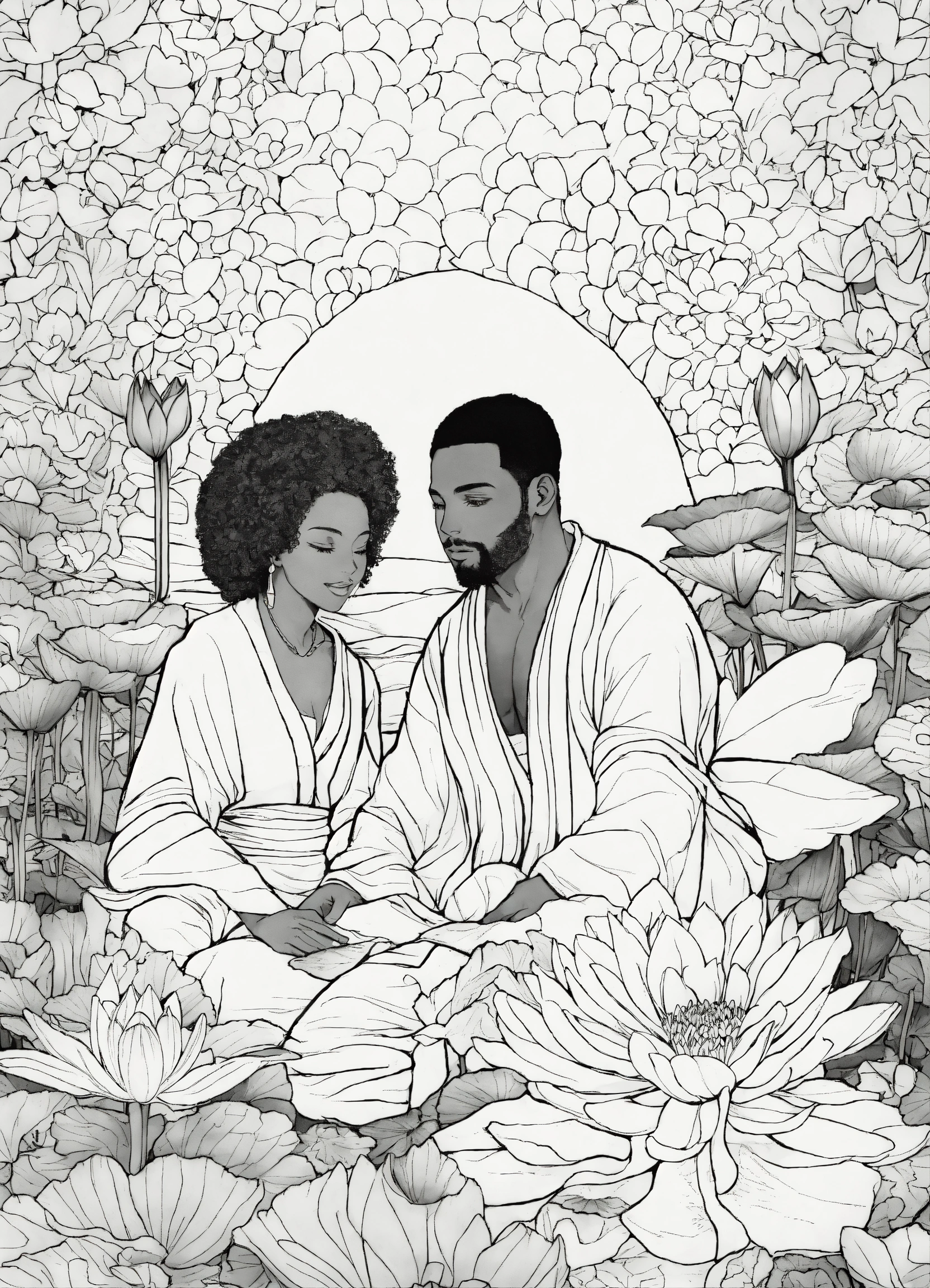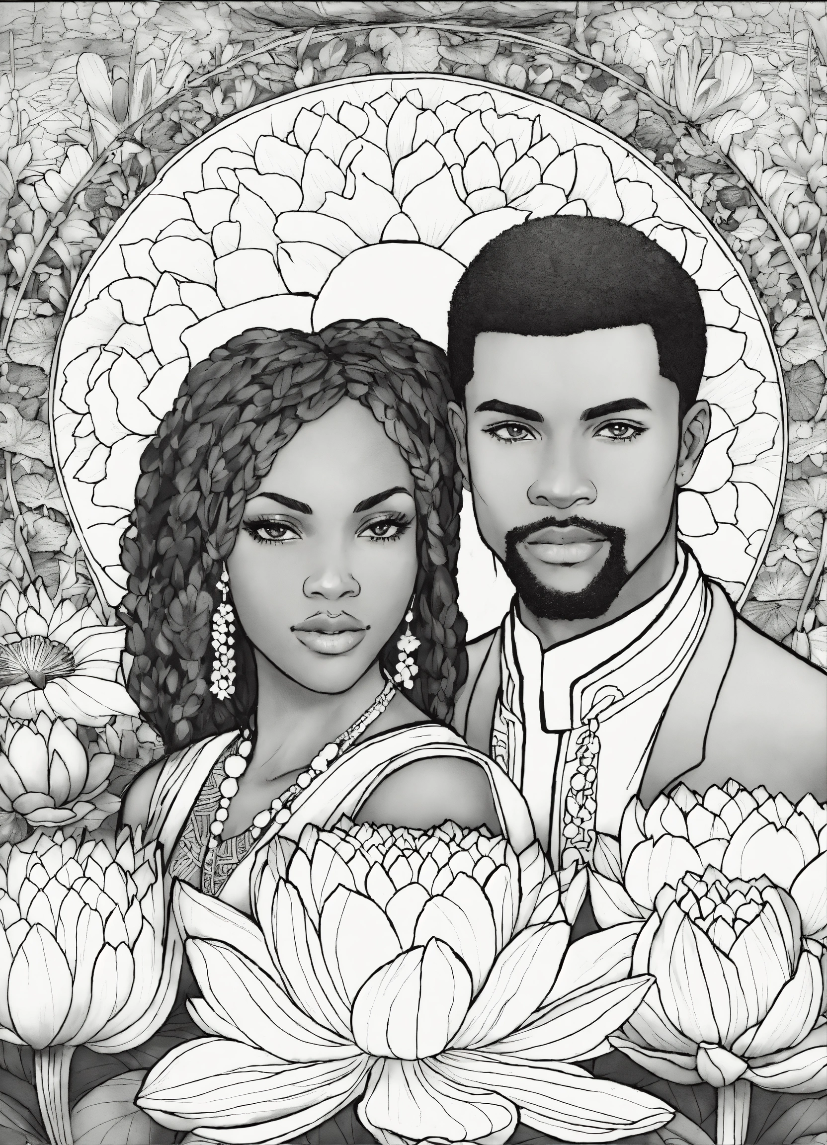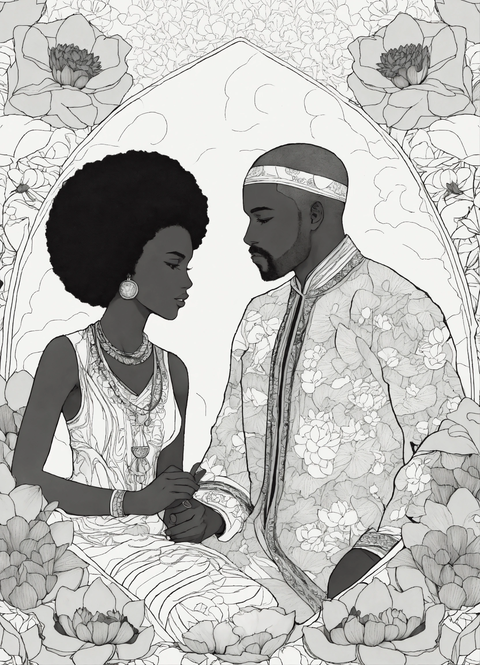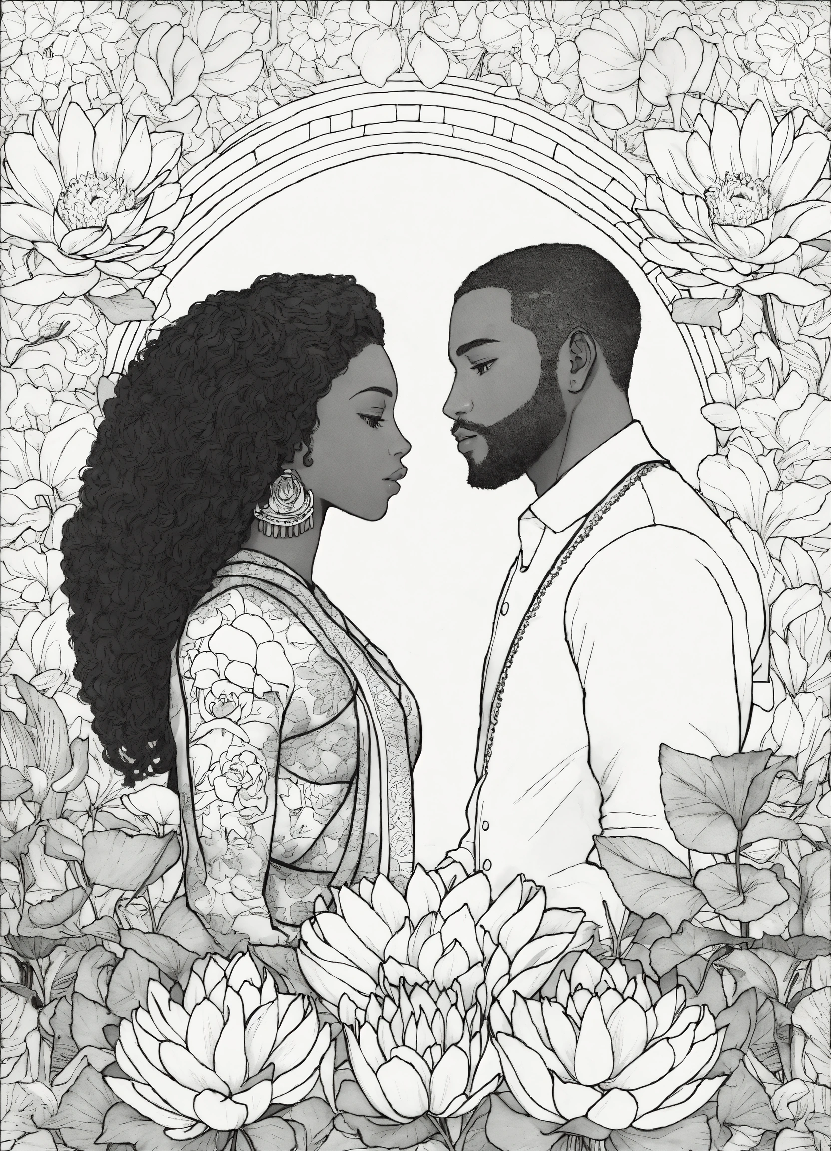Black and white coloring book image of african american man and woman