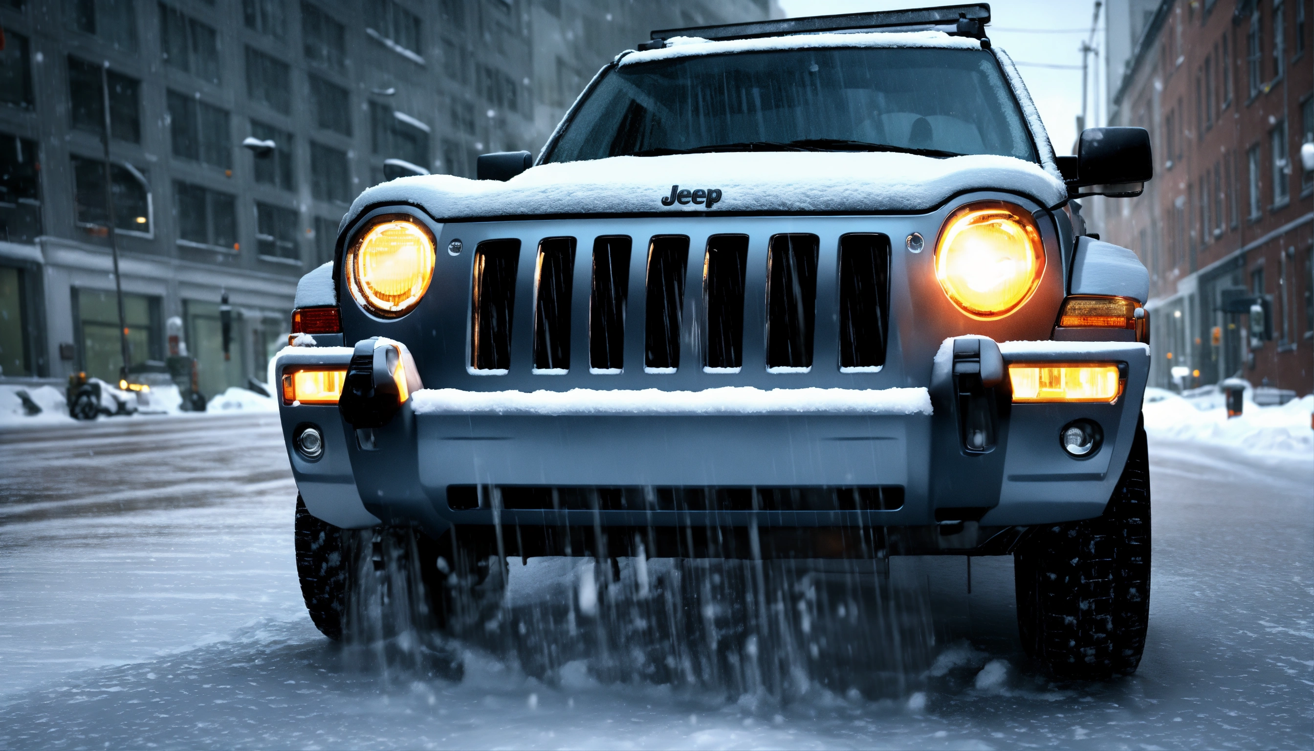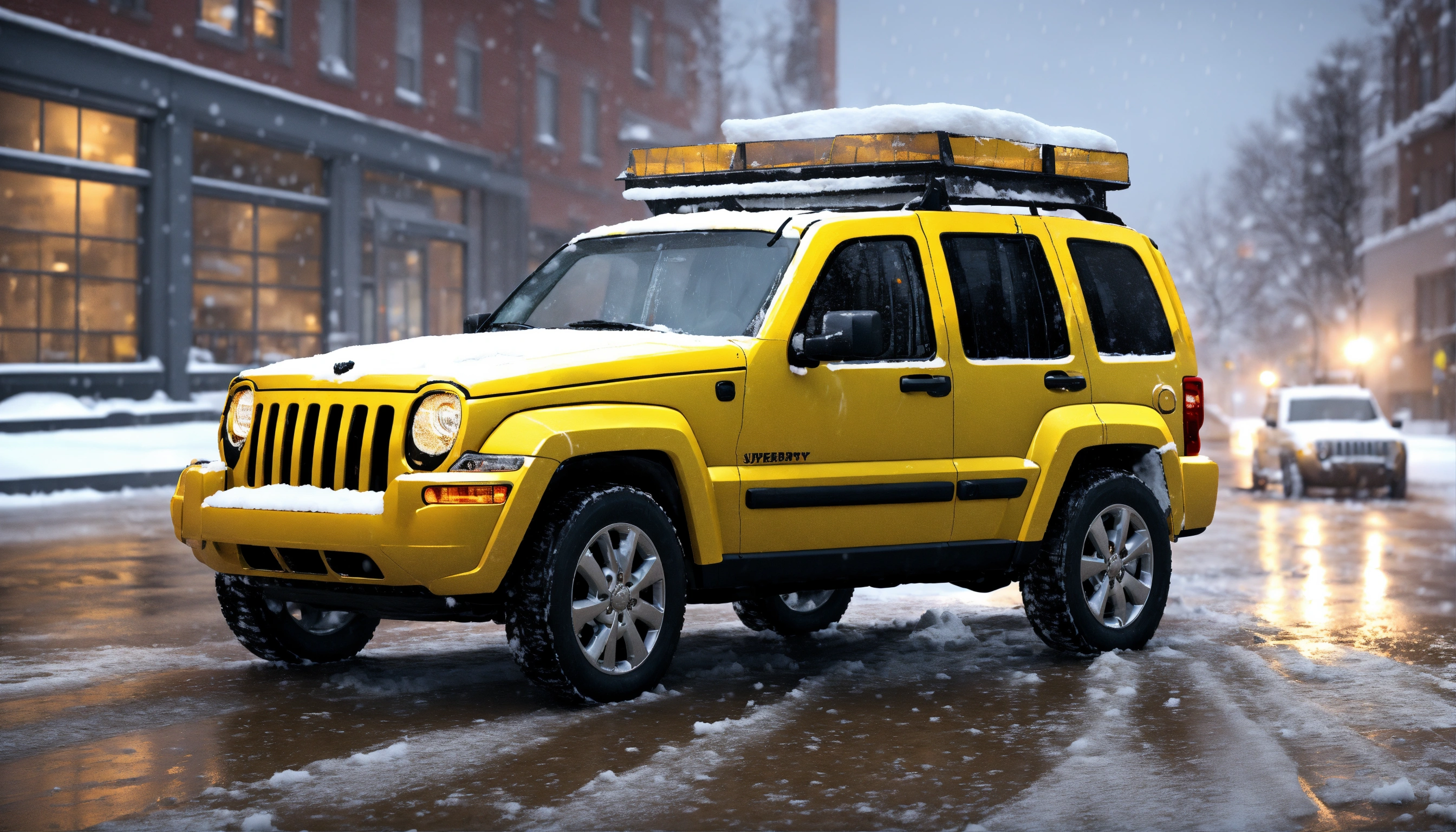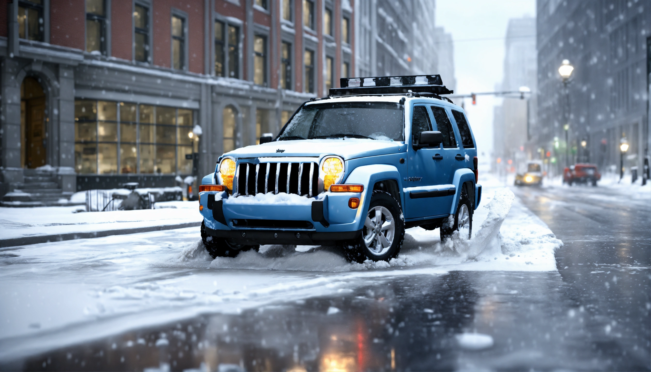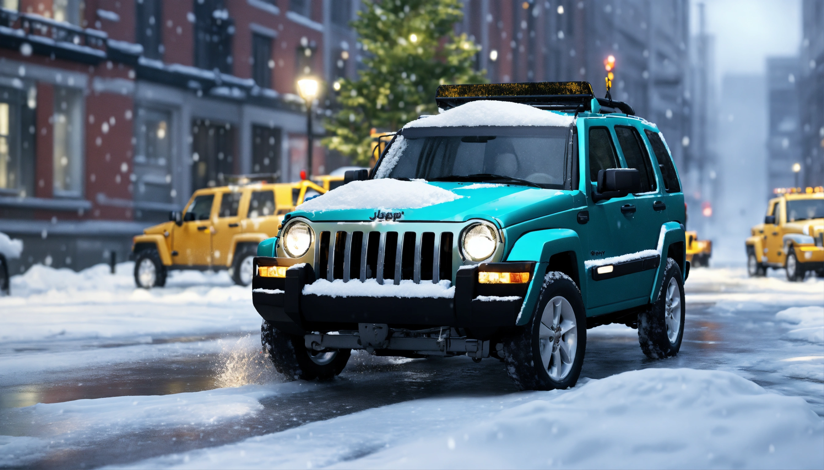 Jeep liberty 2006 with snow plow mounted in front on it, in city, snow, storm, rain, 3d render, cinematic