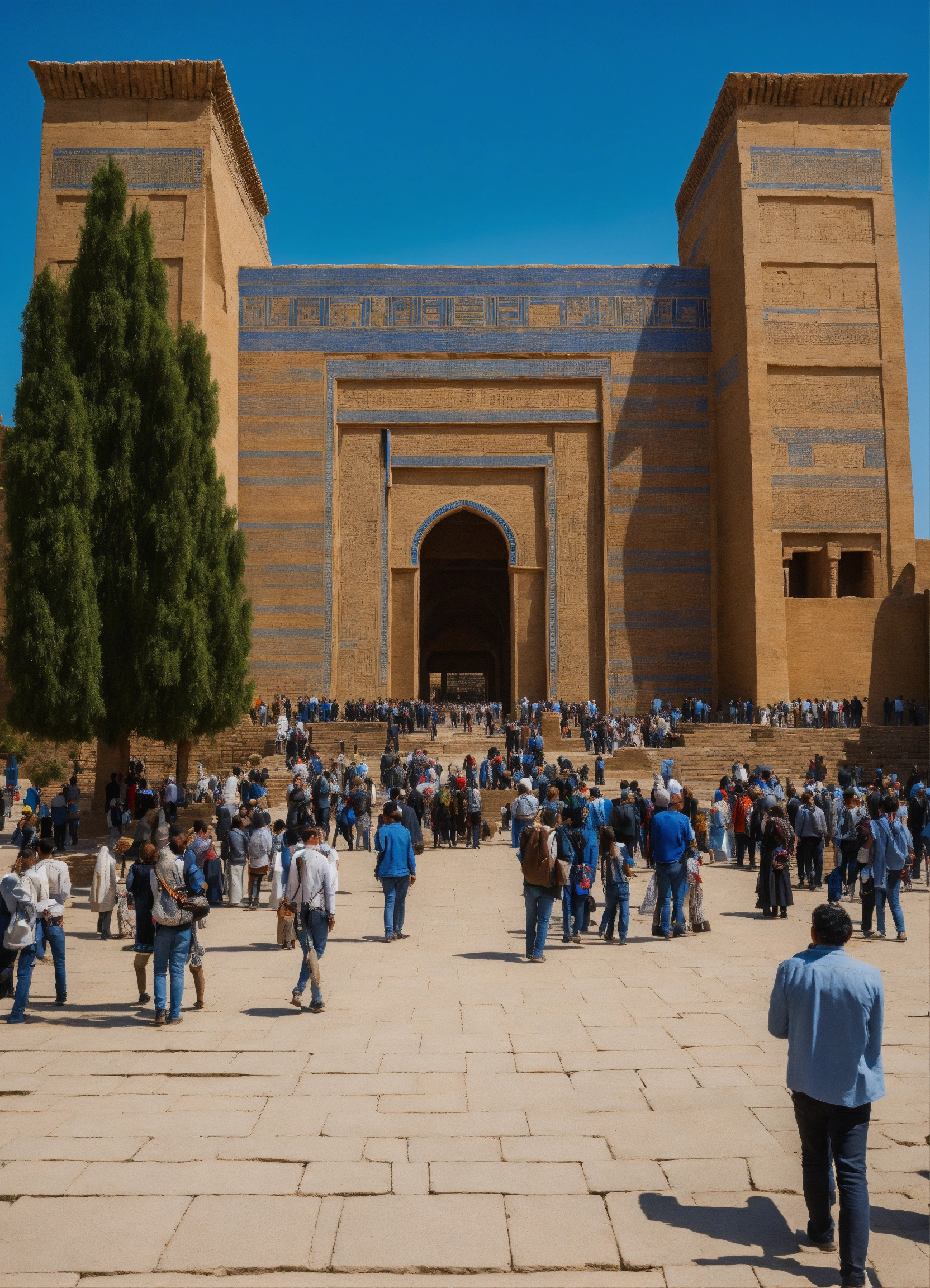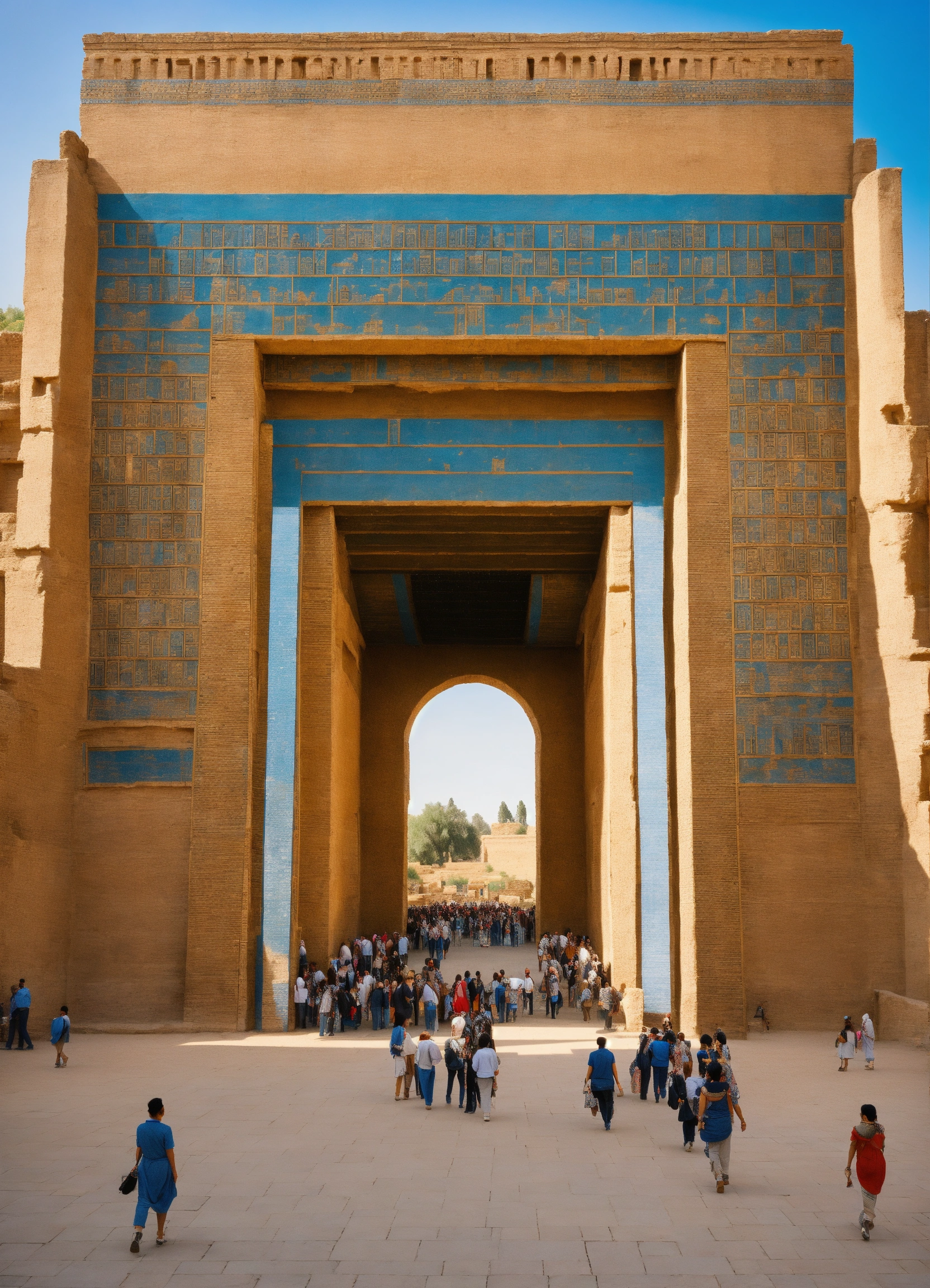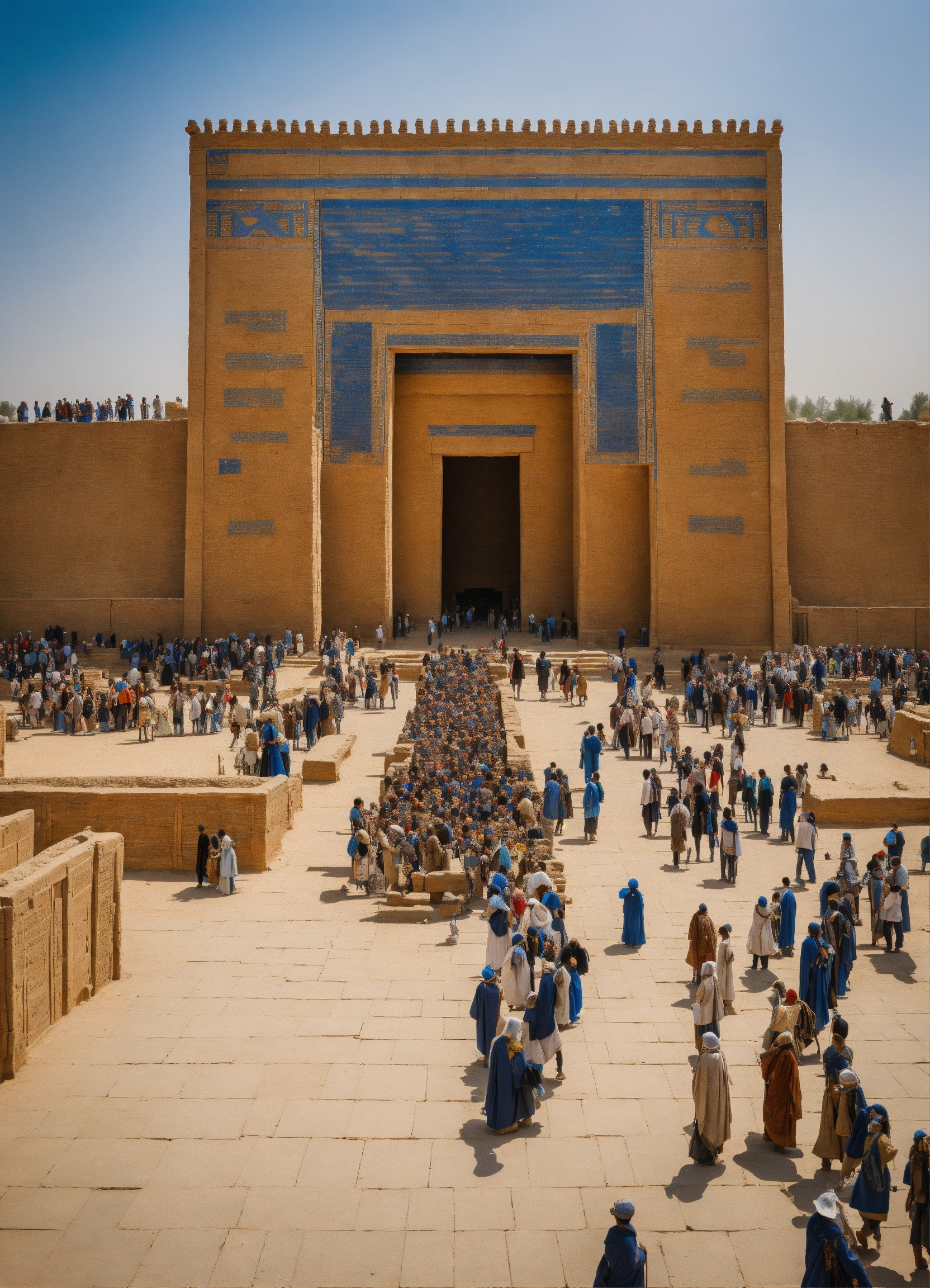 The ishtar gate in its full glory, view from far, massive gate, surrounded by ancient people going in and out of the ccity