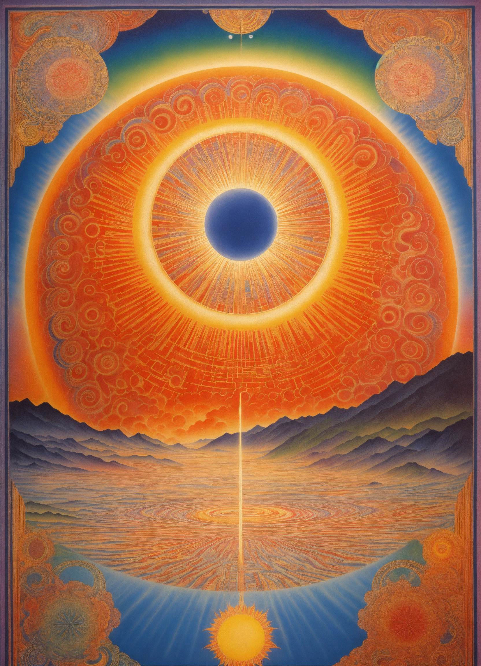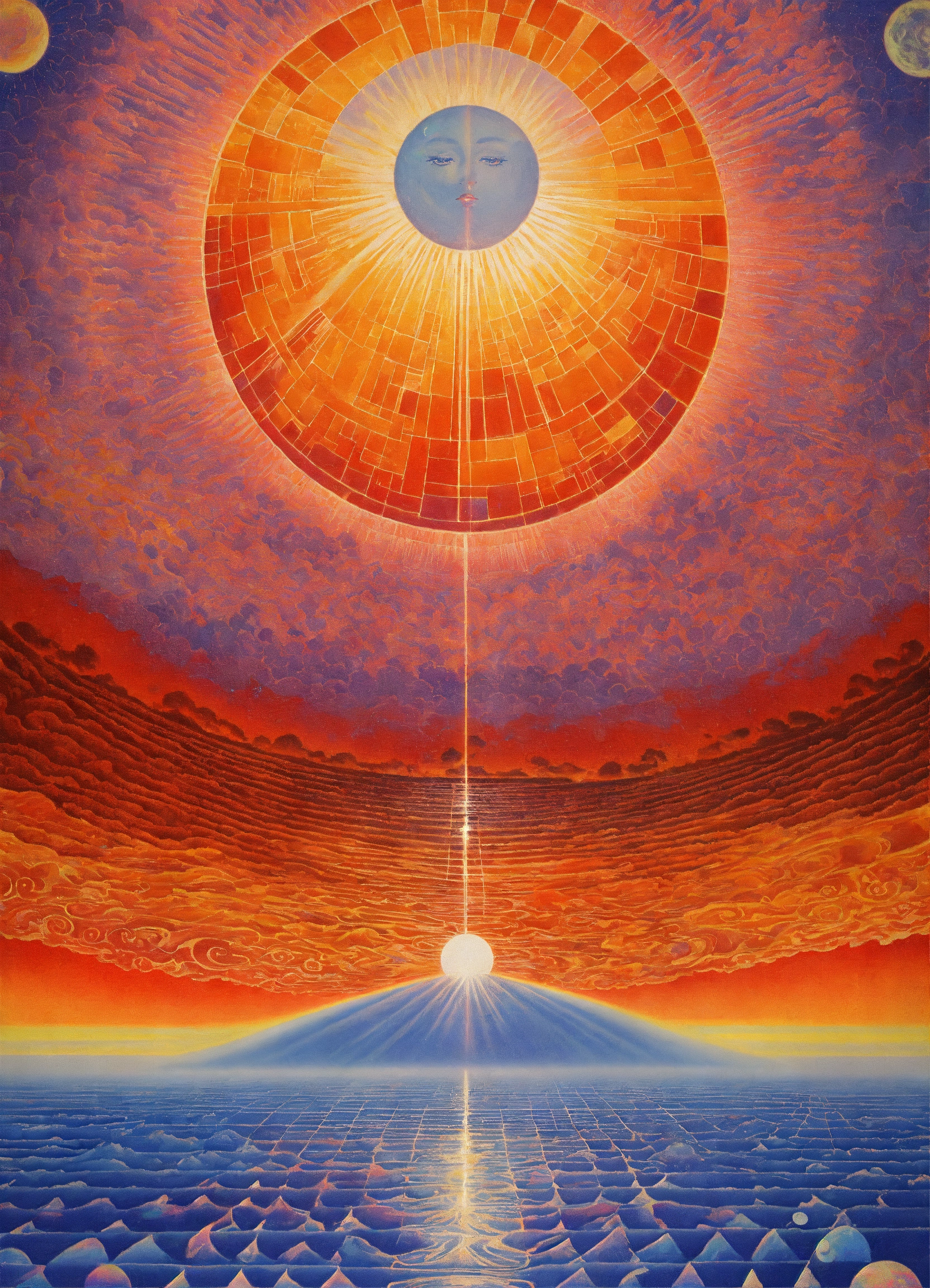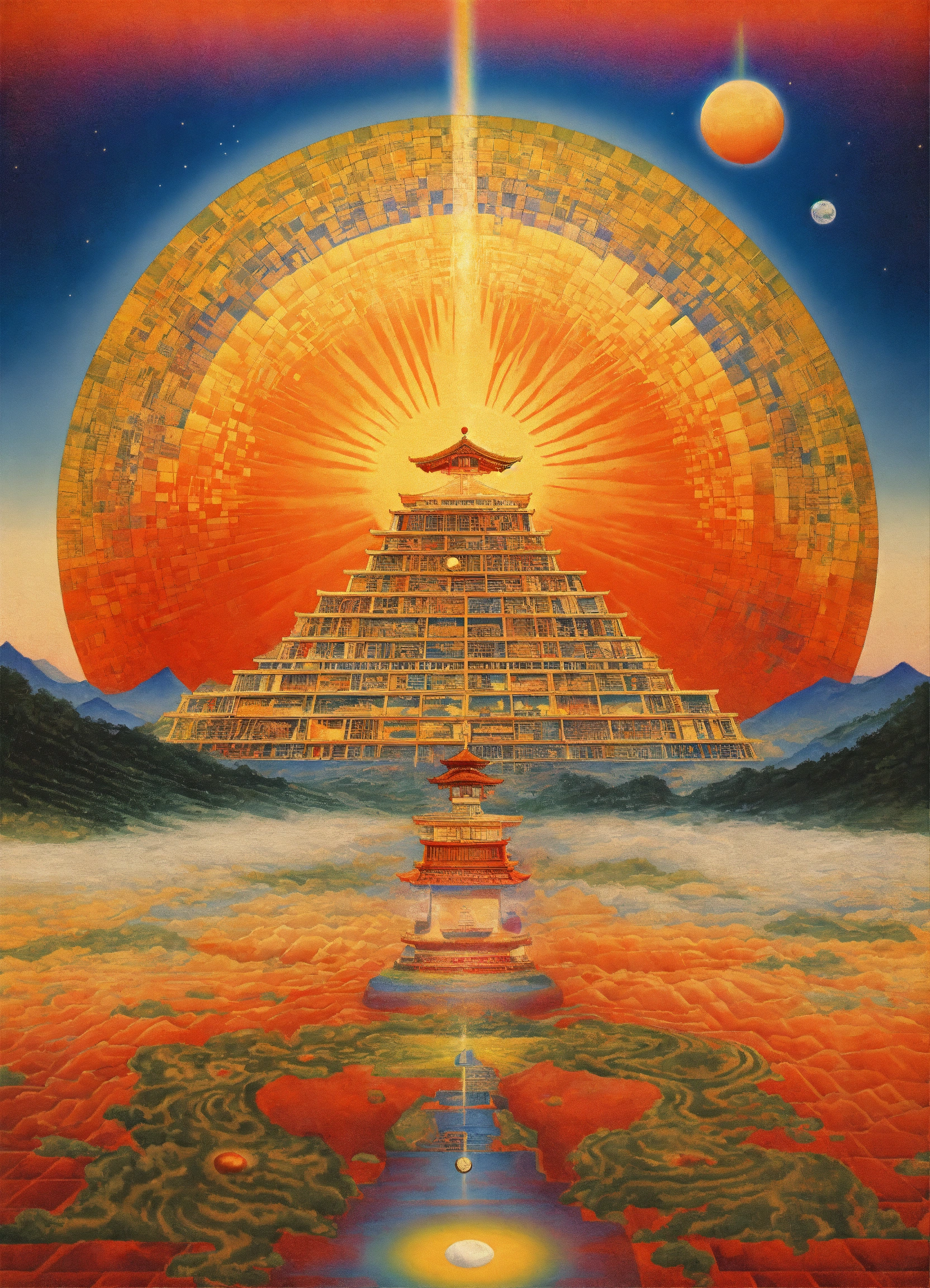 Japanese vintage poster, oriental, sun merging into moon, dream dimension breathing, psychedelic, nebula, the four corners of the world, rainbow checkerboard patterns by alex grey