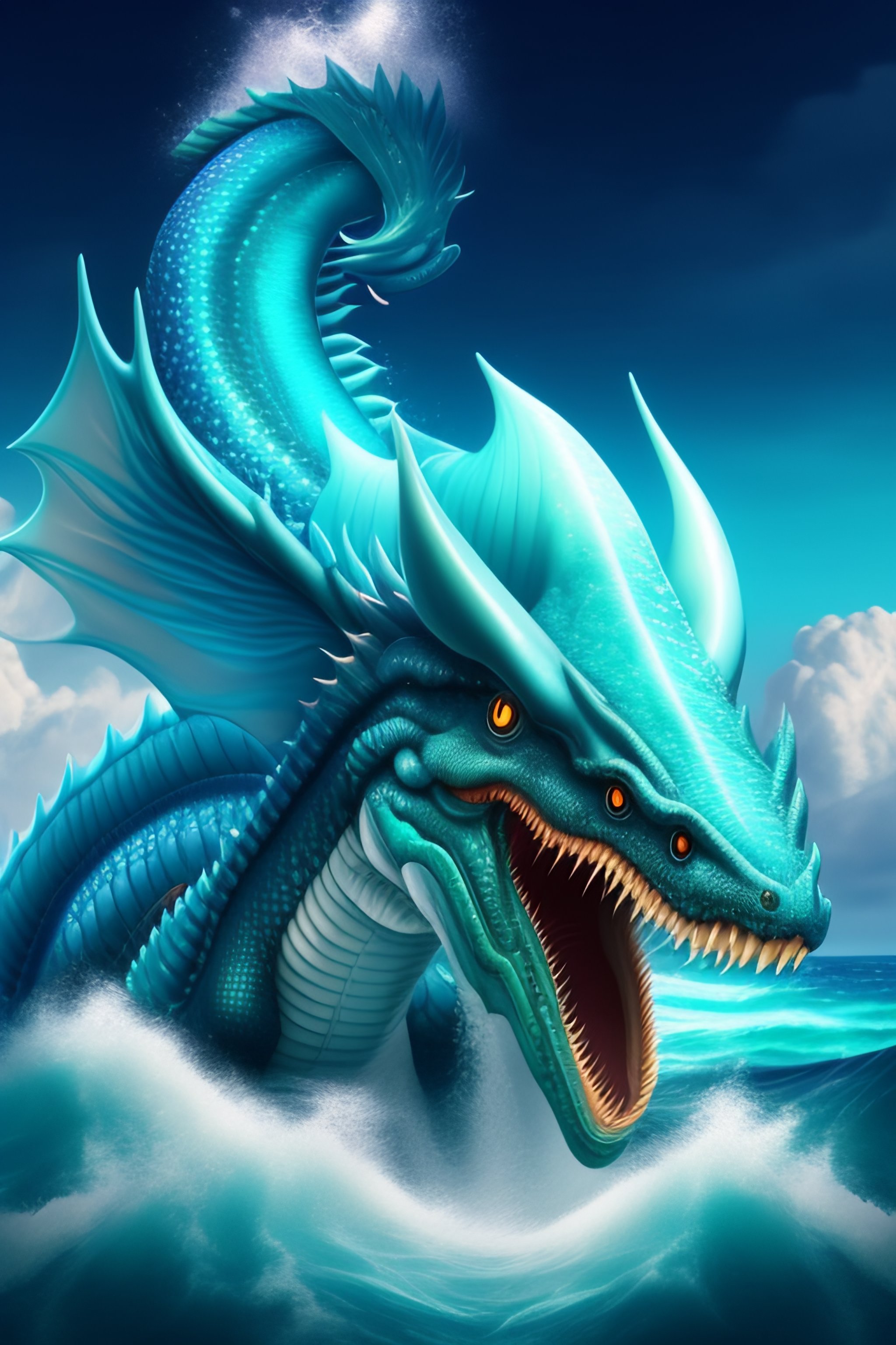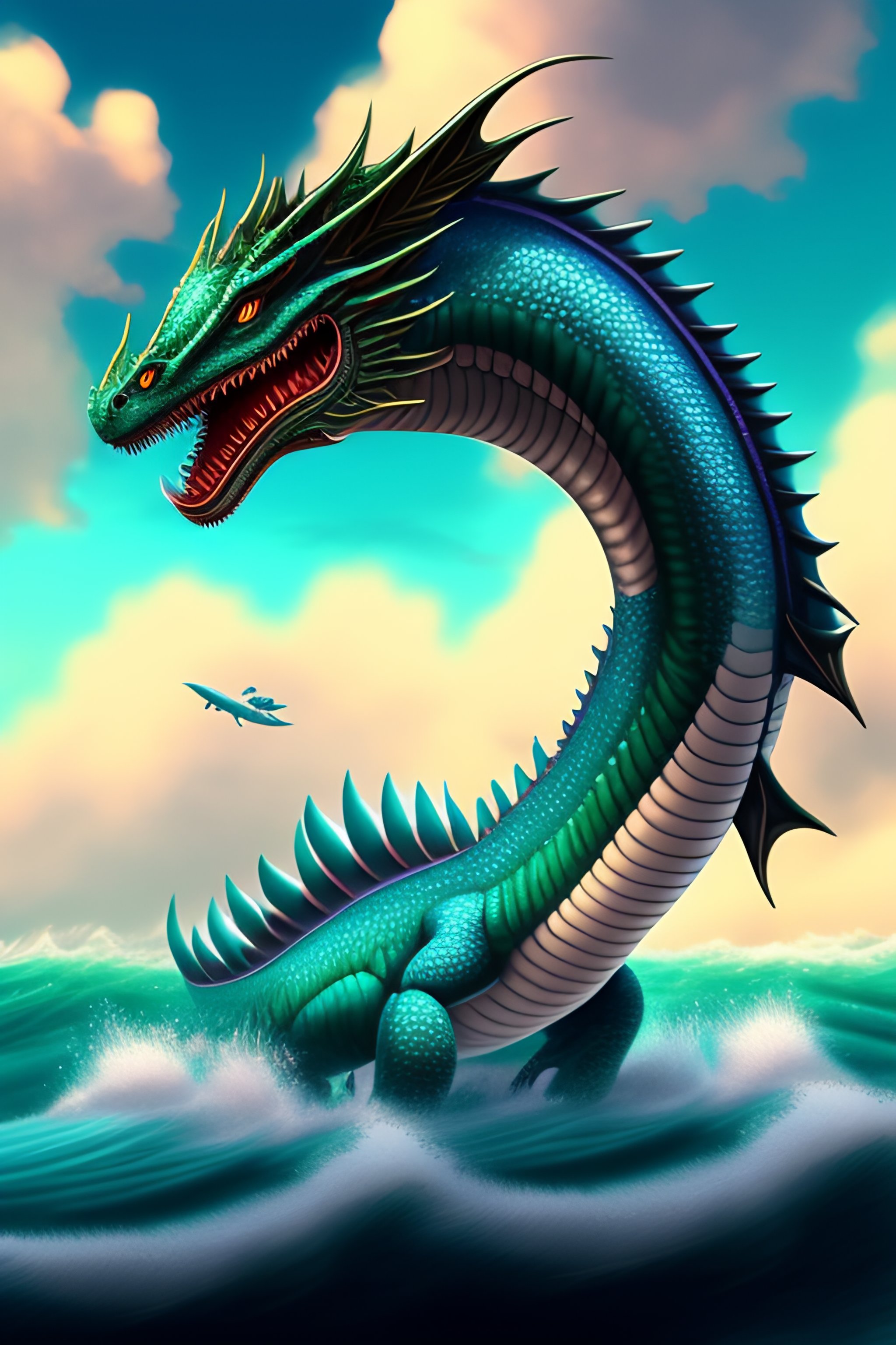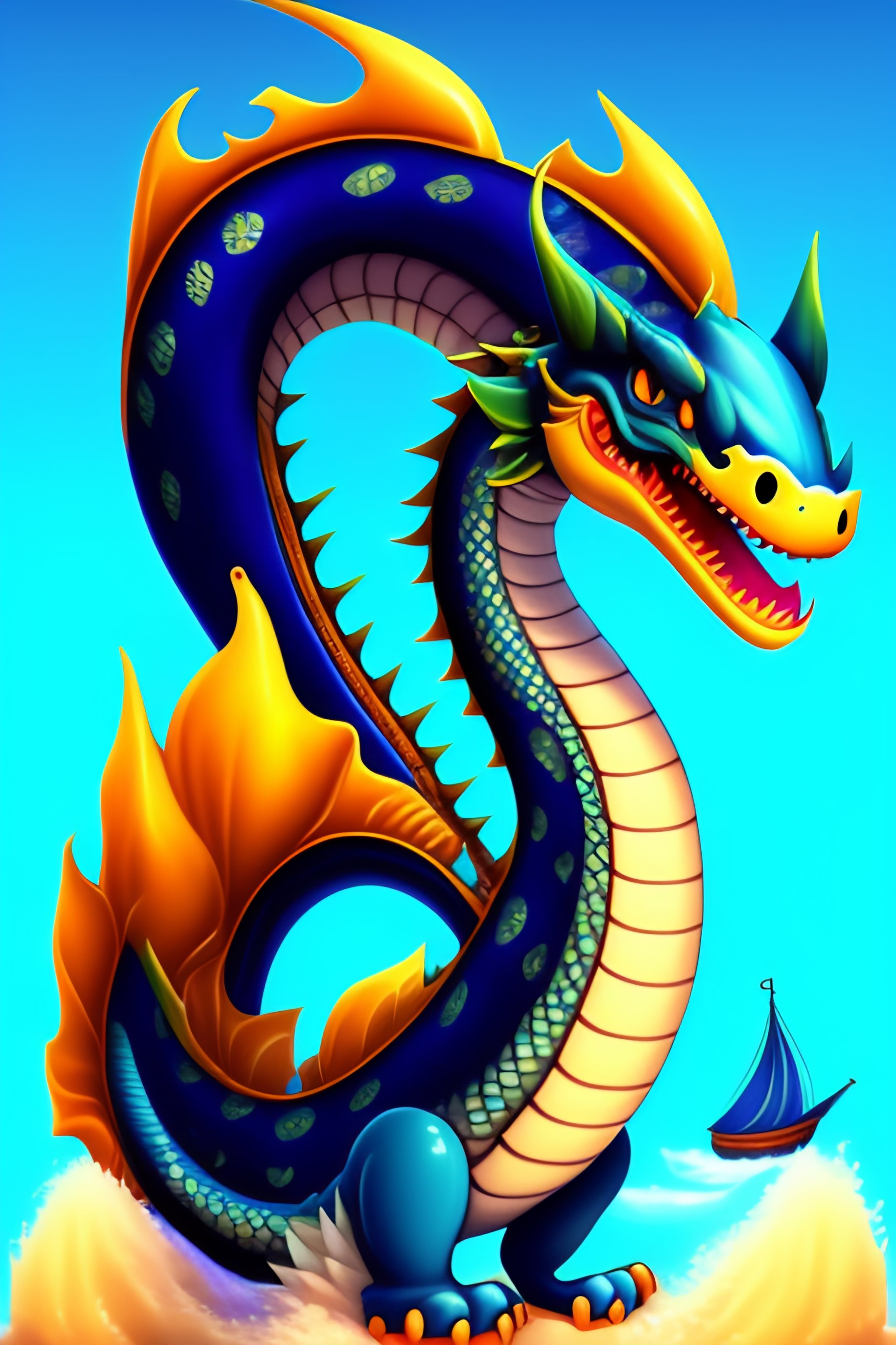 A ferocious creature that looks like a giant sea serpent dragon in the art style of cute chibi with an ocean background