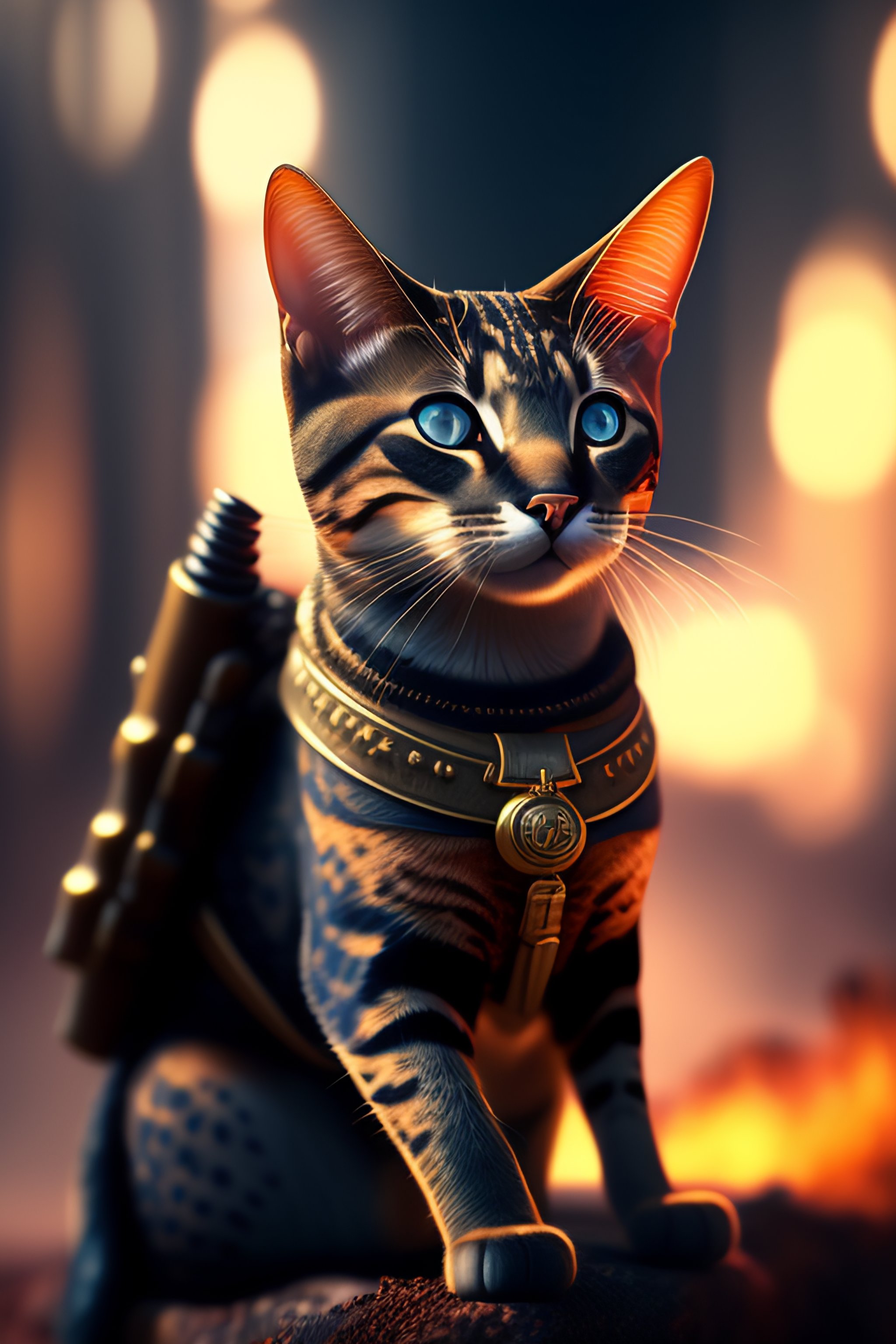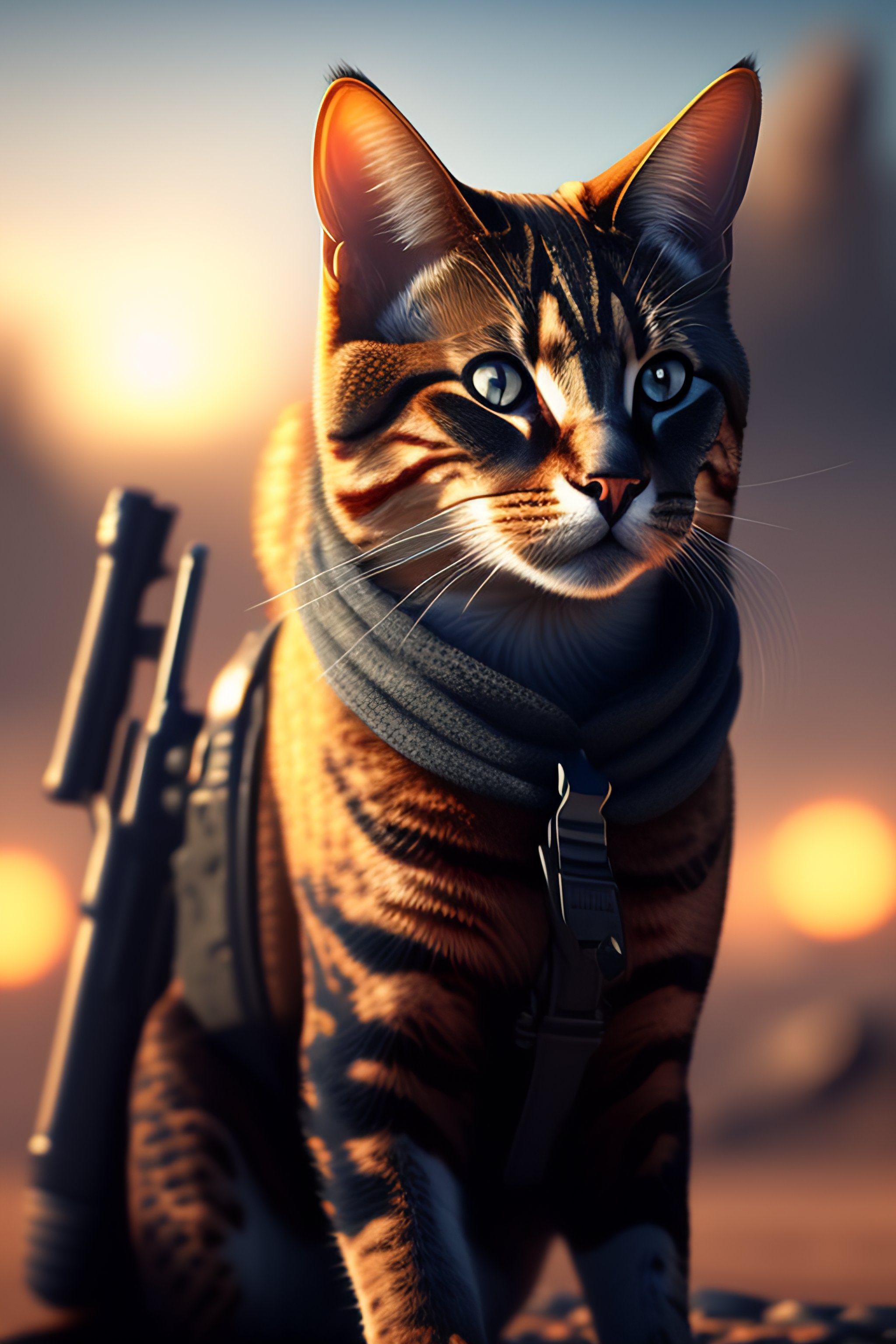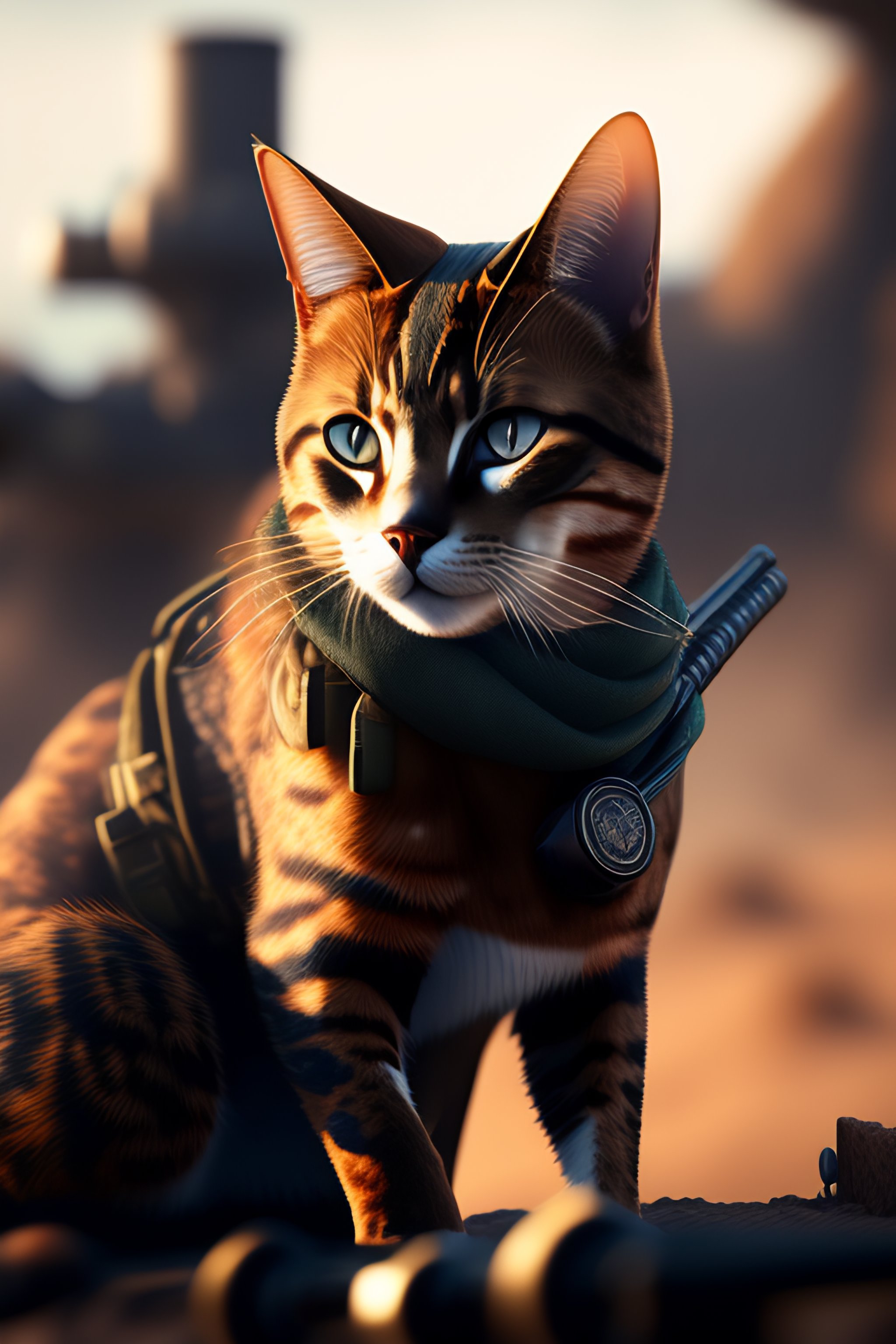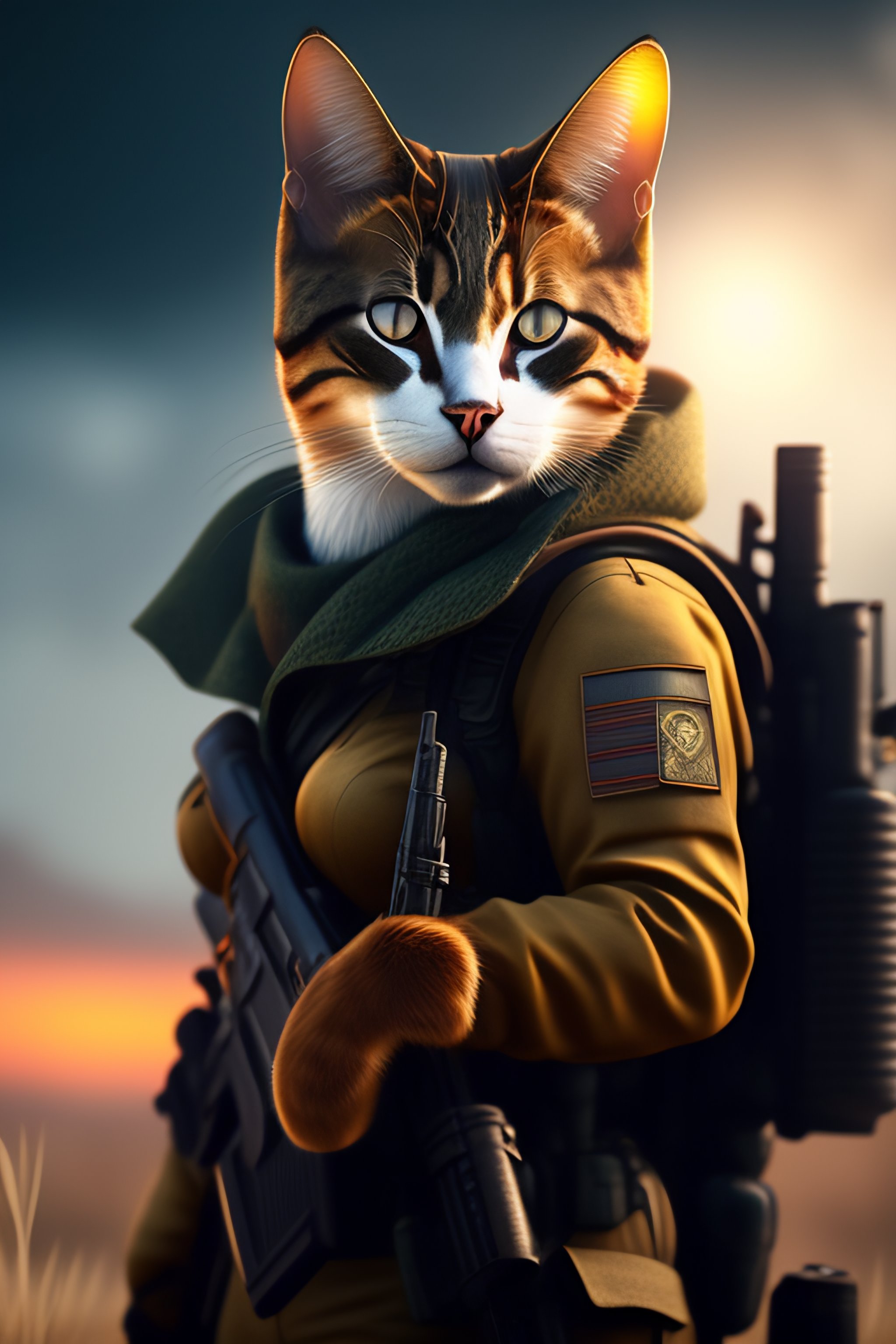 Ww2 style cat holding a remington rifle, war ravaged landscape, futuristic details, cinematic style, unreal engine, highly detailed, bokeh