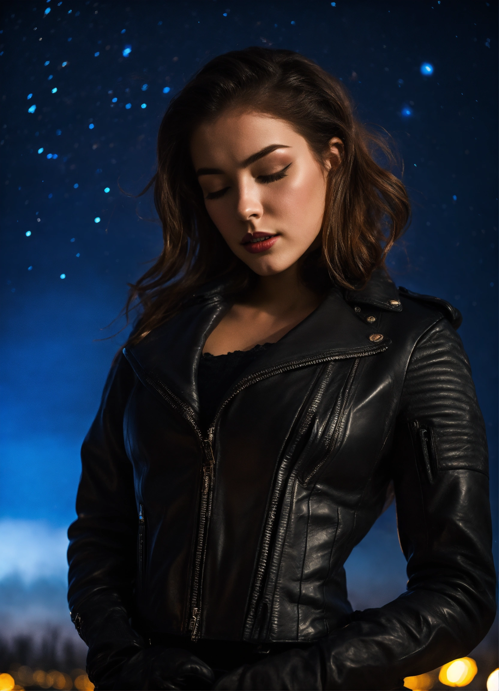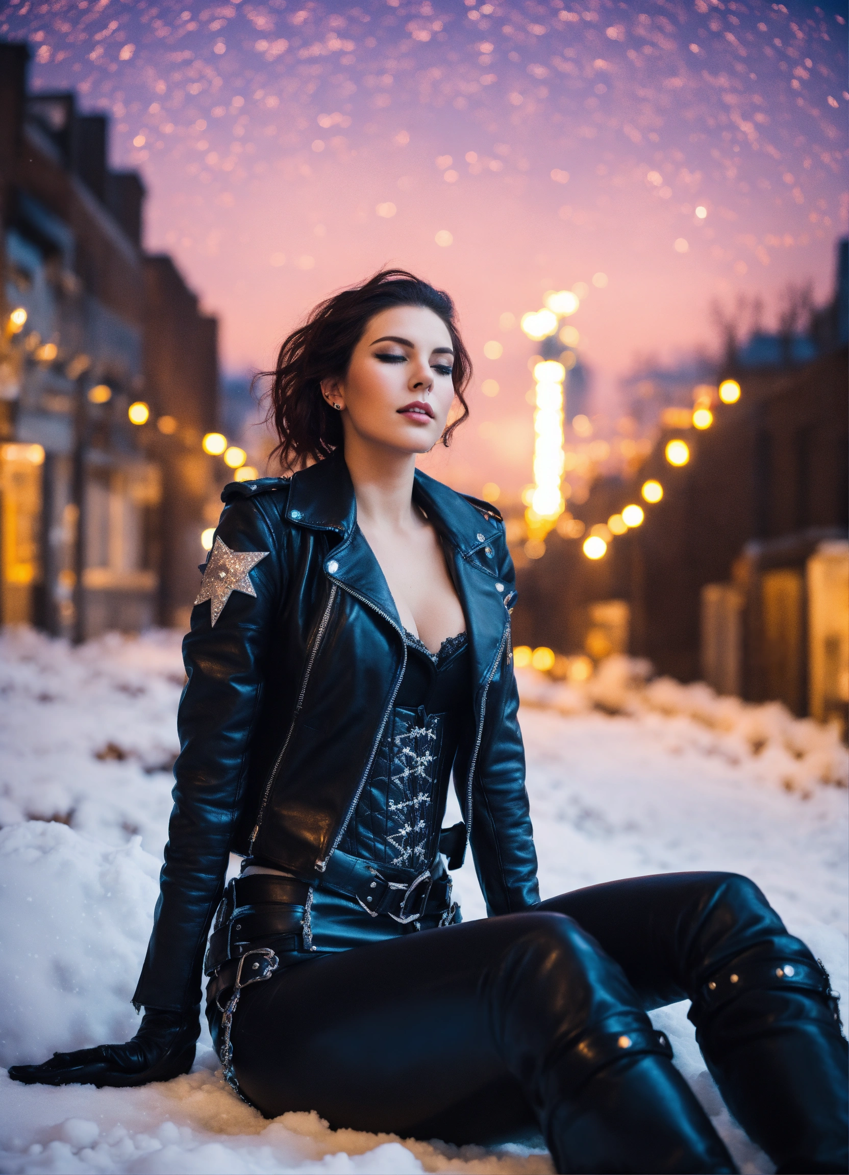 A real photo of a 25 year old metal woman with looking like a real version of sleeping beauty, wearing black leather jacket pants corsets and gloves. urban background in the sky we see stars. full body snow at night.