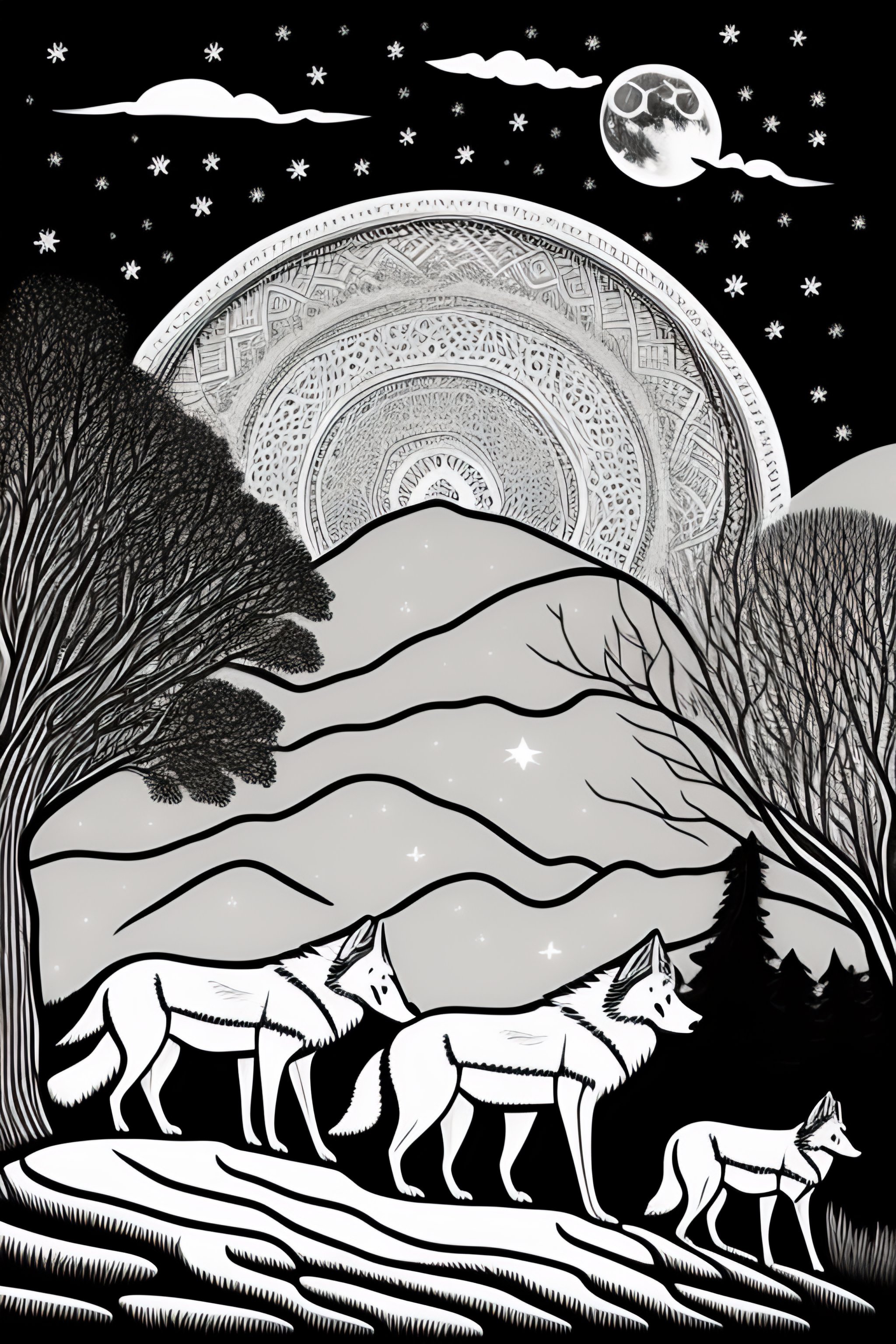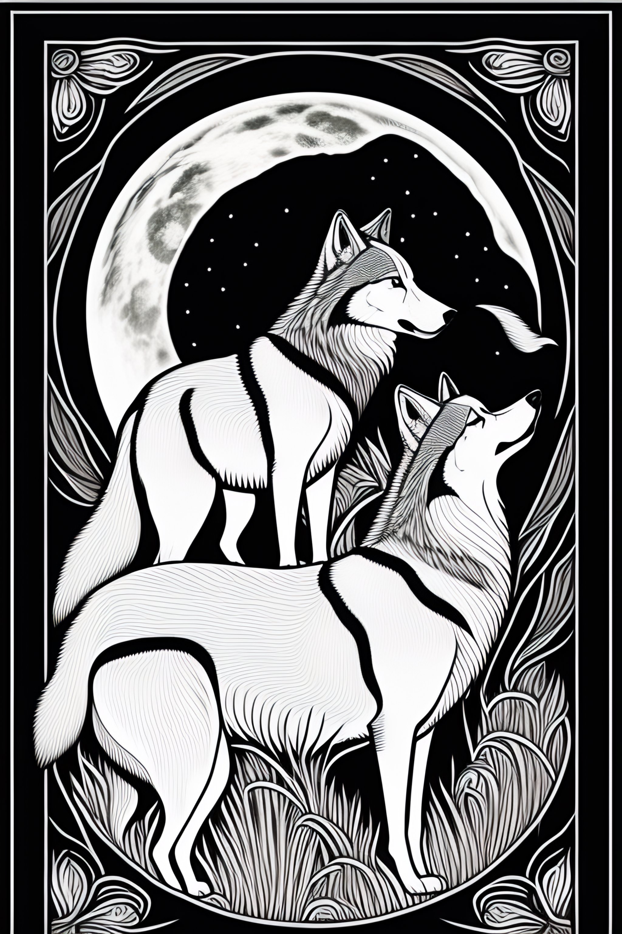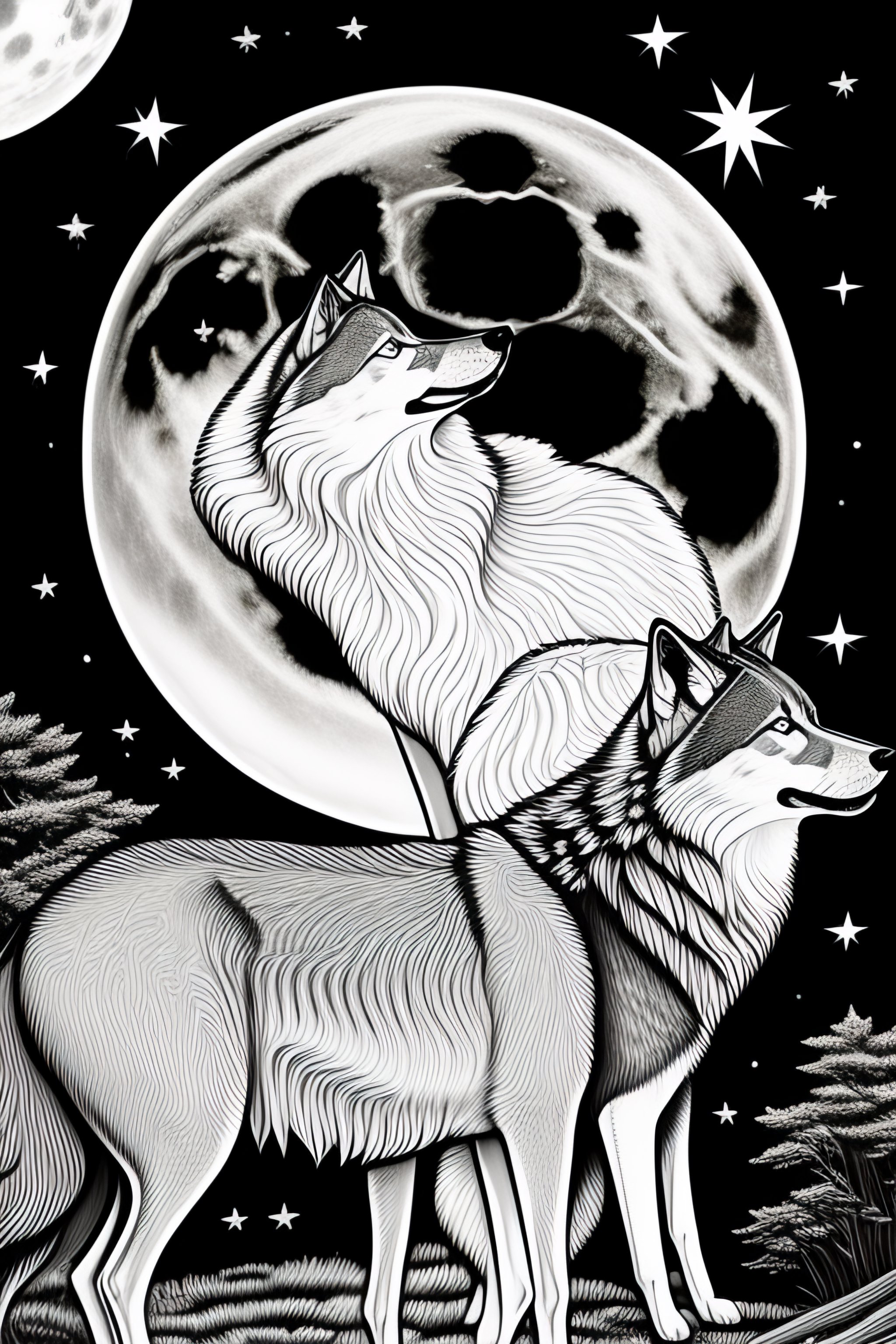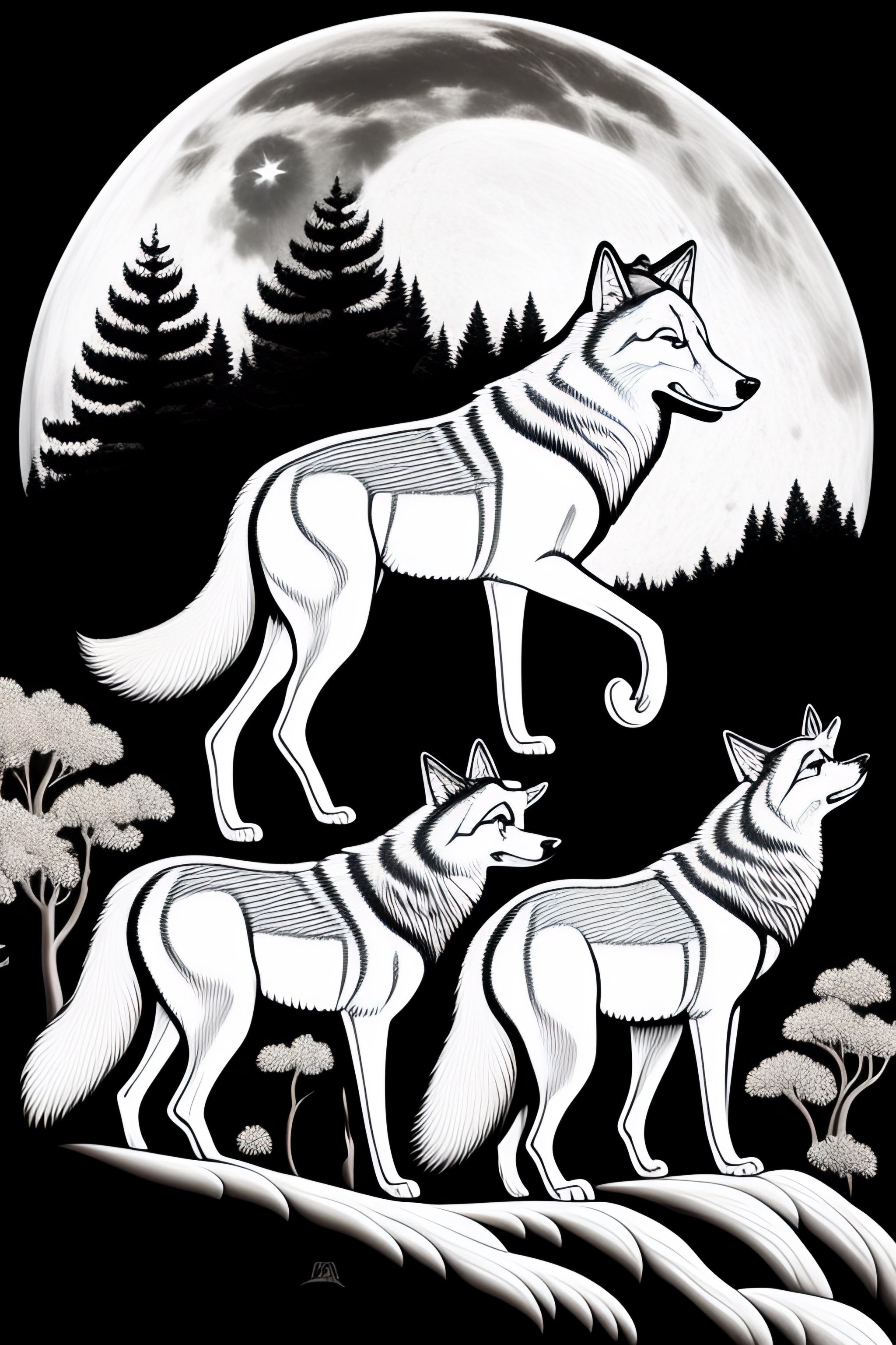 Coloring page of pack of wolves howling at the moon