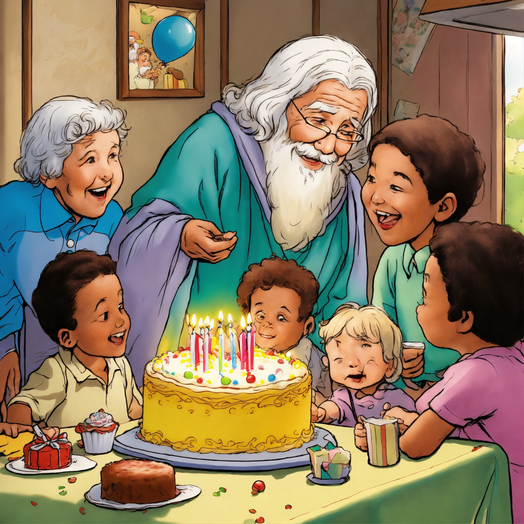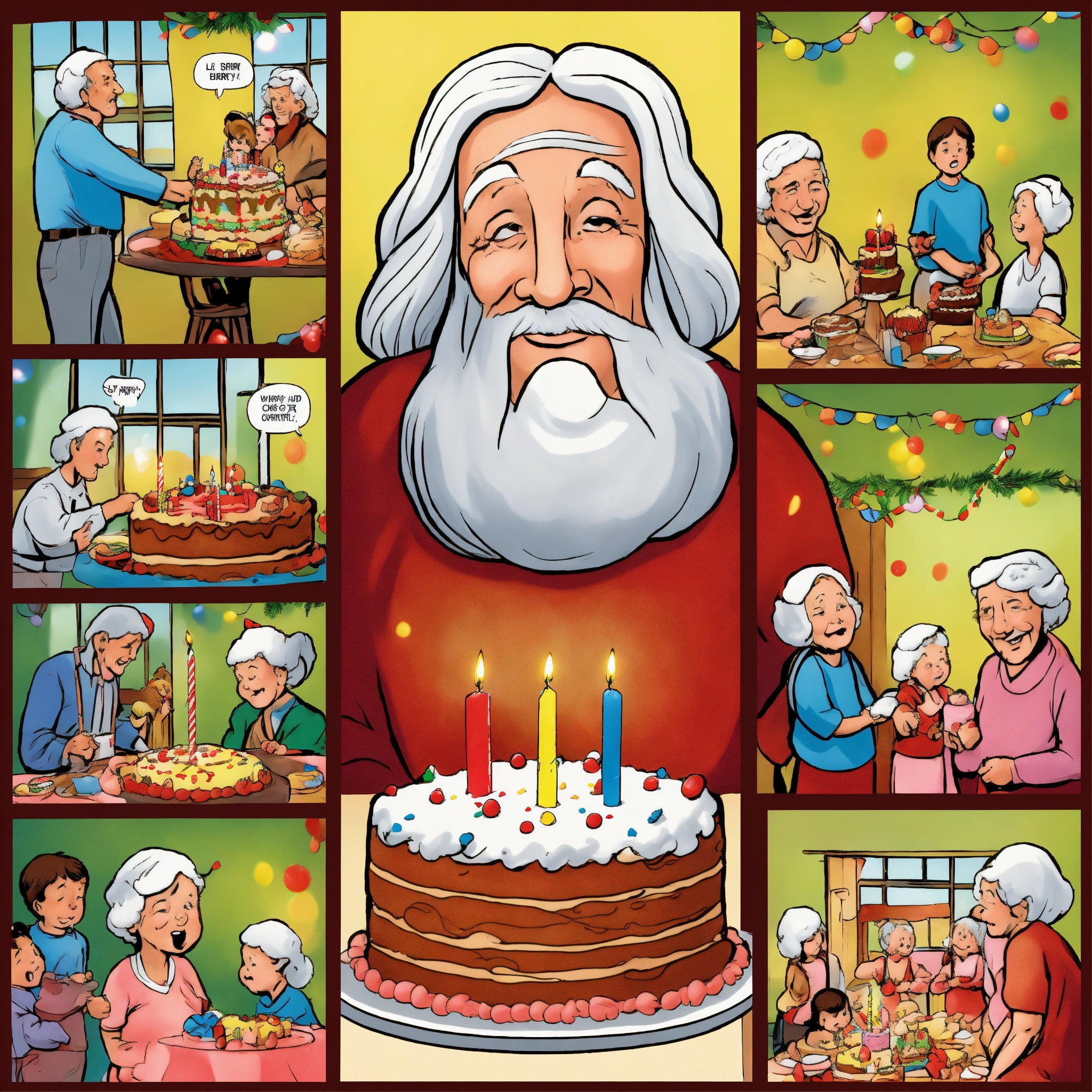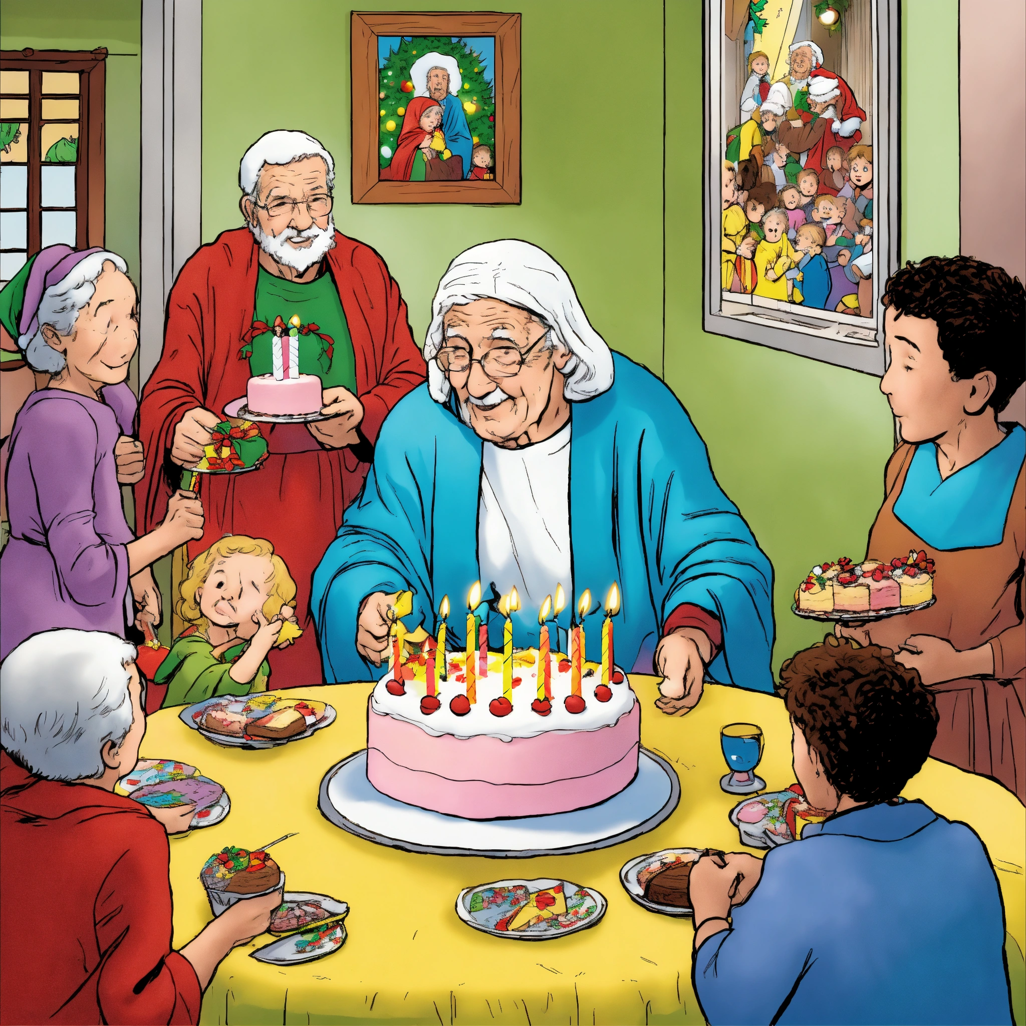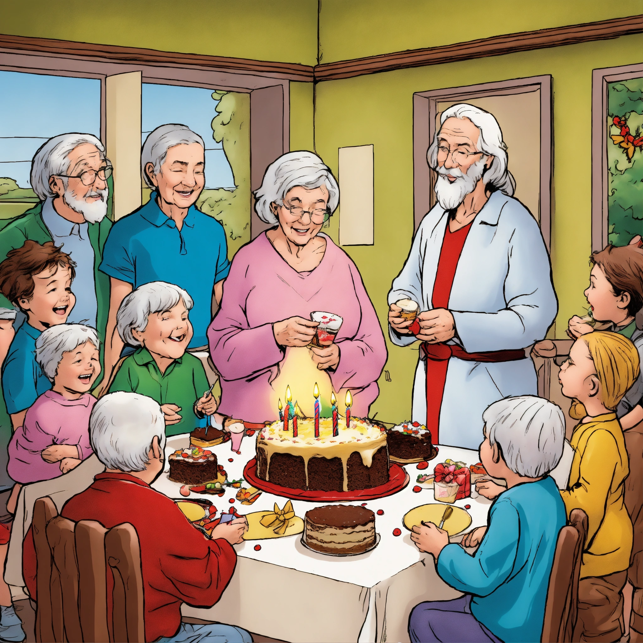 Birthday party, old lady, old man, young children, cake, picture of jesus on the wall, christmas, comic strip