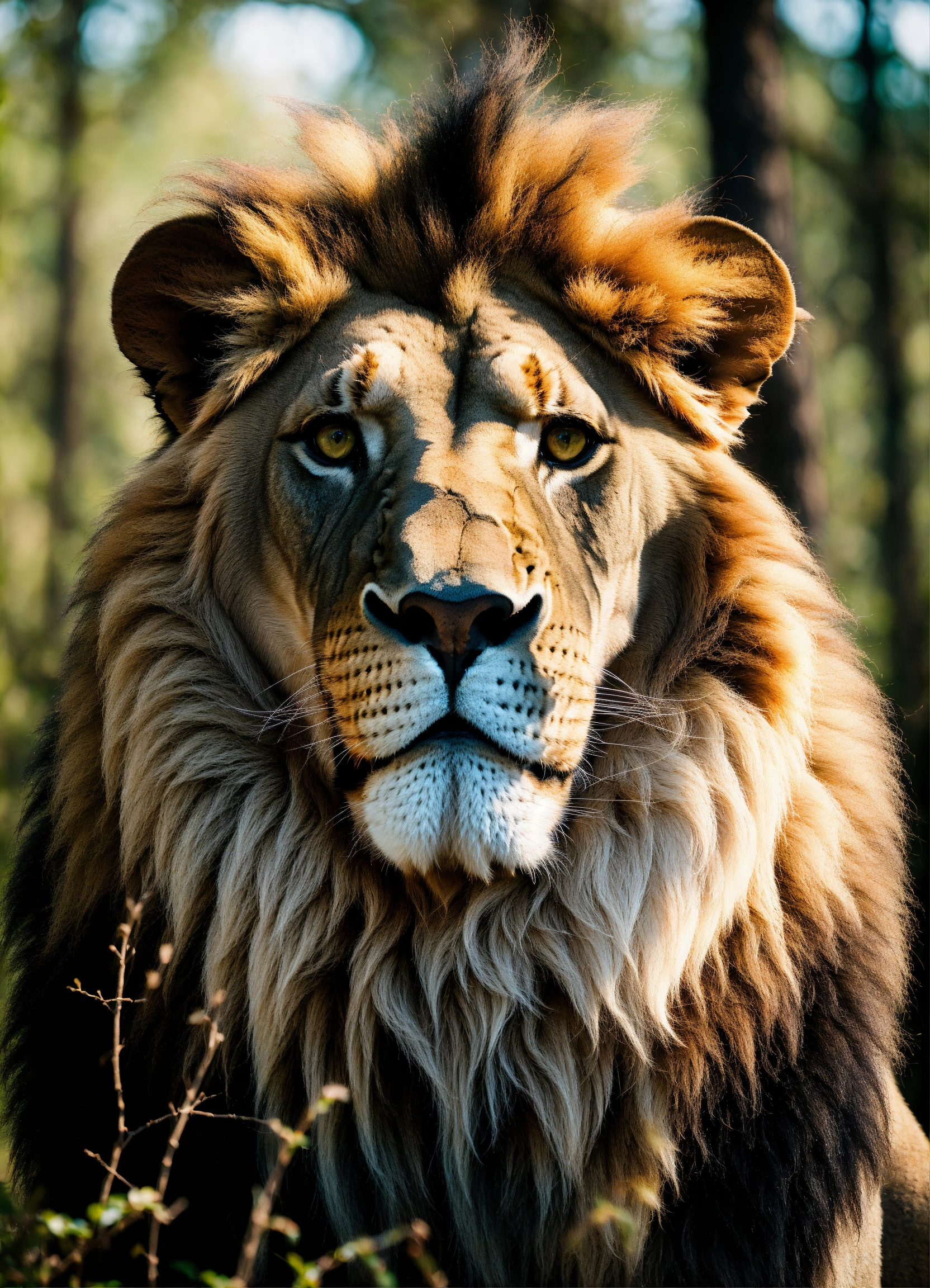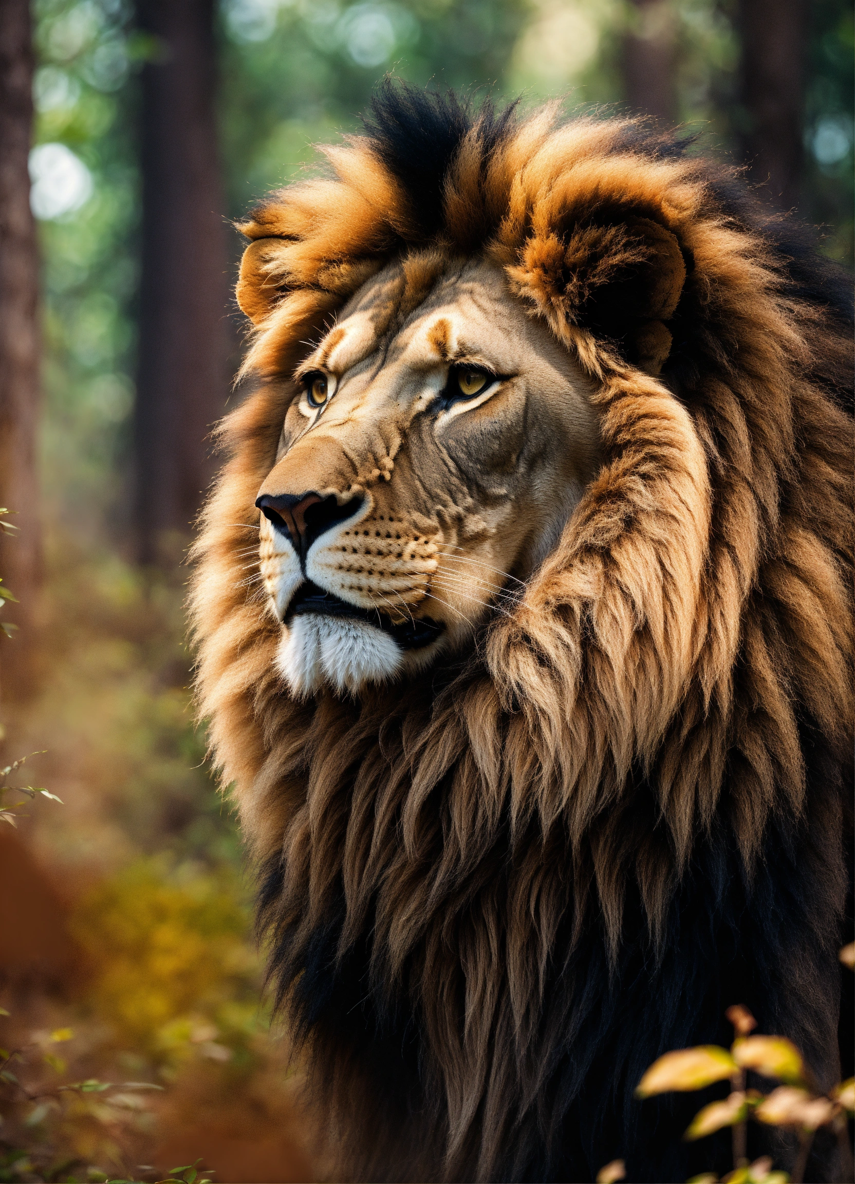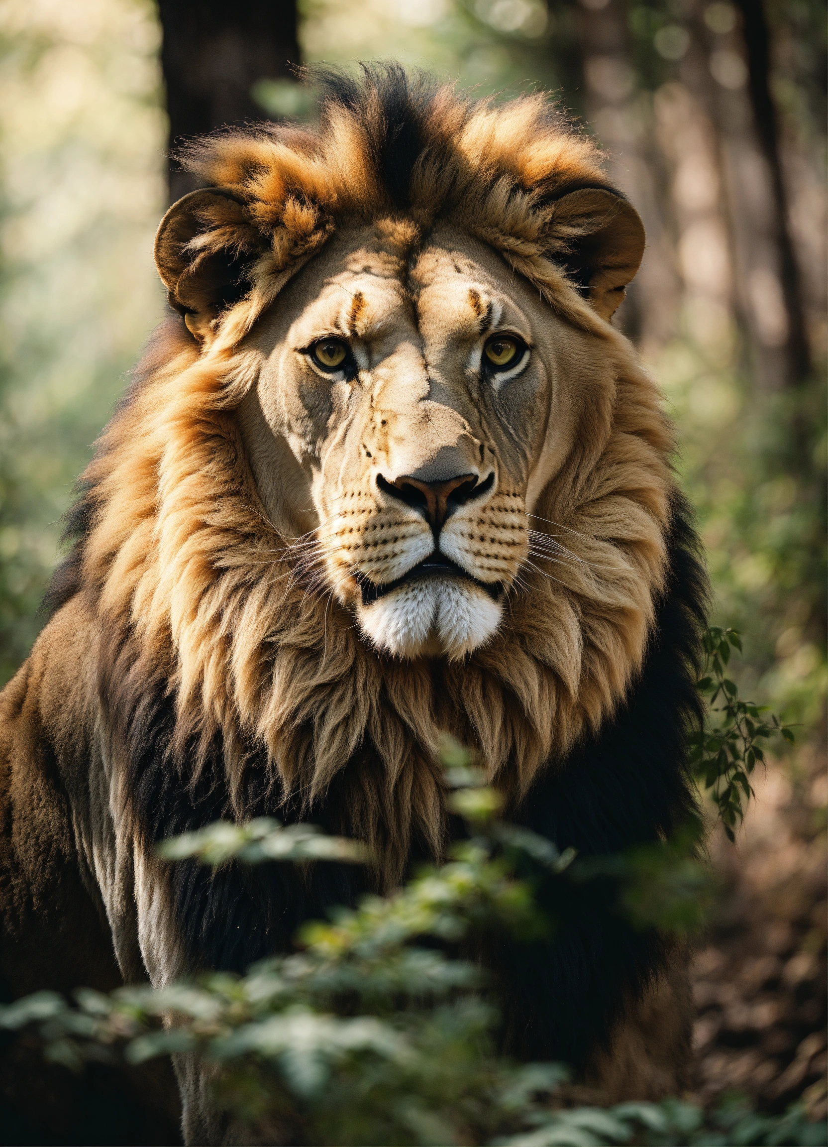 Muted portrait photography from the waist up titled "lion in a forest", muted palette, soft colors, detailed, 8k