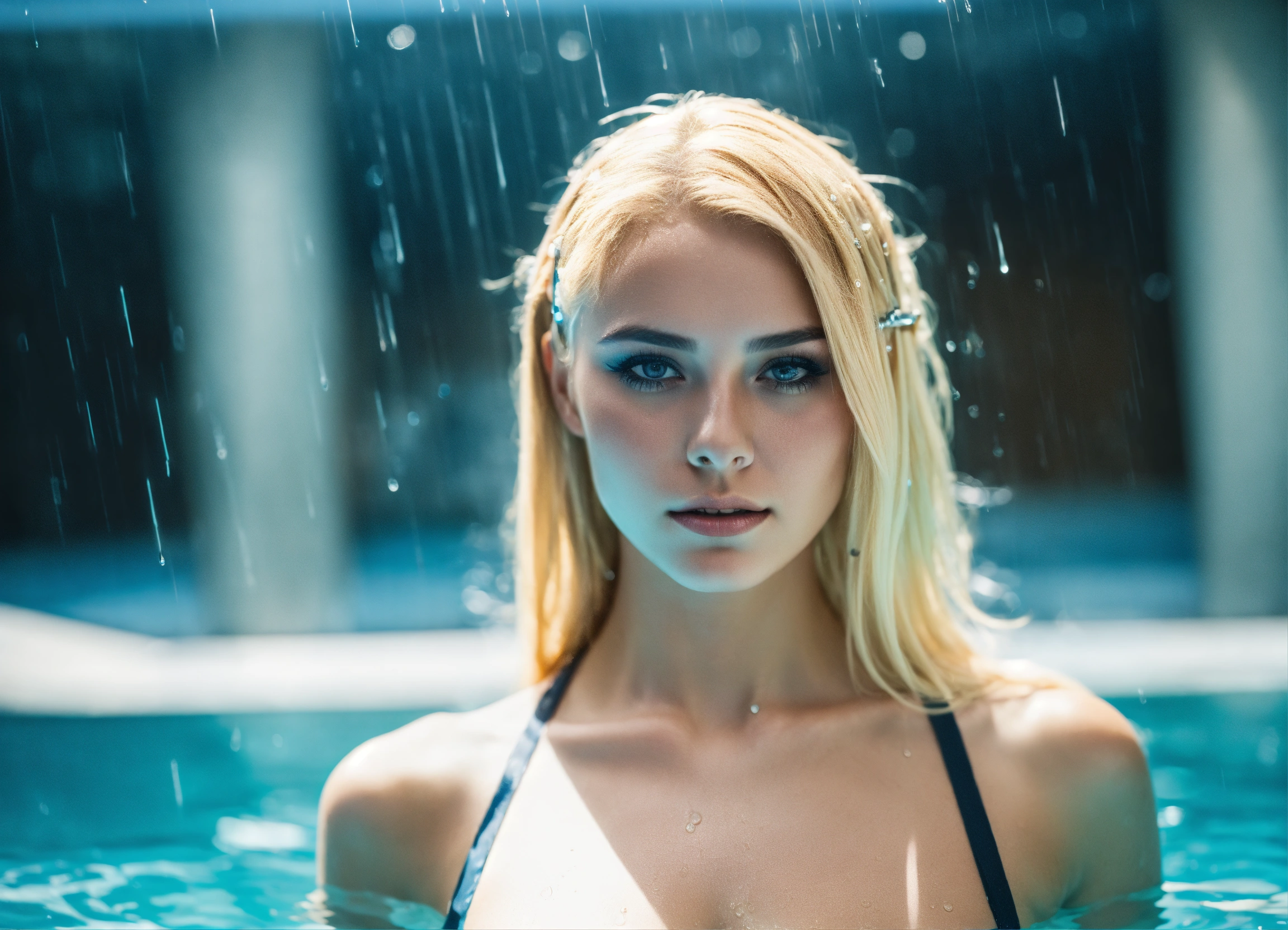 Closeup, photo, european girl sci-fi dream girl, futuristic, sunny weather, open shirt, wearing underwaee, 8k, make-up, in pool rain blond
