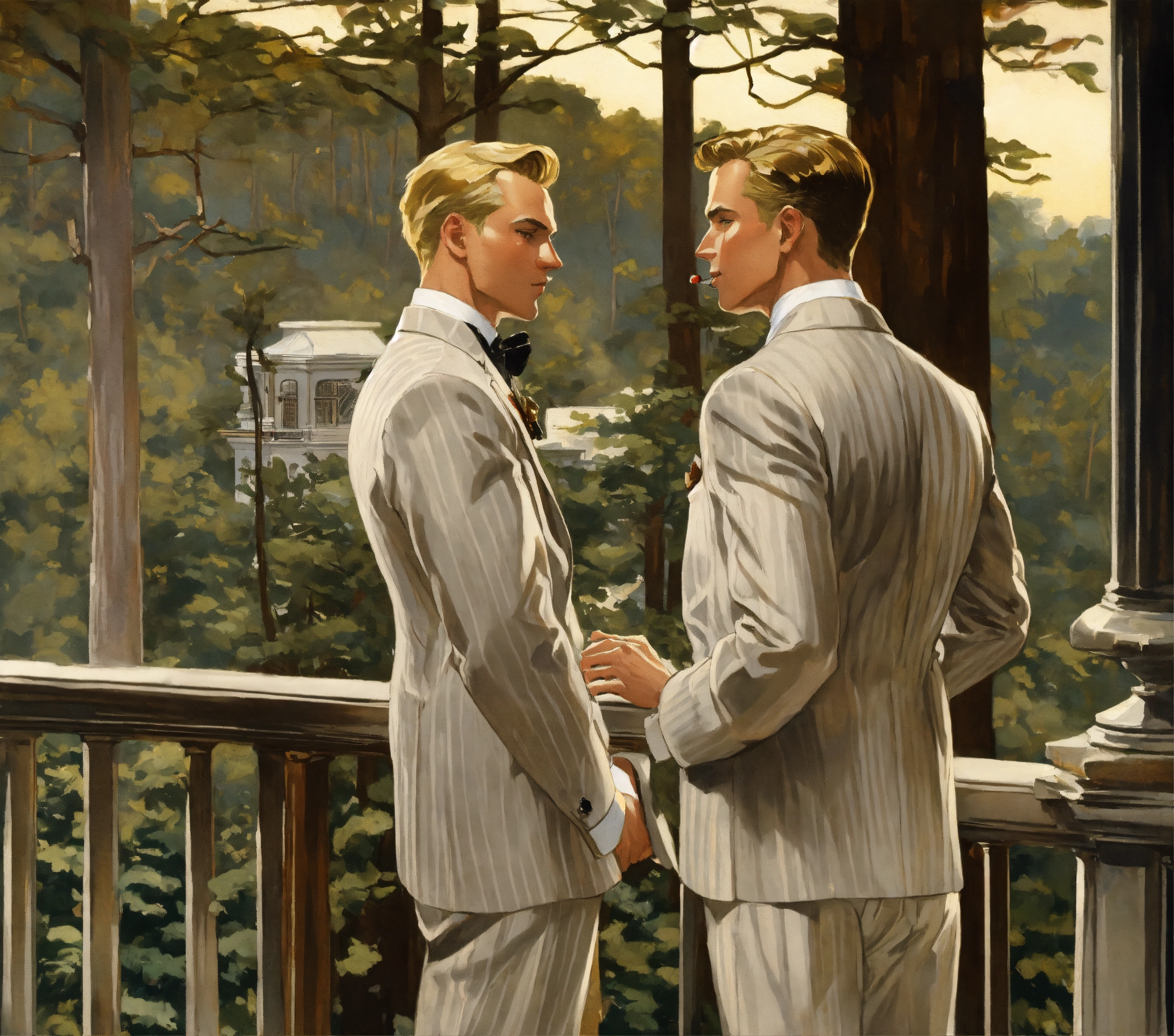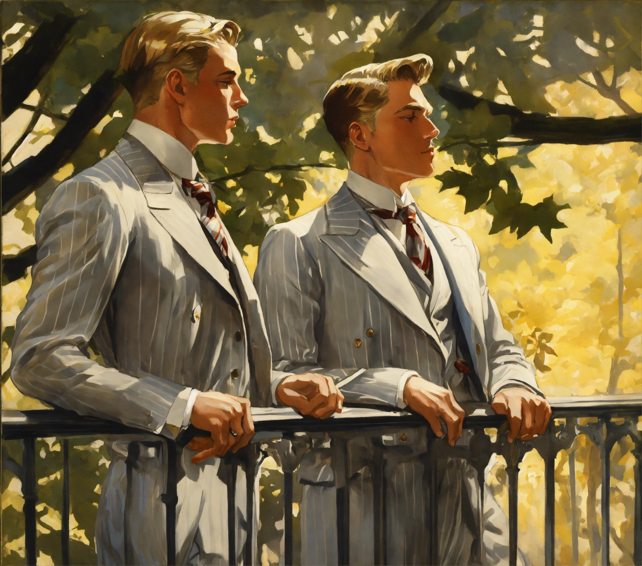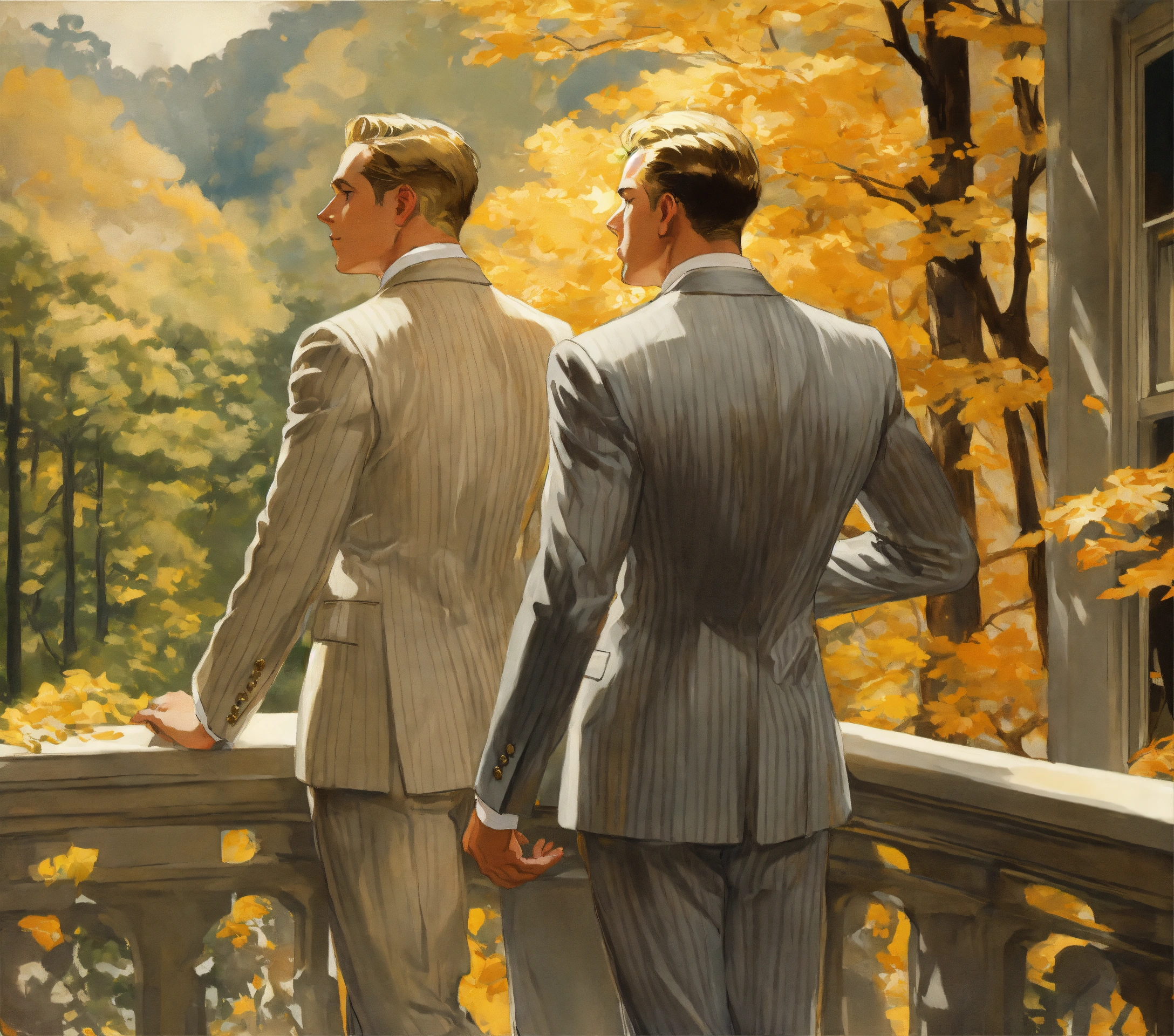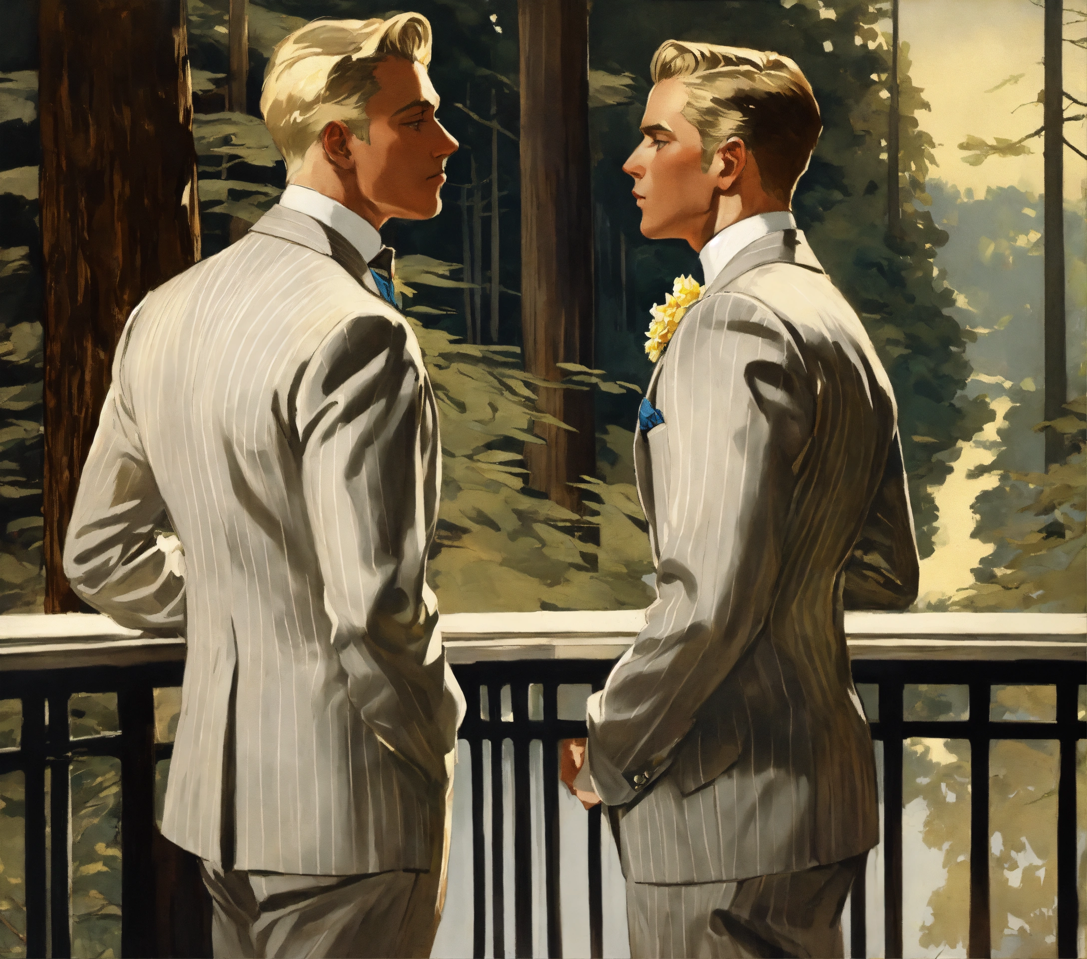 Two blonde male gentlemen in light grey pinstripe suit, silver tie, whistling on a balcony in a forest, from behind, leyendecker style