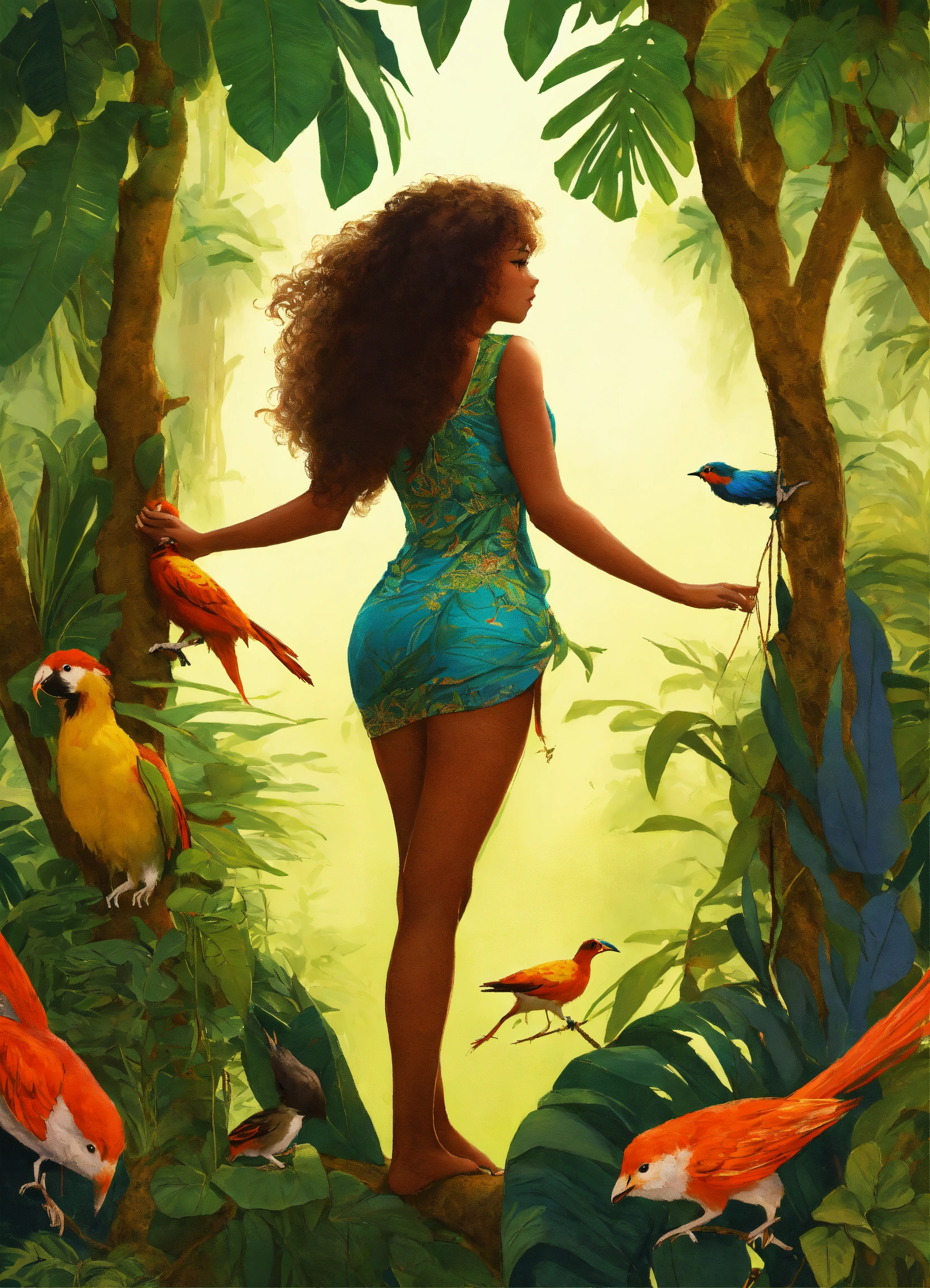 A woman whose legs turn into the trunk of a tropical tree, her hair is the bushy part of the tree and their are animals climbing all around her limbs