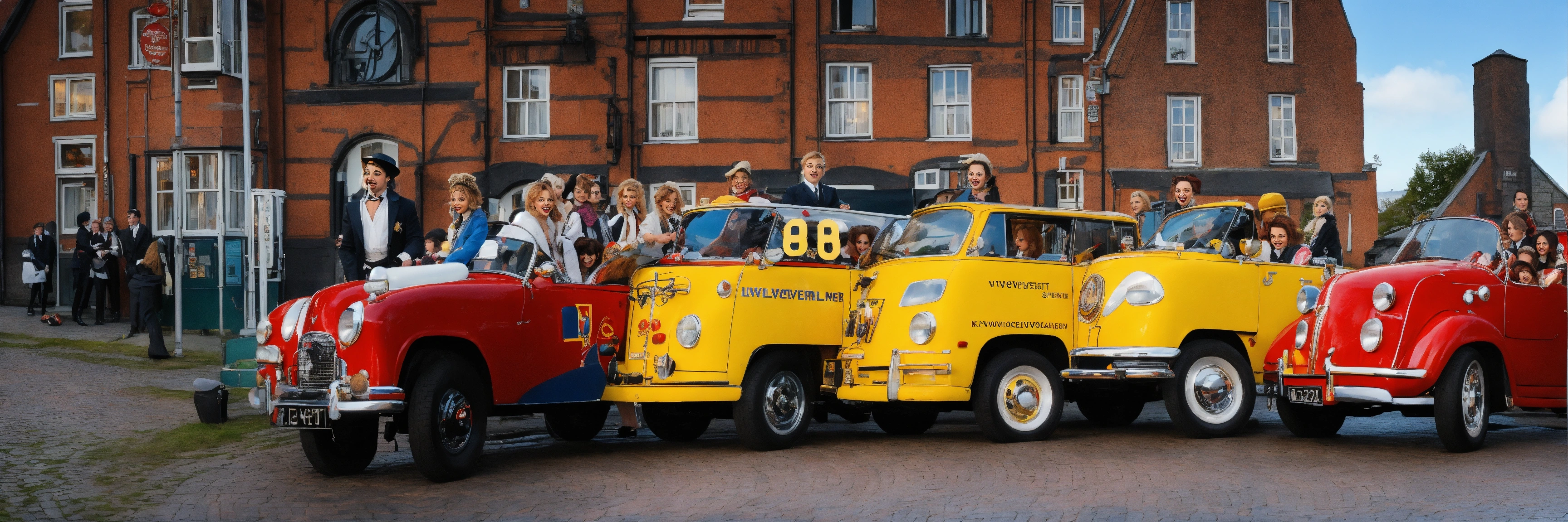 Text en folkevogns karusselvogn flyver sporløst gennem luften med chaplin monroe og spice girls der alle har hænderne i vejret mens se kaster forskellige håndtegn, skyerne er under dem og vognen.
