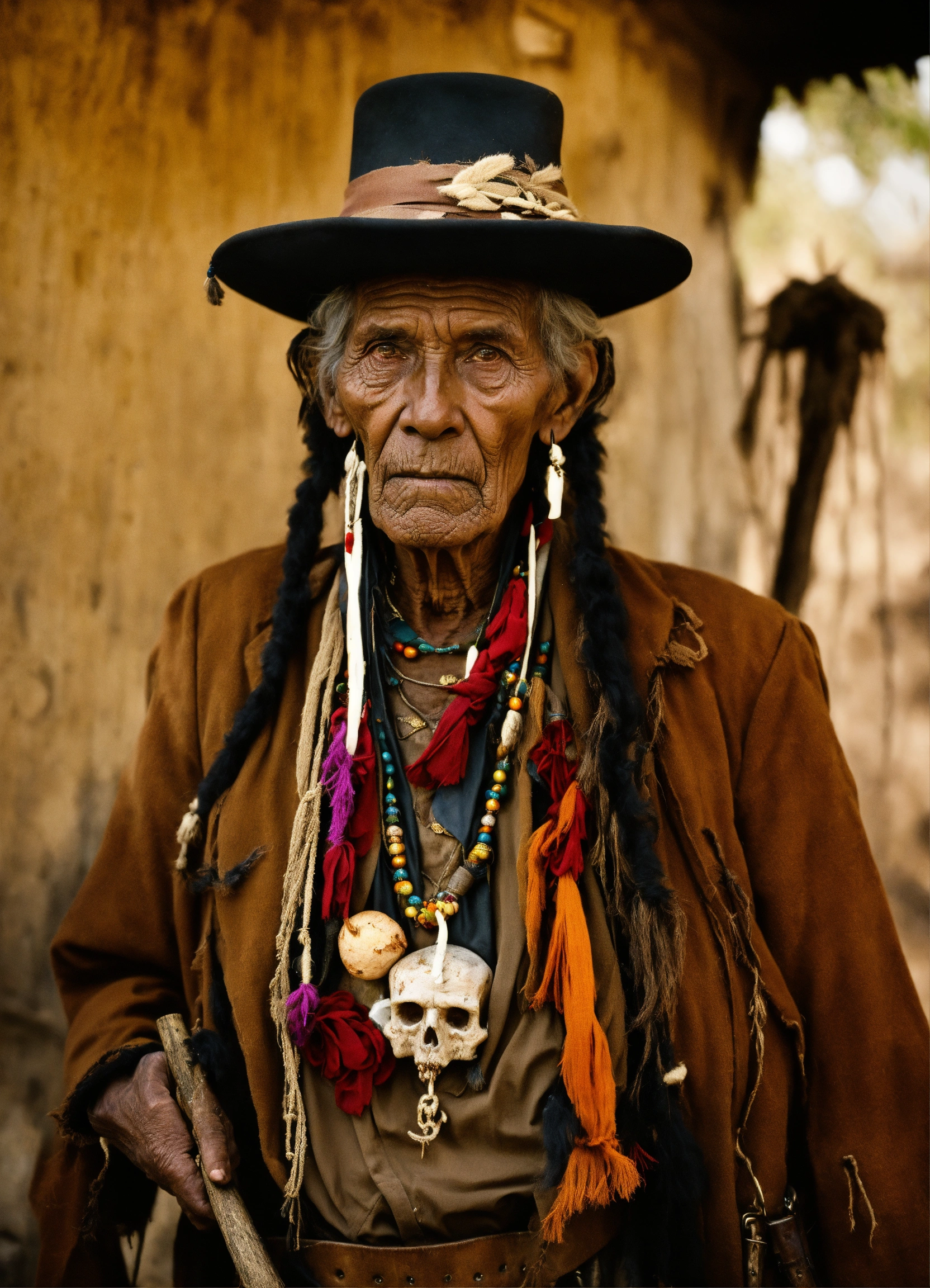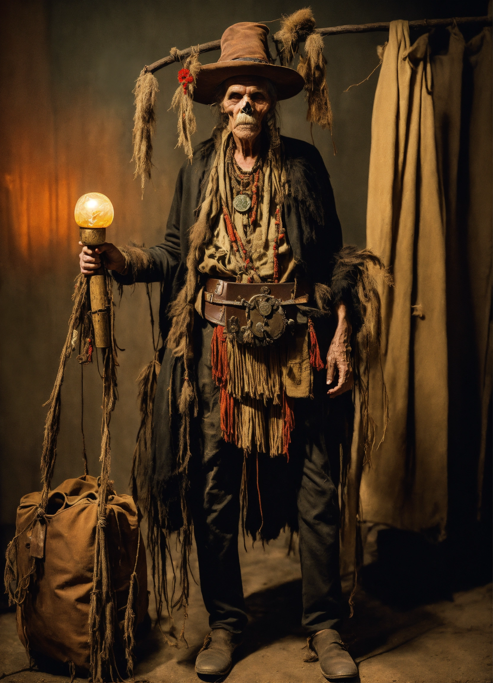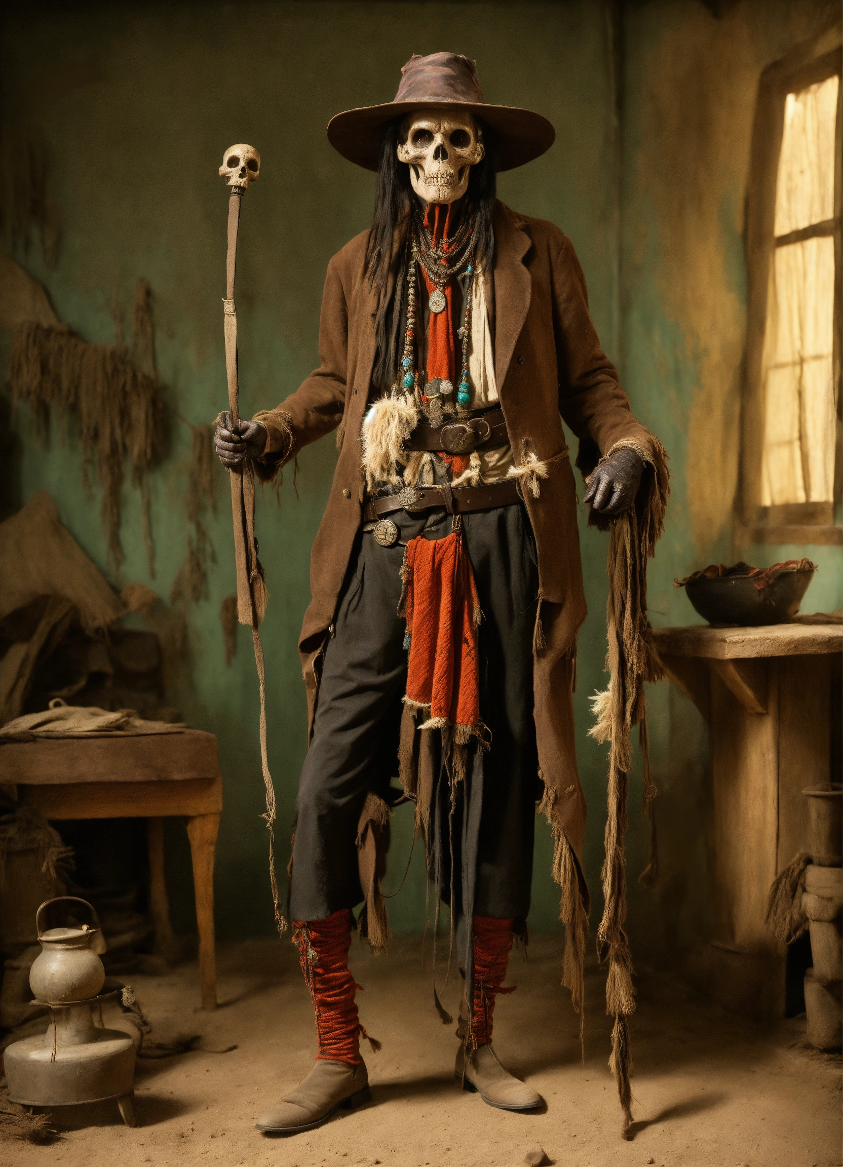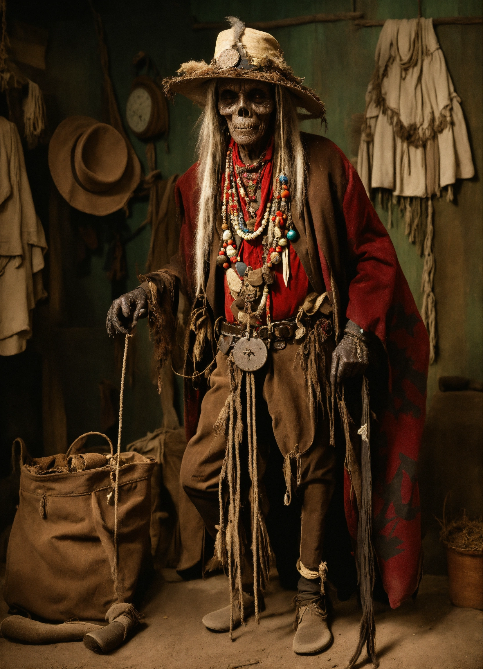 Creepy witch doctor from wild west 1800s. he is emaciated and elderly, and he has death motif fetishes hanging from his belts and bags
